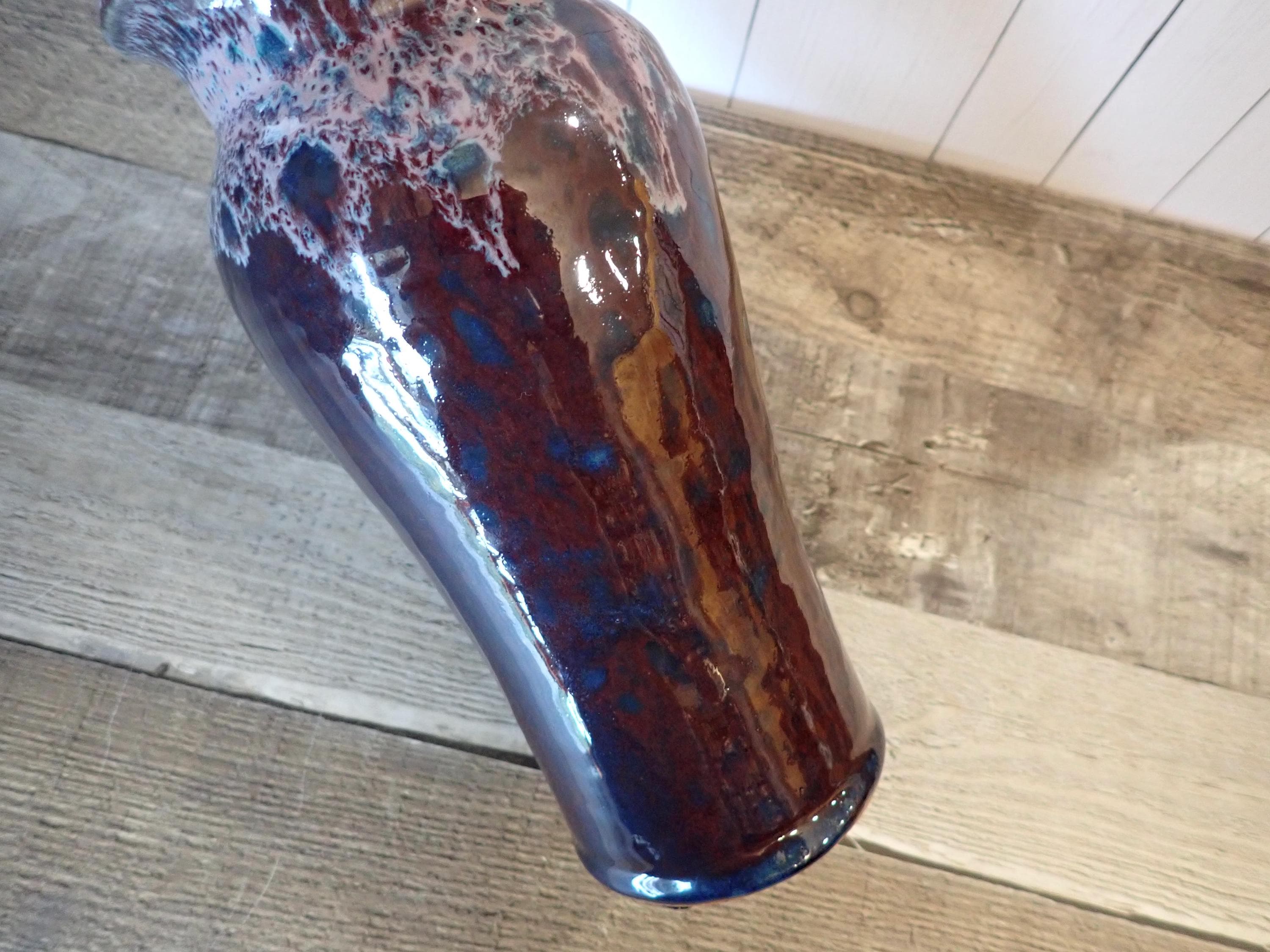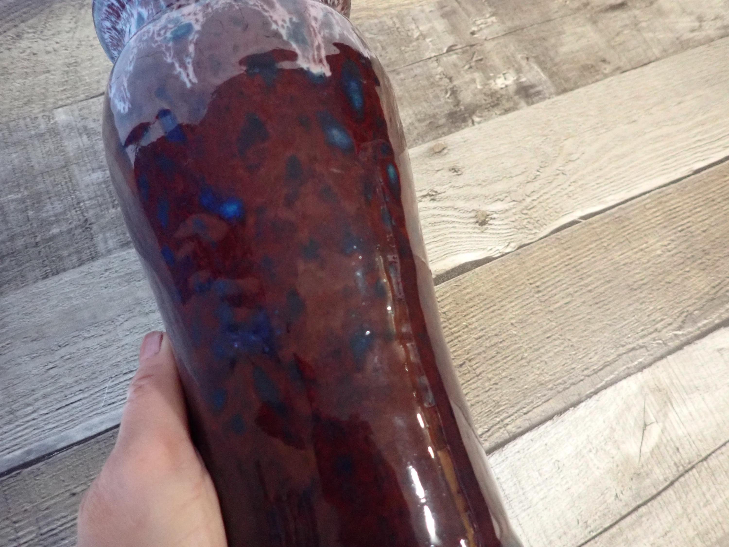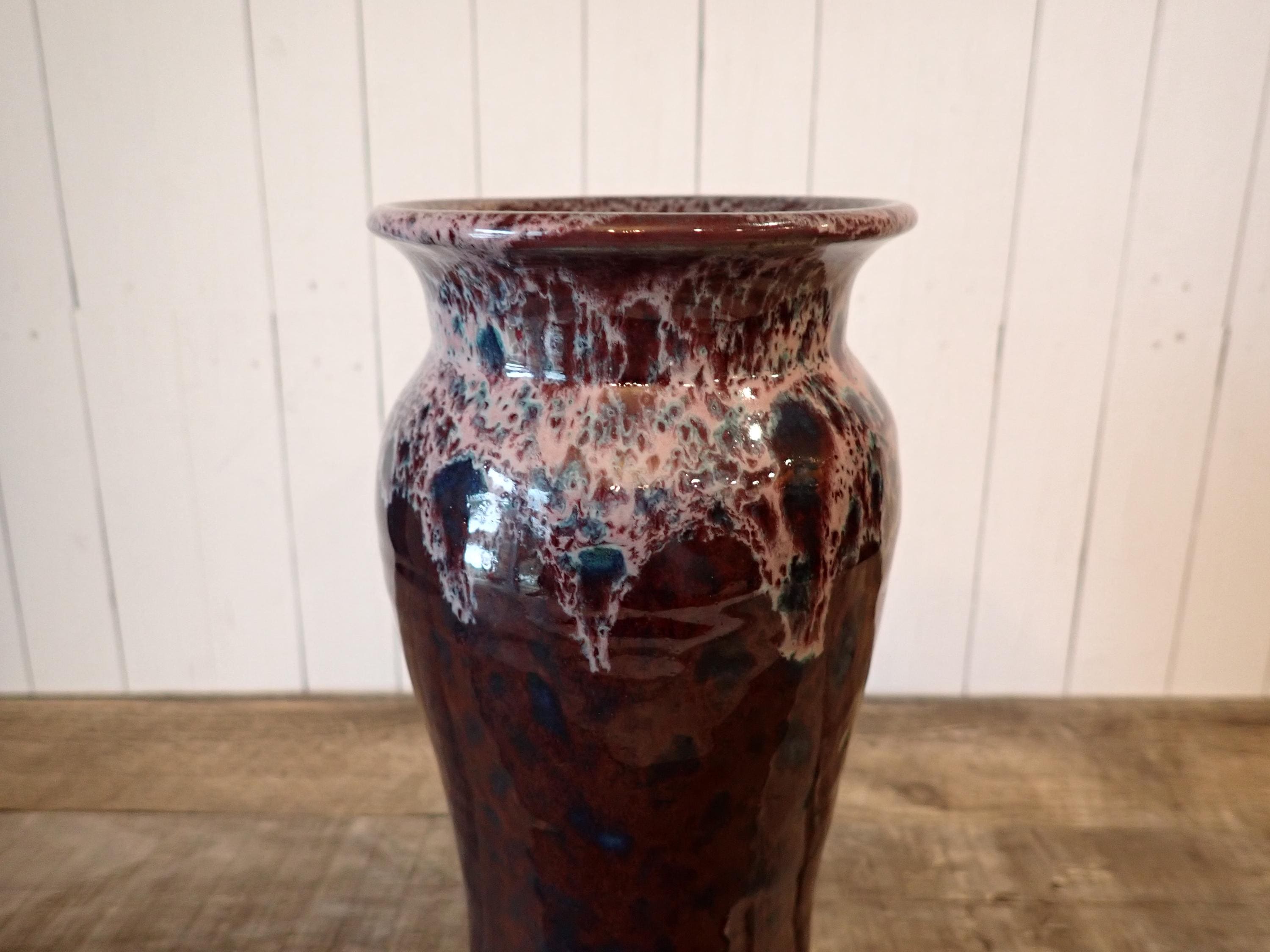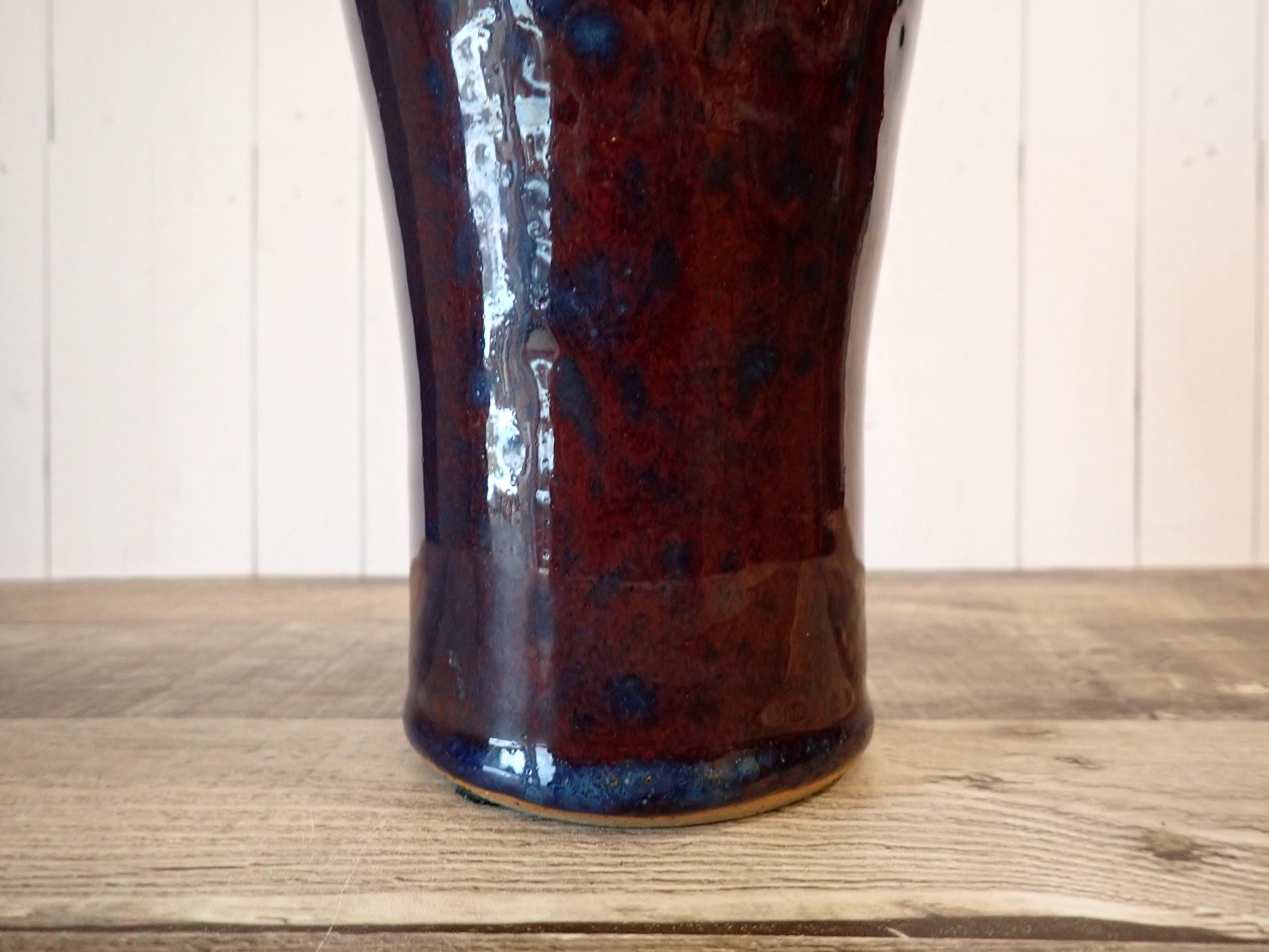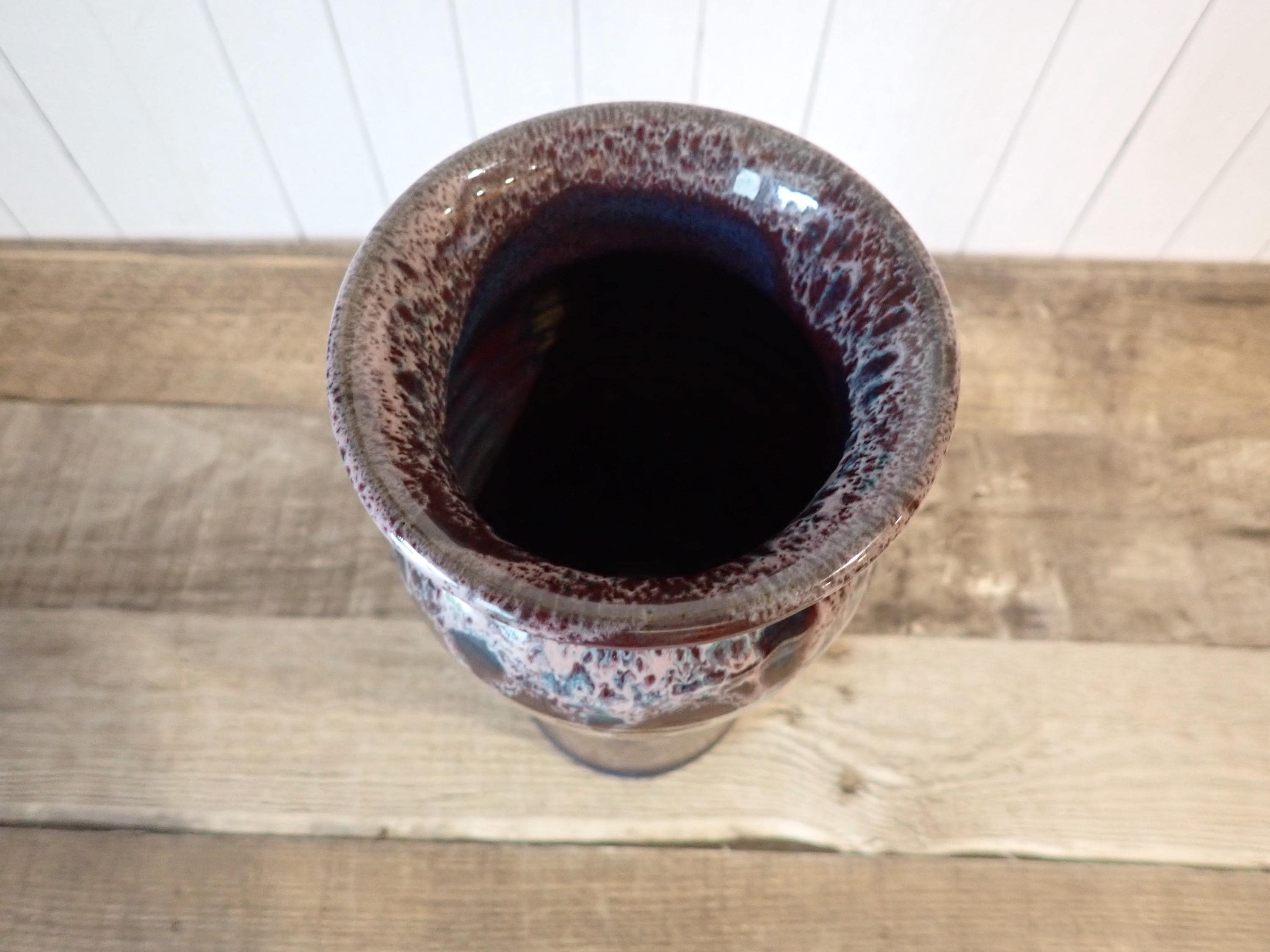This stoneware vase is 9" tall and 4.5" in diameter at the widest point. It is a handmade pottery piece, and has an original label on the bottom by the artist - Lakeside Pottery from Madison, WI. The vase is a purple glazed stoneware with pink drip edge around the rim. The body of the vase has some darker purple spots throughout the vase. The vase is in very nice condition with no chips or cracks.