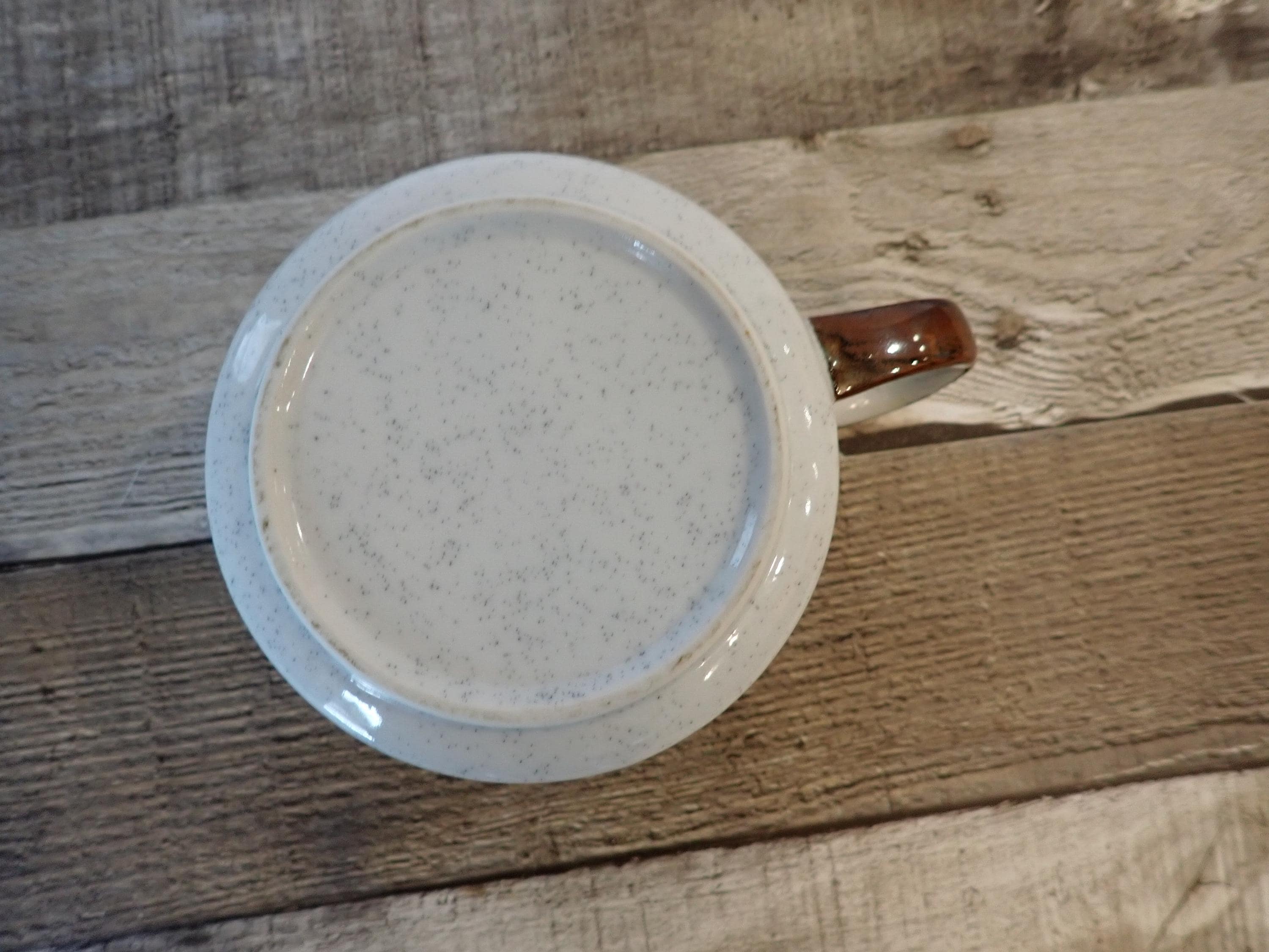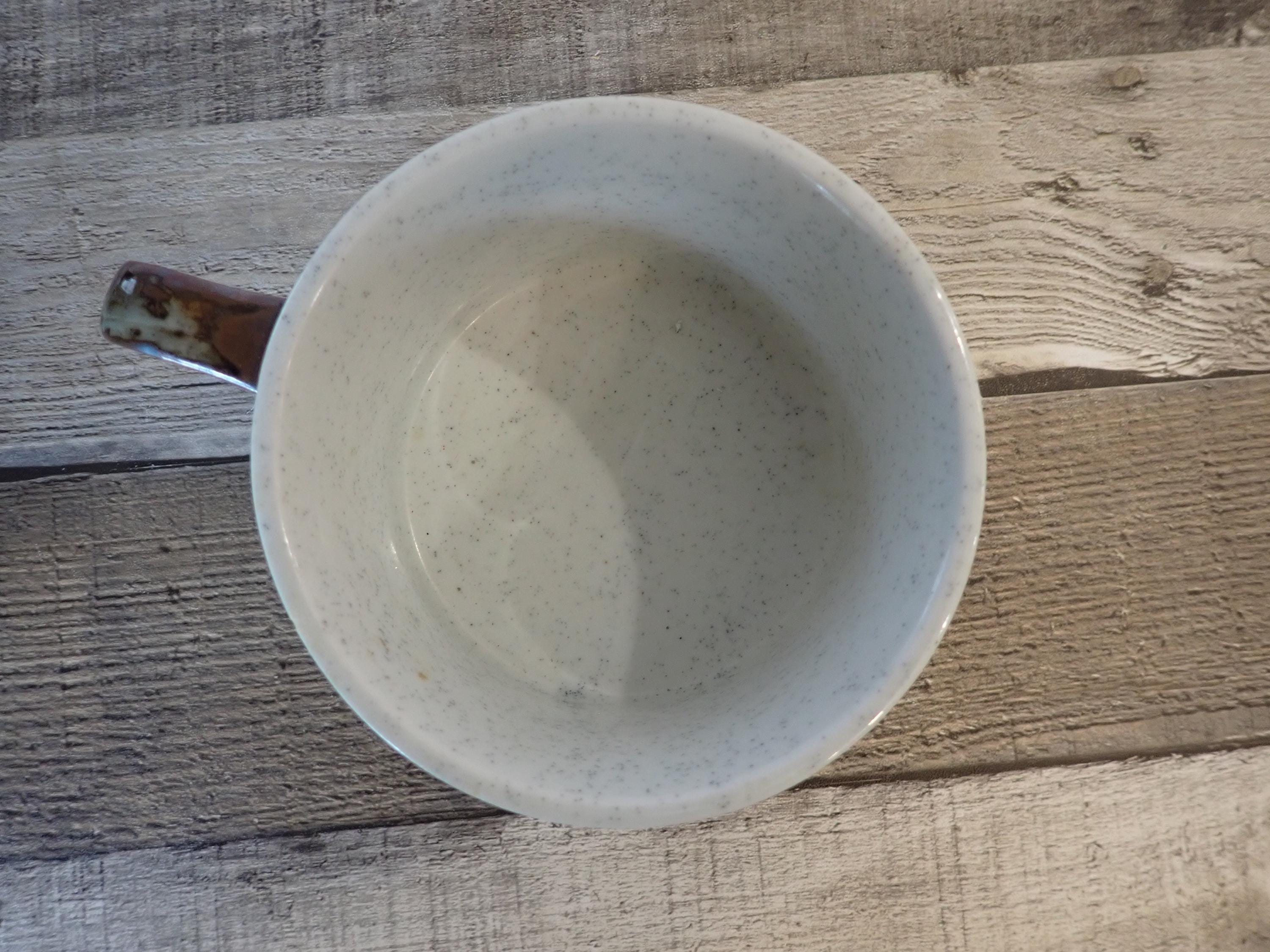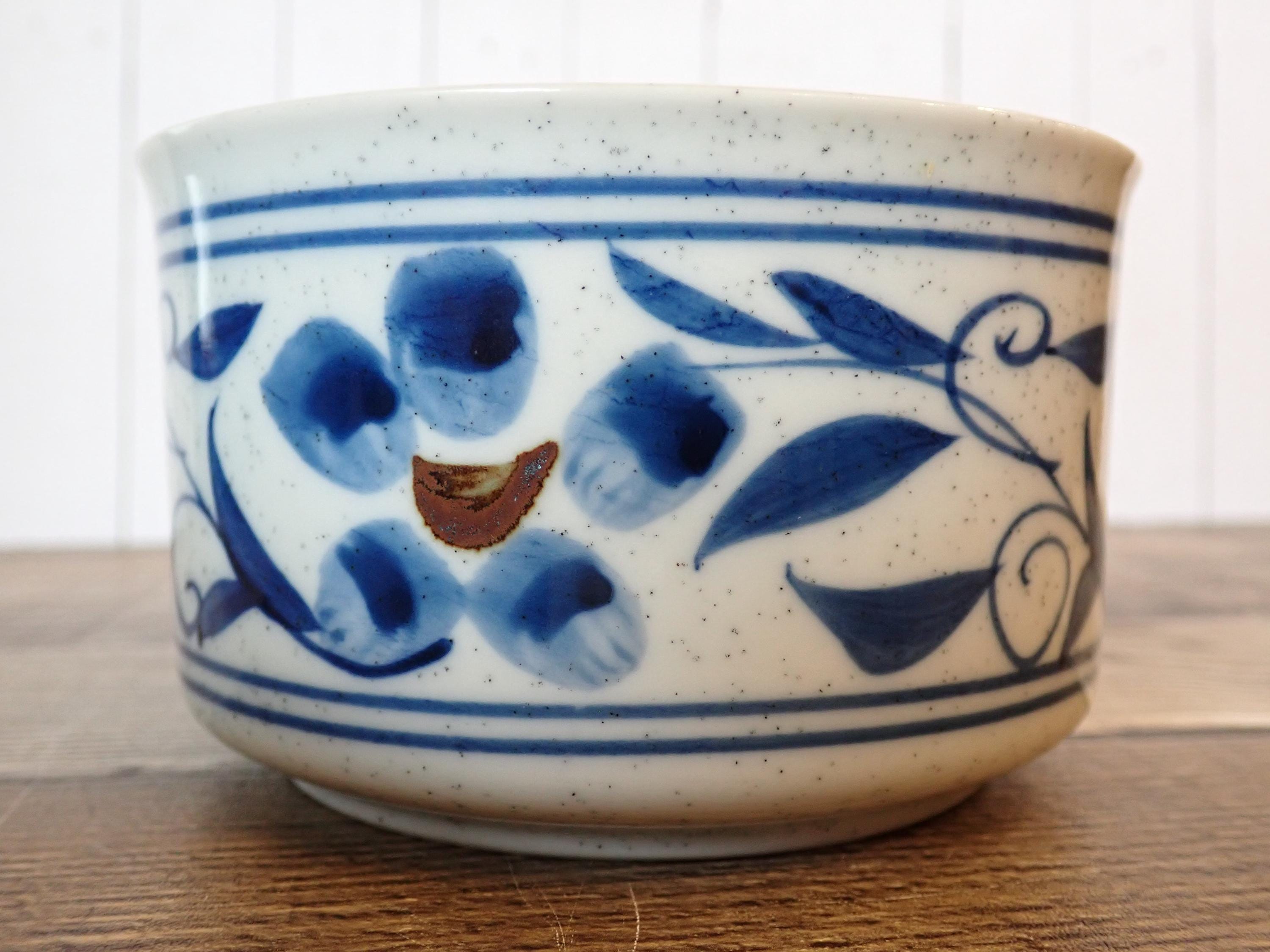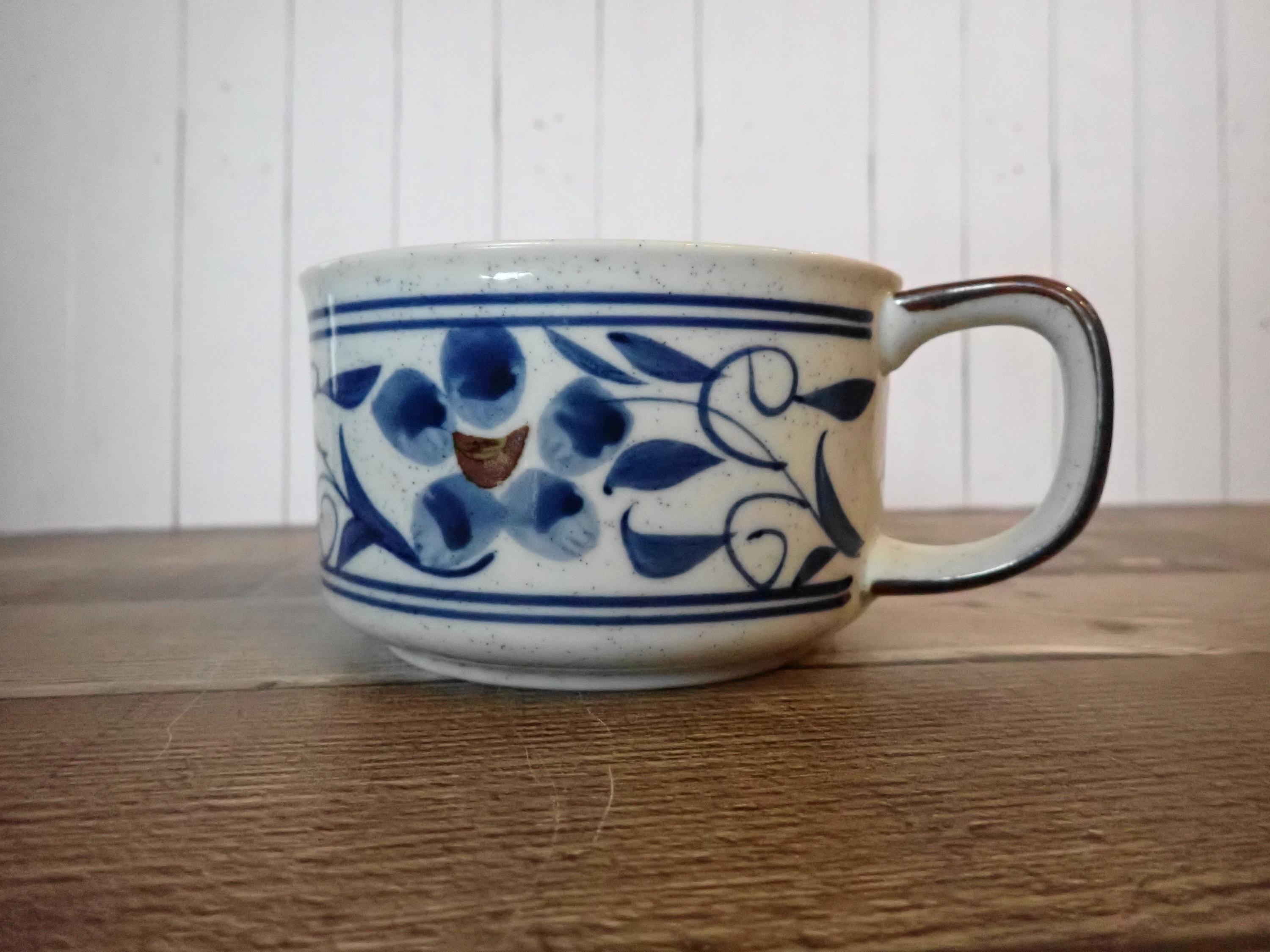 This pretty ceramic soup bowl or soup mug by Otagiri is the Hacienda pattern. It measures 2.75" tall and 4.5" in diameter, and with the handle it is 6" wide. It is a white ceramic with light brown speckles and is accented with a scrolling blue leaf and flower design around the bowl. The soup bowl is in very good condition with no chips or cracks, and no crazing. Lovely Otagiri ceramic soup bowl!