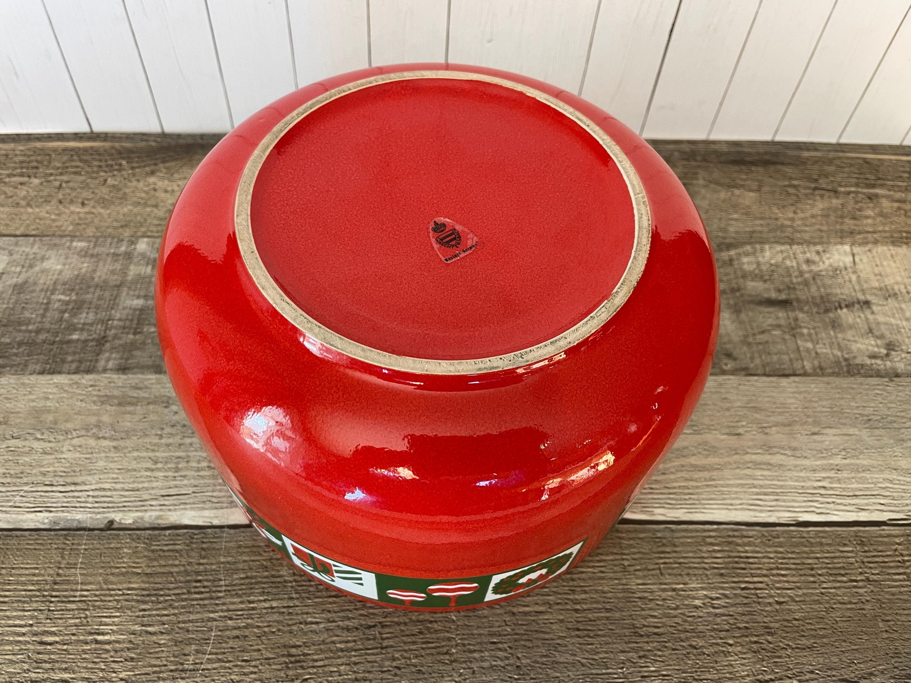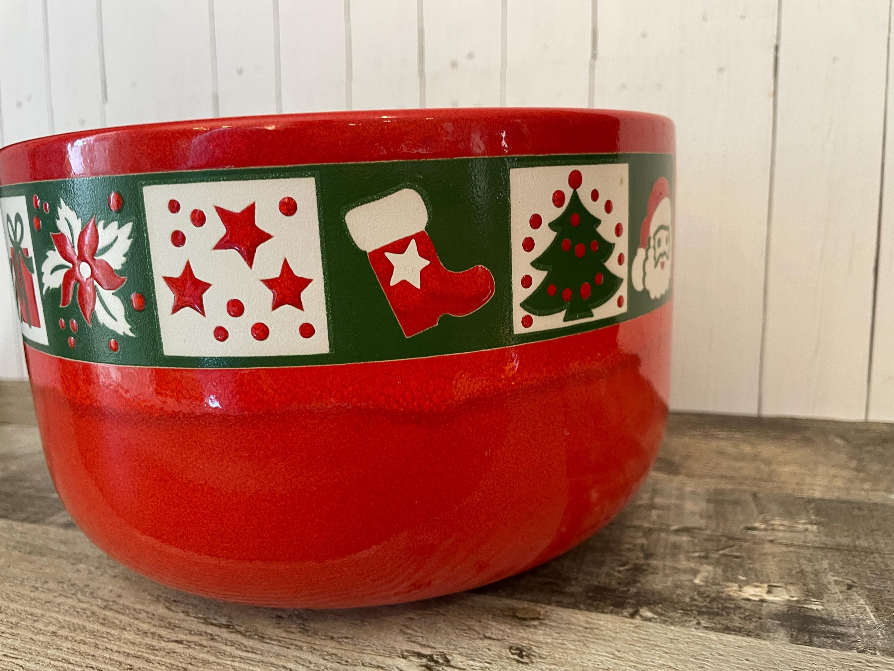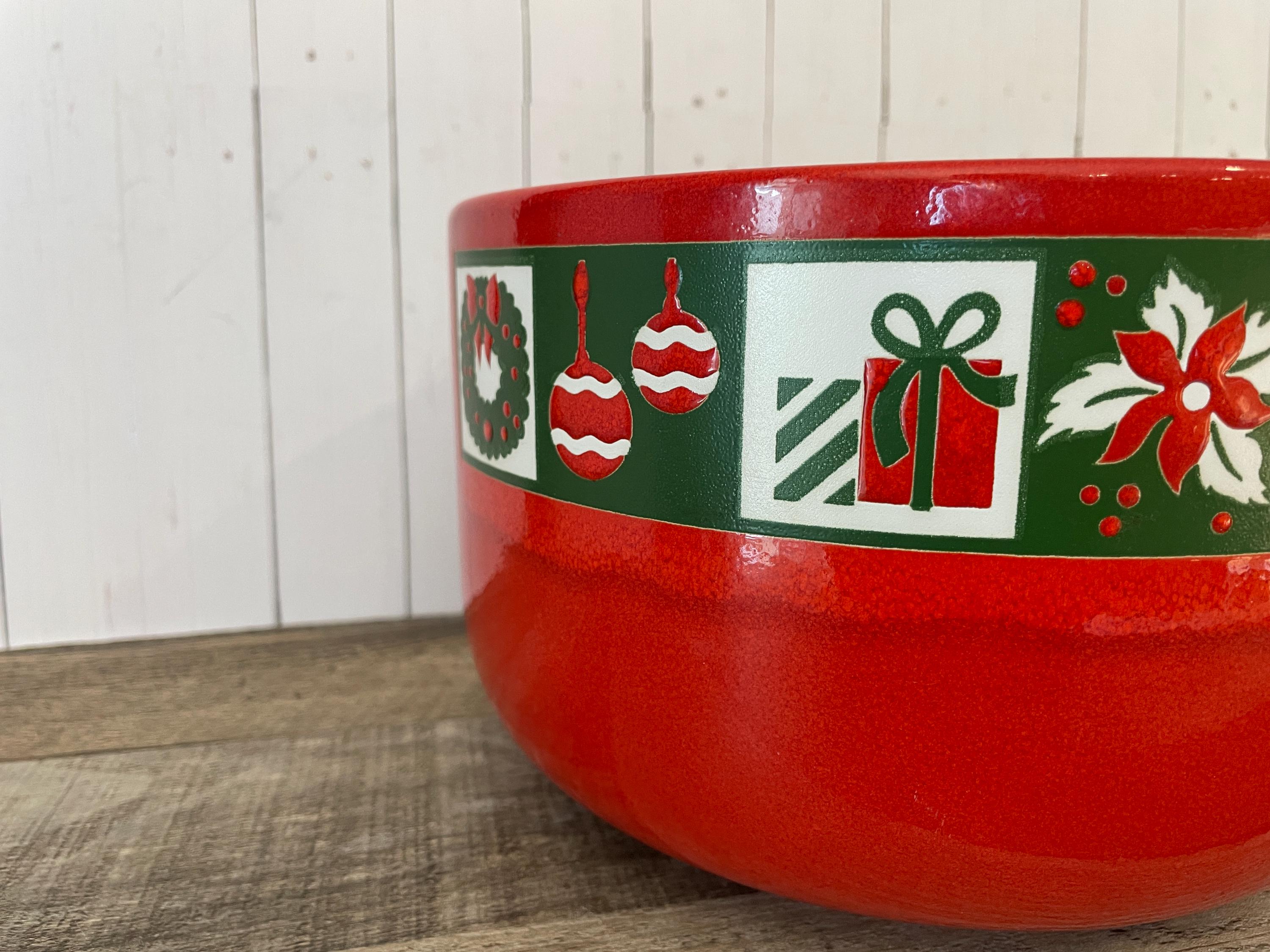This large ceramic Christmas bowl by Waechtersbach is 8.25" in diameter and 5.25" tall. It is a red ceramic piece with a band around the rim with various Christmas designs - a tree, ornaments, Santa, presents, boots, and more! There is an original Waechtersbach label on the bottom of the bowl. The bowl is in very good condition with no chips or cracks, however there is a variation in the red glaze right under the band of designs - it is lighter right next to the band and then darkens - this is visible in all of the photos and shown in detail in the last several photos. Great Waechtersbach Christmas bowl!