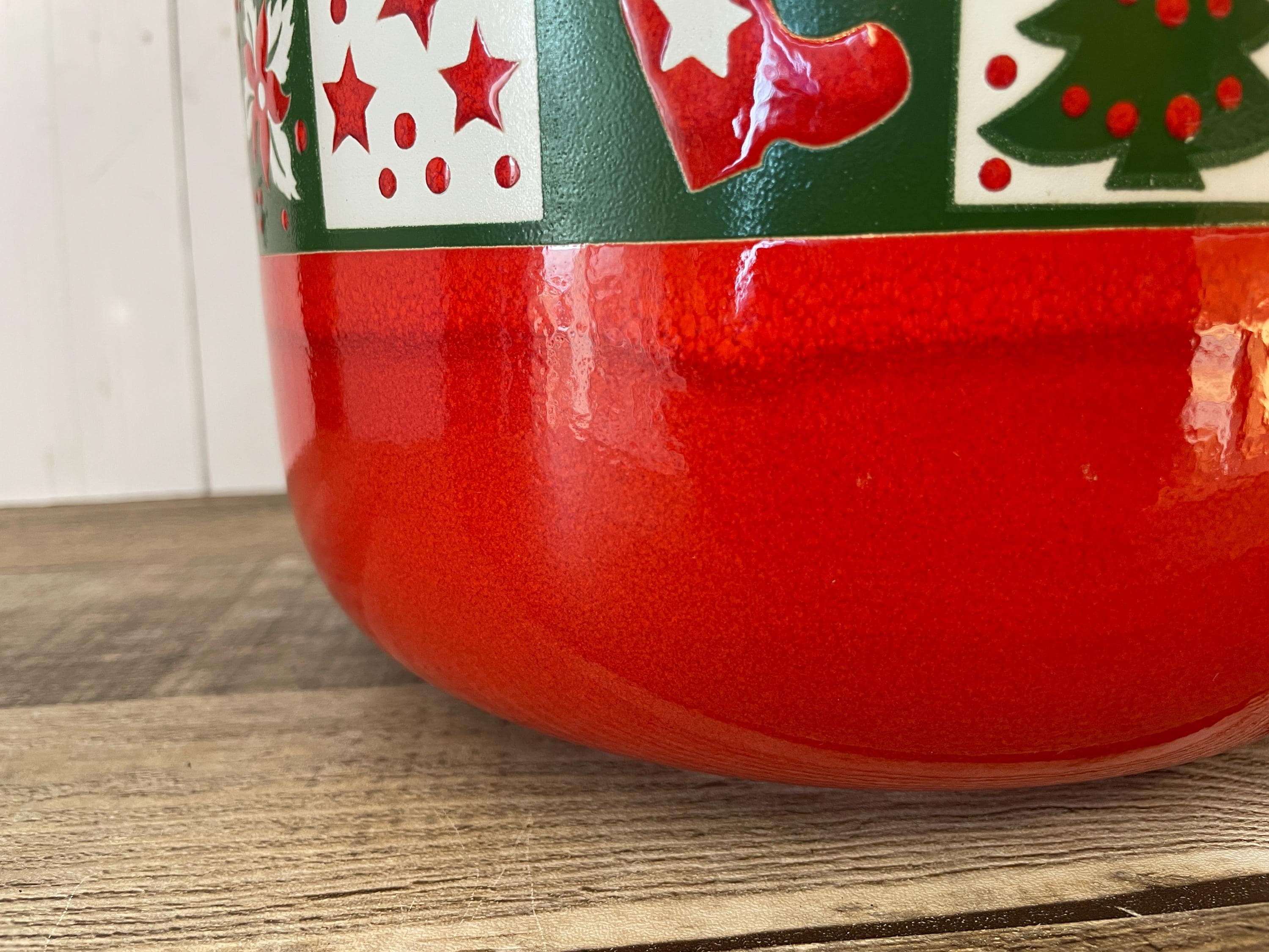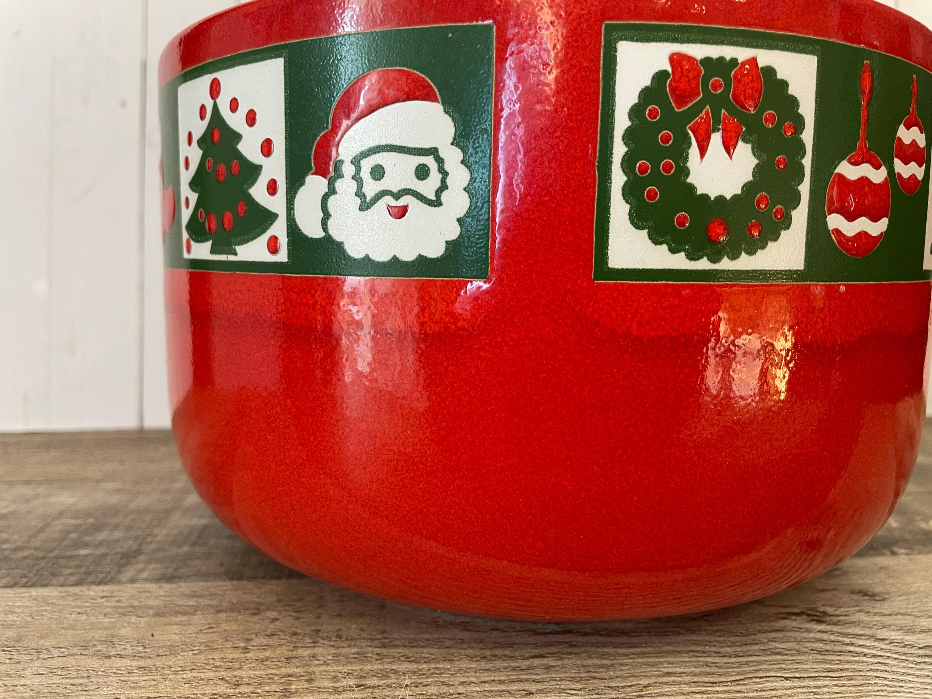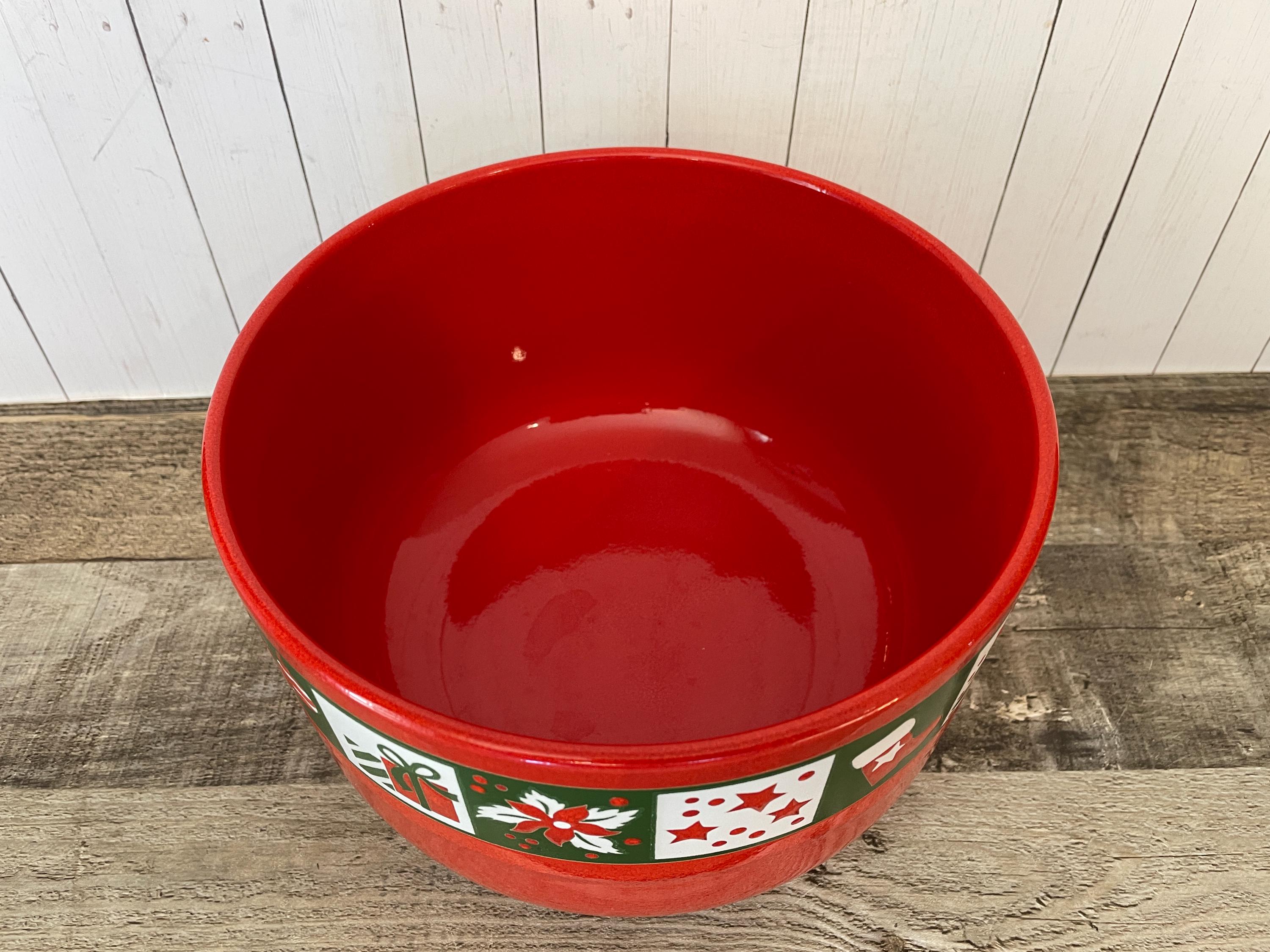 This large ceramic Christmas bowl by Waechtersbach is 8.25" in diameter and 5.25" tall. It is a red ceramic piece with a band around the rim with various Christmas designs - a tree, ornaments, Santa, presents, boots, and more! There is an original Waechtersbach label on the bottom of the bowl. The bowl is in very good condition with no chips or cracks, however there is a variation in the red glaze right under the band of designs - it is lighter right next to the band and then darkens - this is visible in all of the photos and shown in detail in the last several photos. Great Waechtersbach Christmas bowl!