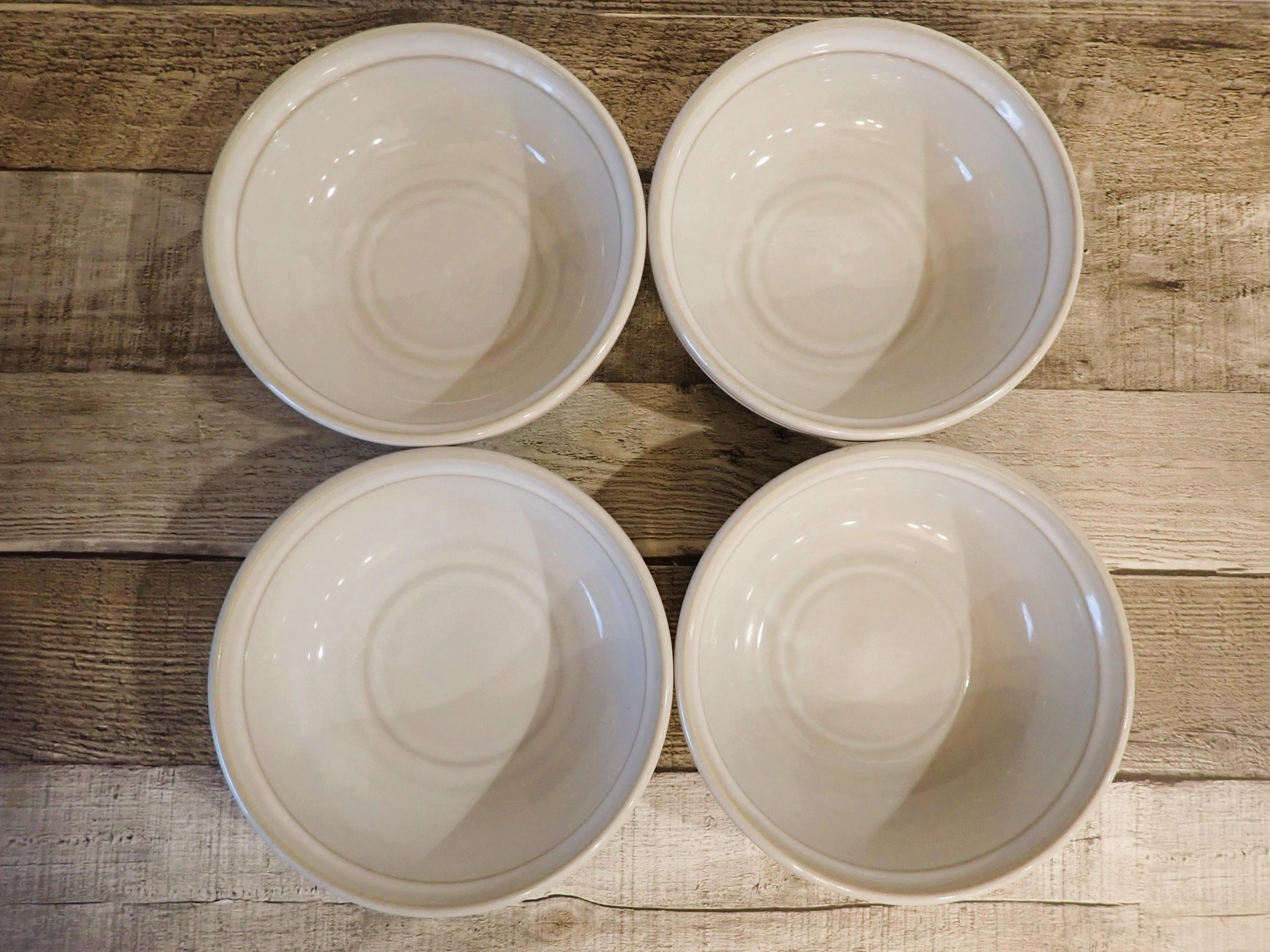This set of 4 coupe cereal bowls by Noritake are in the Nimbus. Each bowl is 6" in diameter and 2.25" high. They are white bowls, accented with a subtle tan banded design. The bottoms are marked: NORITAKE STONEWARE / OVEN SAFE DETERGENT SAFE / MICROWAVE OVEN SAFE / MADE IN JAPAN / 8628 / NIMBUS. All 4 bowls are in very good condition, however there is one small nick in the rim of one of the bowls, and there are a few scuff-type marks on the outside of the bowls - these areas are shown in detail in the last 4 photos. There are some light surface scratches from use.