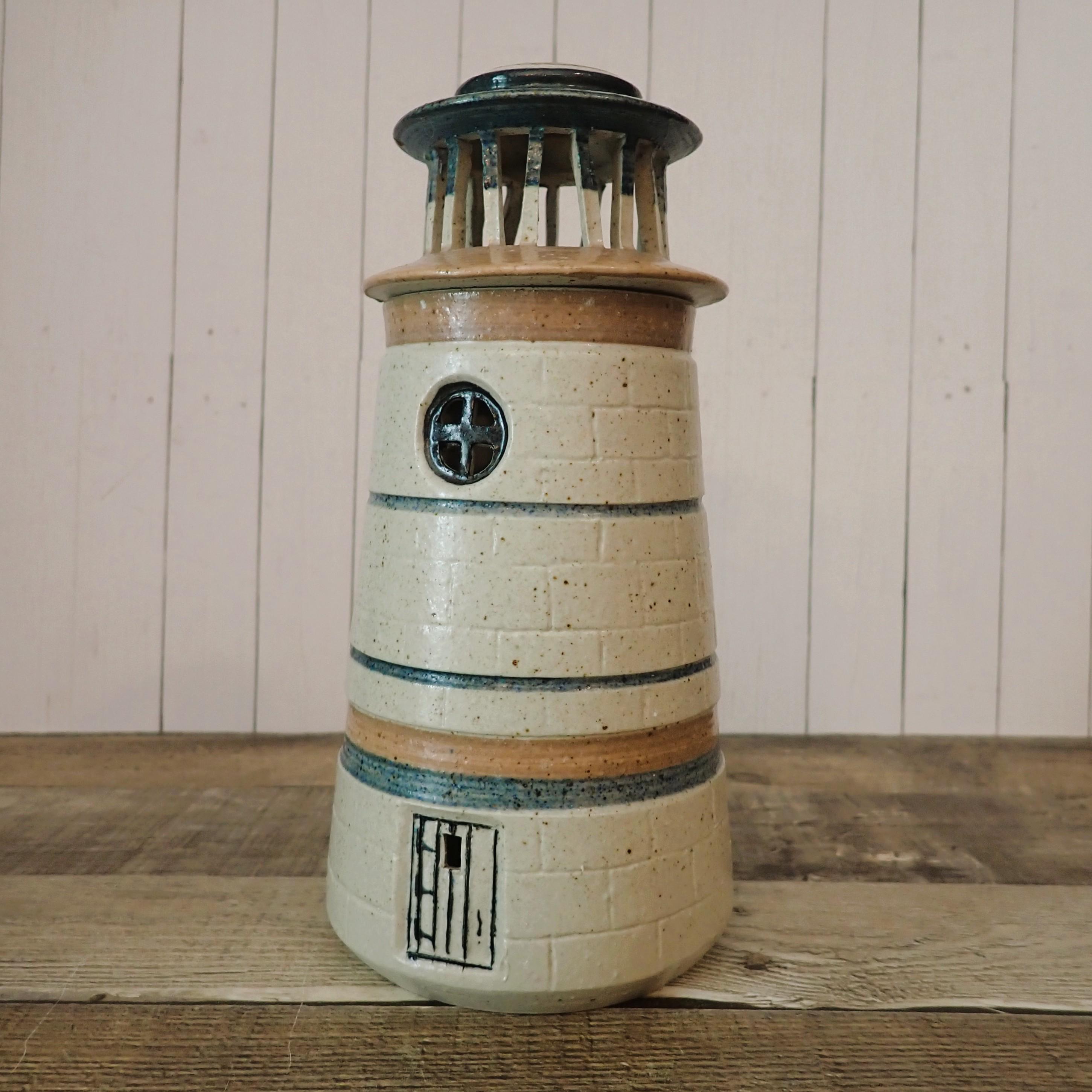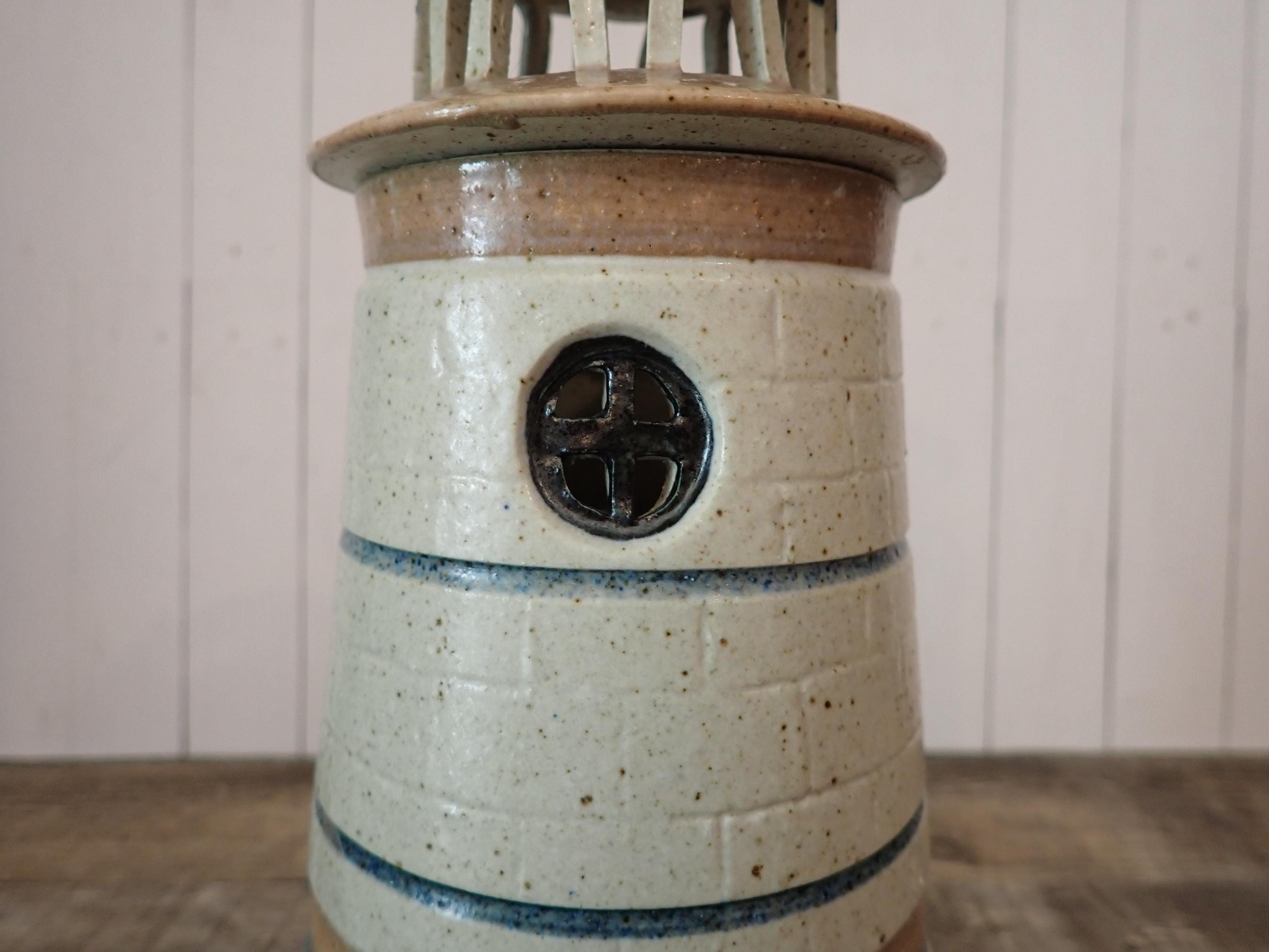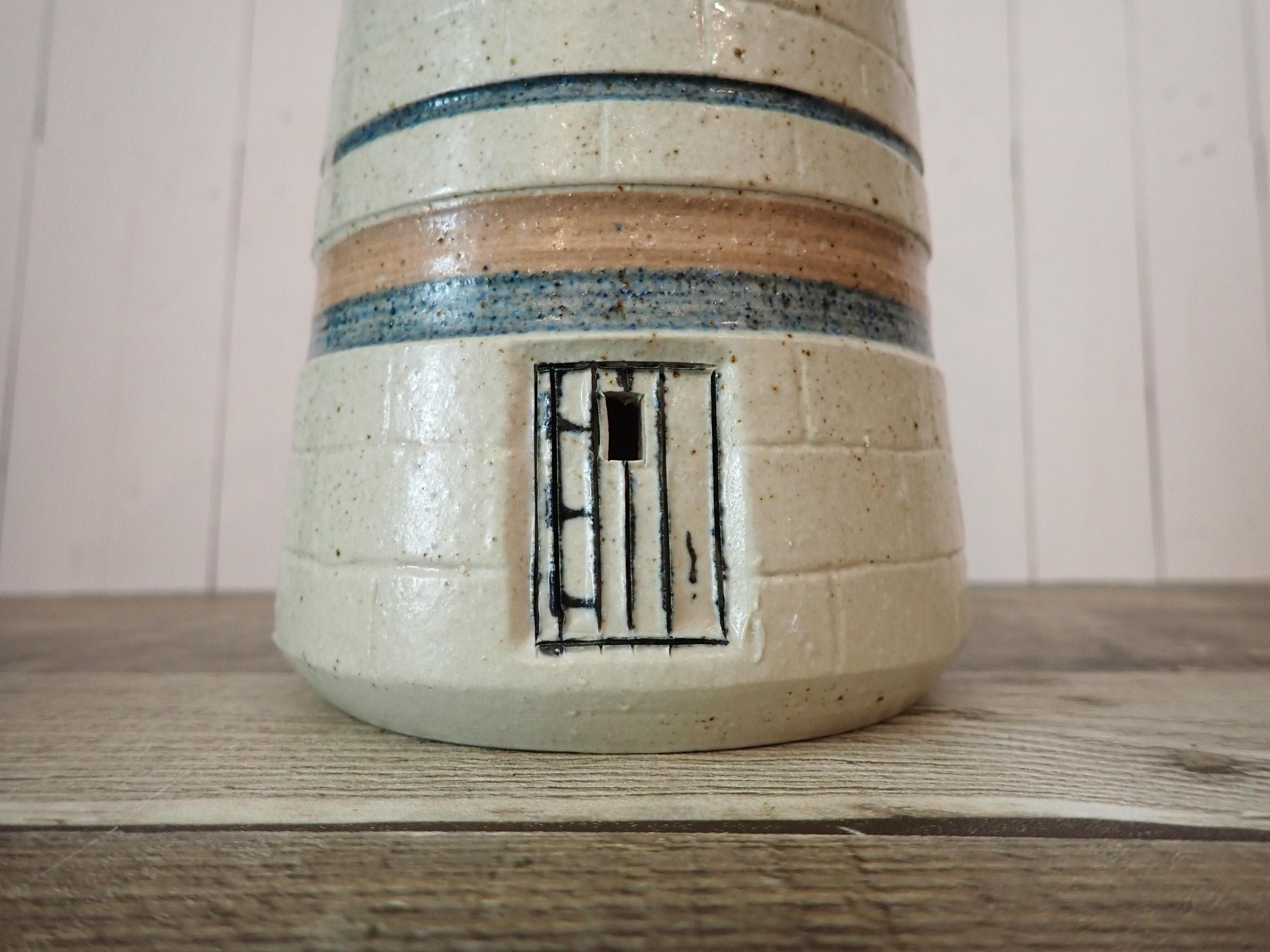 This pottery lighthouse by Gills Rock Pottery is 9.5" tall and 4.25" in diameter. It is a light gray stoneware, and is accented with blue bands and black trim around the windows and door. The top portion of the lighthouse lifts off, and an oil canister can be placed inside. The base of the figurine is marked: GRS / 97 PS BC UM. The lighthouse is in nice condition however there is one broken spindle on the top portion of the lighthouse - this is shown in detail in the last photo.