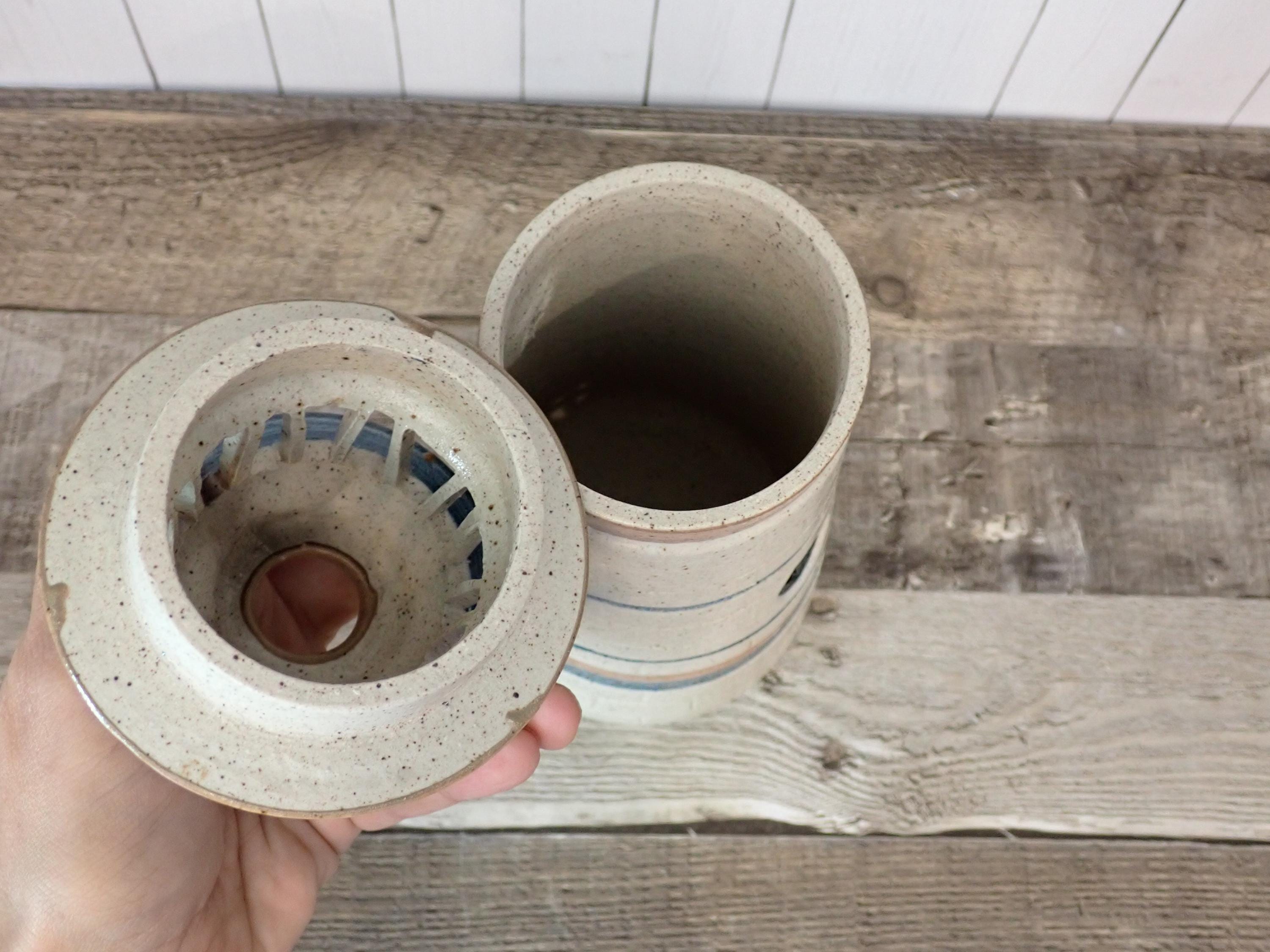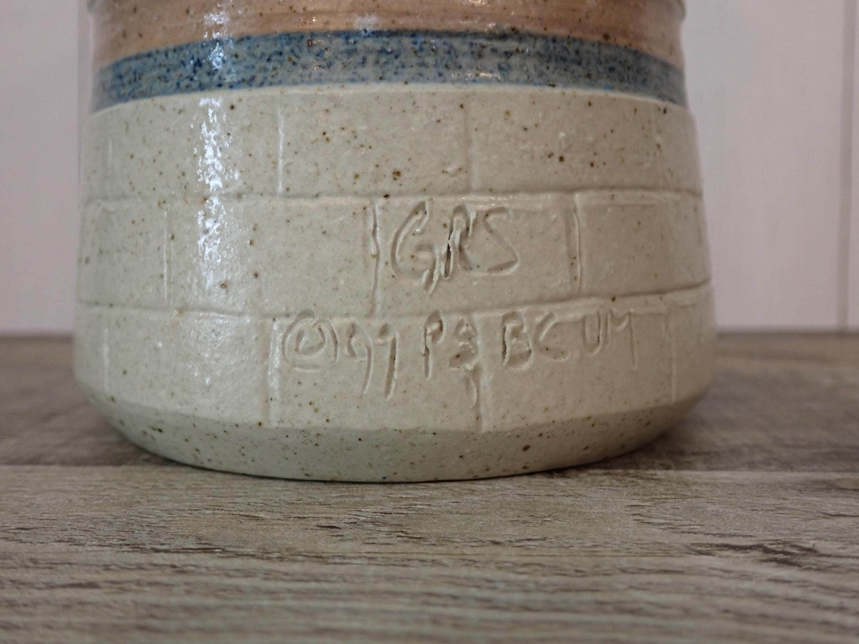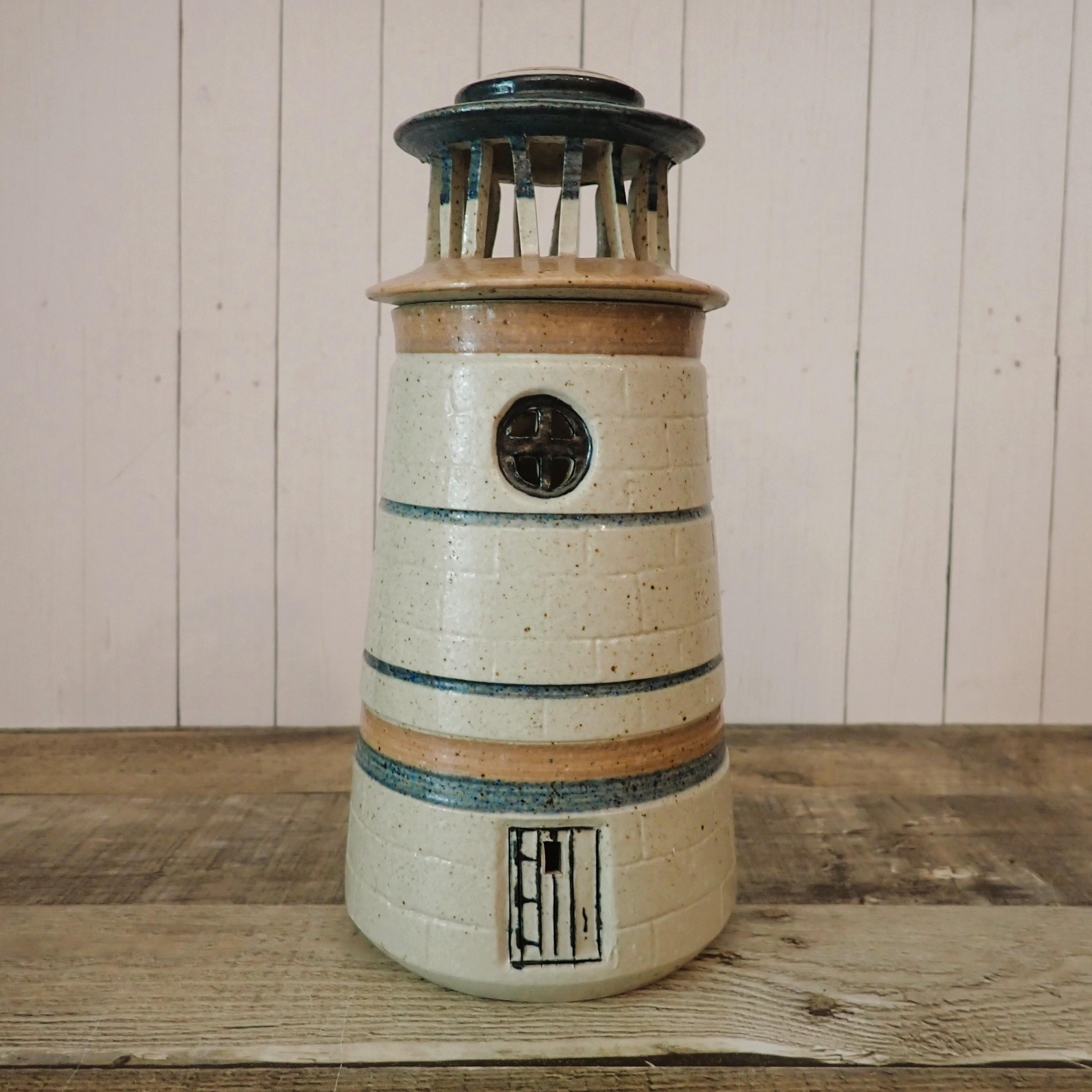 This pottery lighthouse by Gills Rock Pottery is 9.5" tall and 4.25" in diameter. It is a light gray stoneware, and is accented with blue bands and black trim around the windows and door. The top portion of the lighthouse lifts off, and an oil canister can be placed inside. The base of the figurine is marked: GRS / 97 PS BC UM. The lighthouse is in nice condition however there is one broken spindle on the top portion of the lighthouse - this is shown in detail in the last photo.