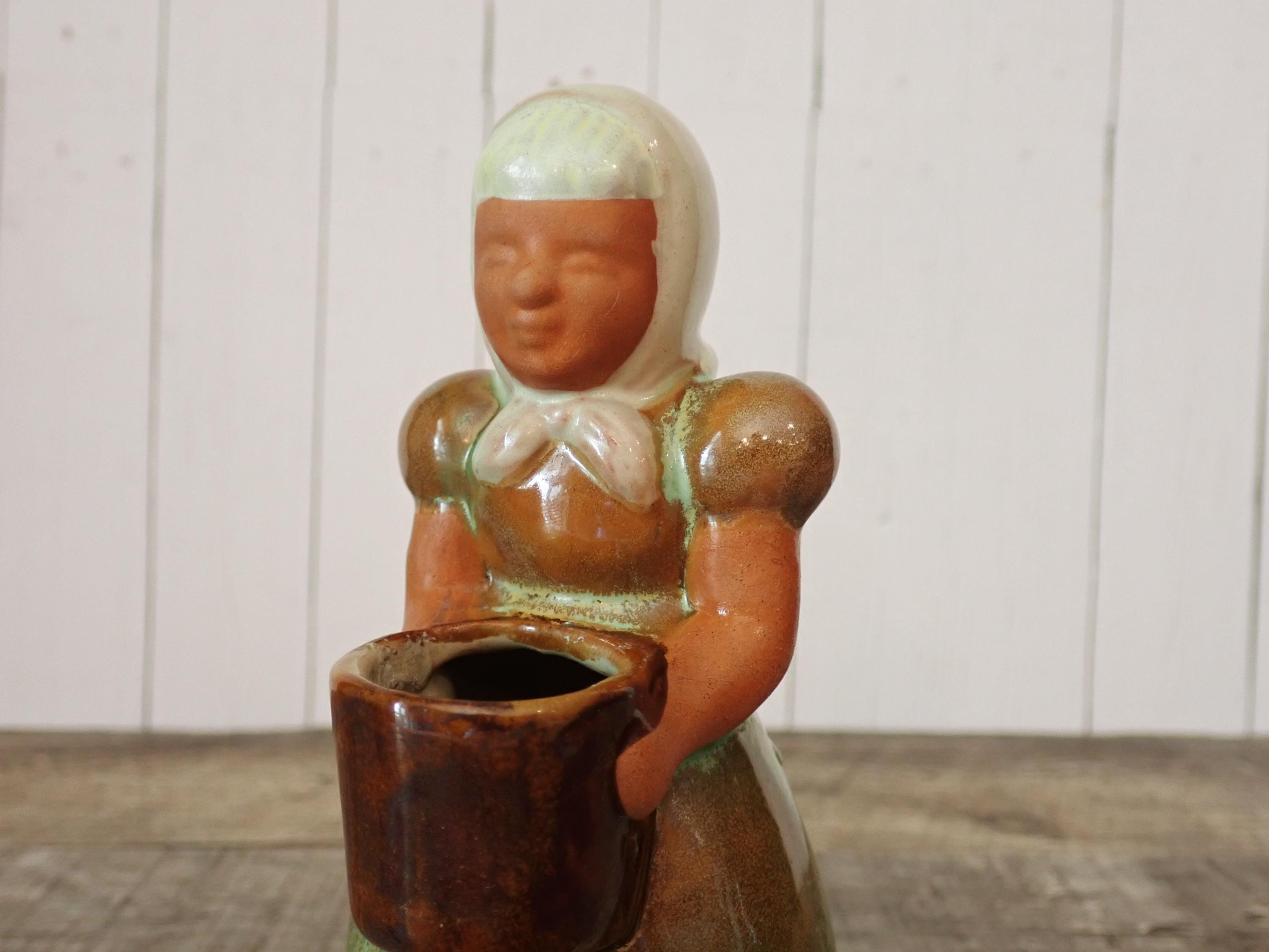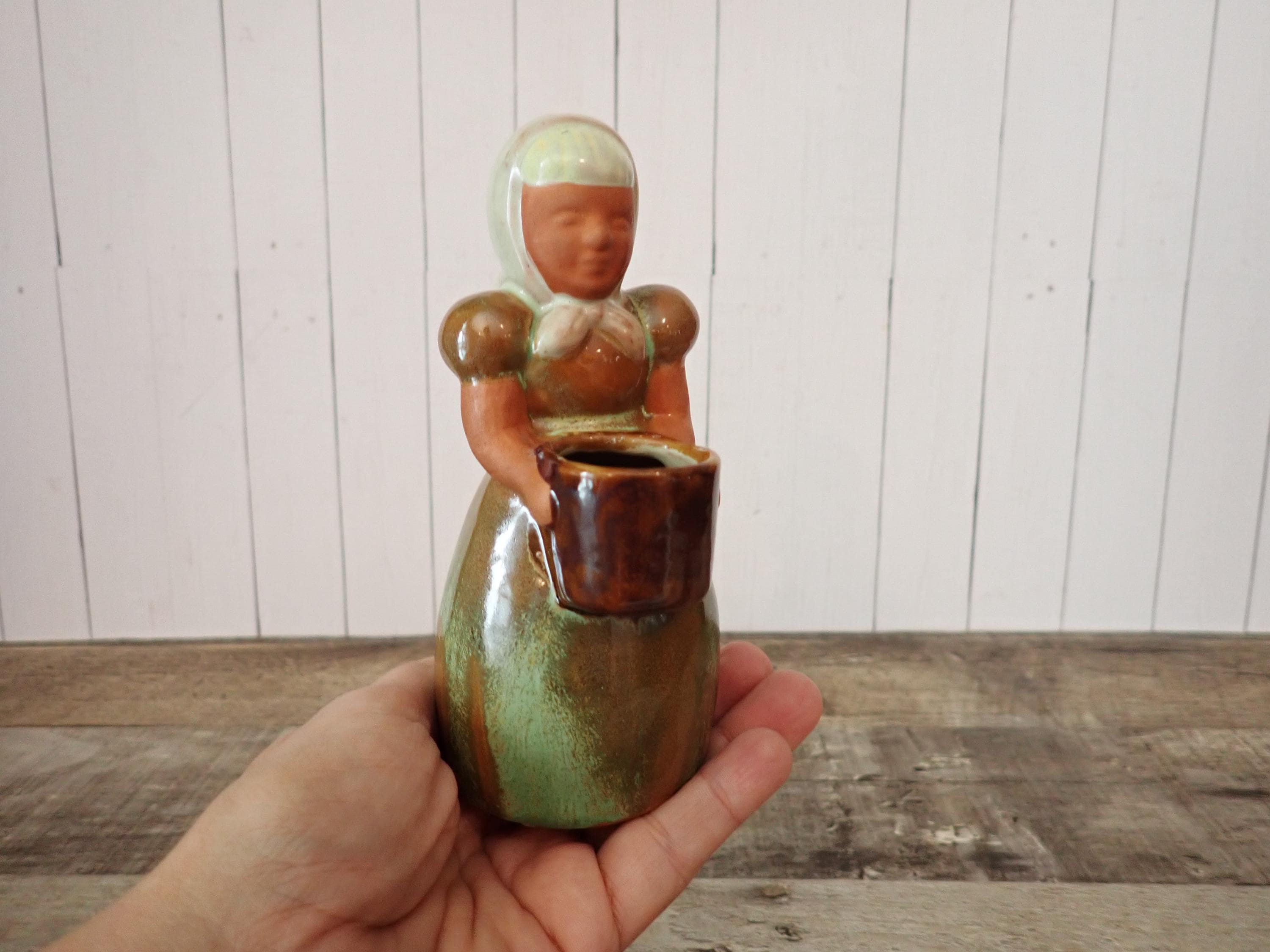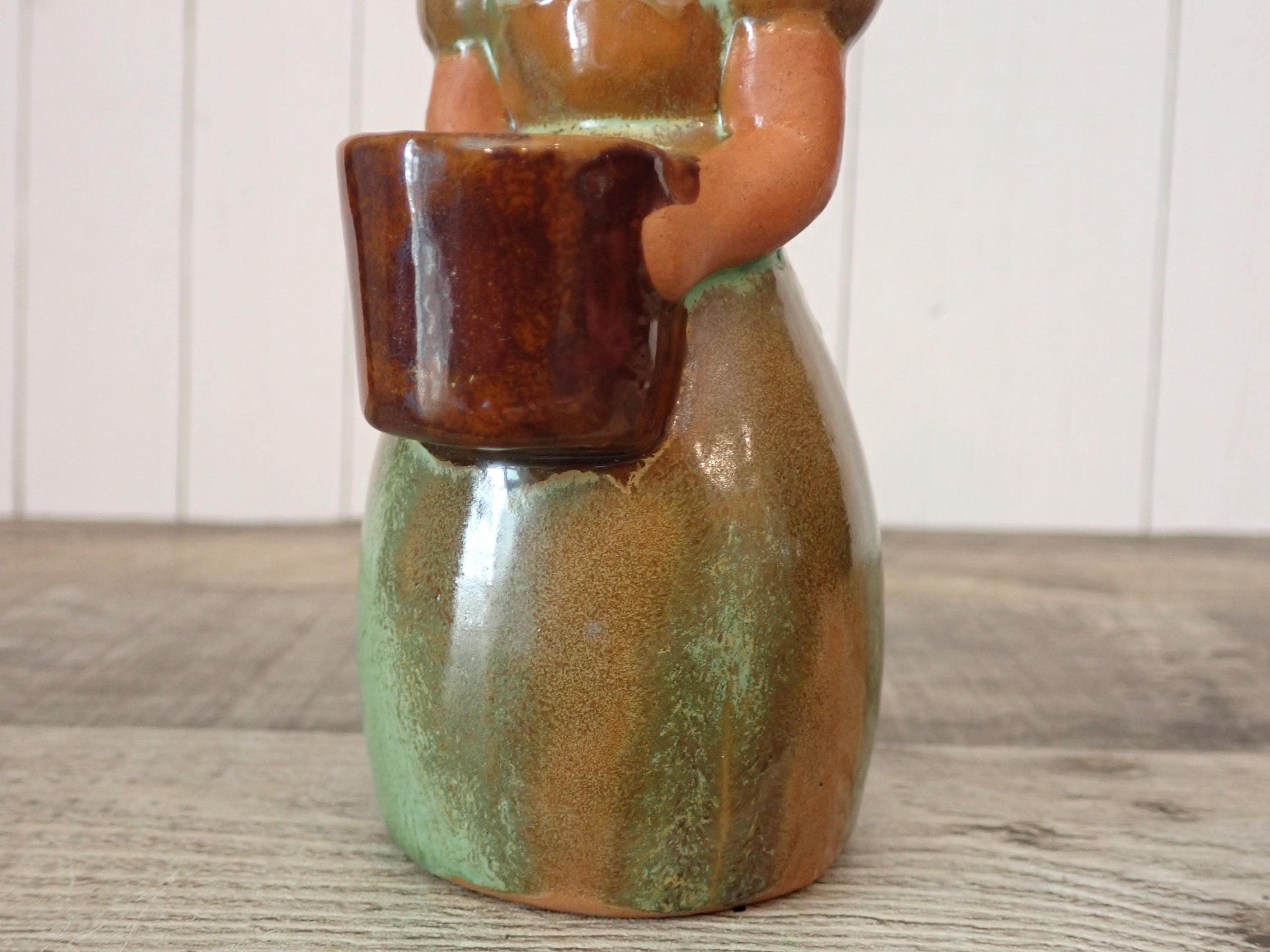 This Frankoma figurine is #700 the gardner girl and is 5.5" tall and 2.5" wide. It is a tan stoneware piece with a green and brown glaze. The standing girl is holding a brown flower pot. The base is marked 700. The piece is in very good condition with no chips or cracks.