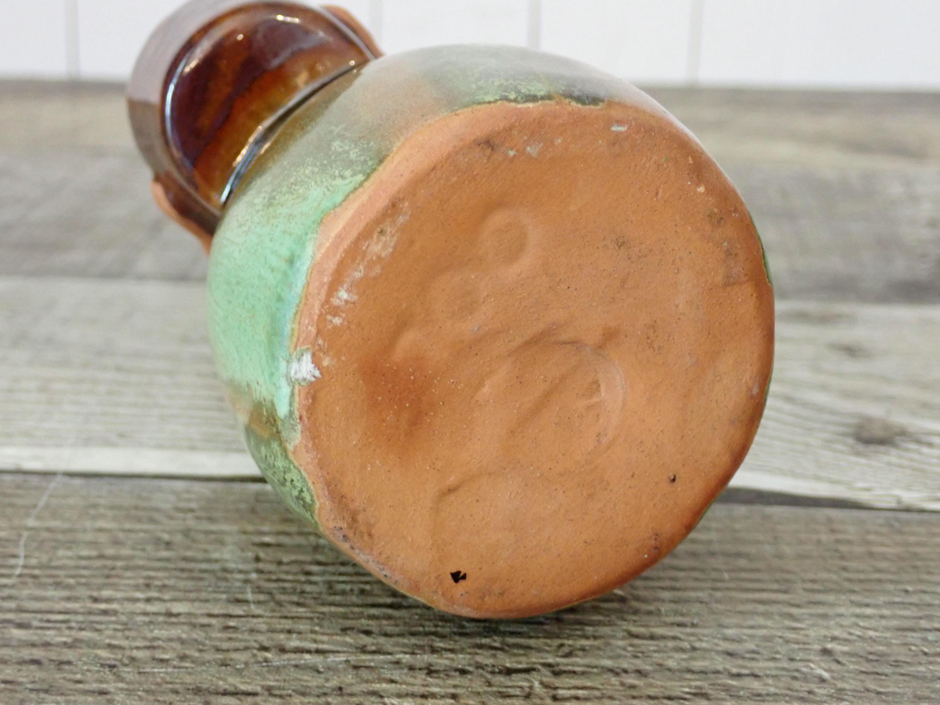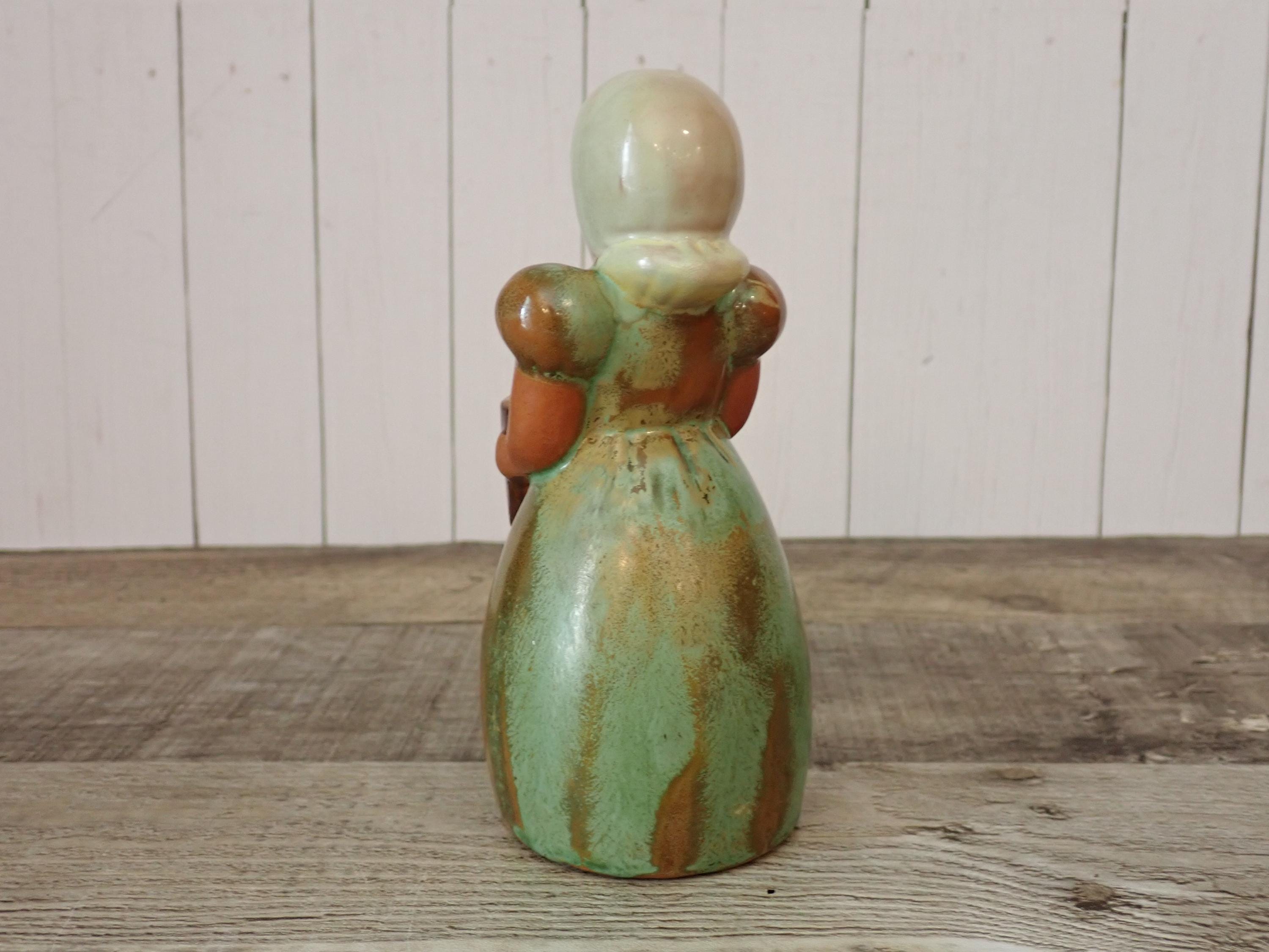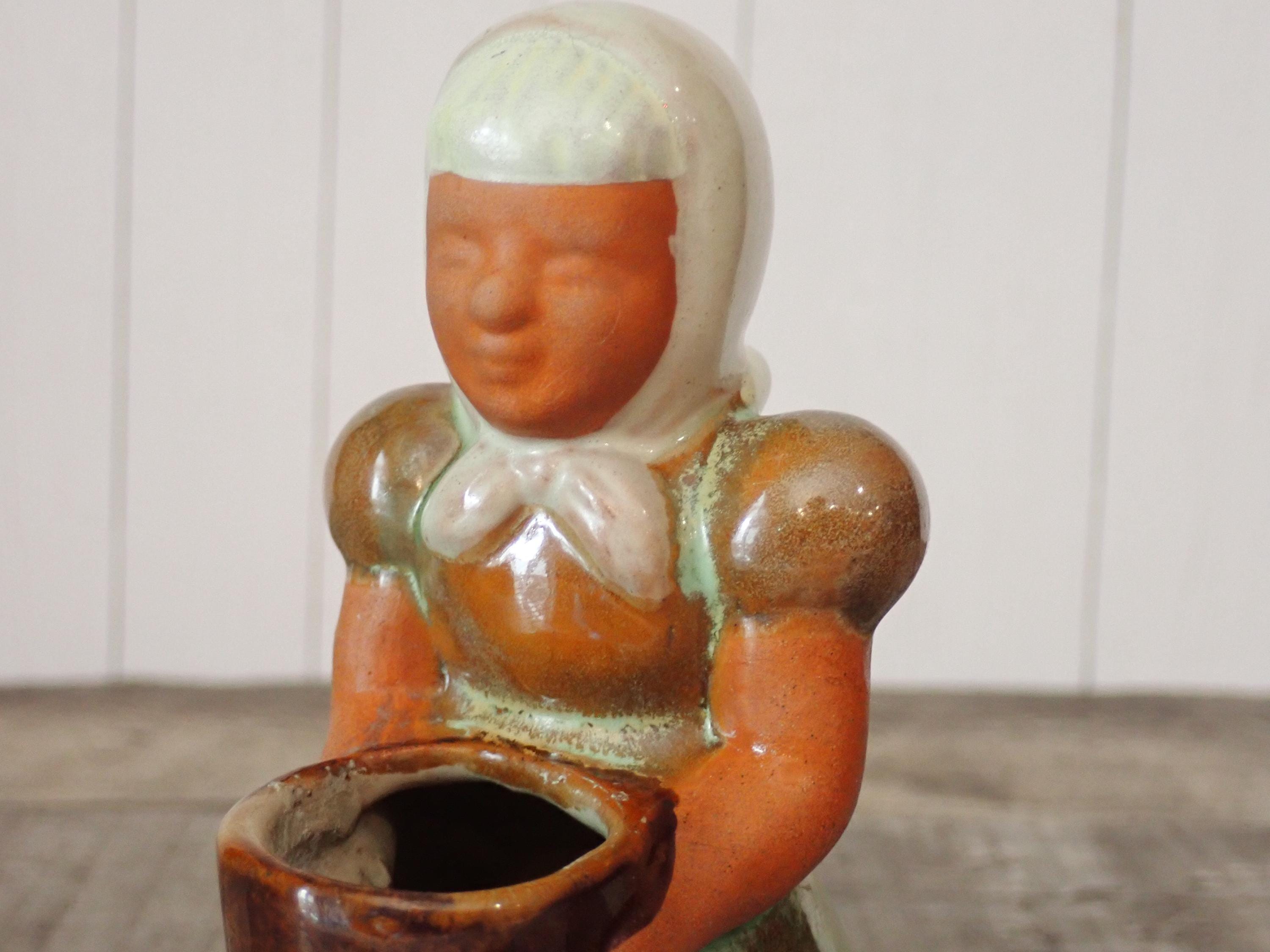 This Frankoma figurine is #700 the gardner girl and is 5.5" tall and 2.5" wide. It is a tan stoneware piece with a green and brown glaze. The standing girl is holding a brown flower pot. The base is marked 700. The piece is in very good condition with no chips or cracks.