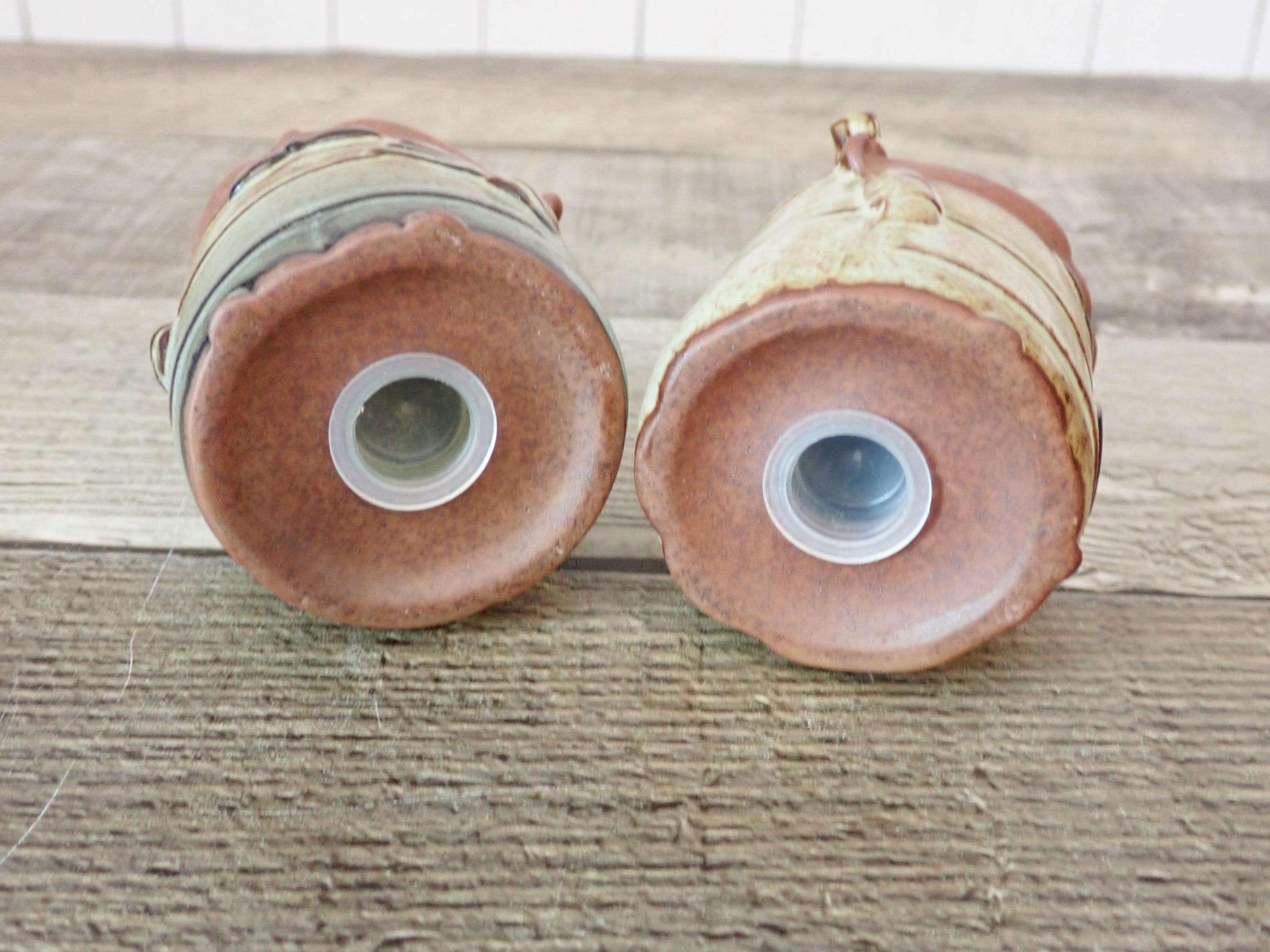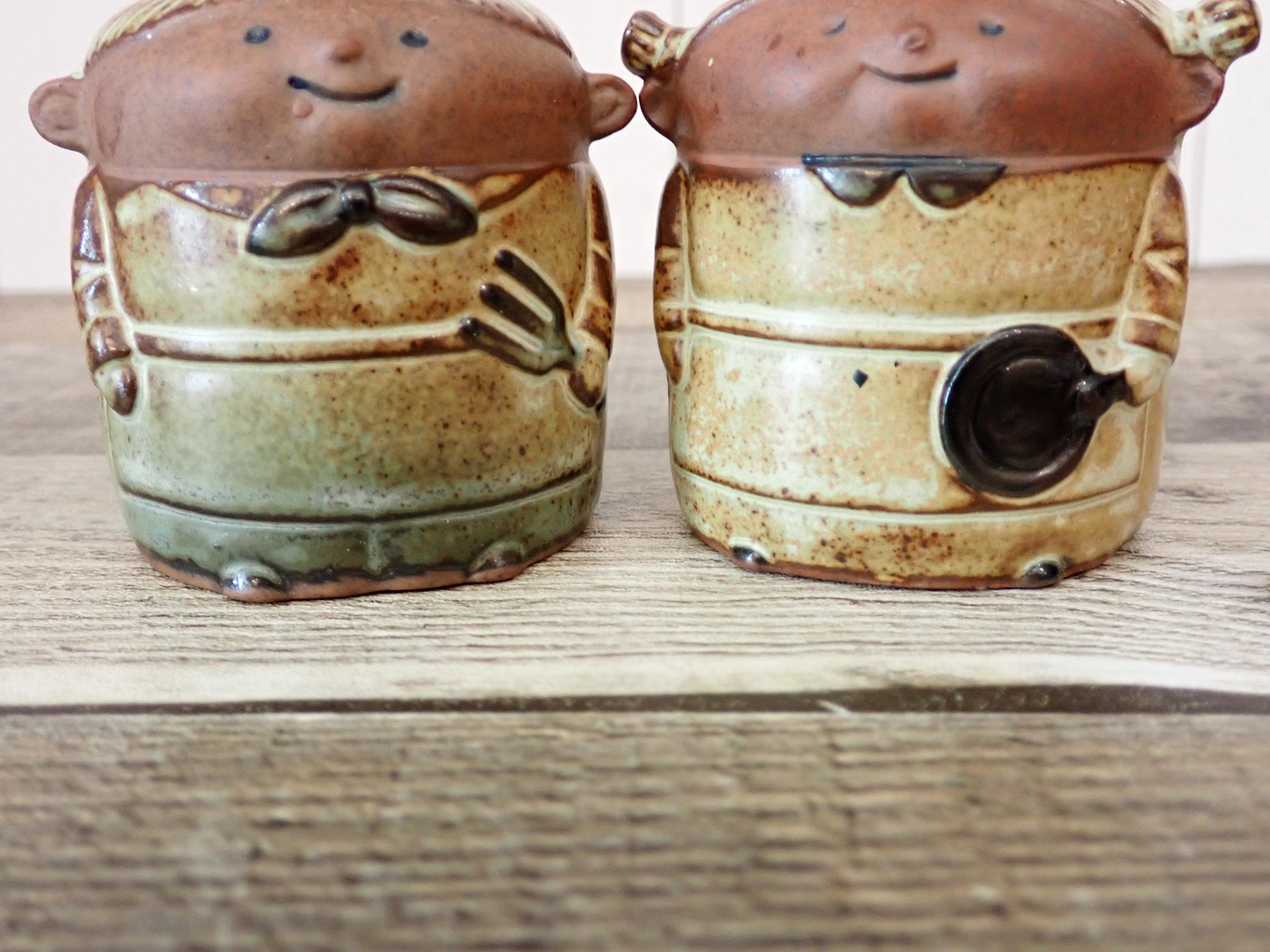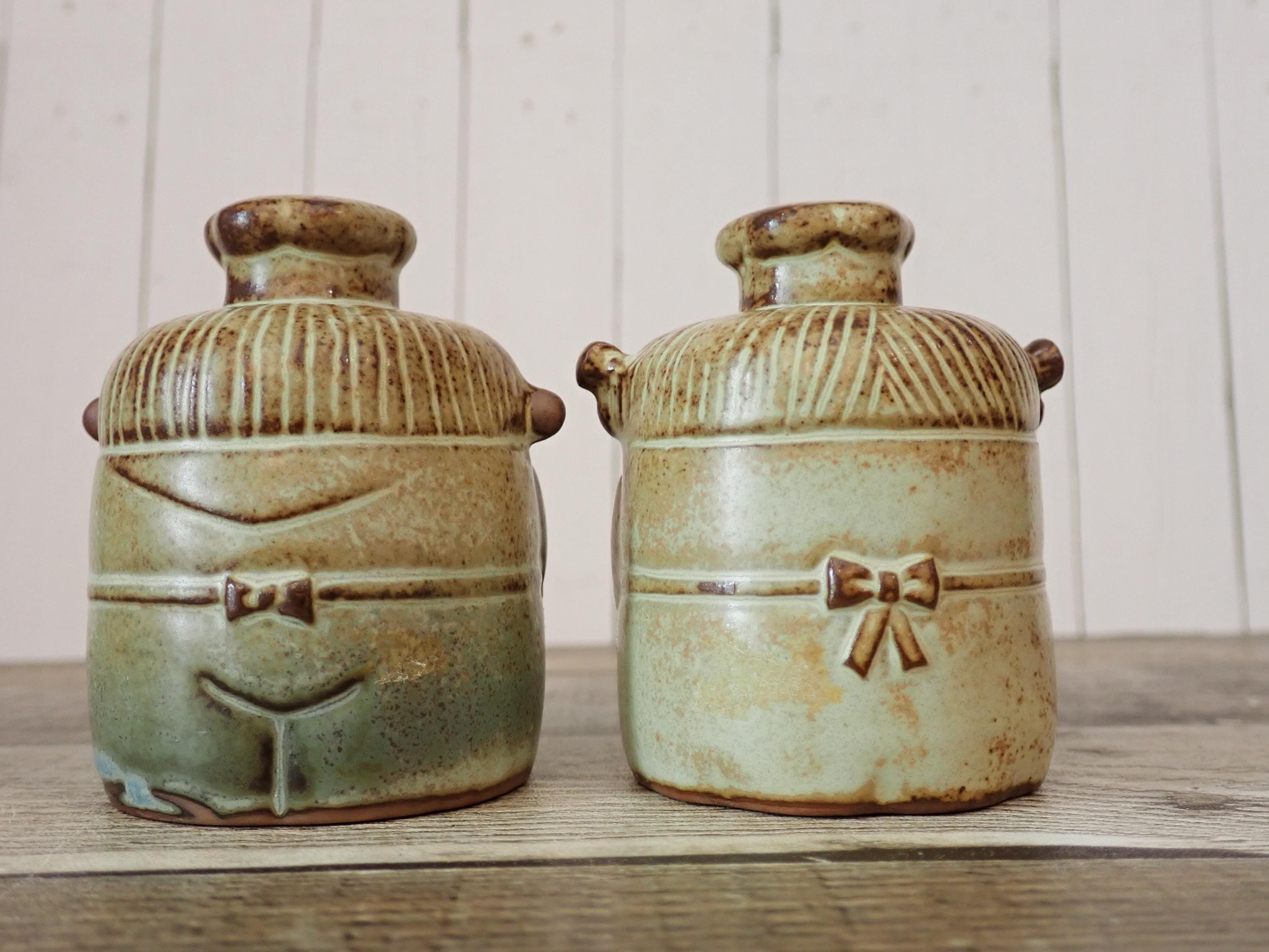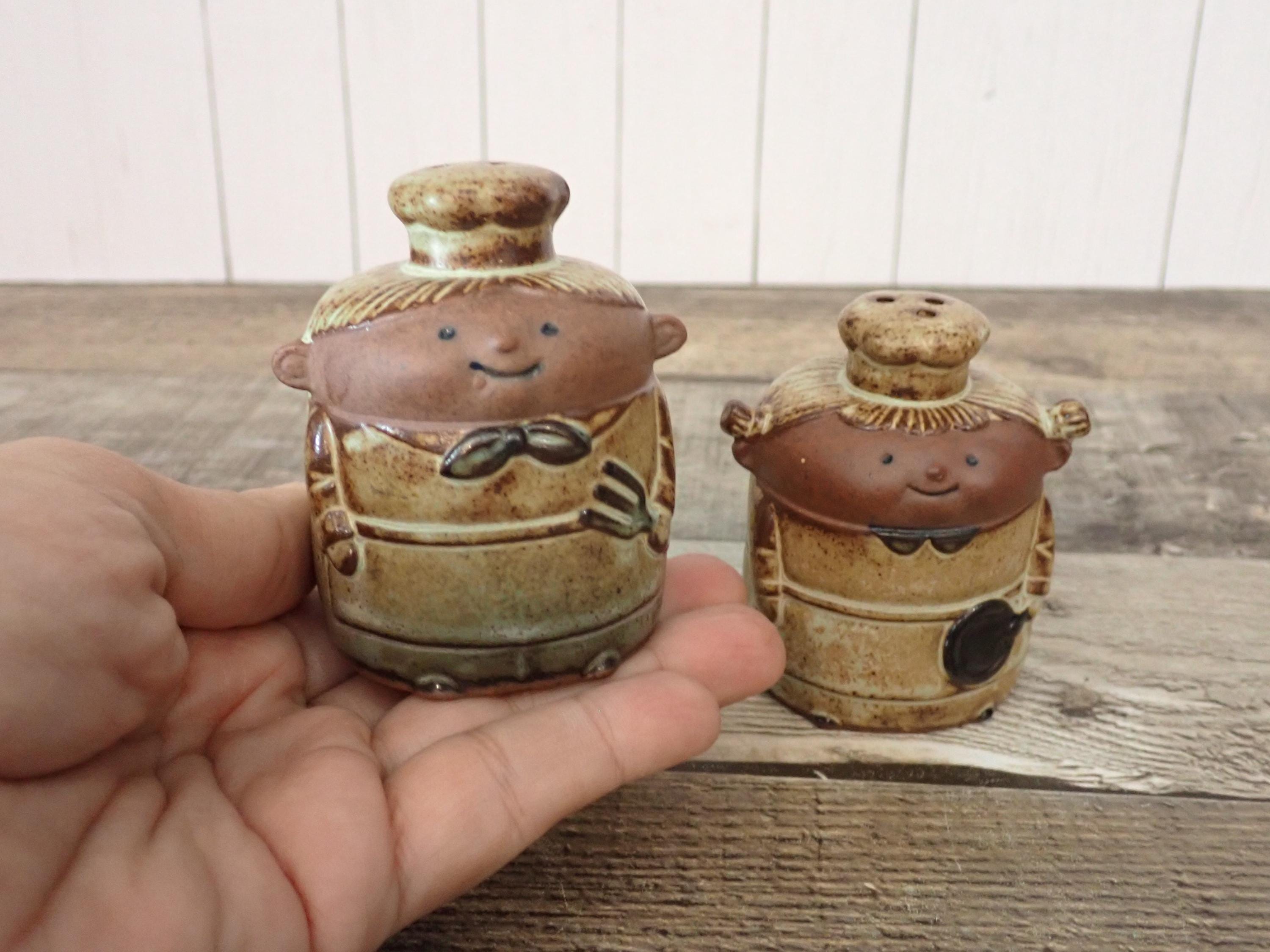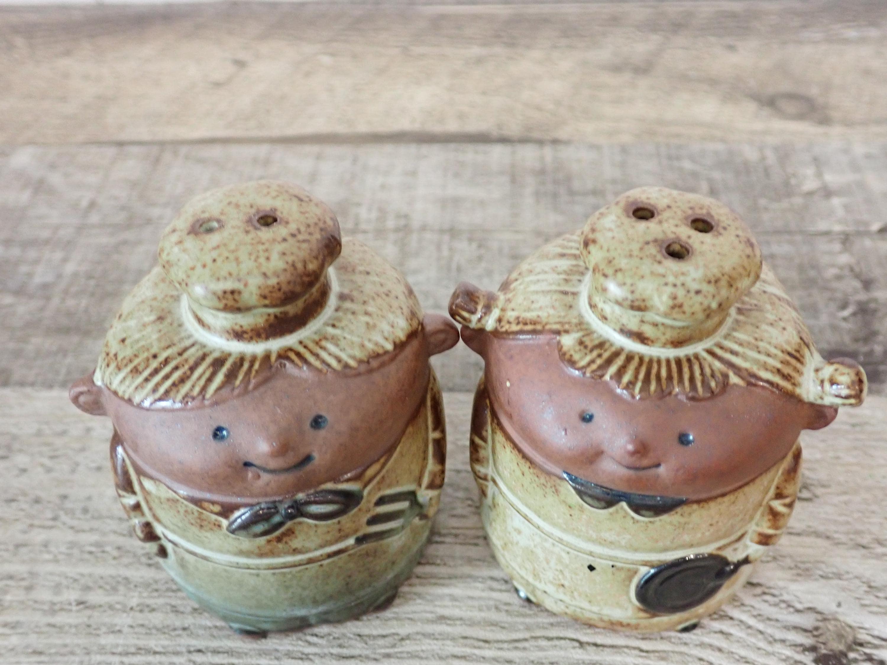 These stoneware salt and pepper shakers 2.75" tall and 2" in diameter. They are tan stoneware pieces with a white/beige glazes. Their faces are an unglazed tan stoneware. The shakers are nicely detailed with subtle textured designs on their clothing and faces. There are holes in the top of each shaker and both pieces have plastic stoppers in the bottom. Both shakers are in very good condition with no chips or cracks.