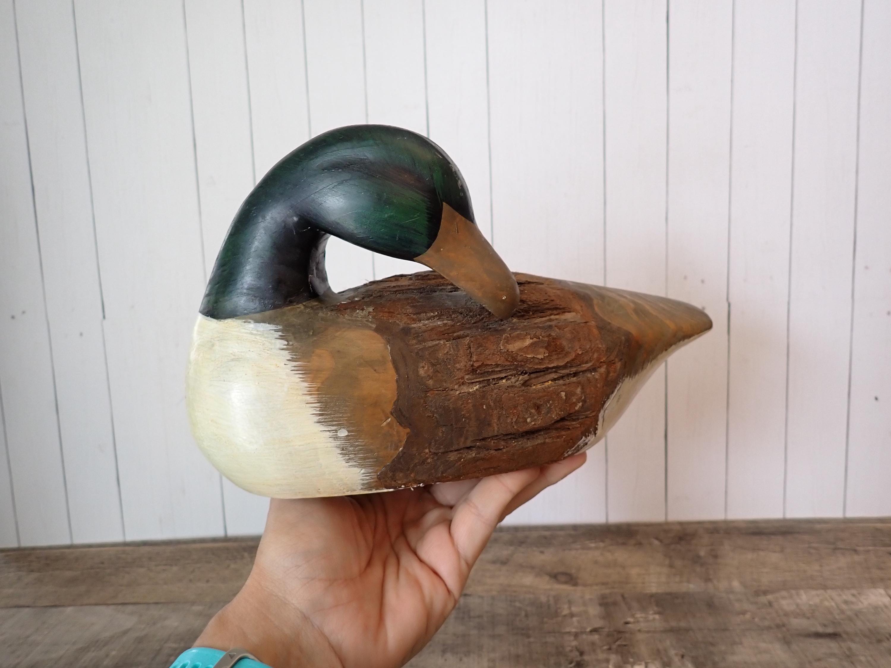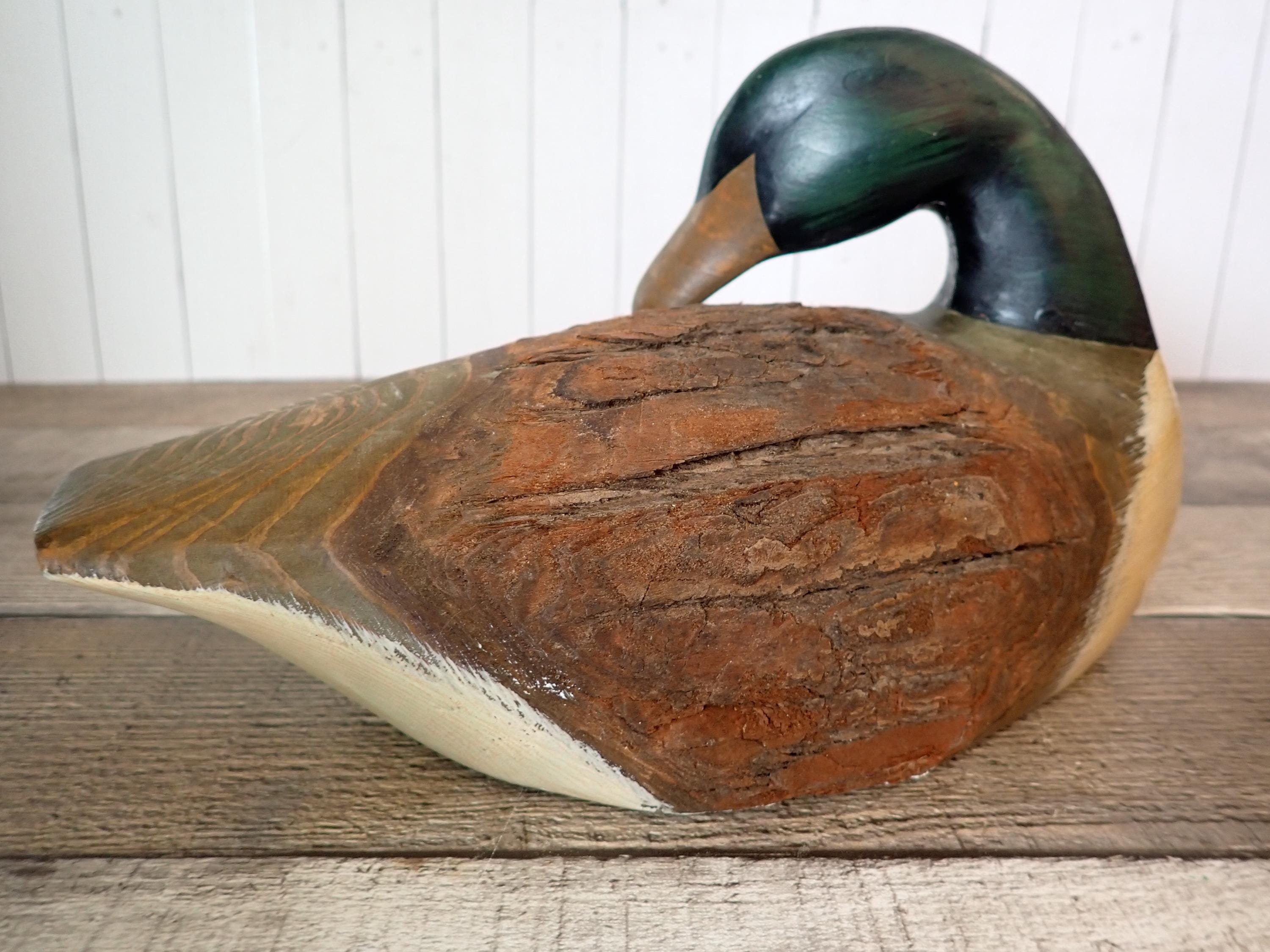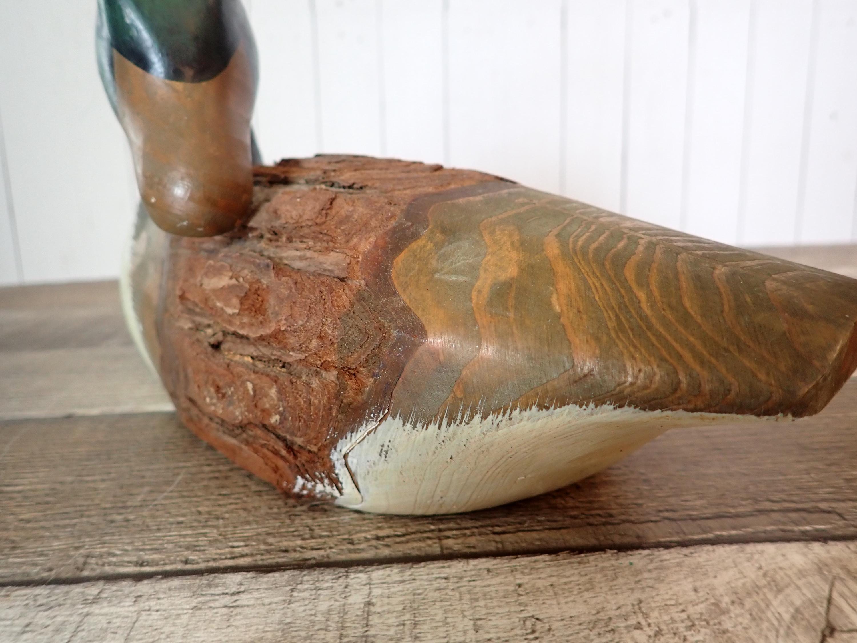 This wooden duck decoy is 10" long, 5" wide, and 6" high. It is a carved wood piece and has a rustic brown, white and green paint finish. The middle section of the duck is uncarved bark. The decoy is in very good condition with no damage.