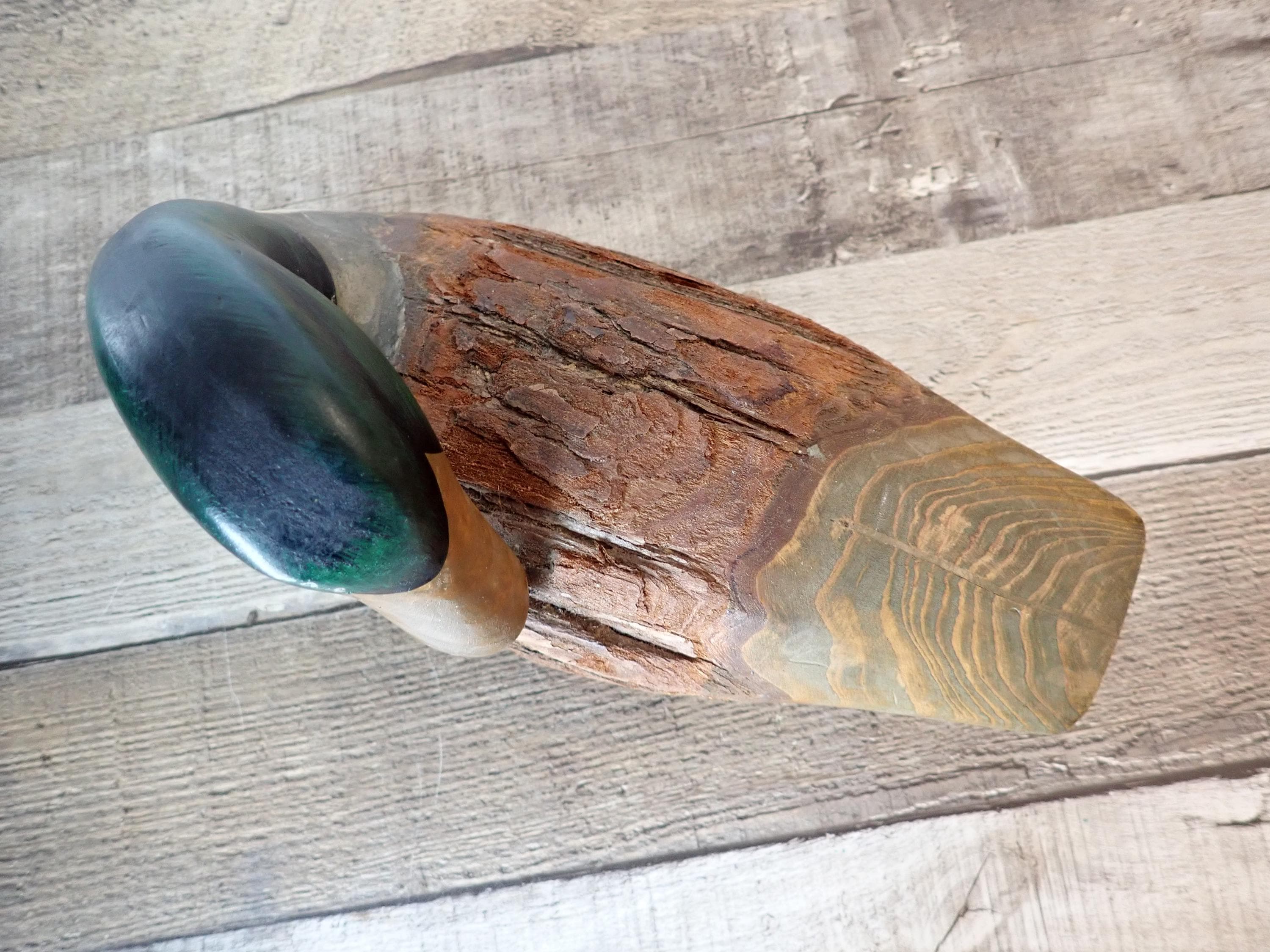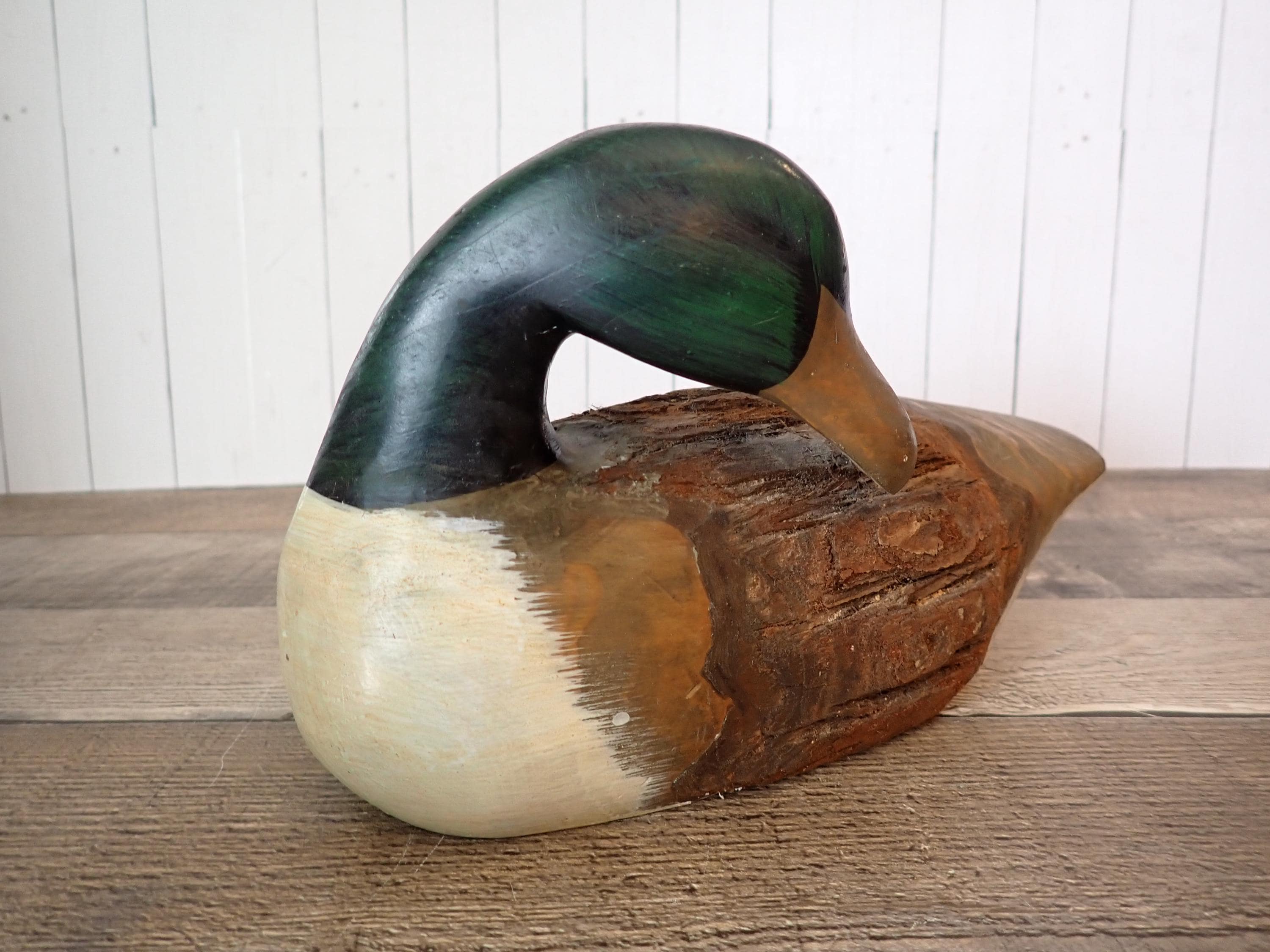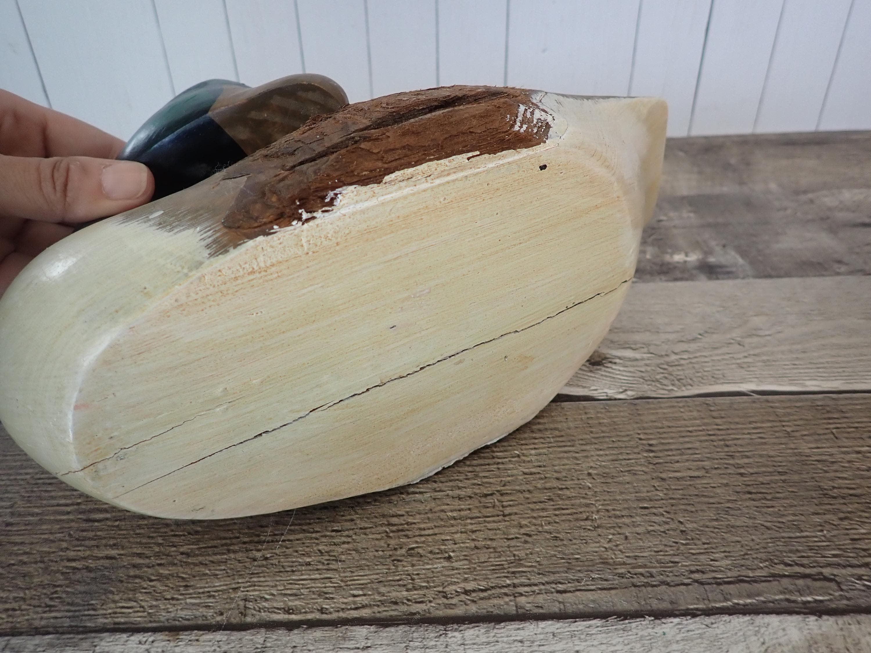 This wooden duck decoy is 10" long, 5" wide, and 6" high. It is a carved wood piece and has a rustic brown, white and green paint finish. The middle section of the duck is uncarved bark. The decoy is in very good condition with no damage.