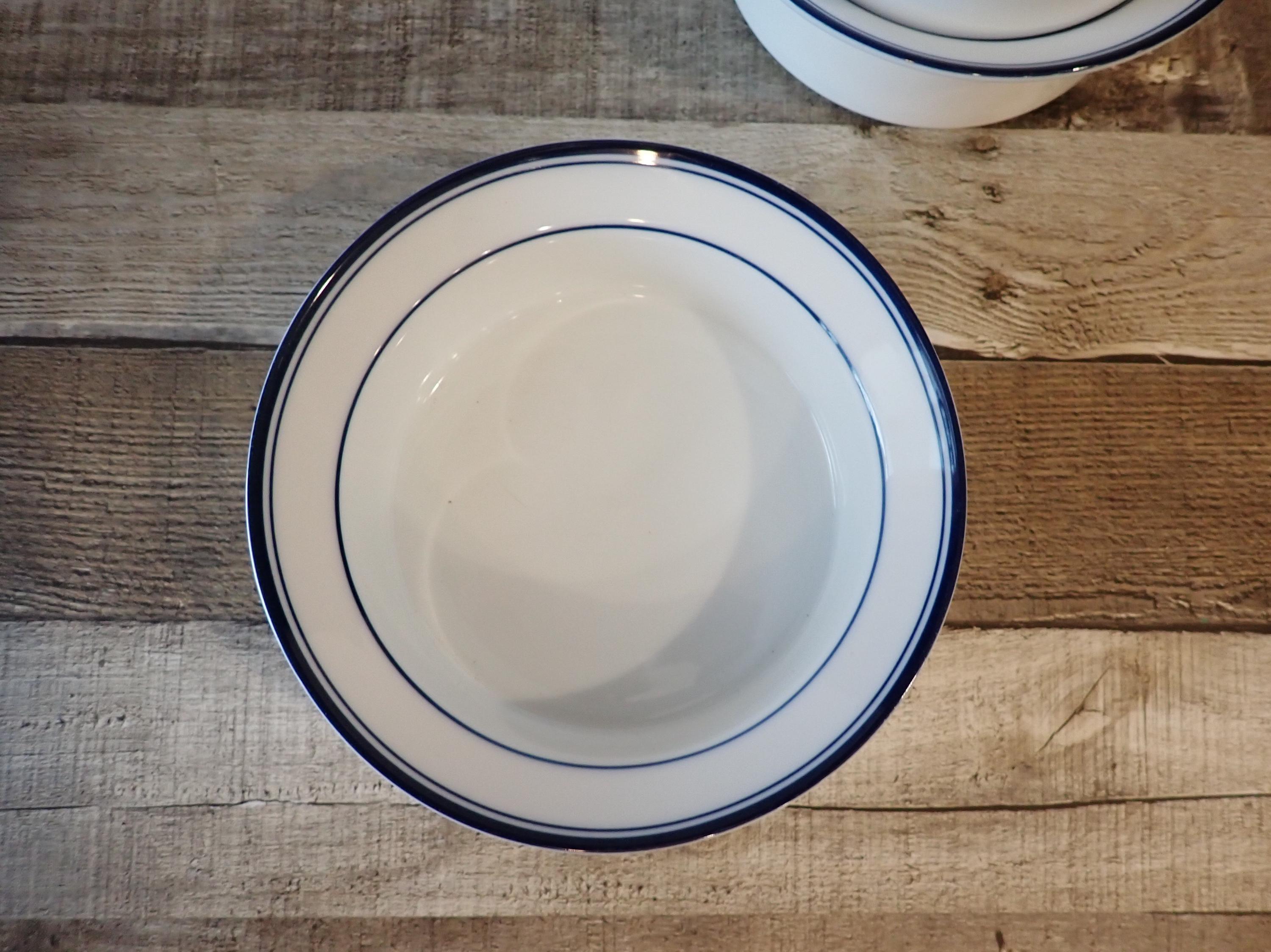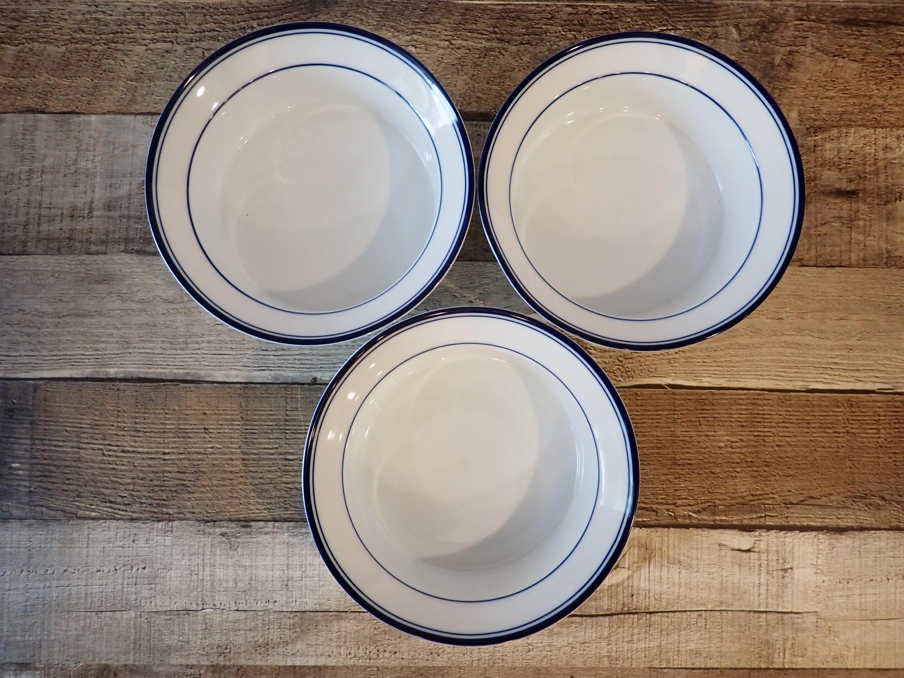 This set of 3 cereal bowls by Dansk are in the Concerto Allegro Blue pattern. The bowls are a white stoneware with a blue band around the rim. They are 6.75" in diameter and 2.5" tall, and have a wide rim. The bottom of each bowl is marked: DANSK / CONCERTO / ALLEGRO BLUE / NR SRI LANKA / MICROWAVE/DISHWASHER SAFE. All 3 bowls are in very good condition with no chips or cracks, and very few utensil marks.