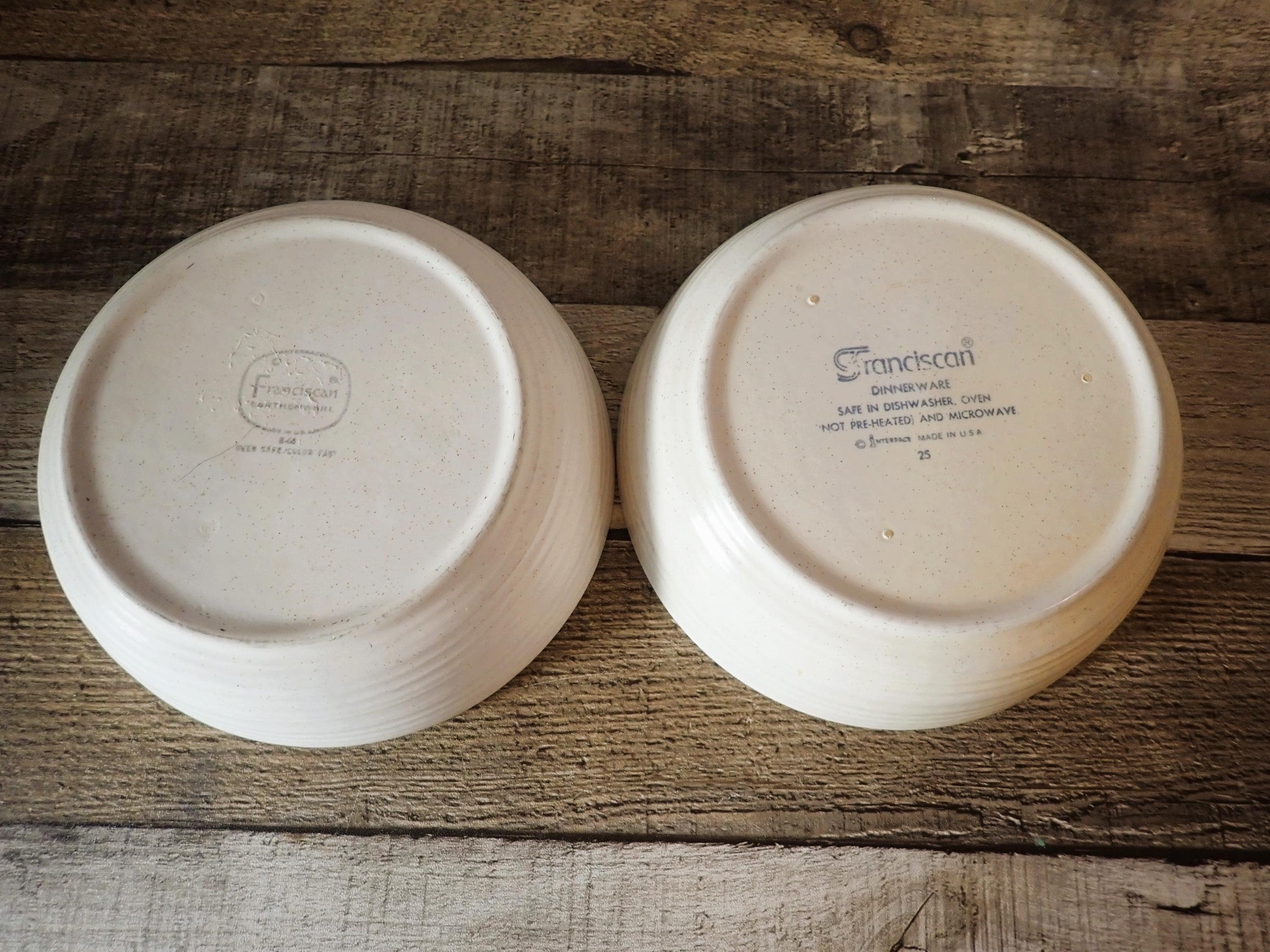 This set of 2 bowls by Franciscan are in the Hacienda Gold pattern and are the 6" Cereal Bowls. They are a white ceramic with light brown flecking, and accented with a yellow glaze on the inside of the bowl. The bowls are 6.25" in diameter, and 3" tall. The bowls are in good condition with no chips or cracks, however the bowls are not perfect. One of the bowls does have some light gray scratches on the inside bottoms, and the other bowls has a bit of a yellow glaze on the outside of the bowl - it is not a pure white - these issues are shown in detail in the last 3 photos.