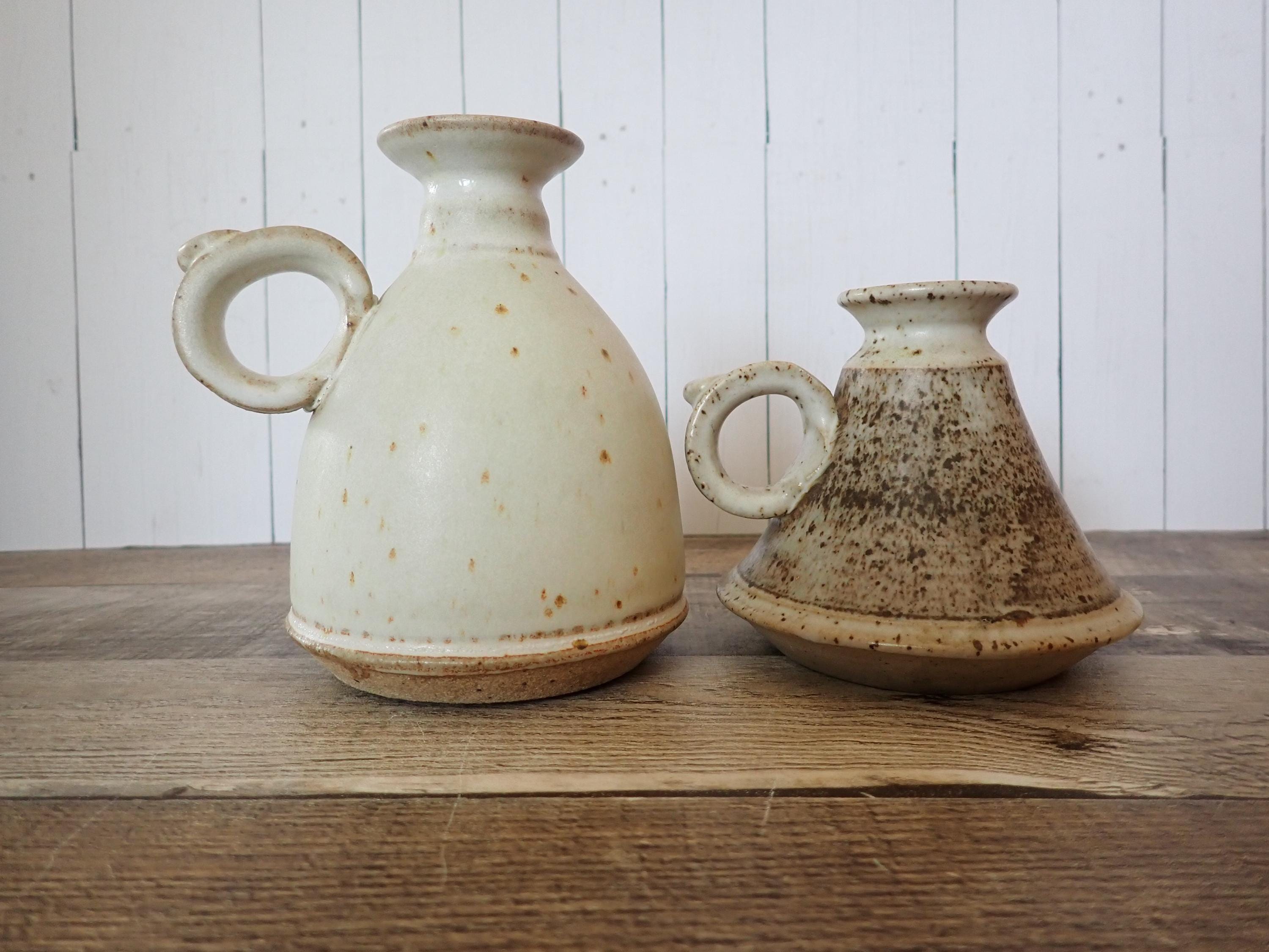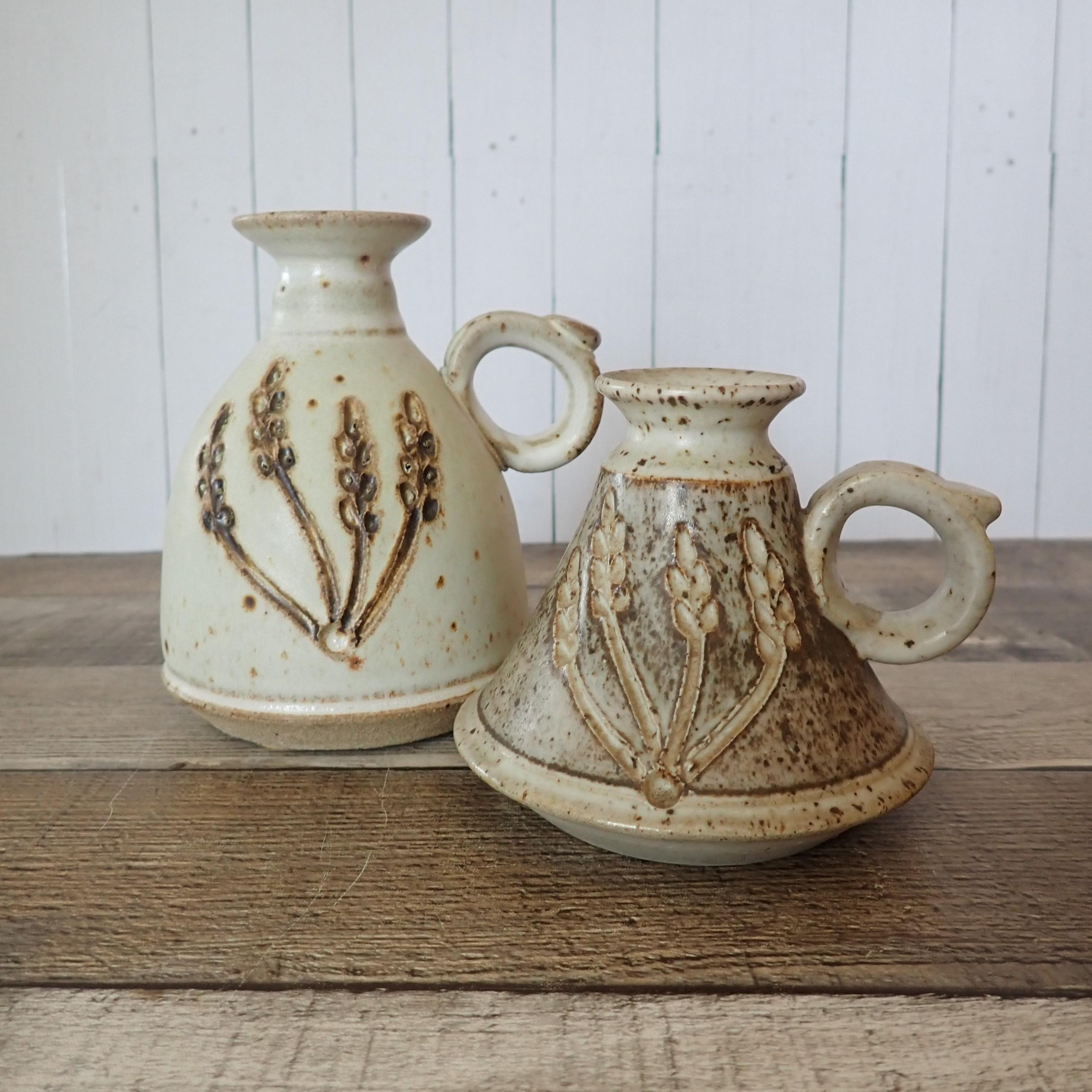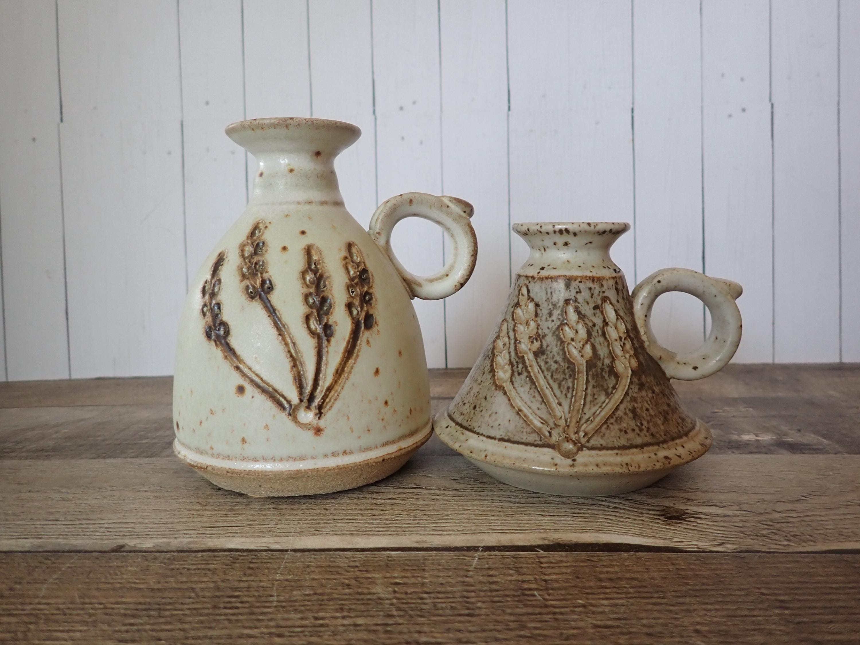 This set of 2 stoneware oil lamps includes 2 coordinating lamps by the same artist. They are both jug shaped pottery pieces and are 5" and 3.75" tall. They are both about 4" in diameter at the bases. The openings at the top are 3/4" in diameter. One is white and one is more gray, and both etched designs of wheat stalks on the fronts. The back sides are plain. There is a loop style handle on one side. There are no makers marks on this pieces. Both oil lamps are in very nice condition with no chips or cracks.