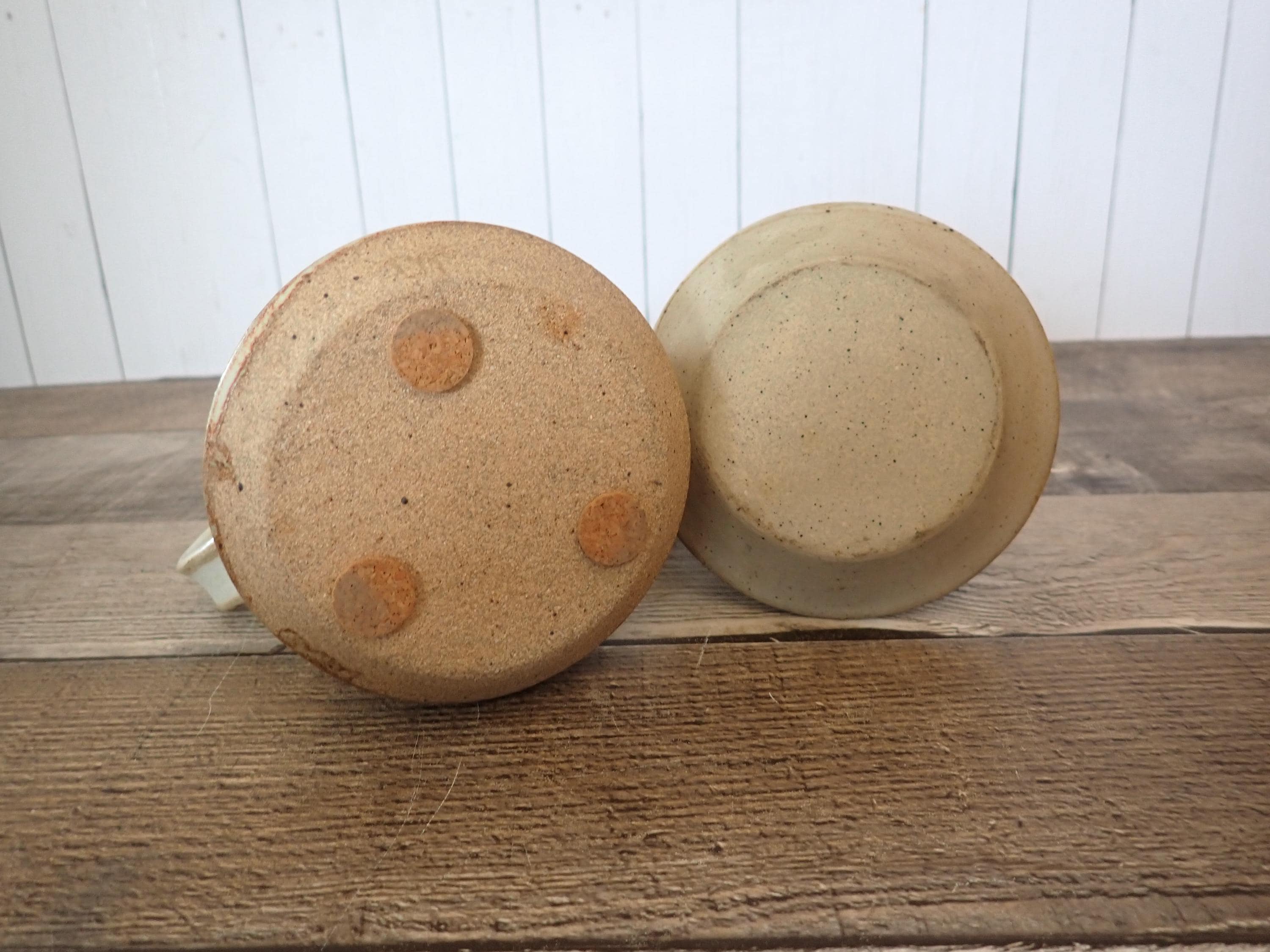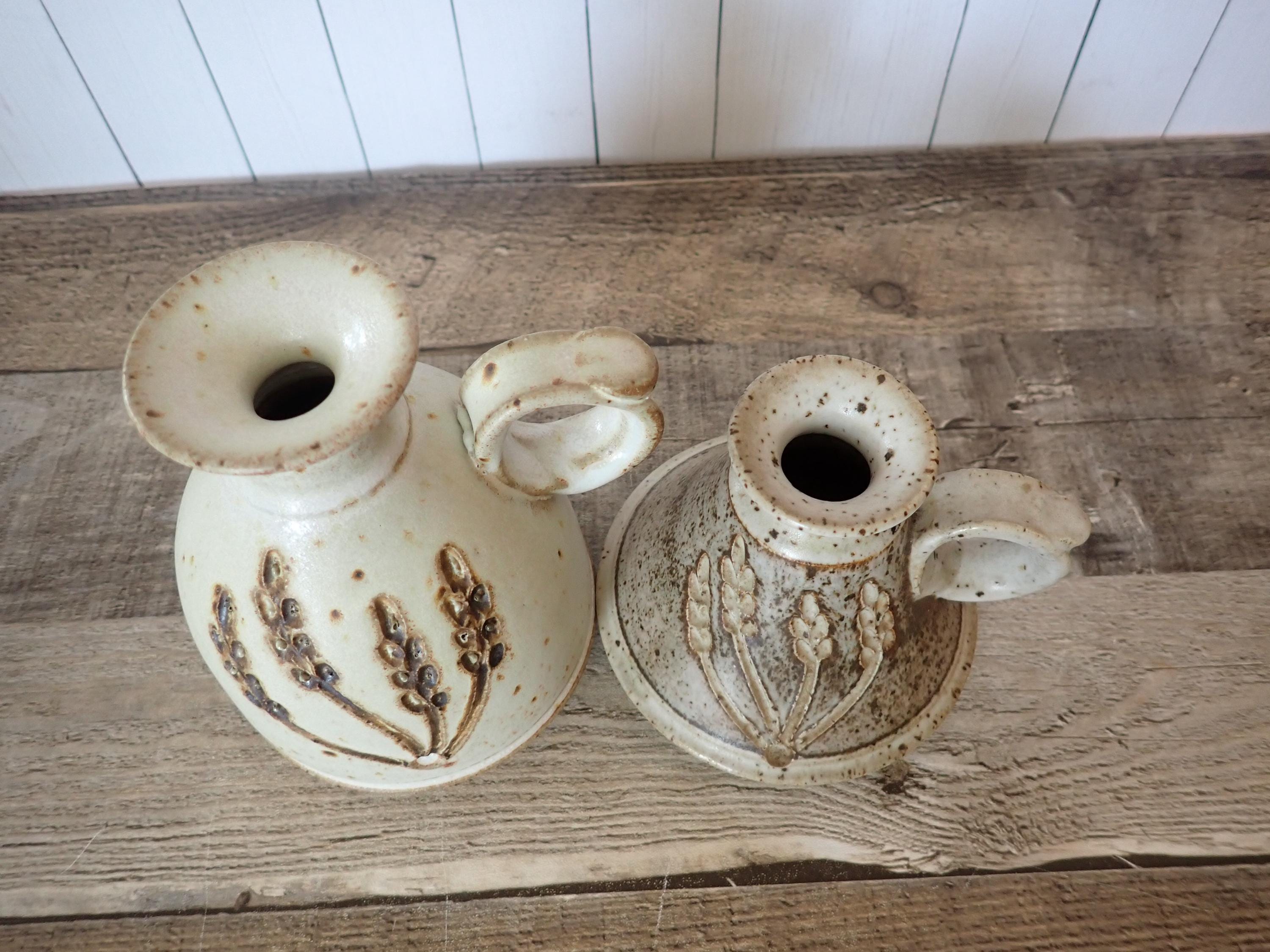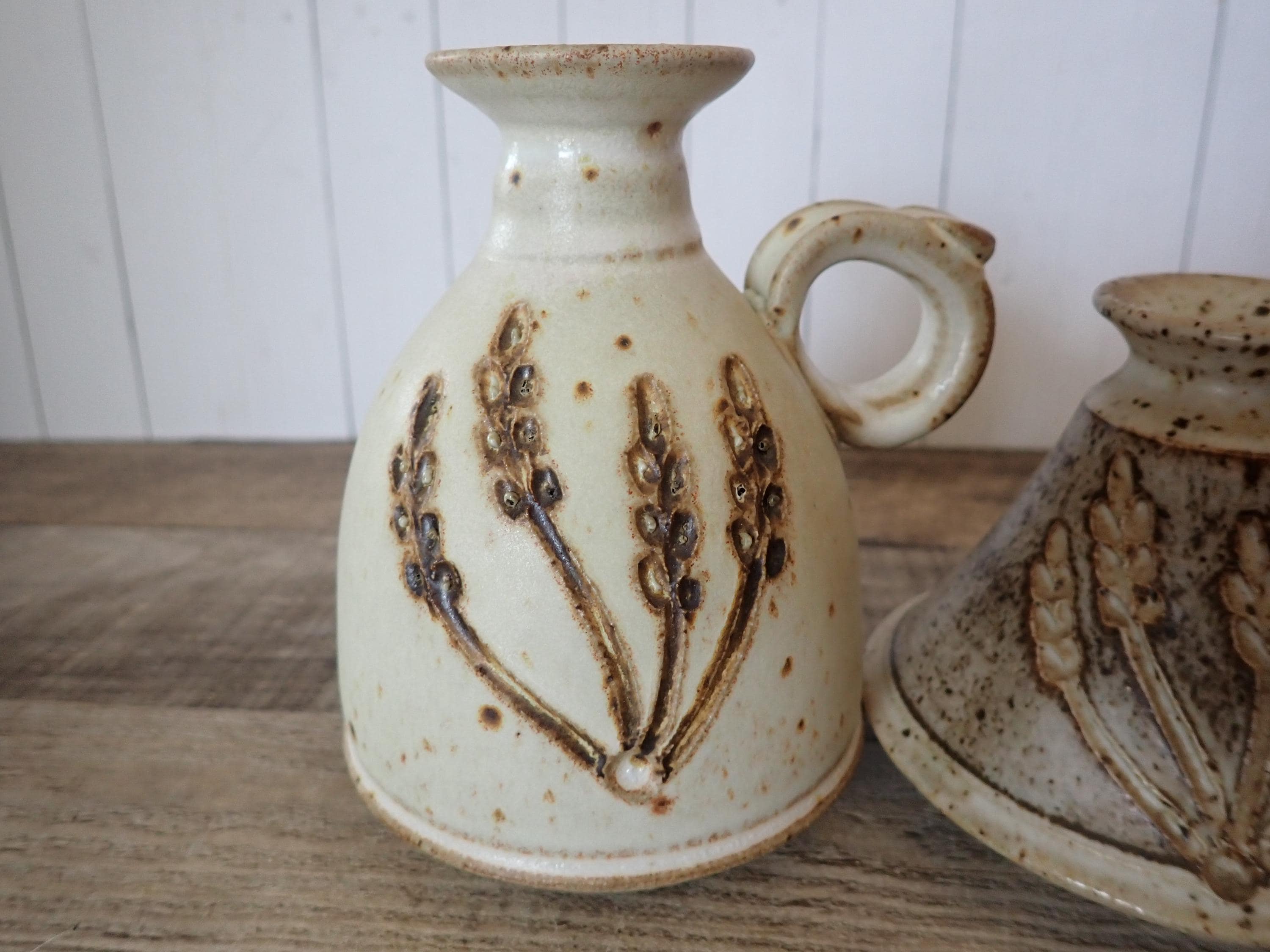 This set of 2 stoneware oil lamps includes 2 coordinating lamps by the same artist. They are both jug shaped pottery pieces and are 5" and 3.75" tall. They are both about 4" in diameter at the bases. The openings at the top are 3/4" in diameter. One is white and one is more gray, and both etched designs of wheat stalks on the fronts. The back sides are plain. There is a loop style handle on one side. There are no makers marks on this pieces. Both oil lamps are in very nice condition with no chips or cracks.