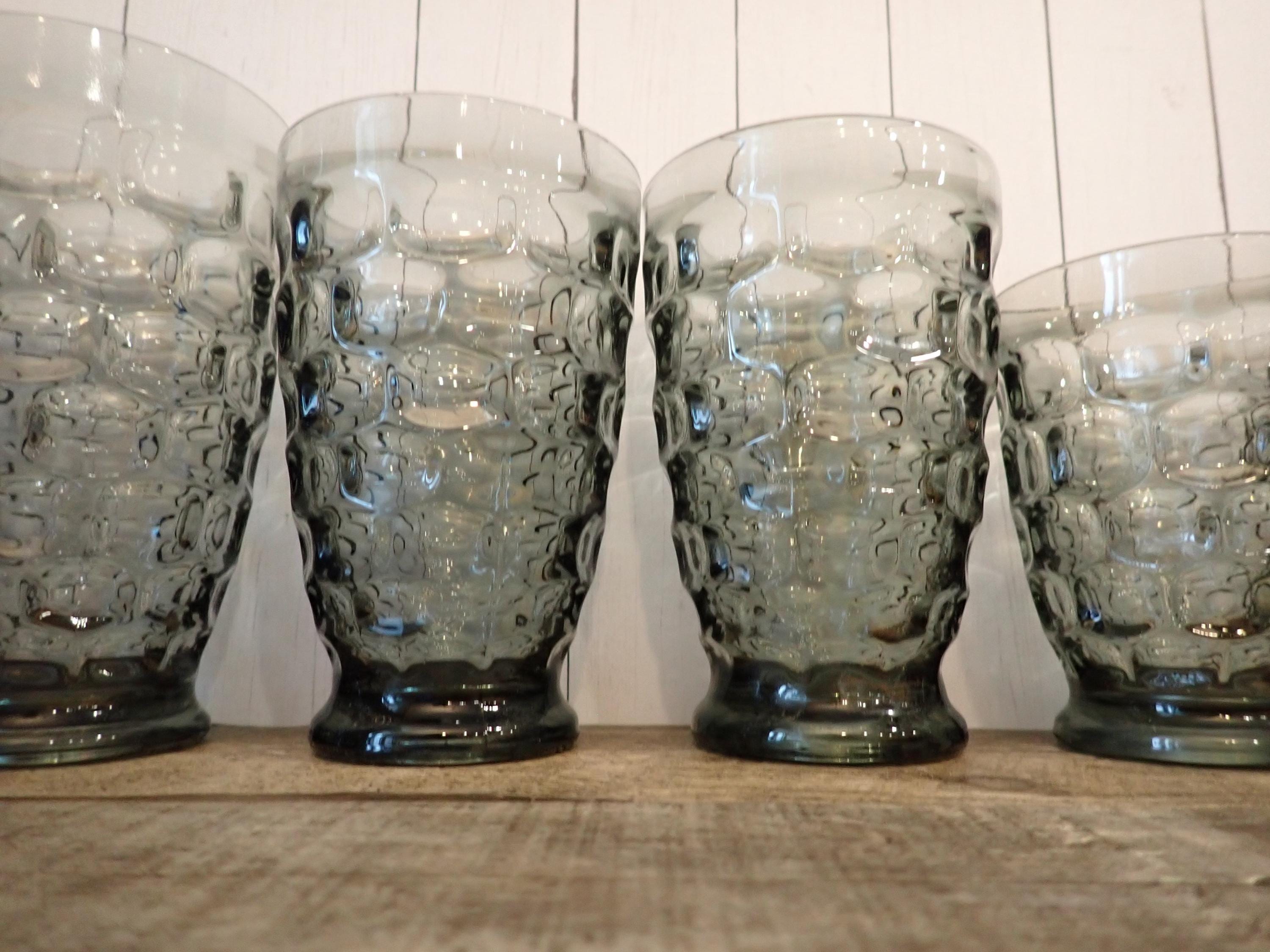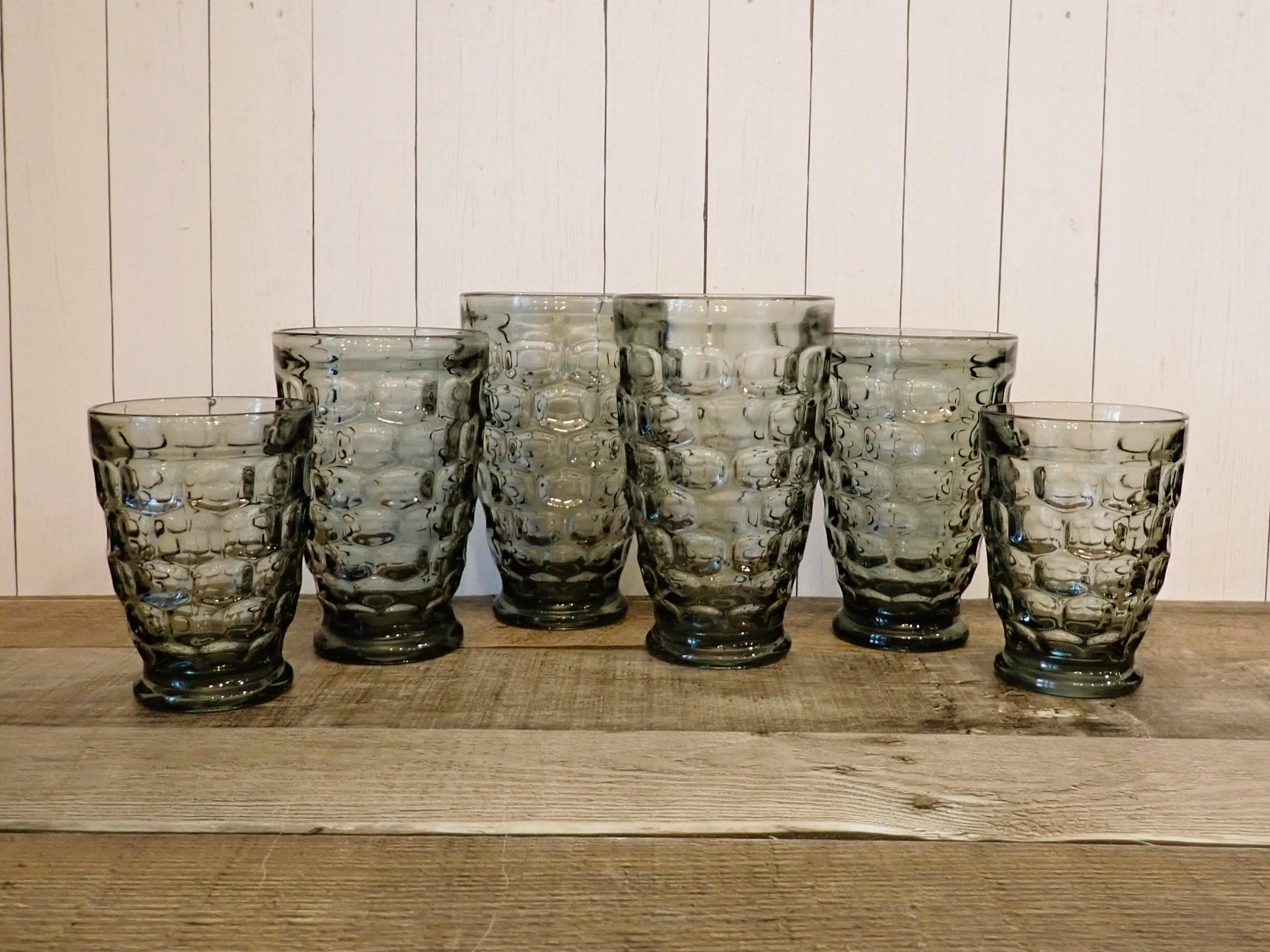This set of glasses by Federal Glass are in the Yorktown pattern and are the Sundown gray color. They are a light gray colored glass, with a textured oval dot design around the glass. They have a small round footed base. This set includes 6 glasses in 3 graduated sizes - included are: