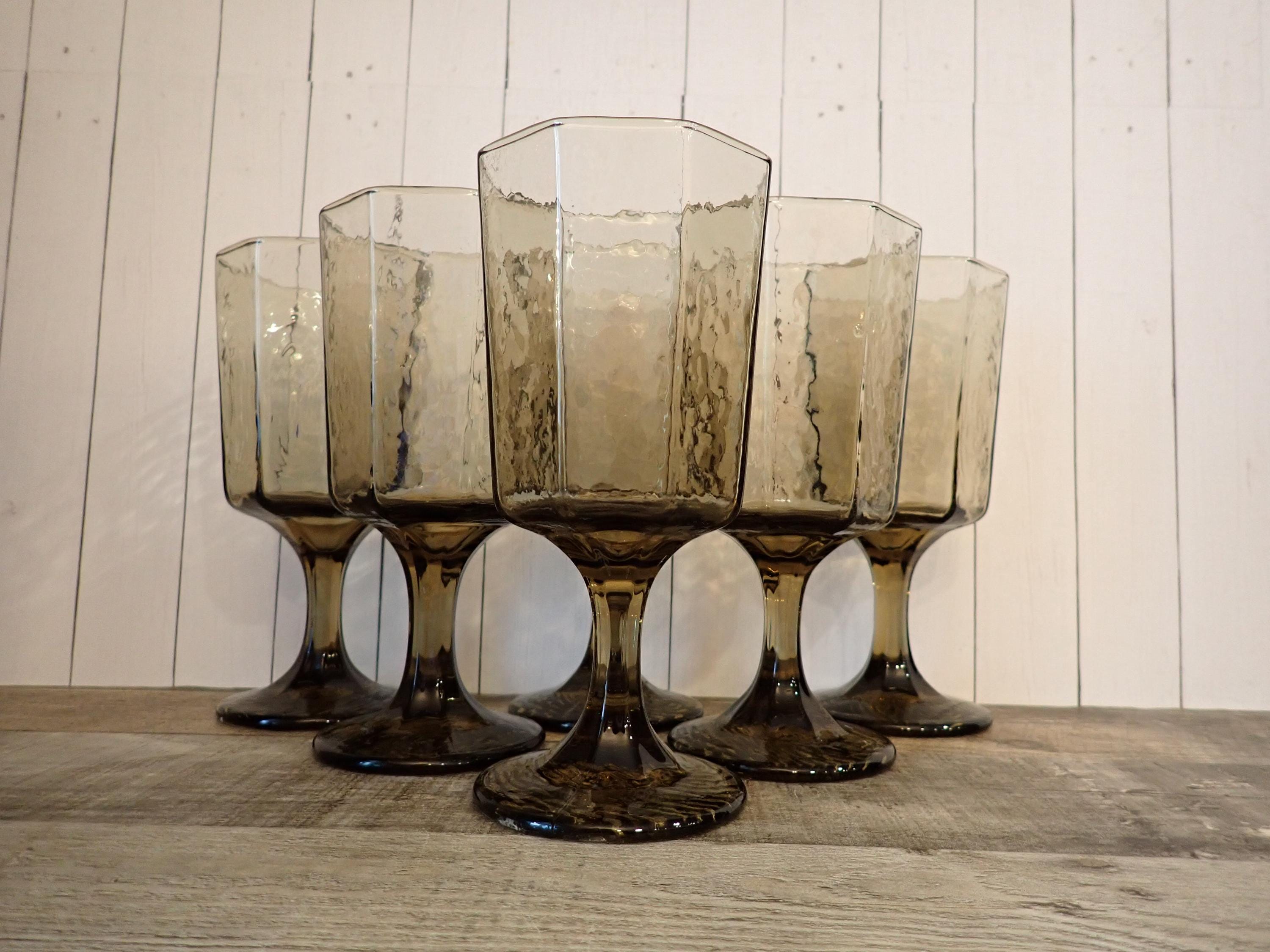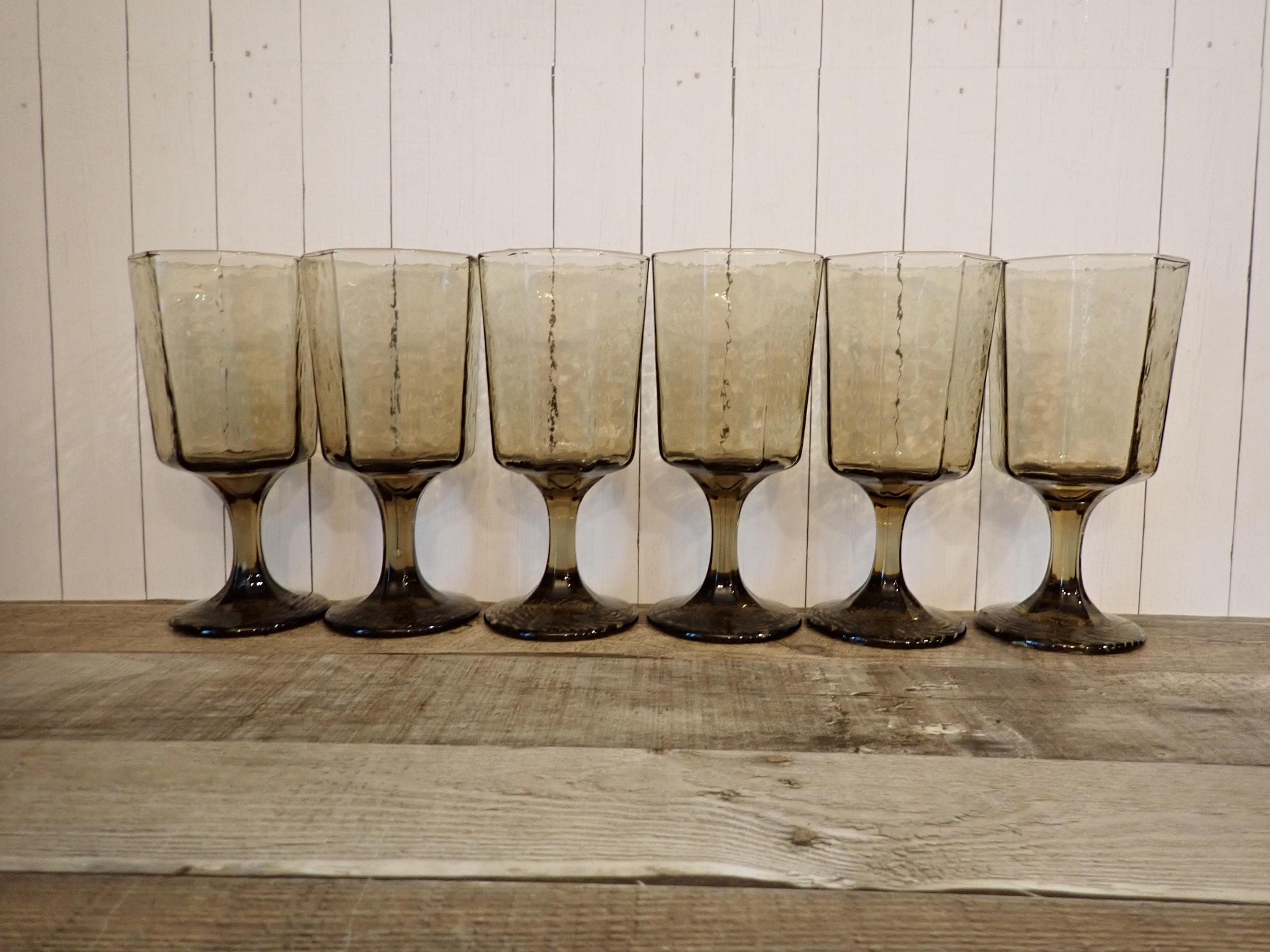 This set of 6 Libbey water goblets are the tawney brown color in the Facets pattern. They are 7" tall and 3" in diameter, and have an octagon shaped bowl. The glass has a lightly mottled texture. The glasses can hold 12 oz. filled to the rim - these are the larger size glass available in this pattern - the wine glasses are the same style but smaller. All 6 glasses are in very good condition with no chips or cracks. Great set of Libbey water goblets!