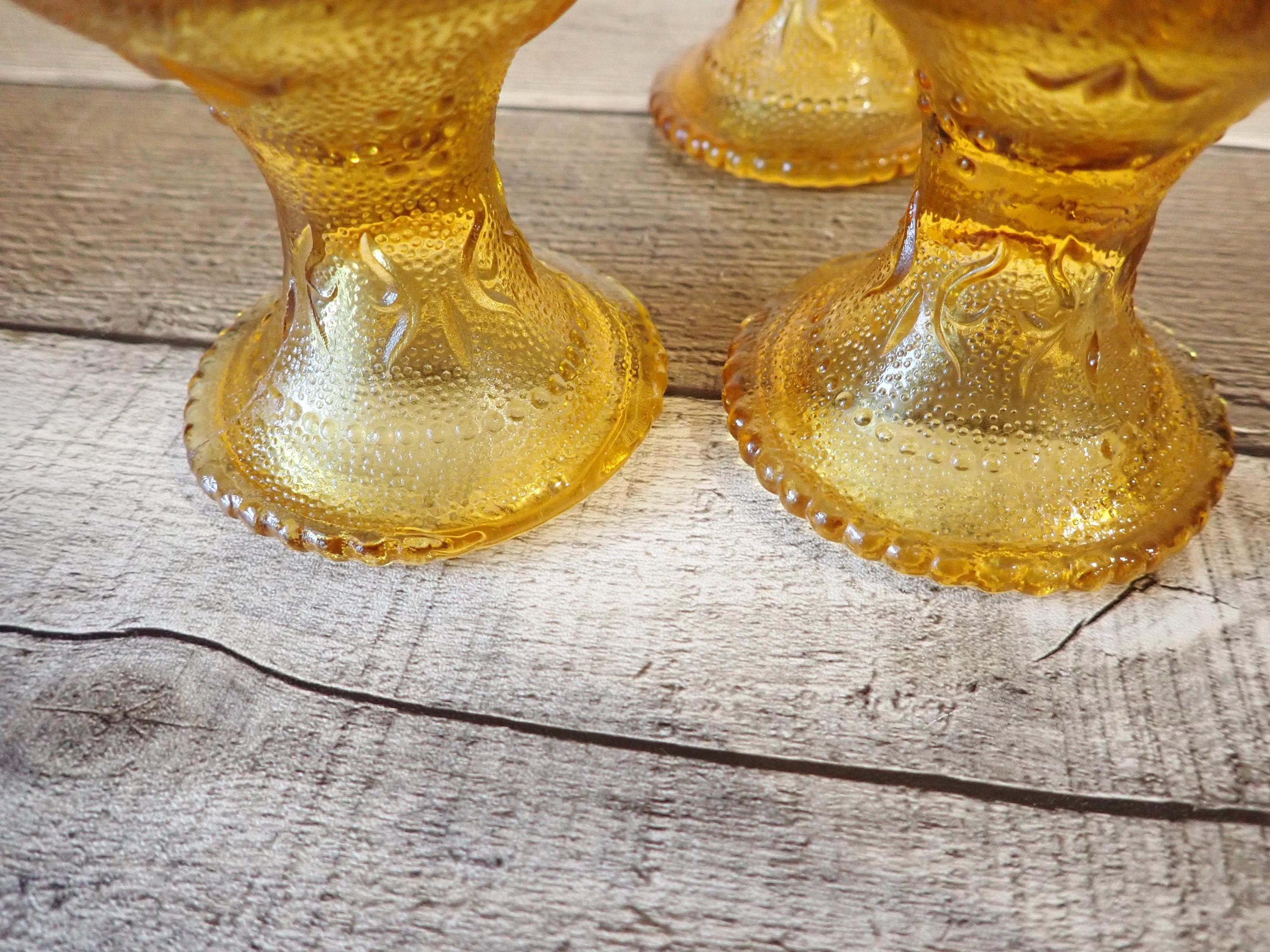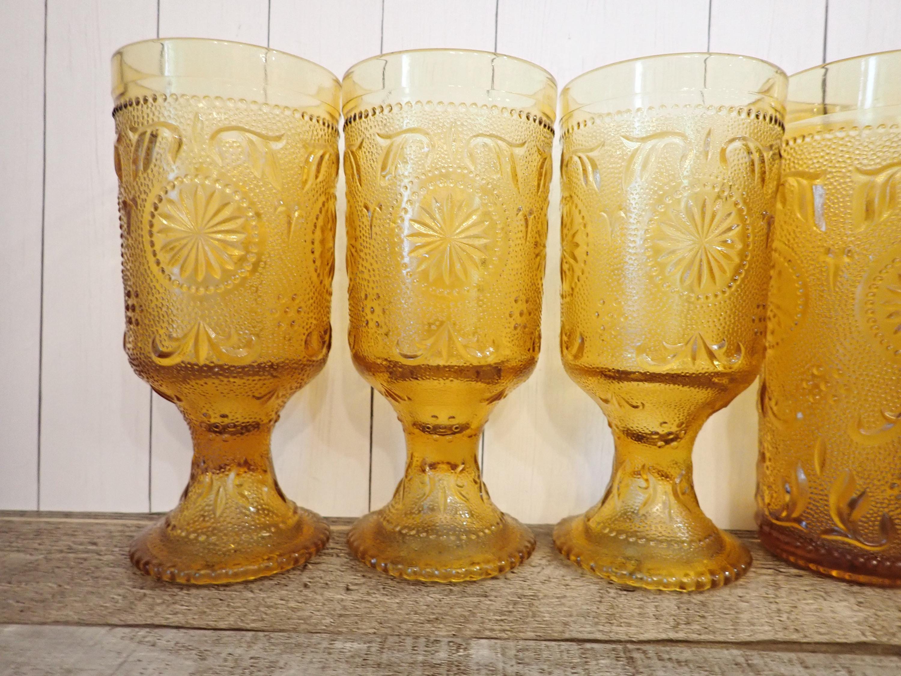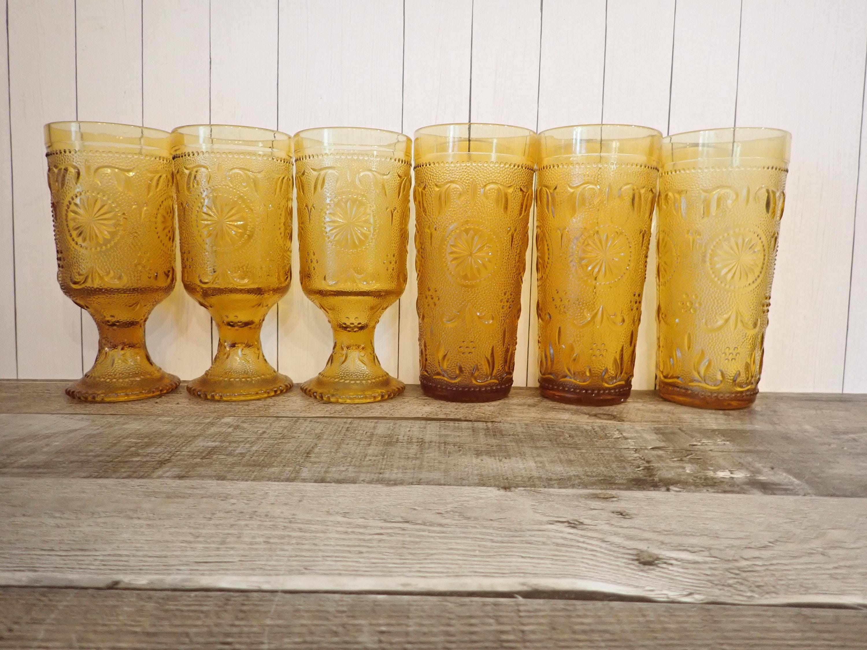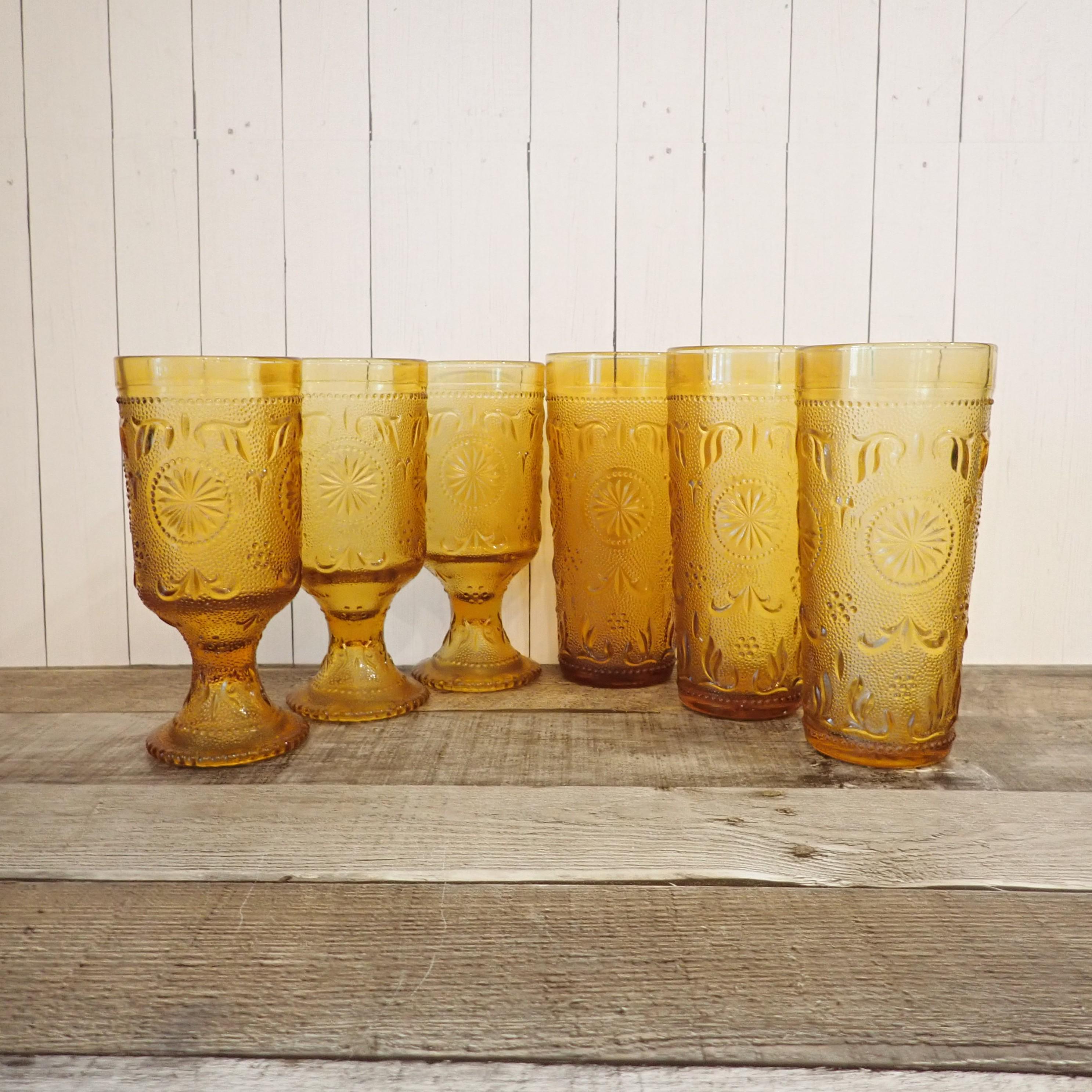 This set of 6 glasses by Brockway Glass Company are in the American Concord Amber pattern. This set of 6 glasses includes 3 tumblers and 3 water goblets. The glasses are 6.5" tall and 3" in diameter (the water goblets are just slightly shorter.) They are a rich amber color and have a raised daisy flower and scroll design. All 6 glasses are in very good condition with no chips or cracks. One of the water goblets does have a production flaw along the base where the rim is smooth instead of dotted - this is shown in detail in the last photo.