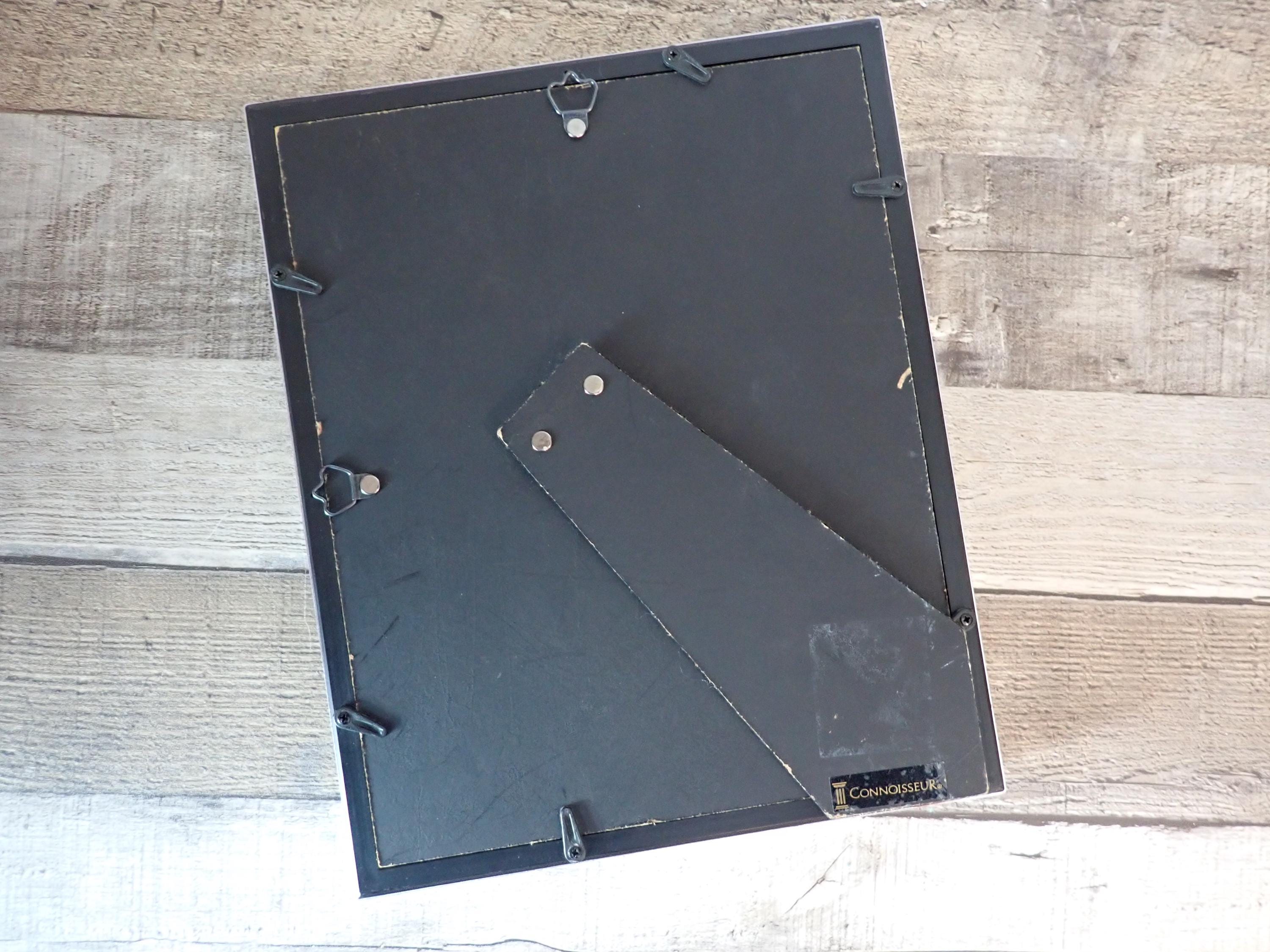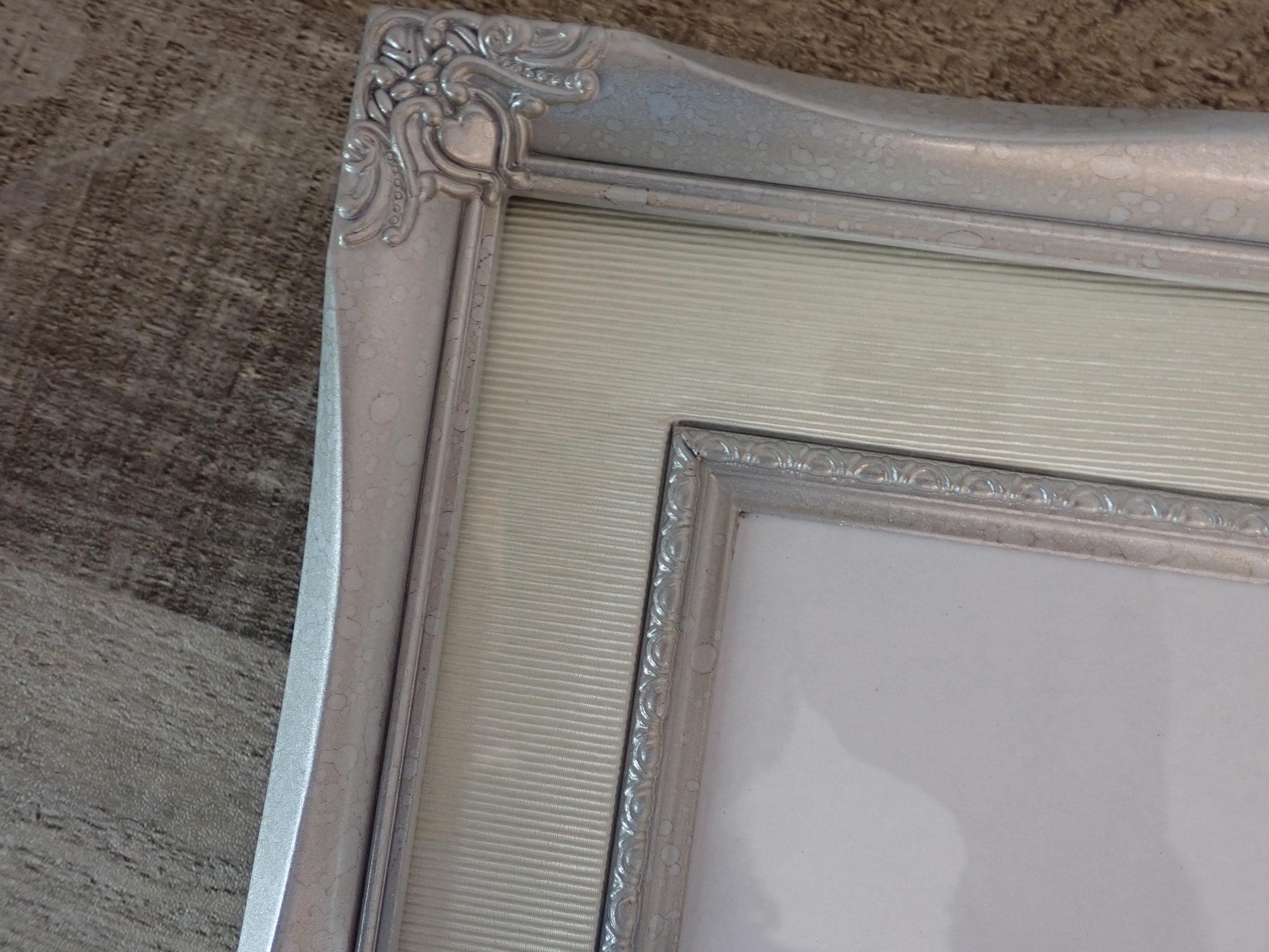 This silver photo frame is 11" tall by 9" wide and can hold one 5x7 or 8x10 photo vertically or horizontally. The frame is a silver plastic material and has a scroll and heart design on the corners. The frame has a 5x7 mat that fits inside the frame, and has clear glass insert over the photo opening, and a cardboard backing piece with a photo stand. The frame is in very good condition, however there are some light scratches here and there.