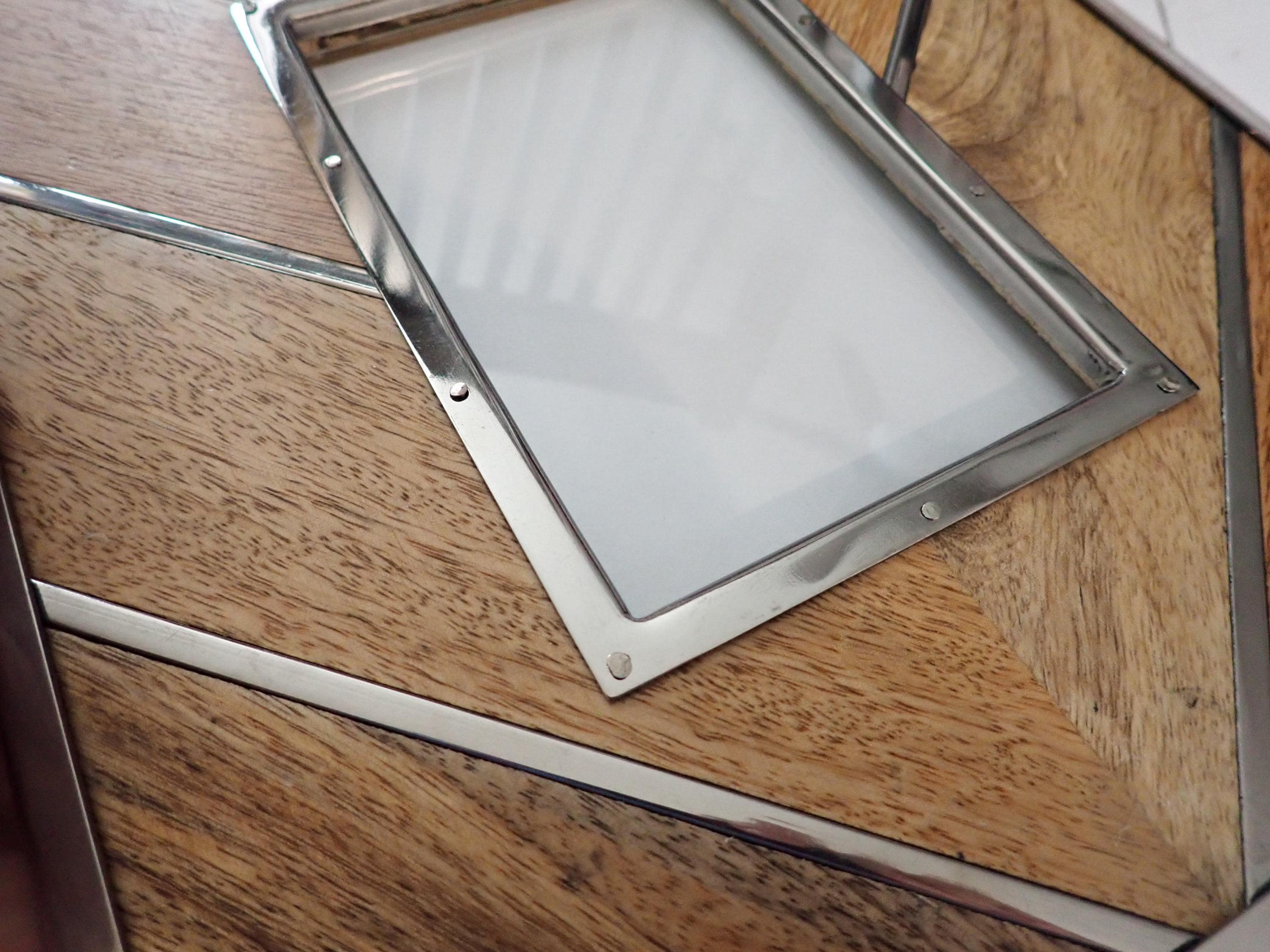 This wood and metal picture frame is 11" tall and 6" wide, and can hold one 4x6 photo. It is a wood amd metal frame with chevron design. There is a glass insert to cover the photo opening and a wooden backing piece with a photo stand. The frame can stand either vertically or horizontally. The frame is in very nice condition. This is a chunky, heavy frame that weighs 2.5 pounds itself.
