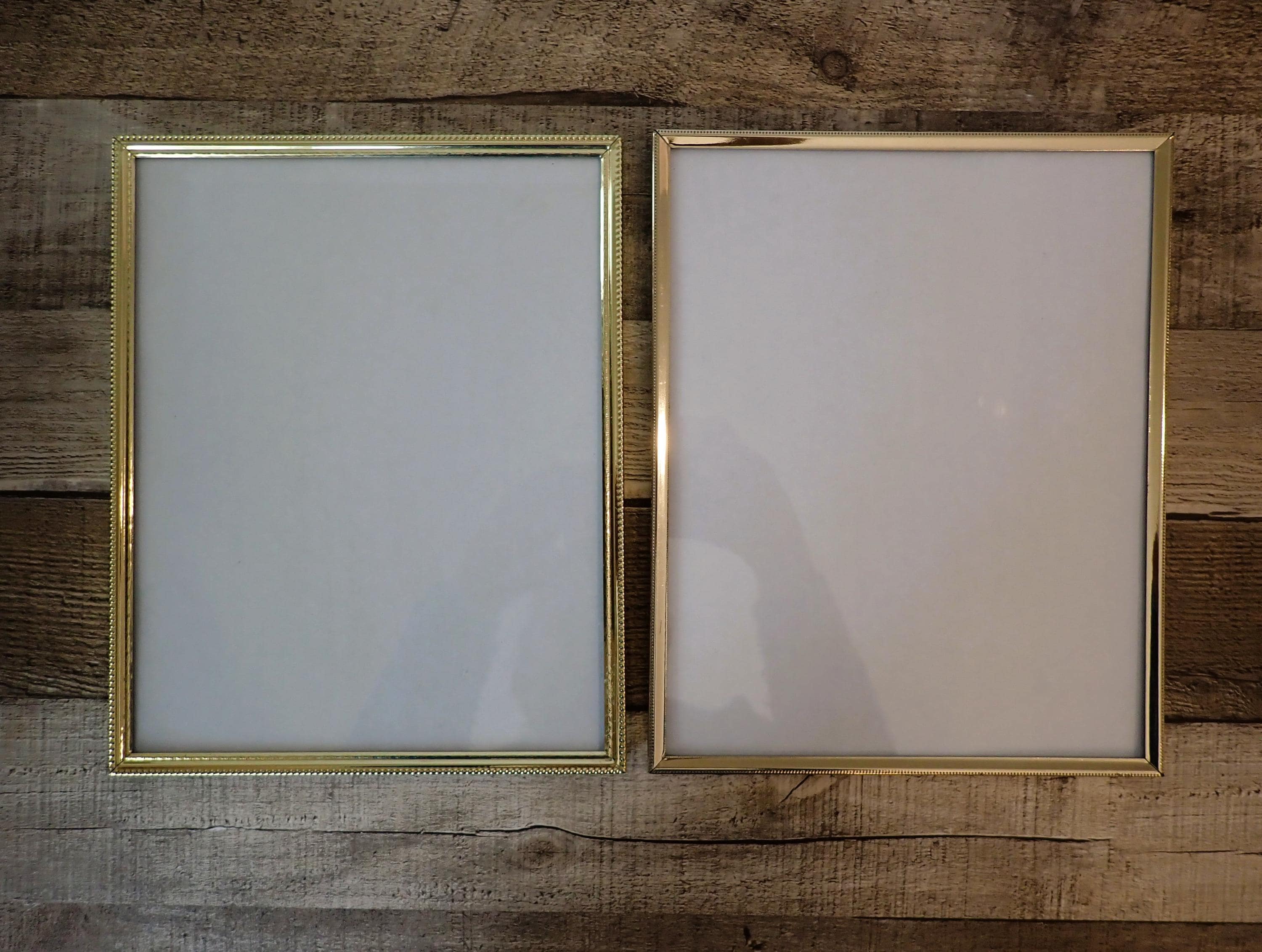 This set of 2 frames includes 2 coordinating metal frames in a brass/gold colored metal. Both frames are 8x10 size and have a piece of clear glass over the photo opening. They both have cardboard backing pieces with photo stands. Each frame is nicely detailed with textured design. The frames do not have hangers to hang on a wall. Both frames are in very nice condition, there is some light tarnish on the brass and a few light scratches on the frames here and there. Lovely set of metal frames!