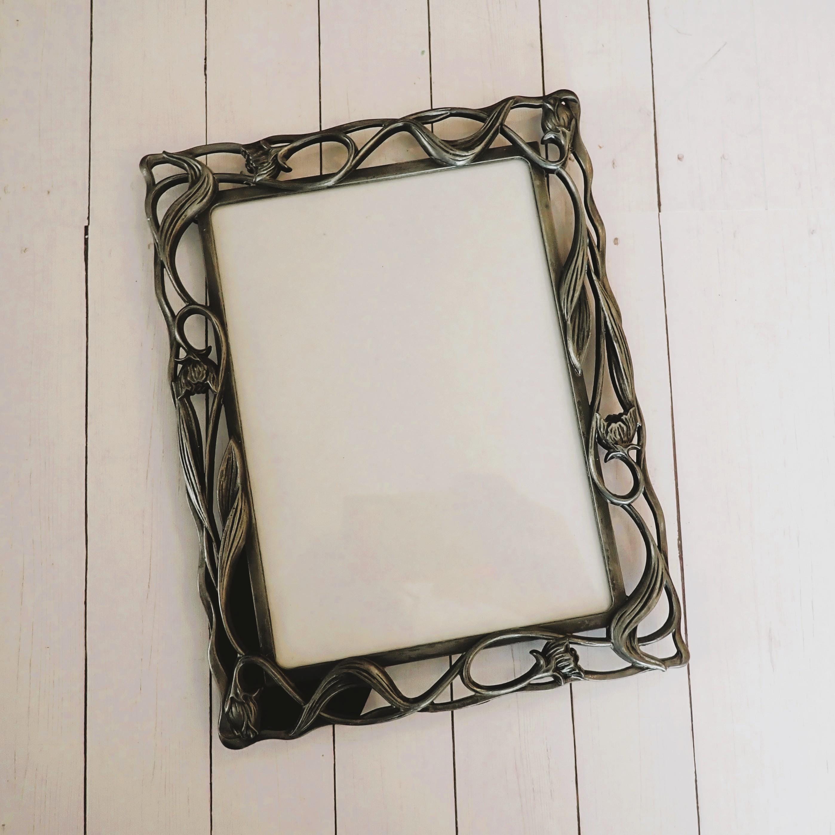 This set of silver metal photo frame is 5x7 frame with a scrolling floral and leaf design. The frame has a clear glass insert over the photo opening, and a cardboard backing piece with a photo stand. The frame can stand either vertically or horizontally. The frame is in very good condition.