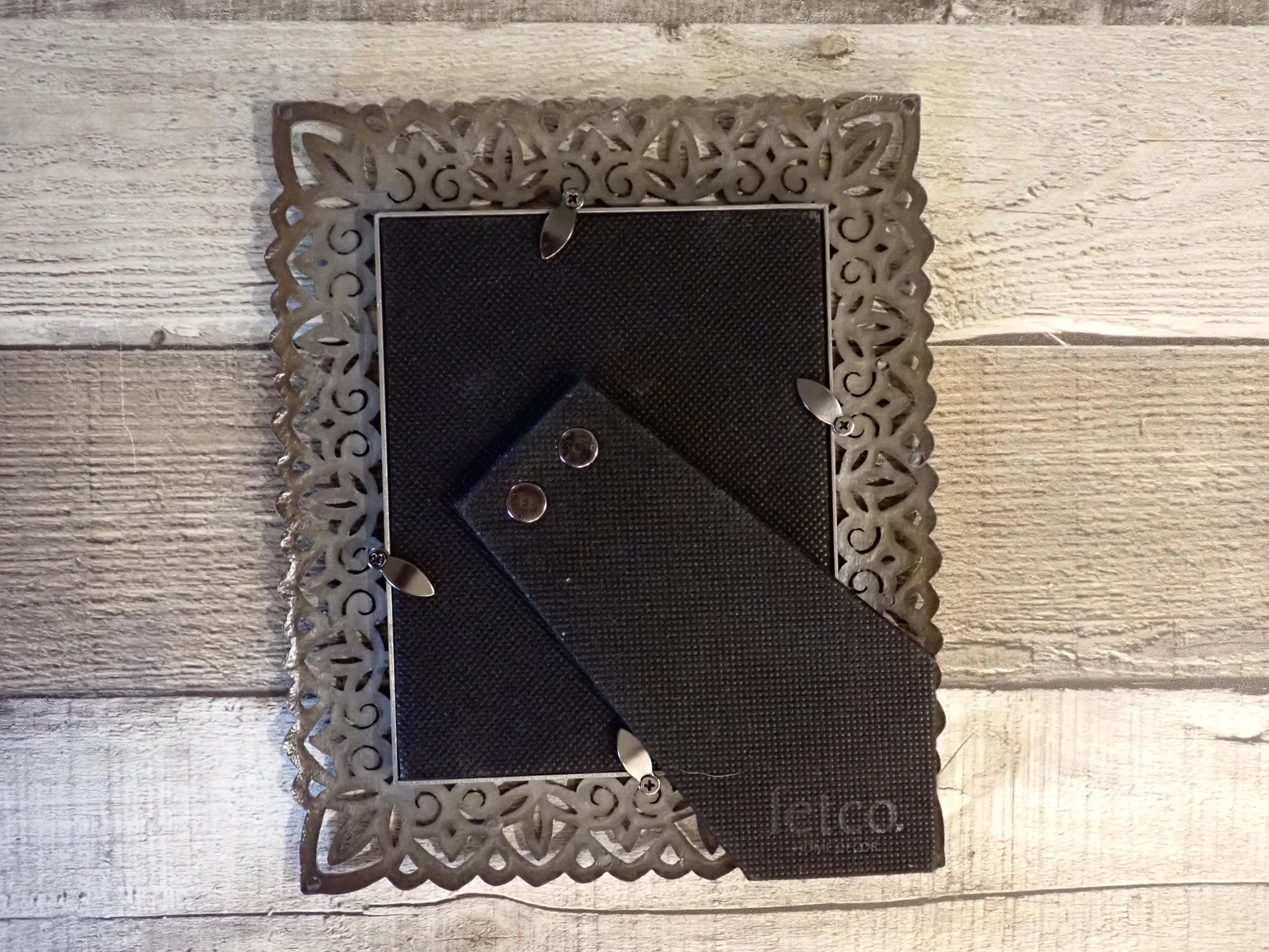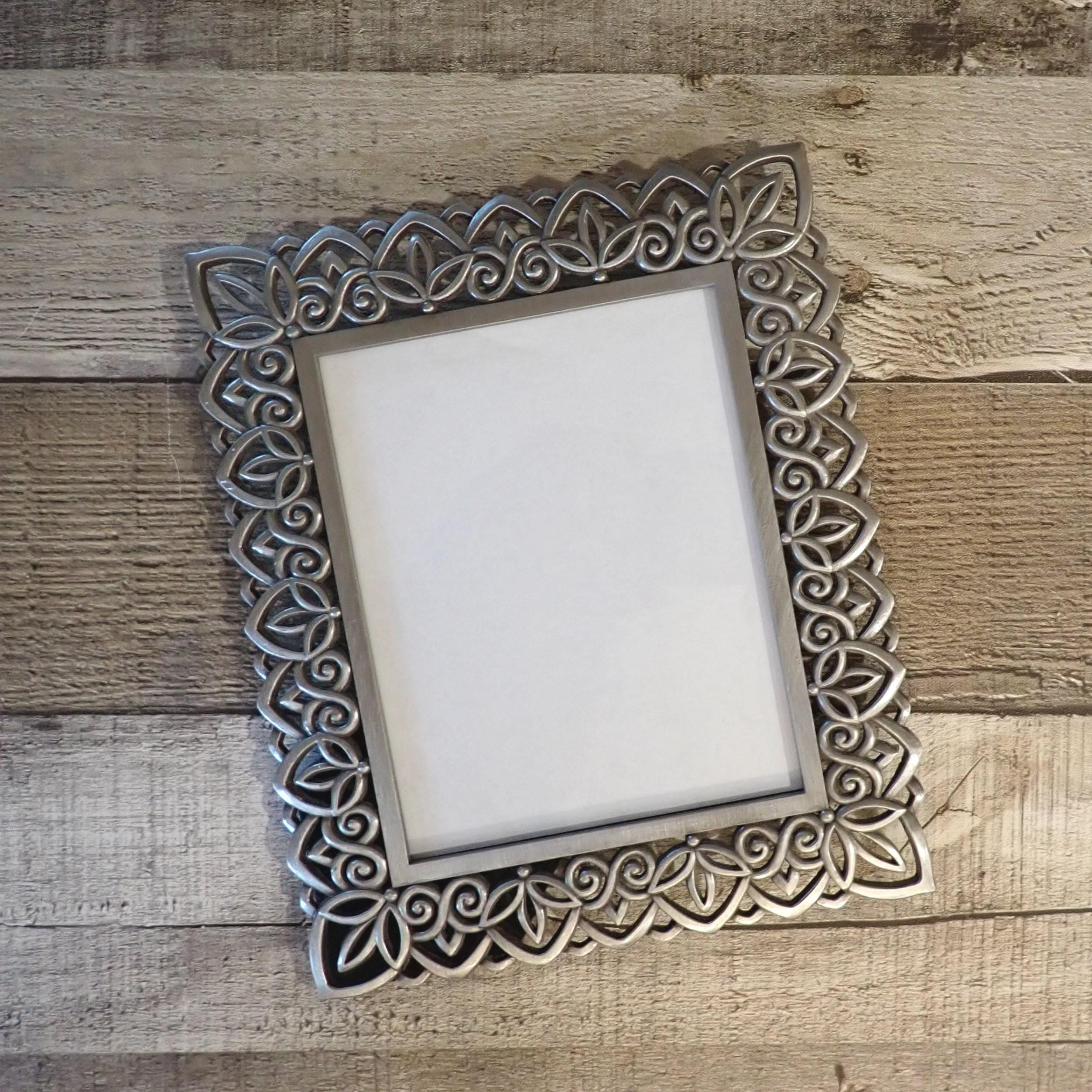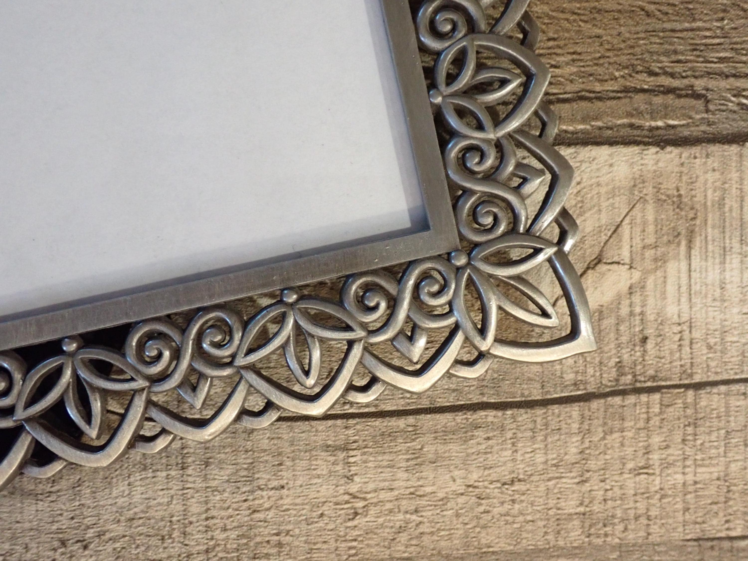 This silver metal photo frame is 7.5" tall by 6" wide and can hold one 4x5 photo vertically or horizontally. The frame is a silver metal and has an openwork leaf design. The frame has a clear glass insert over the photo opening, and a cardboard backing piece with a photo stand. The frame is in very good condition, however there are some light scratches here and there.