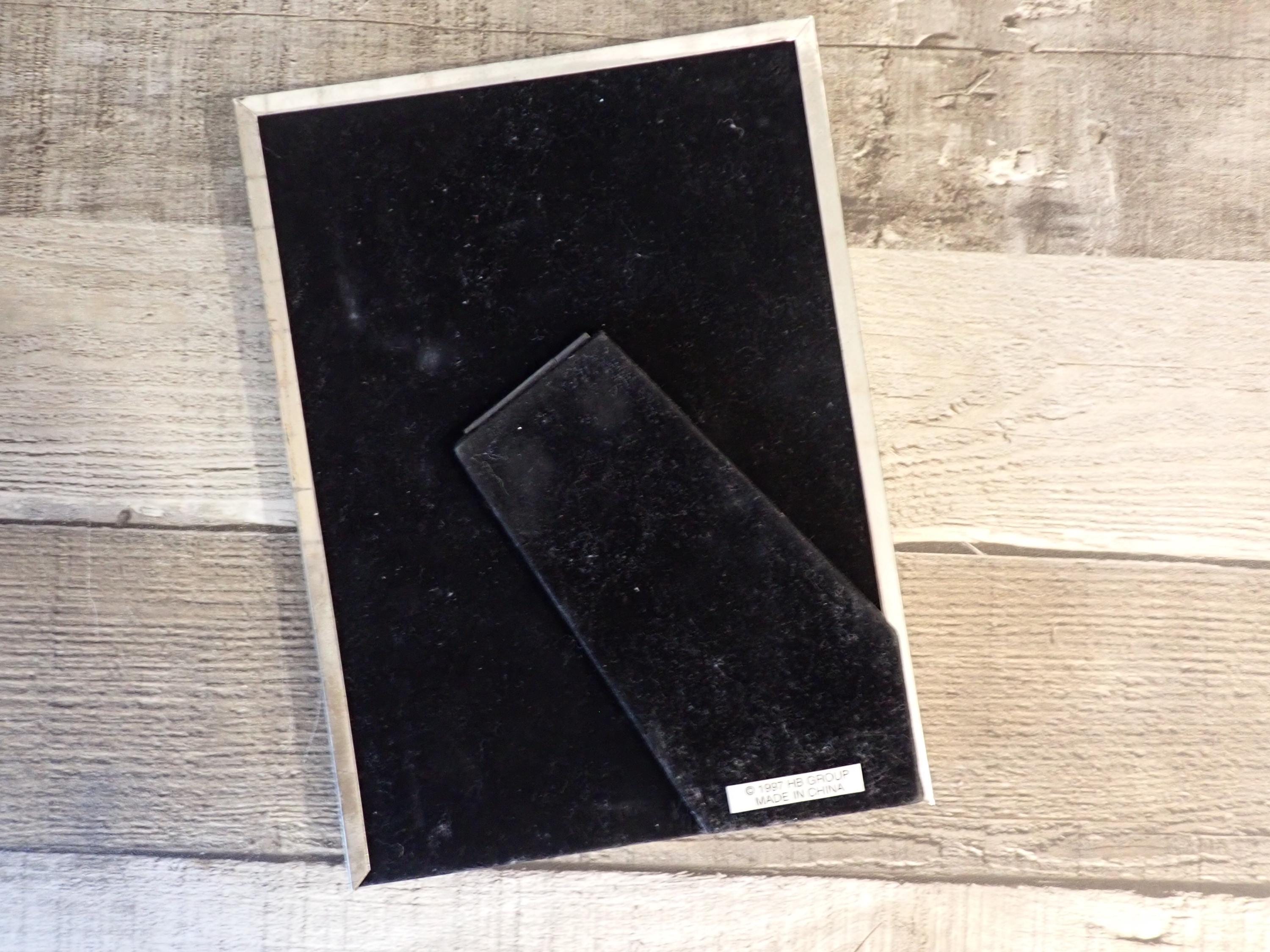 This silver metal photo frame is 7.5" tall by 5.75" wide and can hold one 4x6 photo vertically or hotizontally. The frame is a shiny silver metal and has a geometric flower design around the edge. The frame has a clear glass insert over the photo opening, and a cardboard backing piece with a photo stand. The frame is in very good condition, however there are some light scratches here and there.