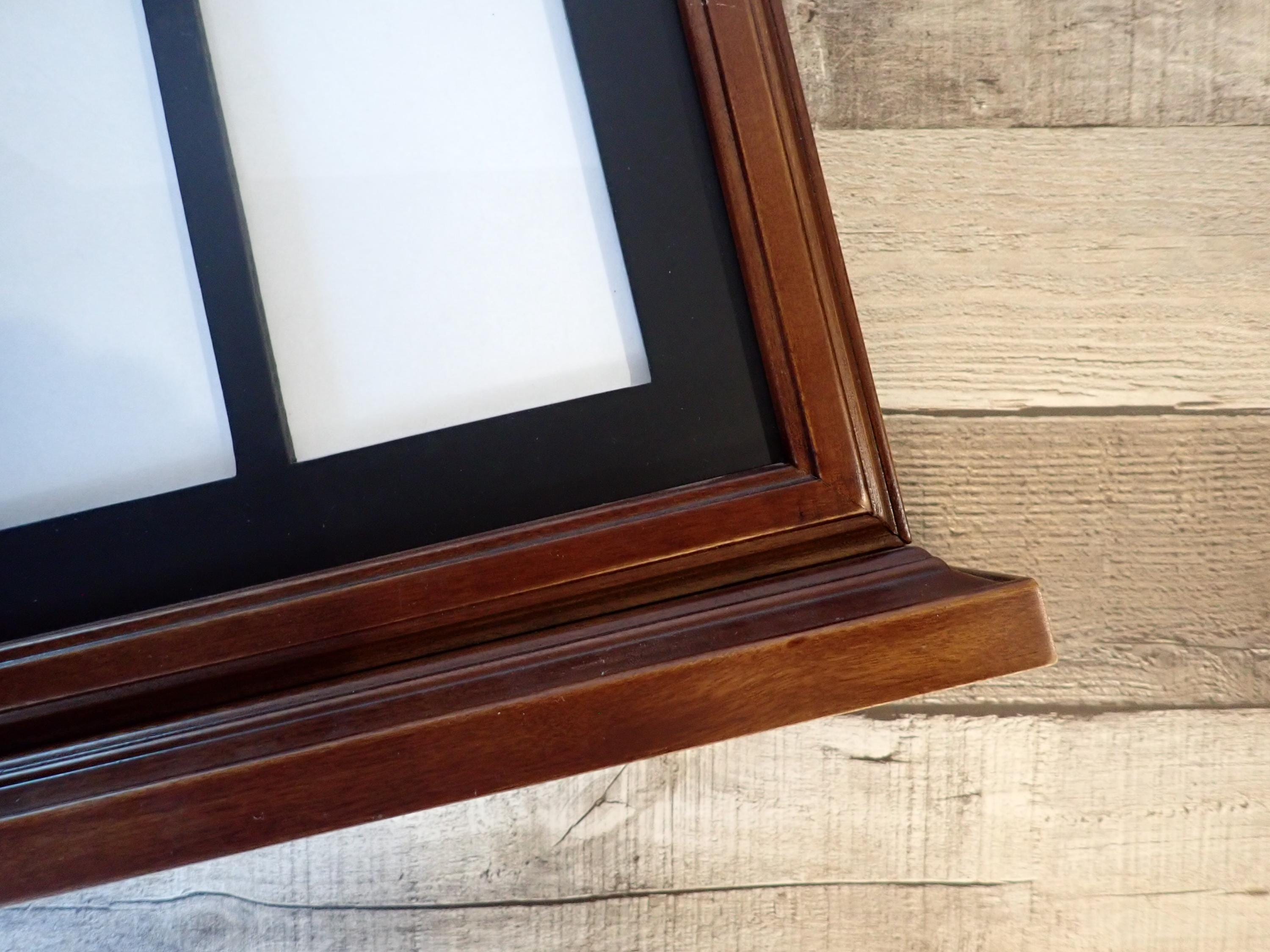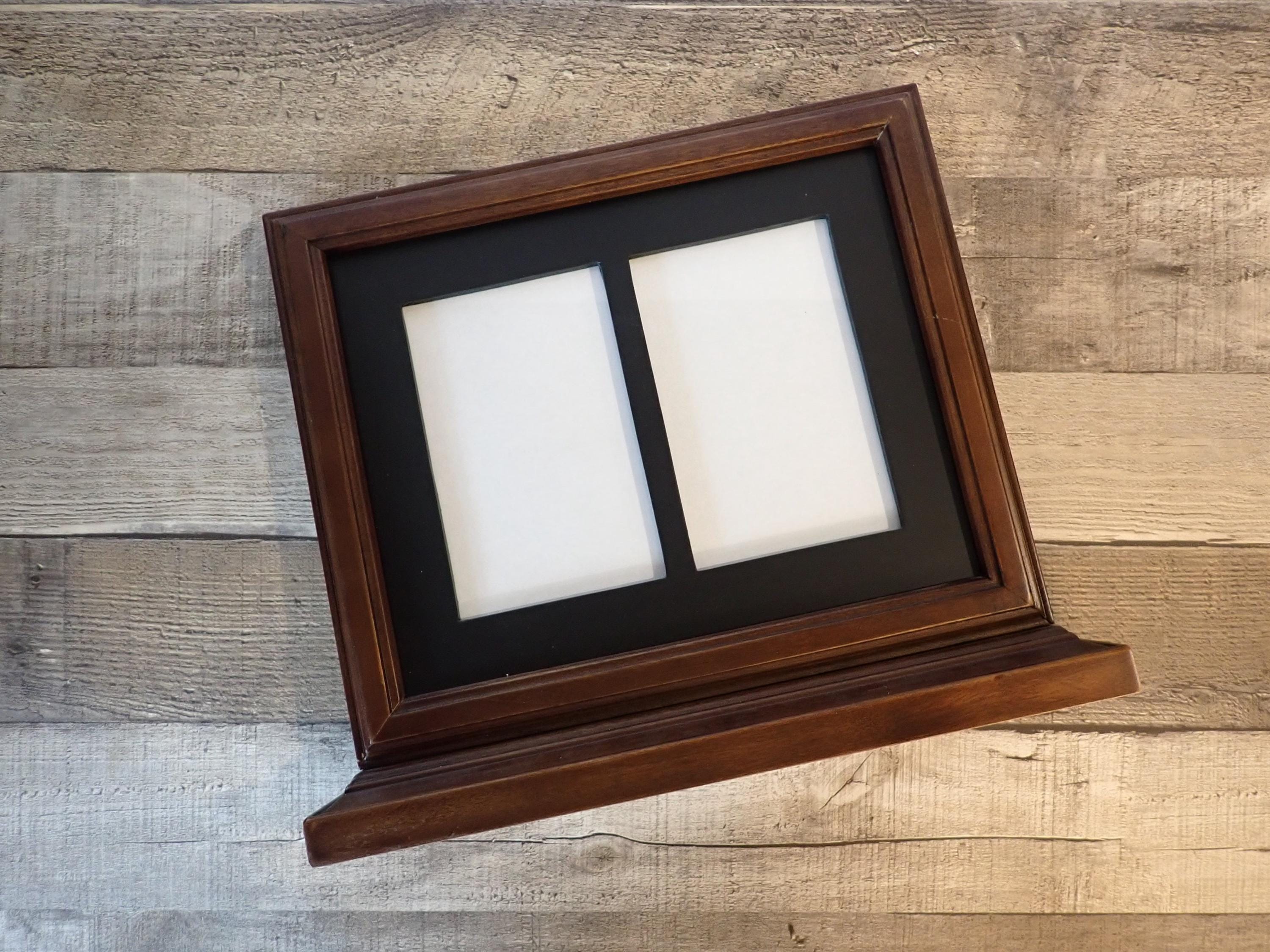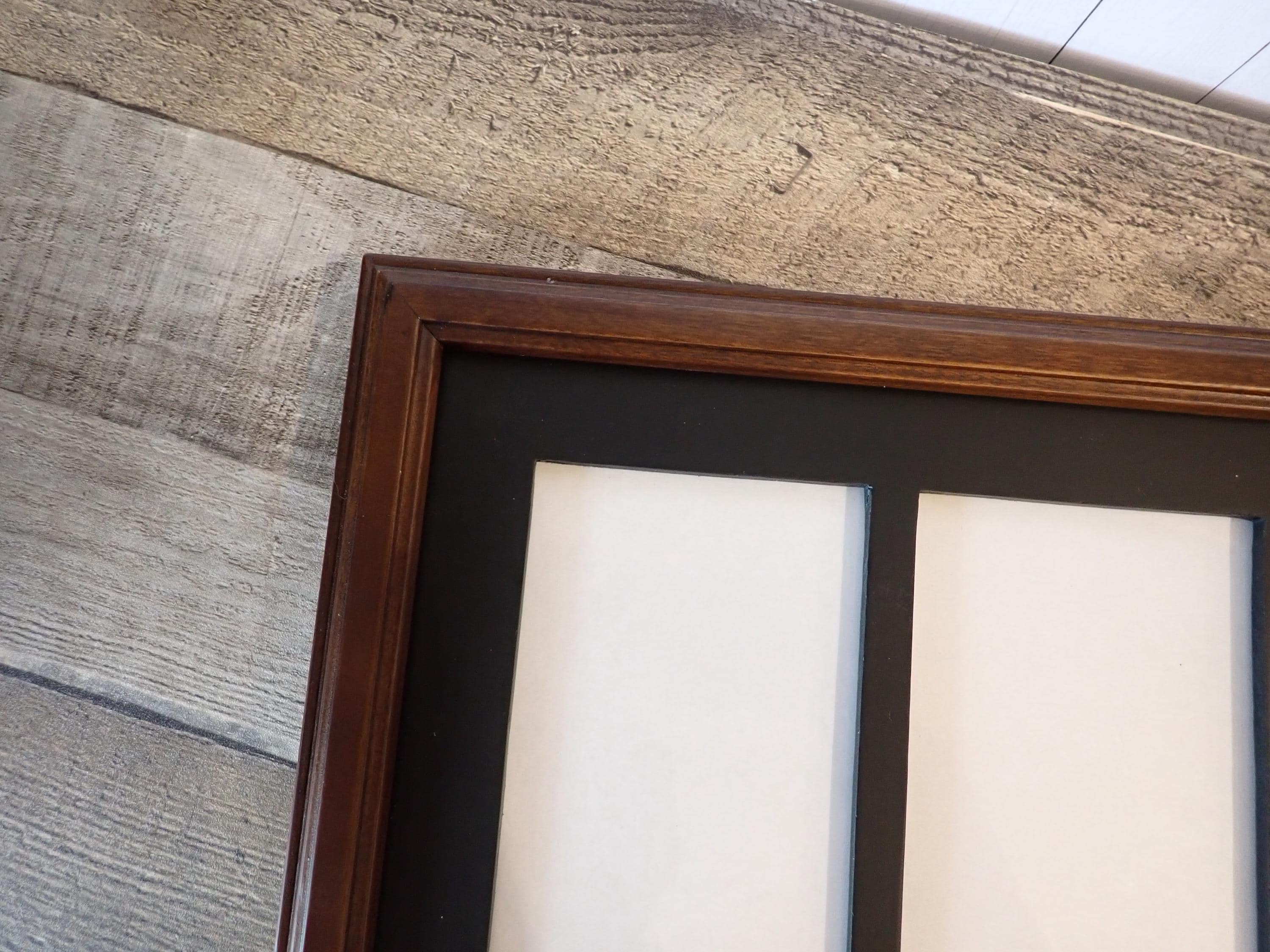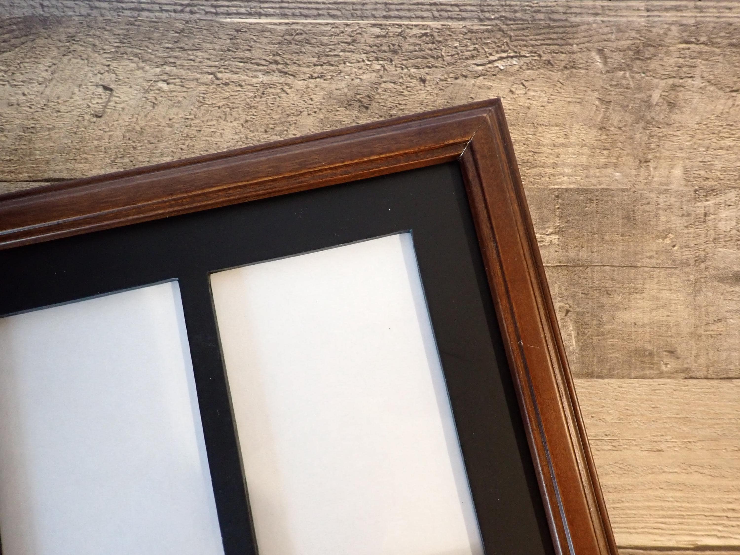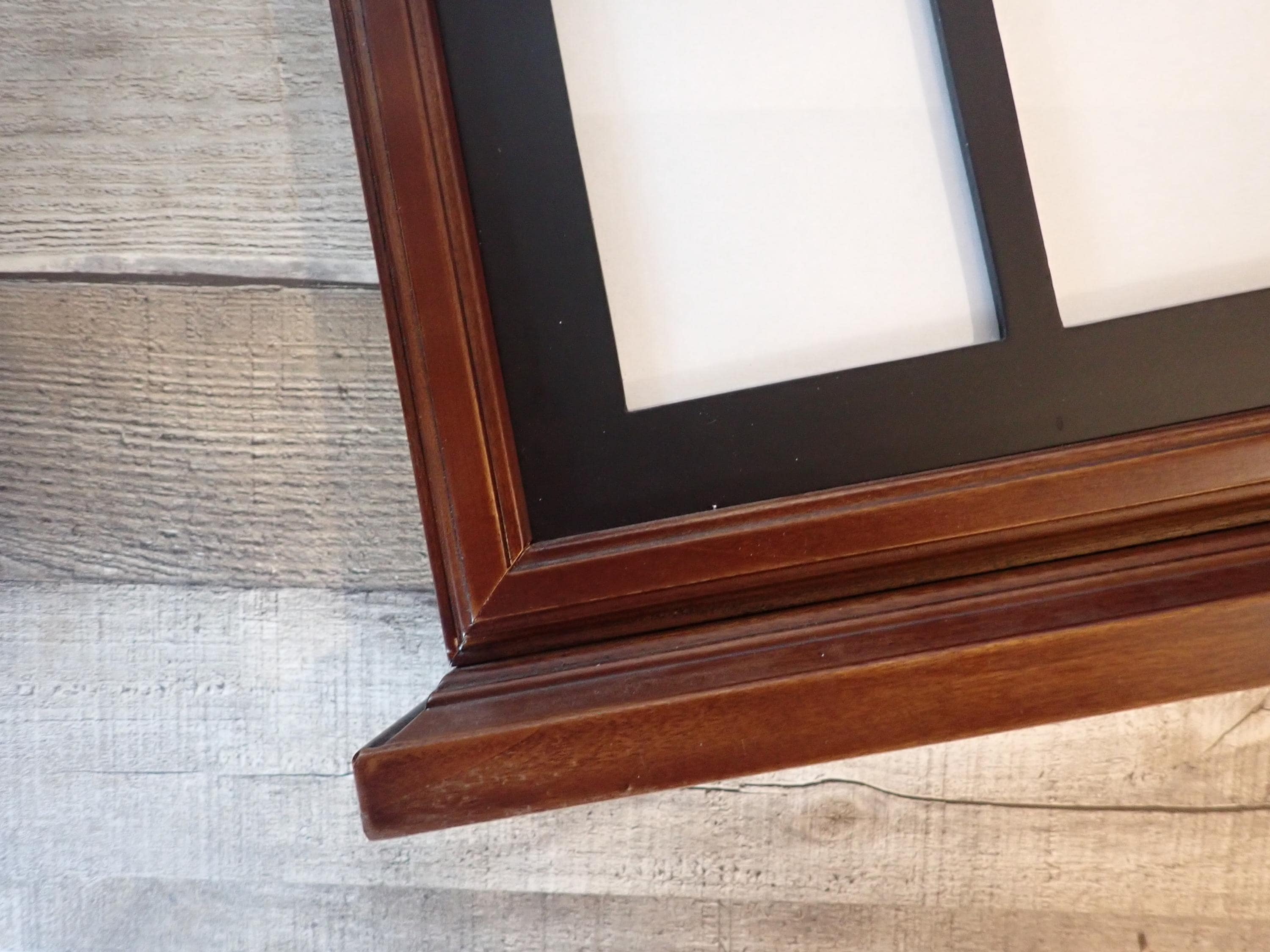 This wooden frame is 11" tall and 13" wide and can hold 2 4x6 photos. The frame has platform stand and stander vertically. Each photo opening is 3.5" wide and 5.5" tall and has a black double mat. The frame has a clear glass insert over the photo opening and a cardboard backing piece. The frame is in very nice condition but does have a couple of small nicks in the wood here and there.