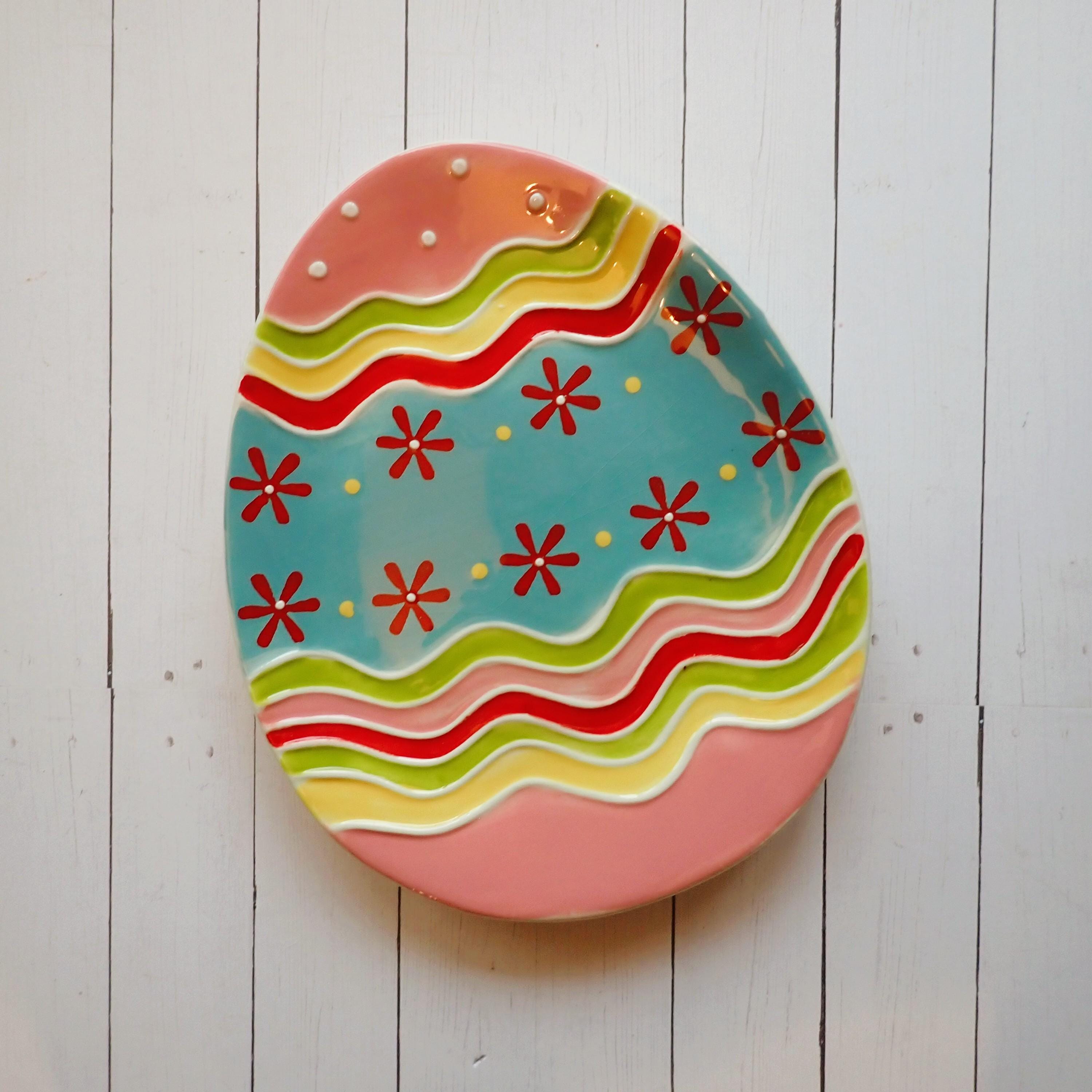 This ceramic egg-shaped plate by Pier One is 8 7/8" long and 7" wide at the widest point. It is a blue, pink, green, yellow and red ceramic plate with a wavy line and flower design on the surface of the plate. The bottom of the plate is marked: Pier One Imports. The plate is in very good condition with no chips or cracks.