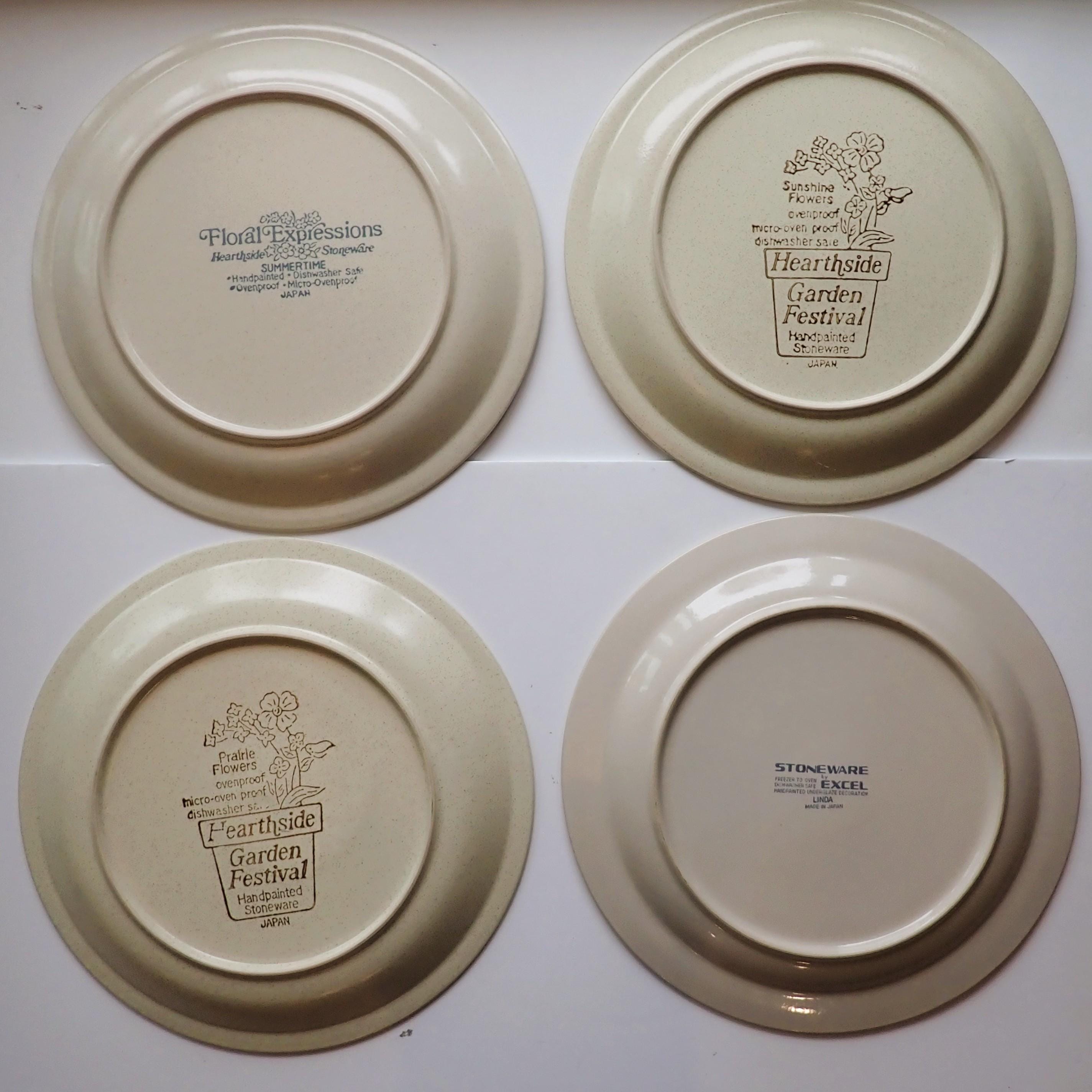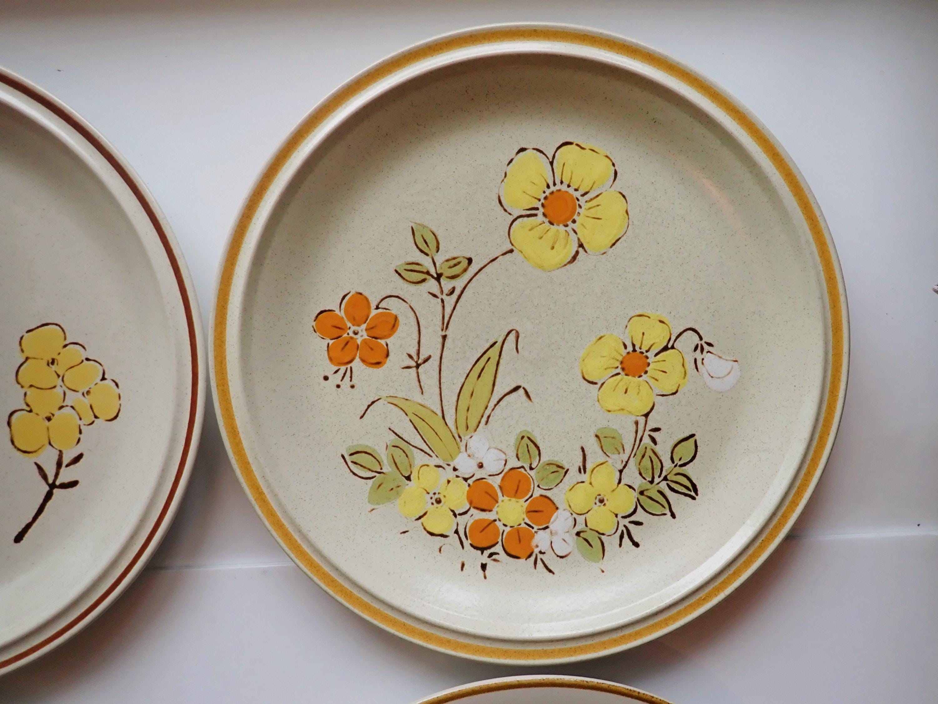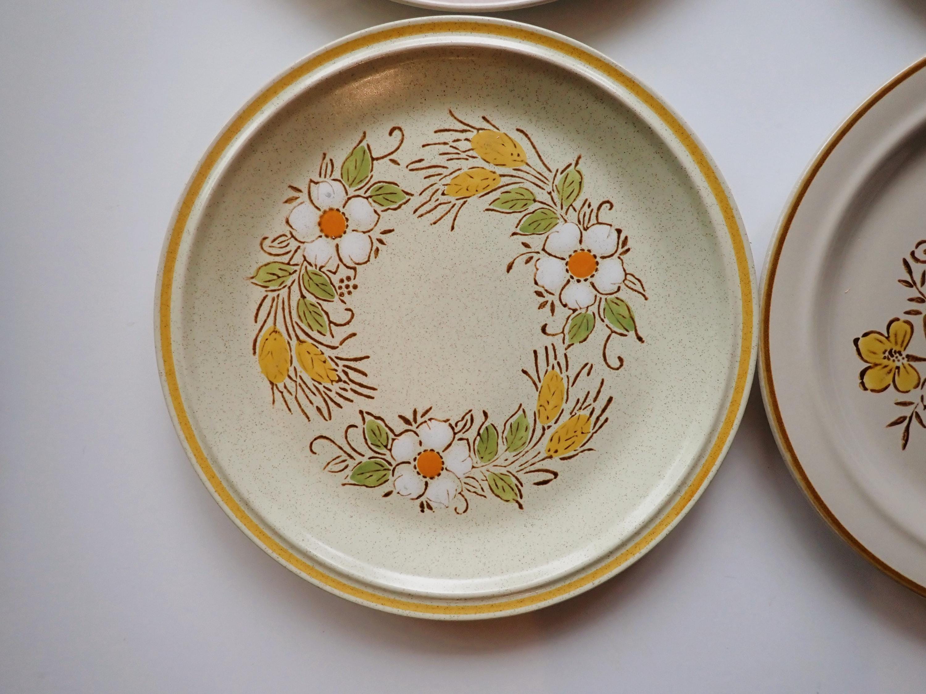 This set of 4 dinner plates is a mismatched set of coordinating stoneware plates from the 1970s. The plates are 10.75" in diameter and 1" high at the rim. They are all a light tan stoneware with various Brown, yellow and green floral designs. All 4 of the plates are in very good condition with no chips or cracks. There are some light surface scratches from use. Fun set of earthy 70s stoneware floral dinner plates!