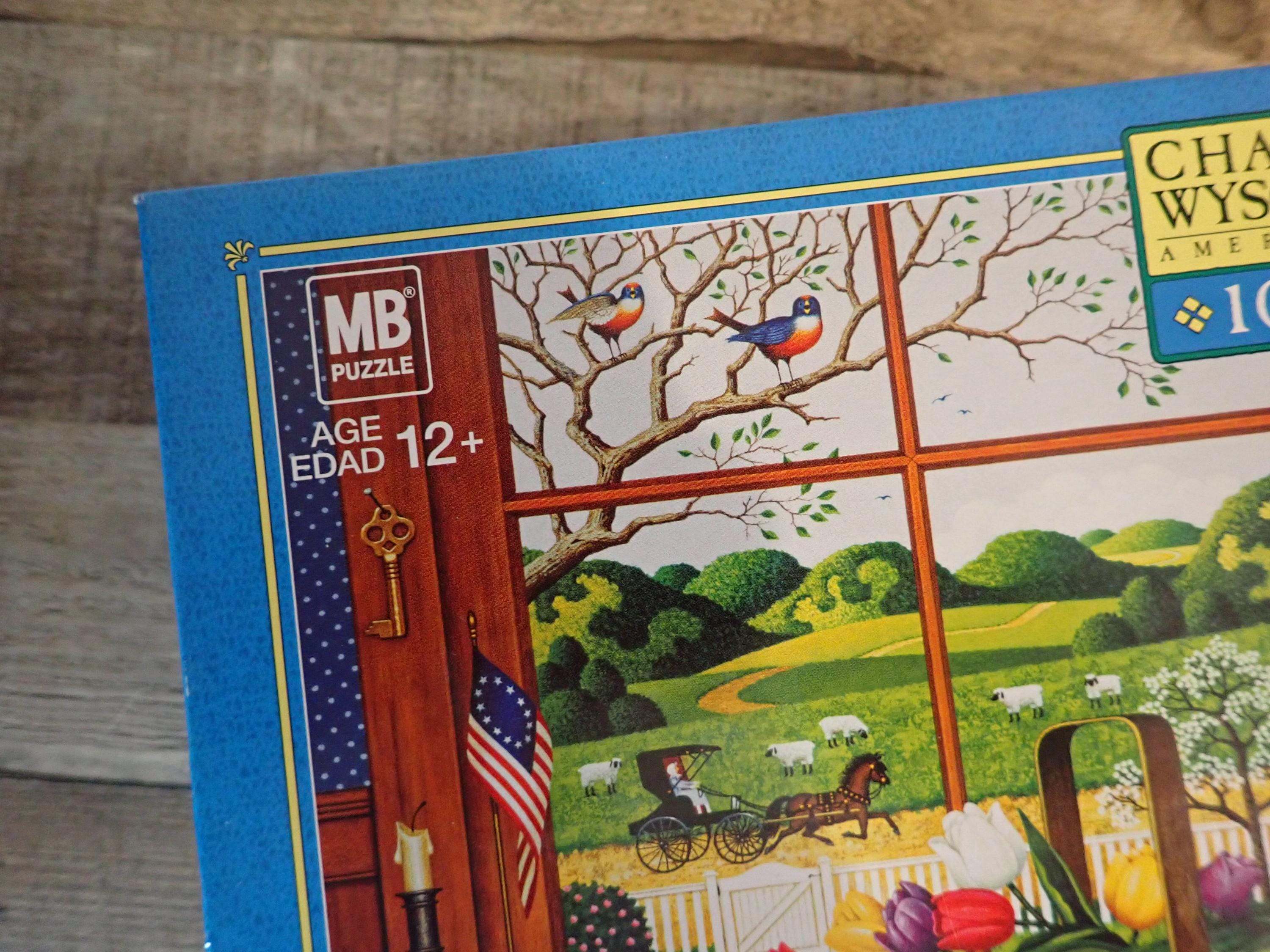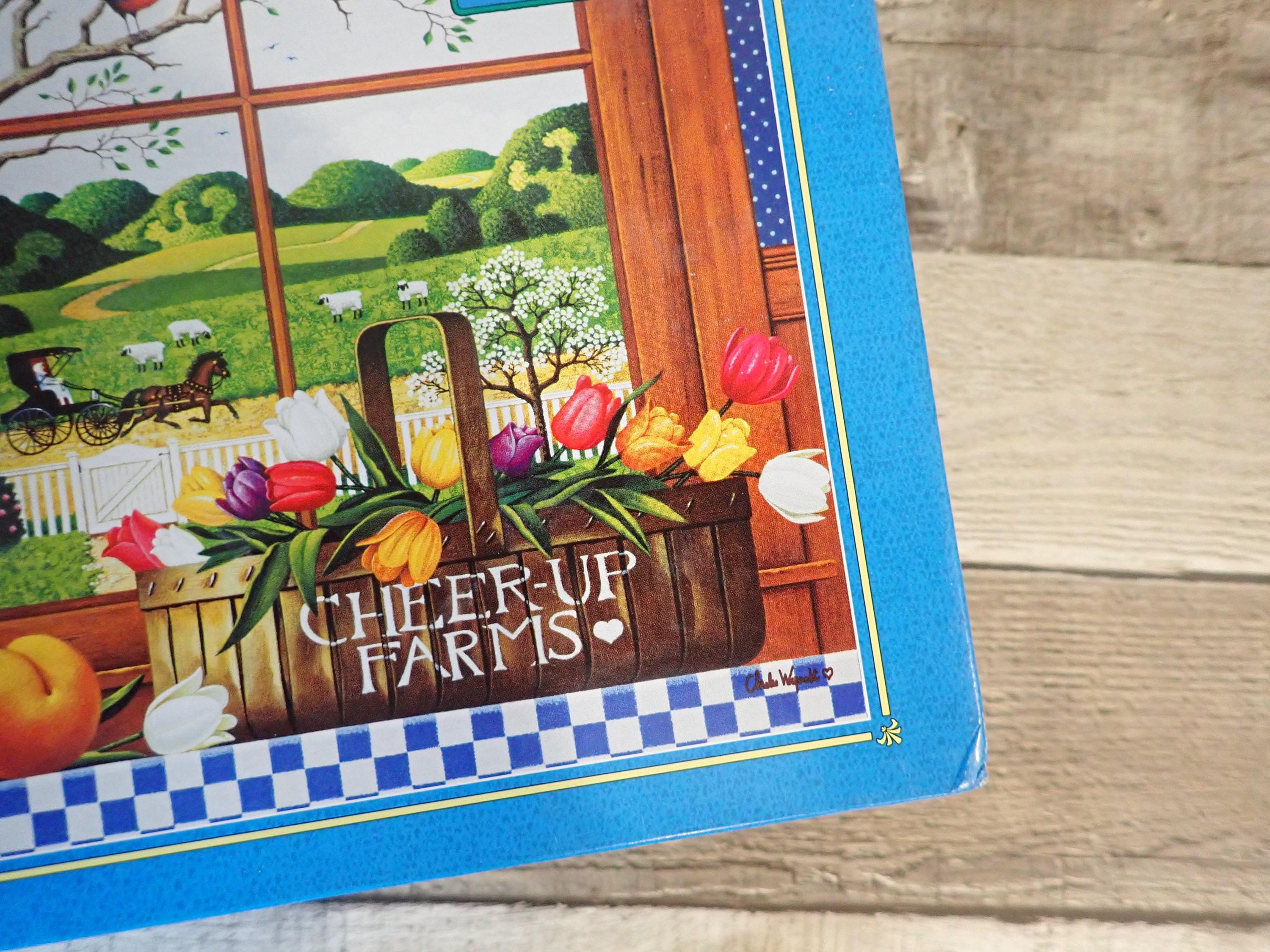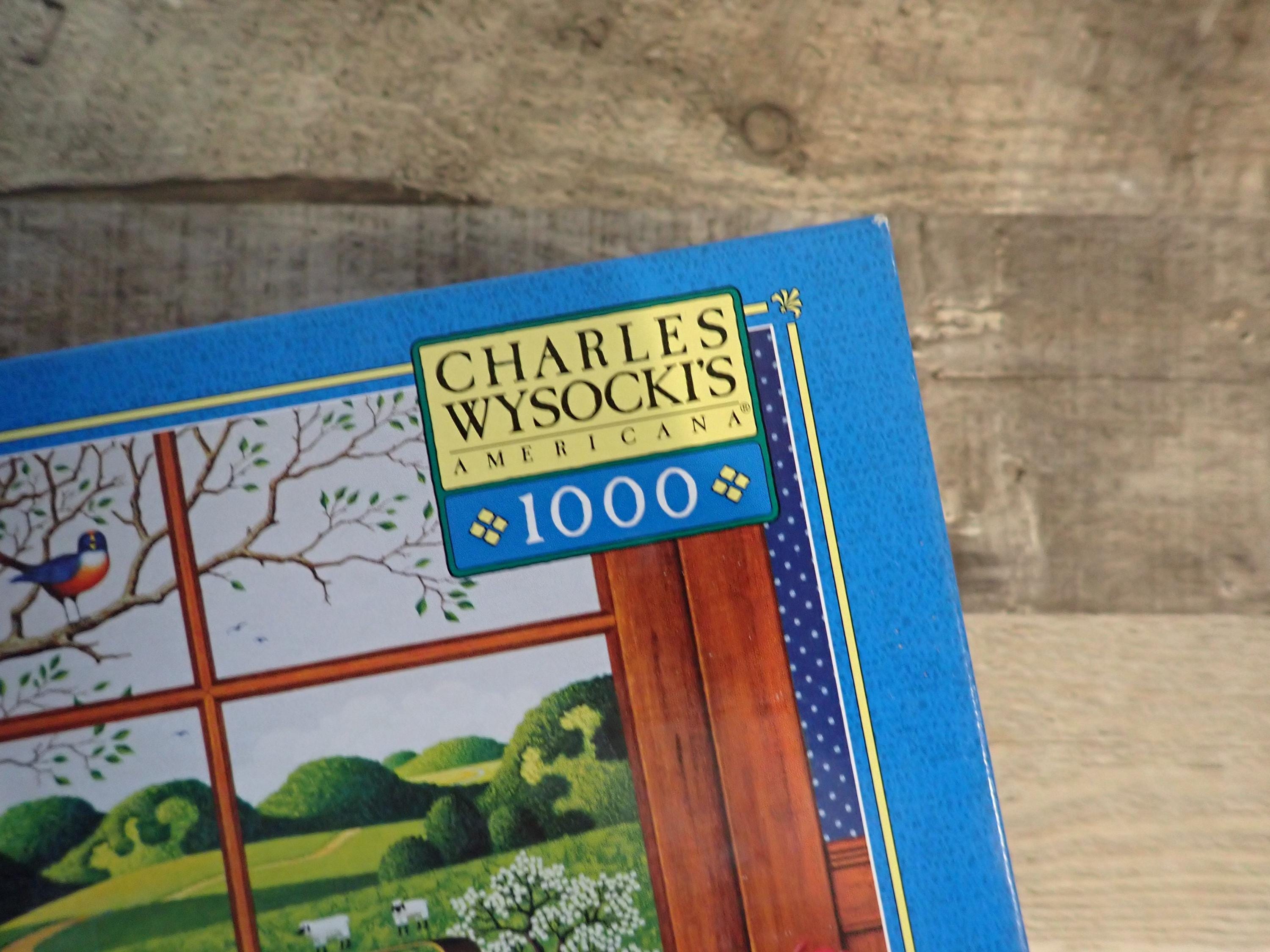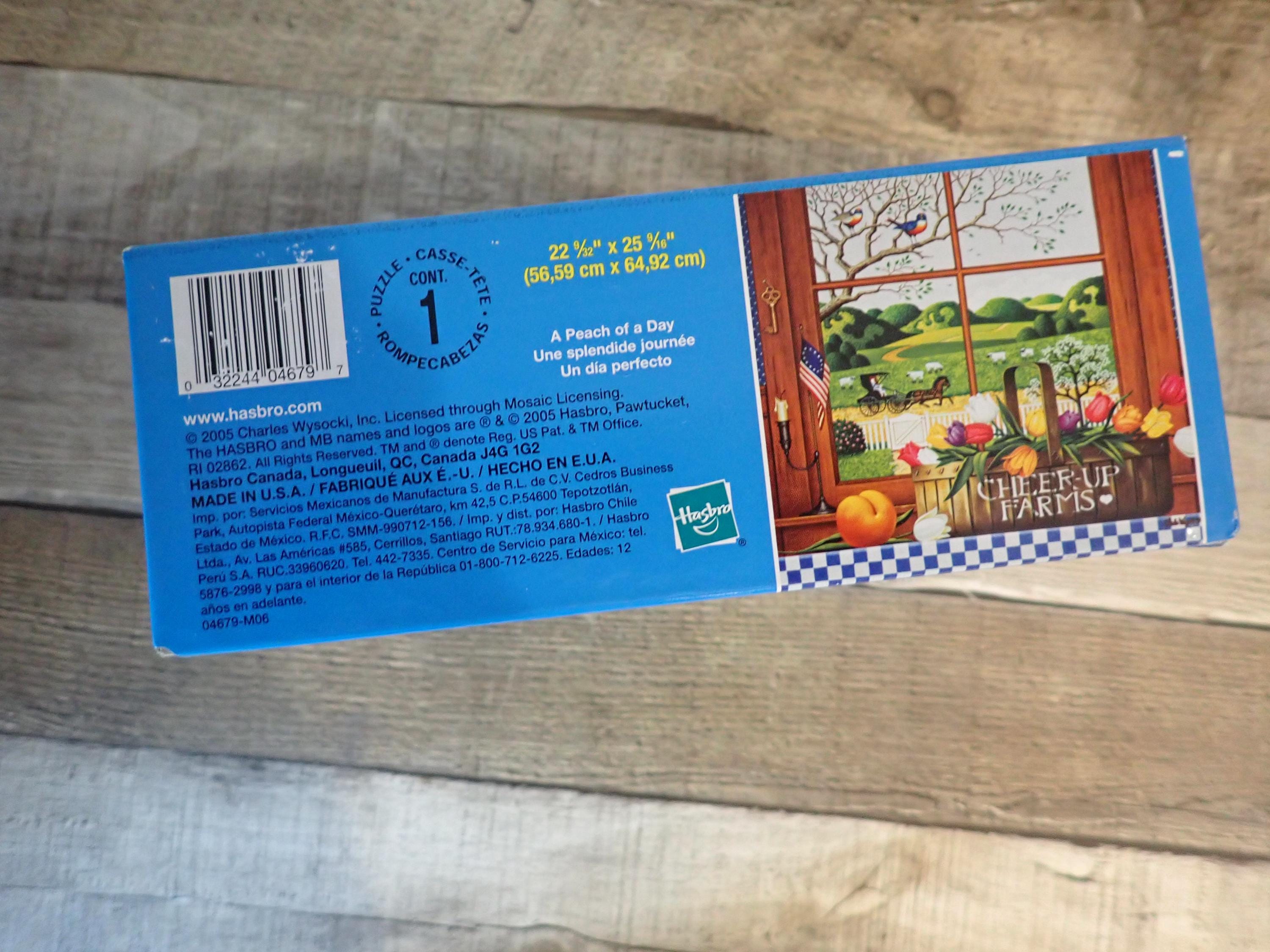 This 1000 piece jigsaw puzzle by Charles Wysocki is titled A Peach of a Day and is new in a sealed box. The puzzle has a finished size of 22" x 25" and has a colorful scene of the window with a fruit basket in front of it. The box is in nice condition.