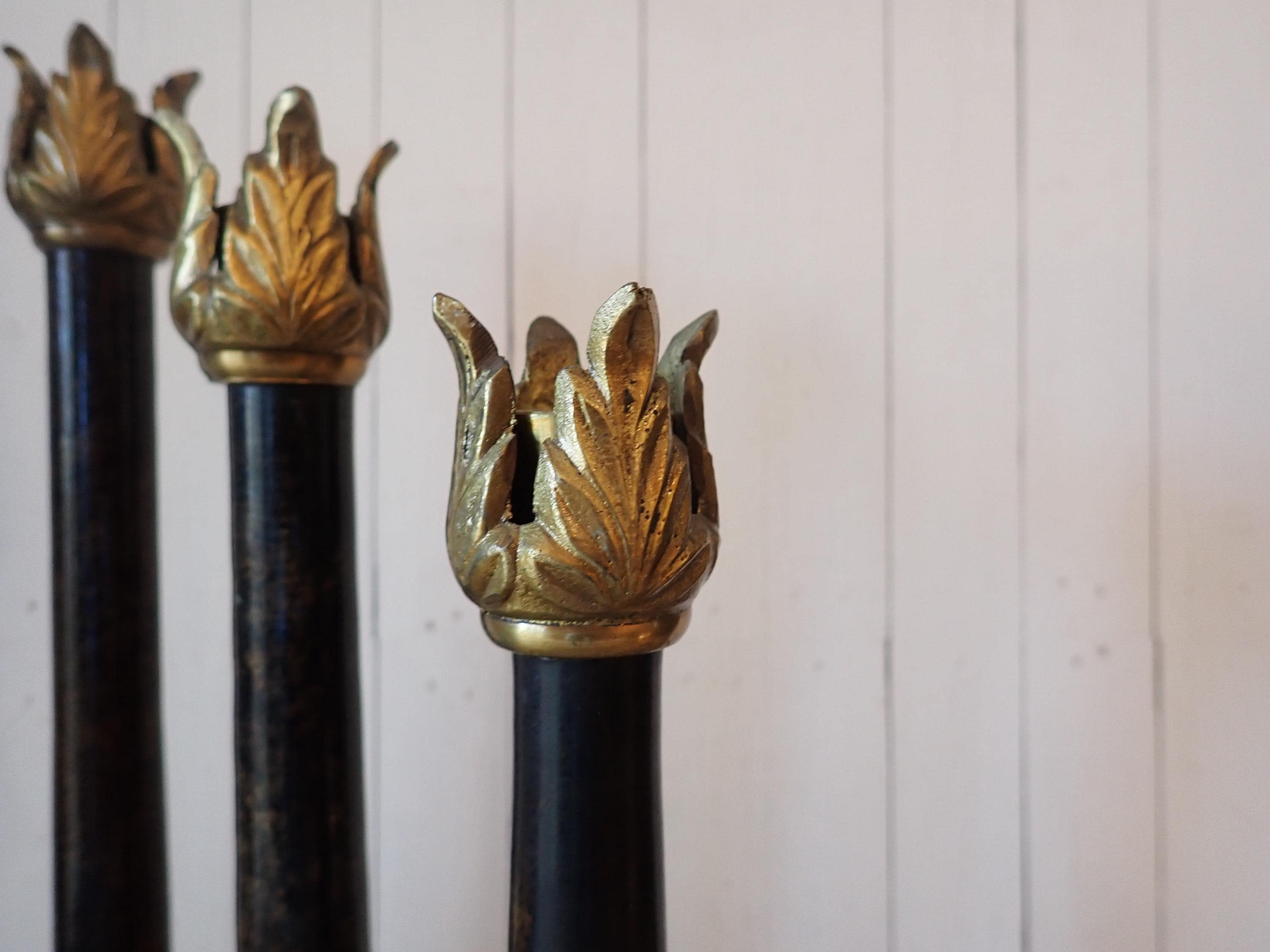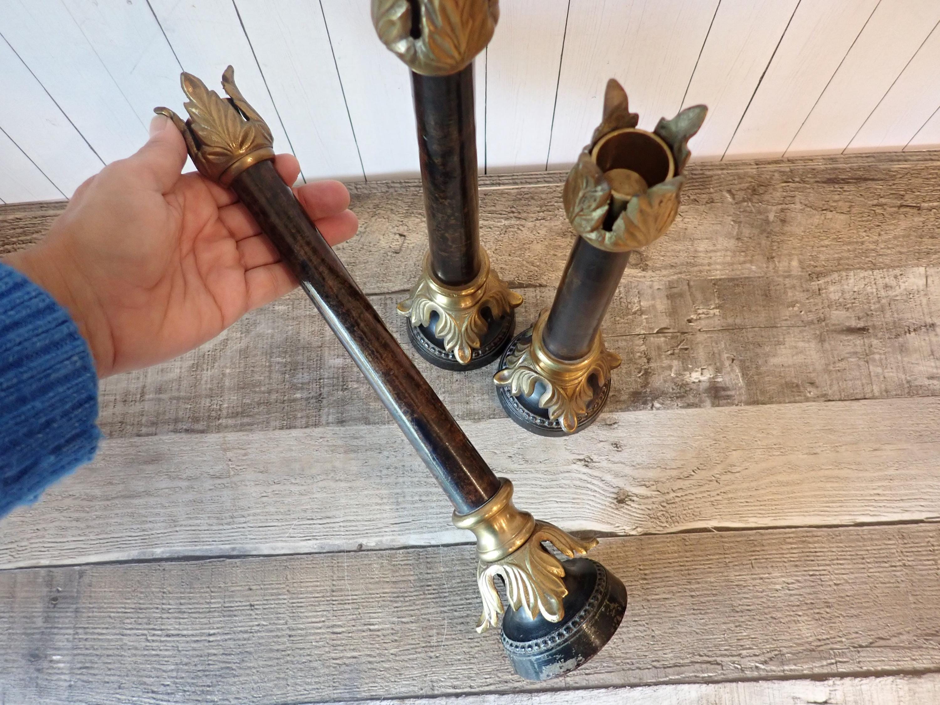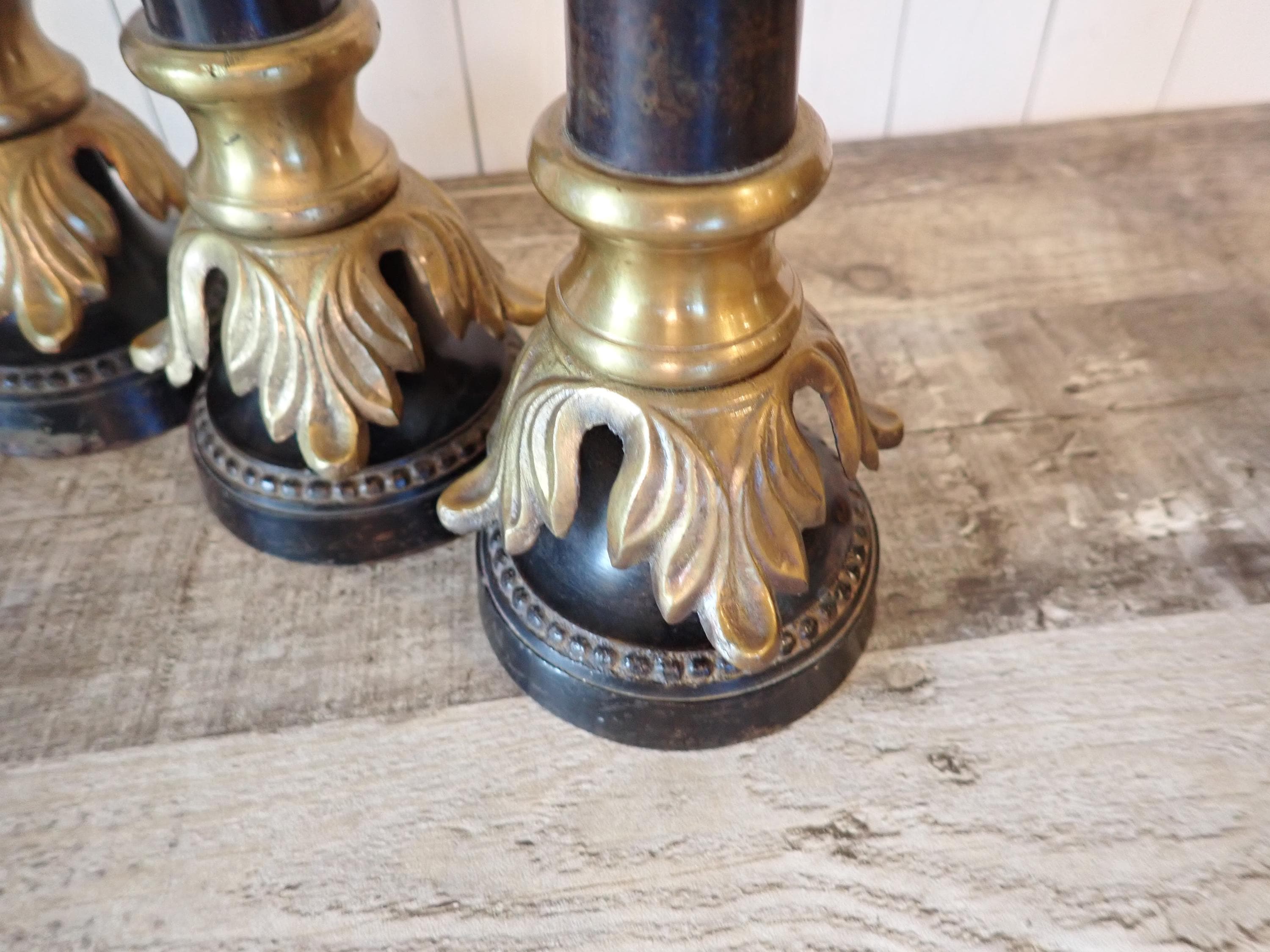 This set of metal candlesticks includes 3 matching candlesticks in graduated sizes. They are 10.5", 12" and 14" tall and 3" in diameter at the base. They feature a brown metal base and stem with brass leaf accents around the base and the top. All 3 candlesticks are in very good condition - there is some wear to one of the bases as shown in the last photo.