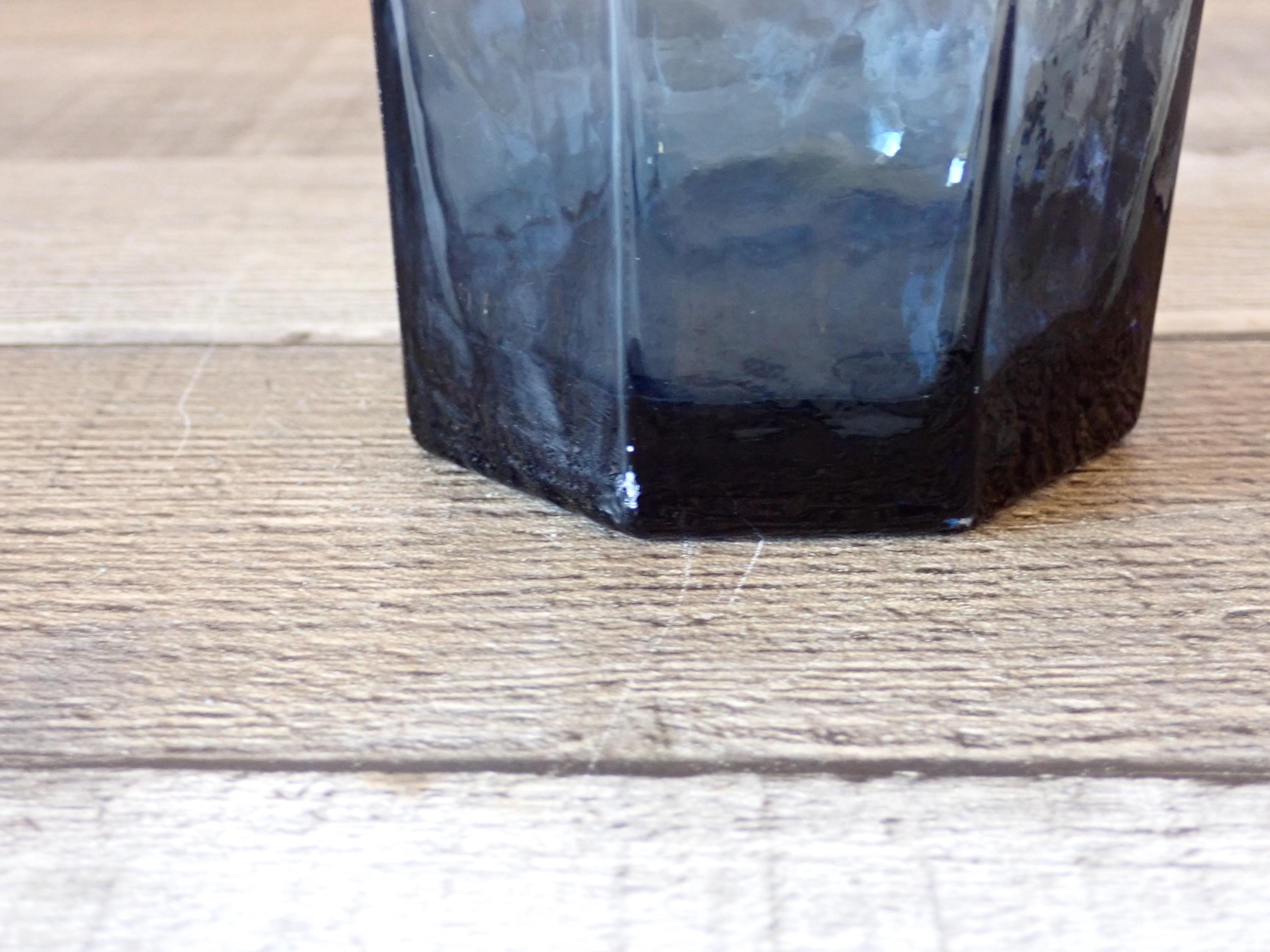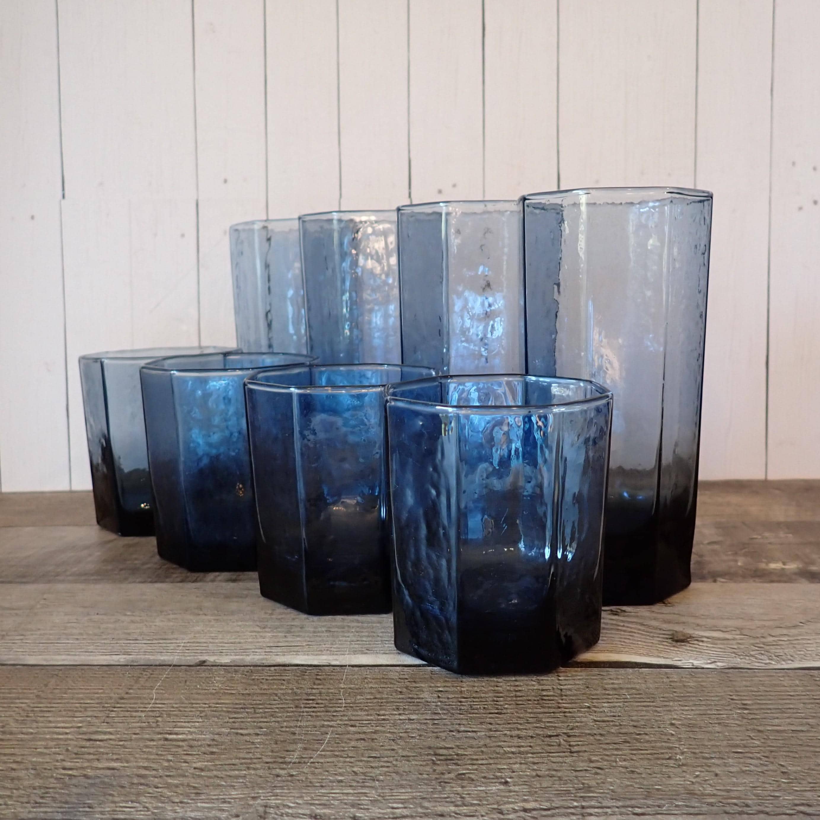 This set of 8 Libbey glasses includes 4 coolers and 4 old fashioned glasses. They are the blue color in the Facets pattern. The cooler glasses are 6" tall and 2.5" in diameter, and have an octagon shaped body. The old fashioned glasses are 3.5" tall. The glass has a lightly mottled texture. The cooer glasses are the larger size tumbler in this pattern, and they hold 16 oz. The old-fashioned glasses hold 8 oz. All 8 glasses are in good condition, however there is one small nick on the bottom edge of one of the old fashioned glasses - this is shown in detail in the last photo.