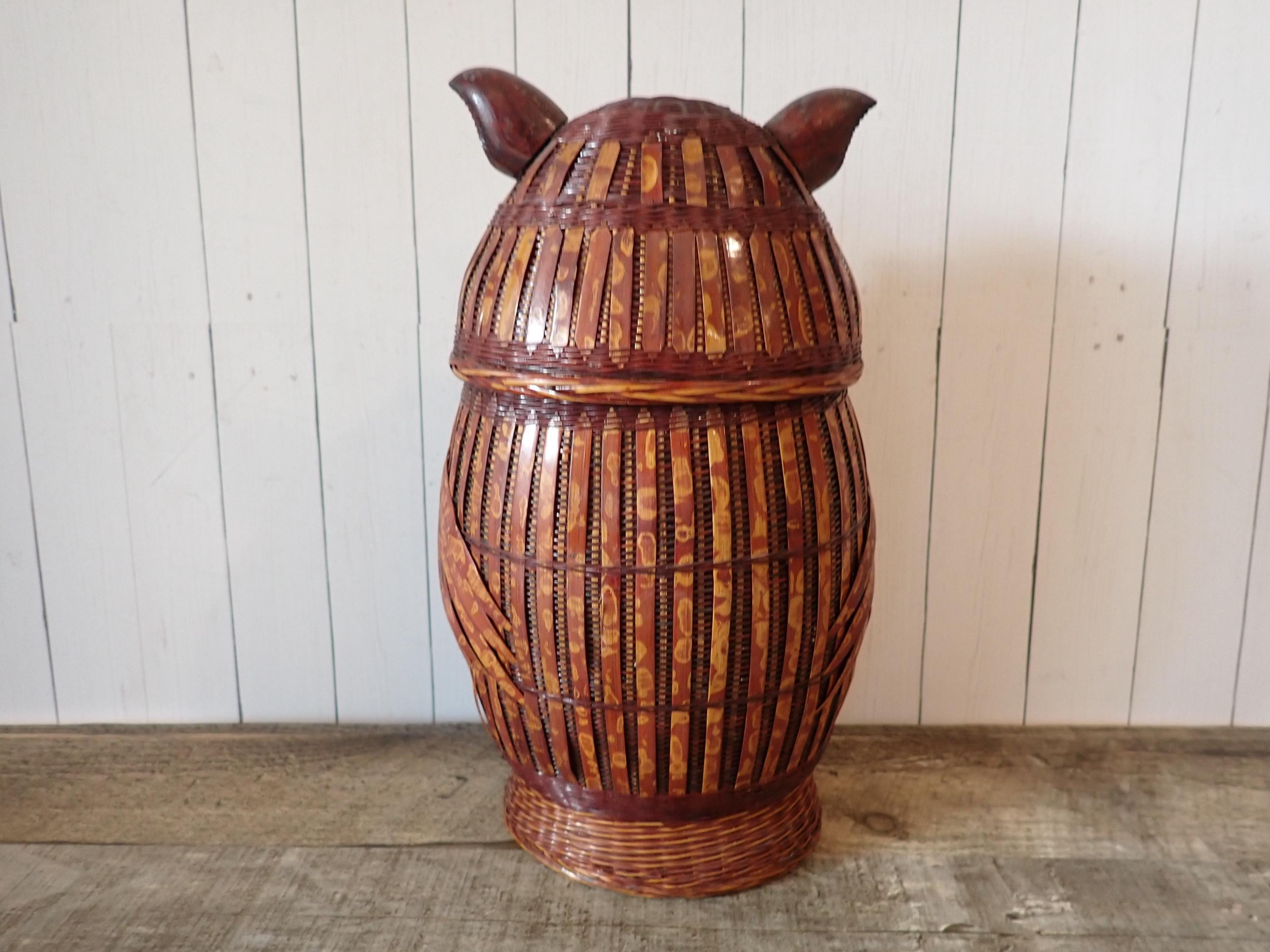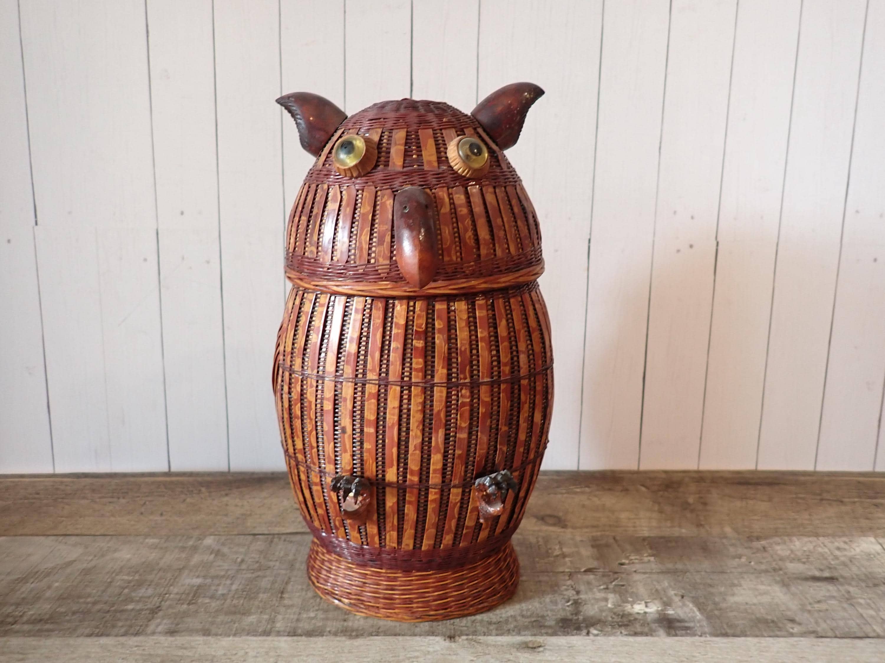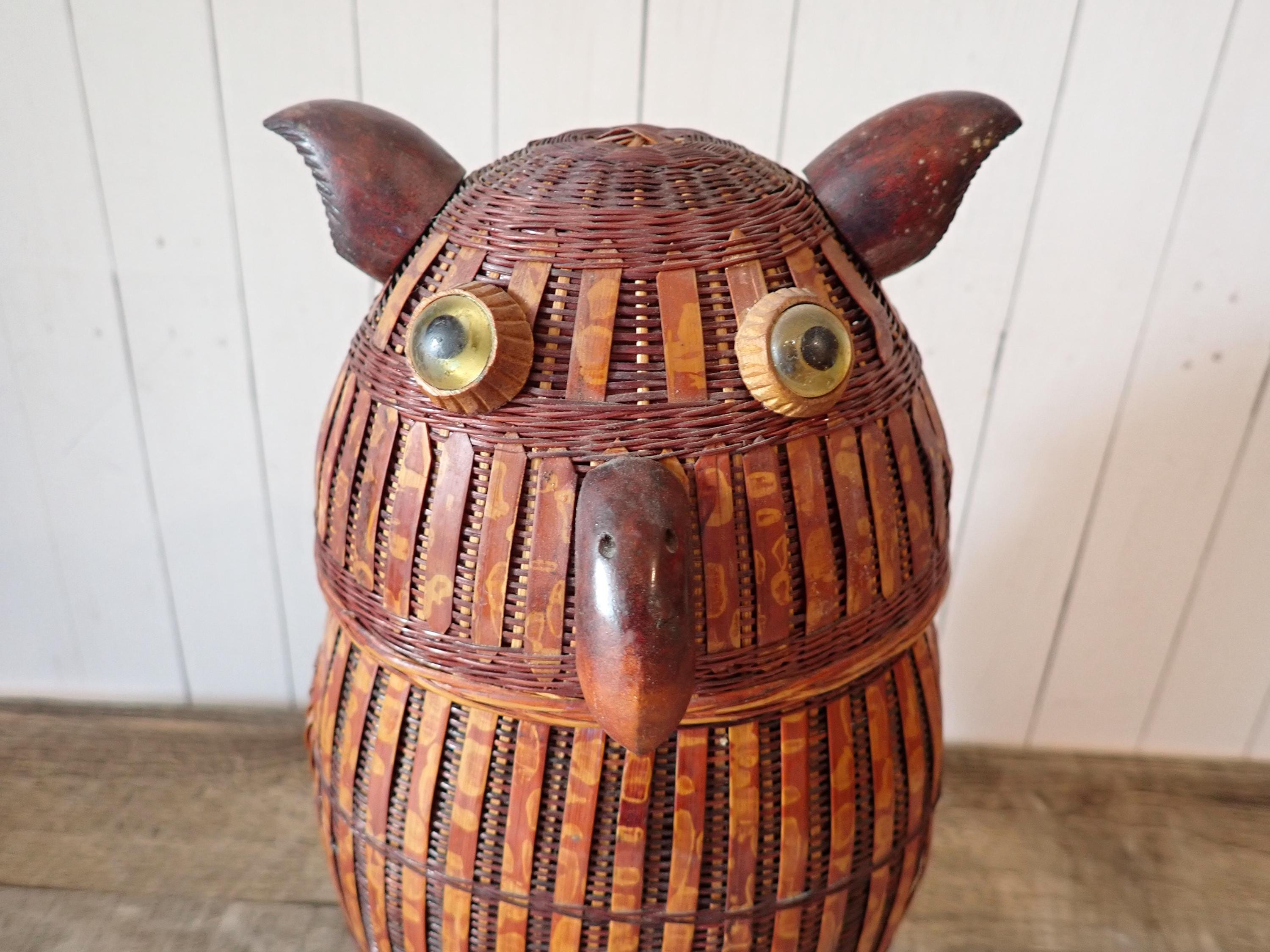 This wicker old basket is 10" tall and 6" wide. It is a darker brown piece with woven wicker and wooden bands. The basket is accented with wooden pieces for the owls beak, ears, and feet. The basket is in very good condition with no damage.