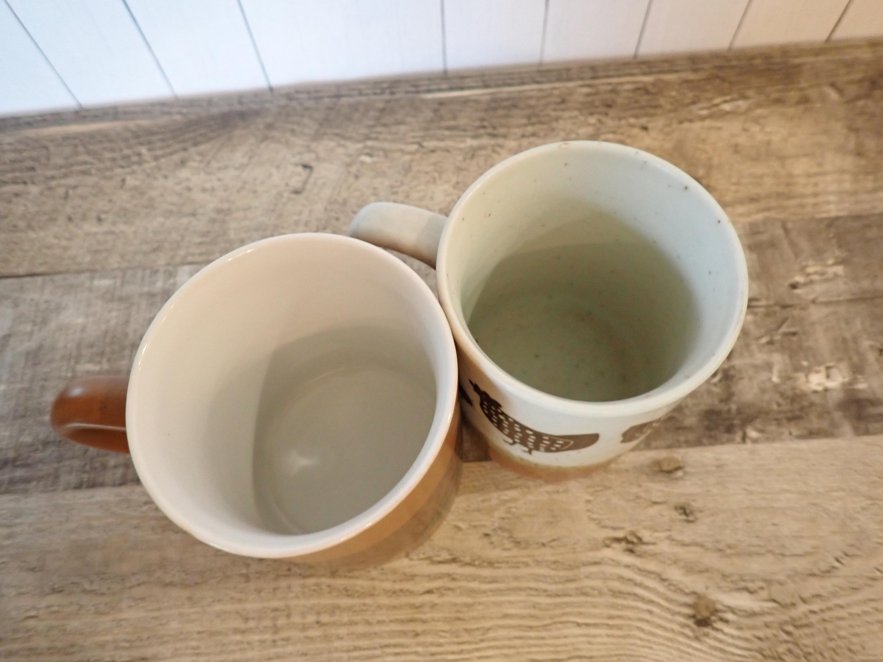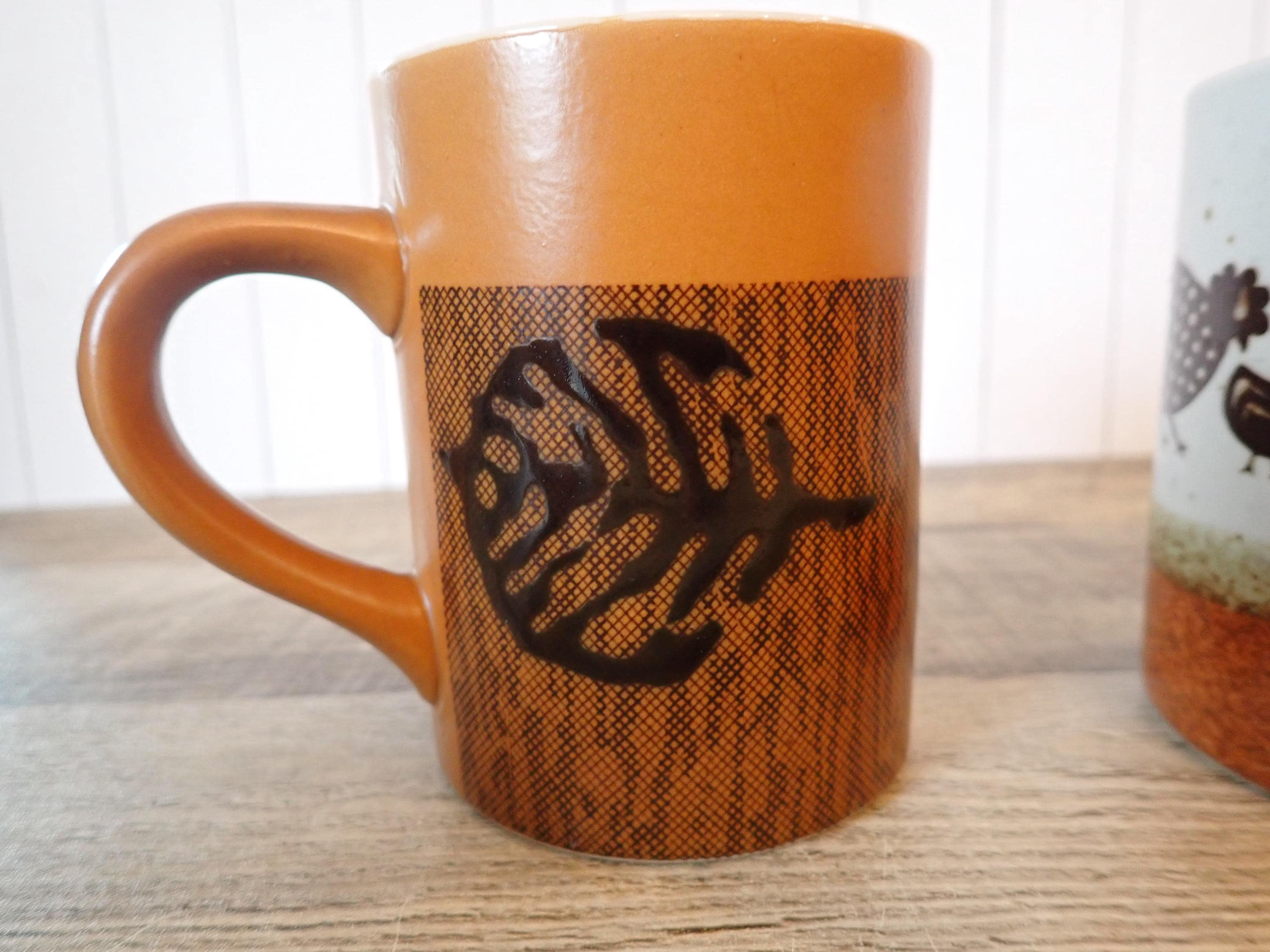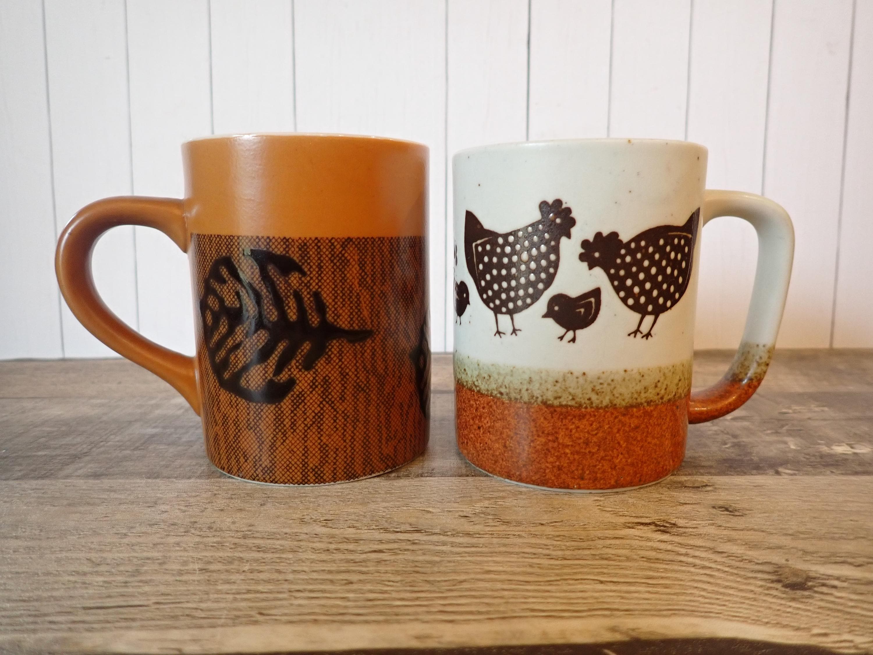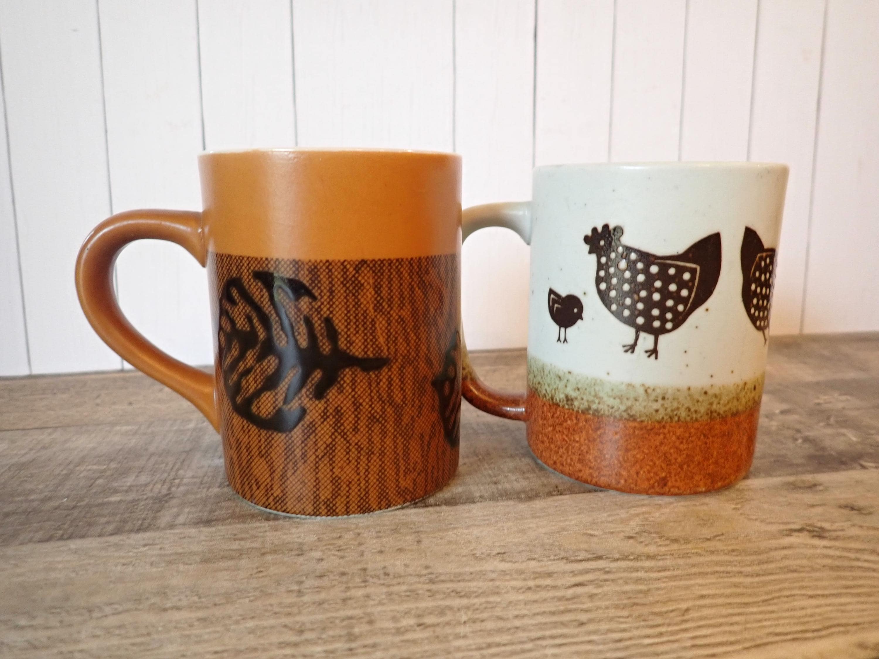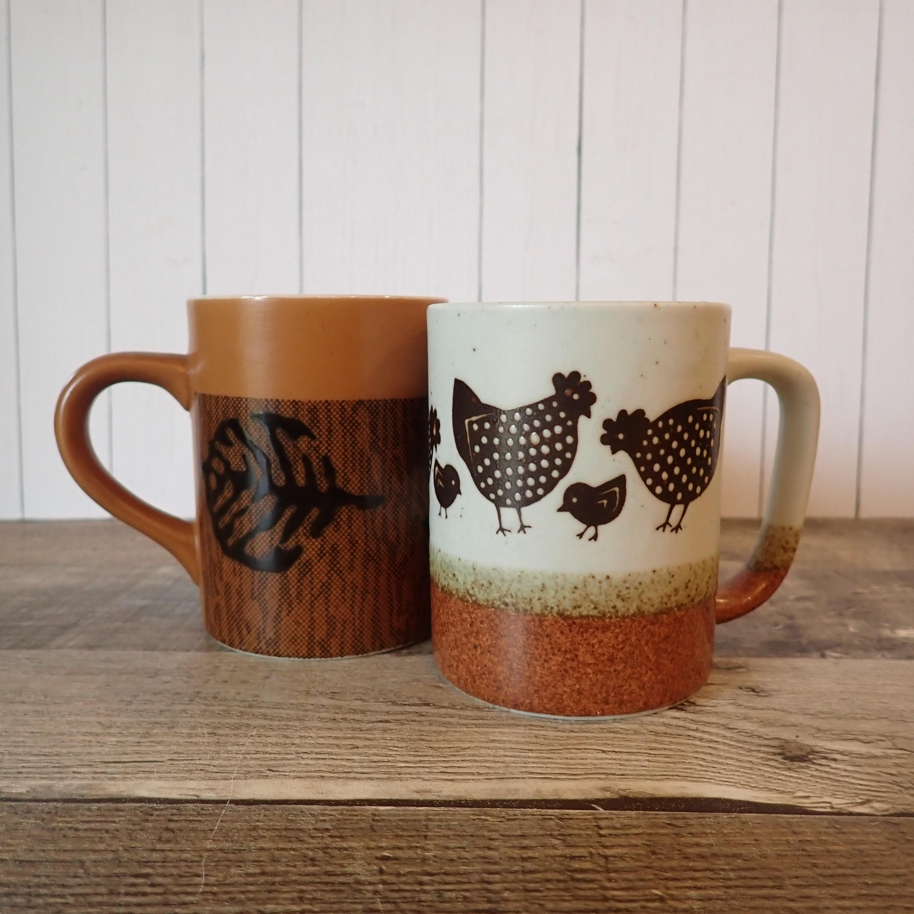 This set of stoneware mugs includes 2 coordinating mugs with brown and white designs - one with a chicken design and one with a leaf design. Both mugs are 3.75" tall and 3" in diameter. With the handles, they are 4.5" wide. There are no makers marks or labels on the mugs. Each mug can hold 9 oz. filled to the rim. Both mugs are in very good condition with no chips or cracks.
