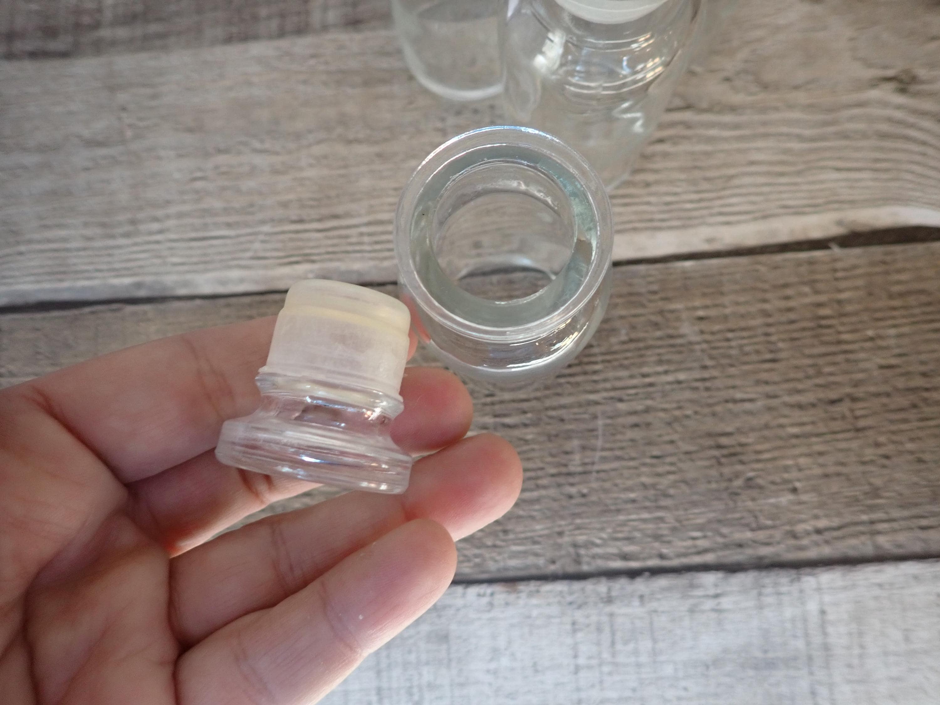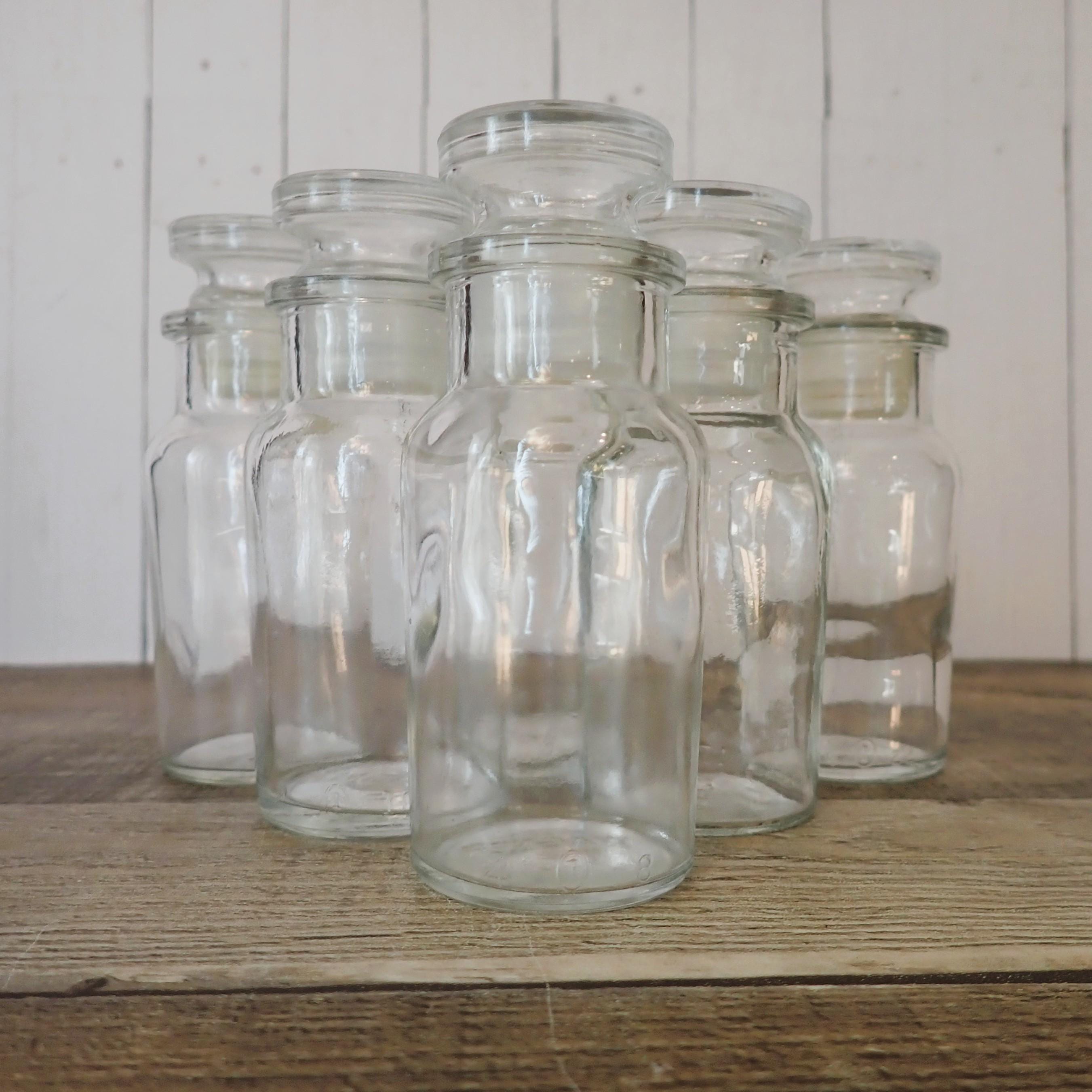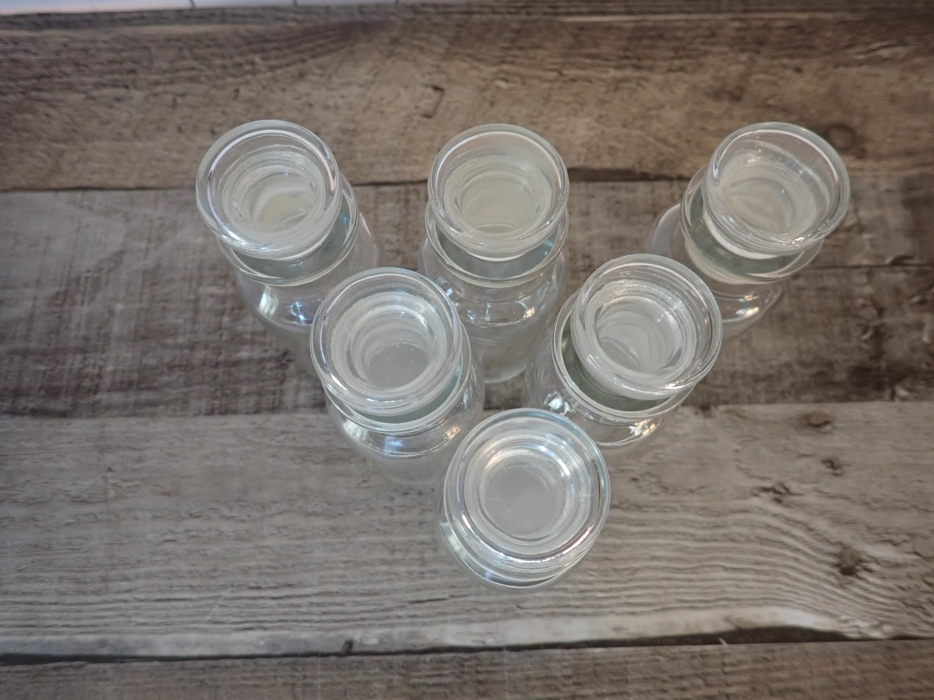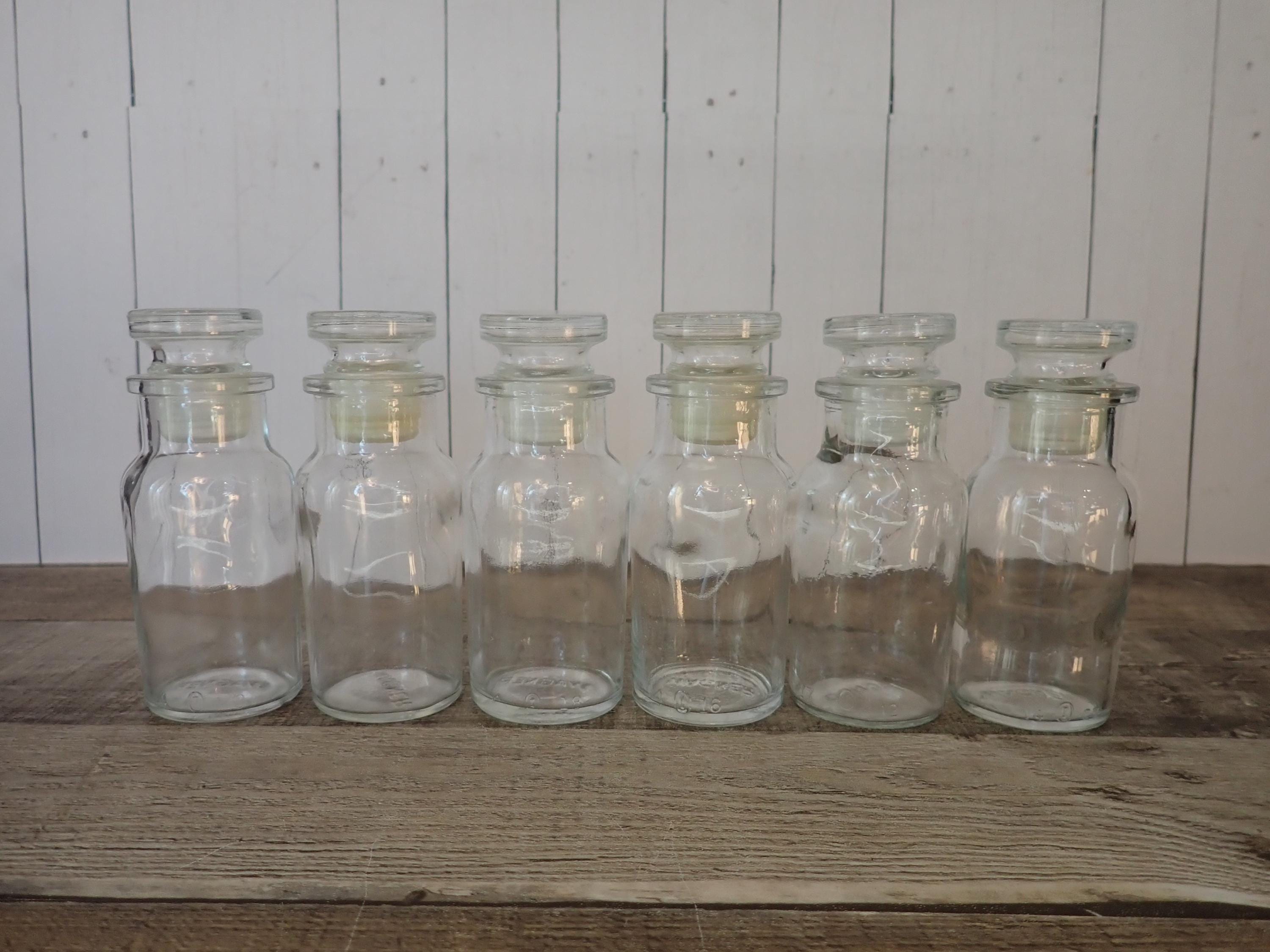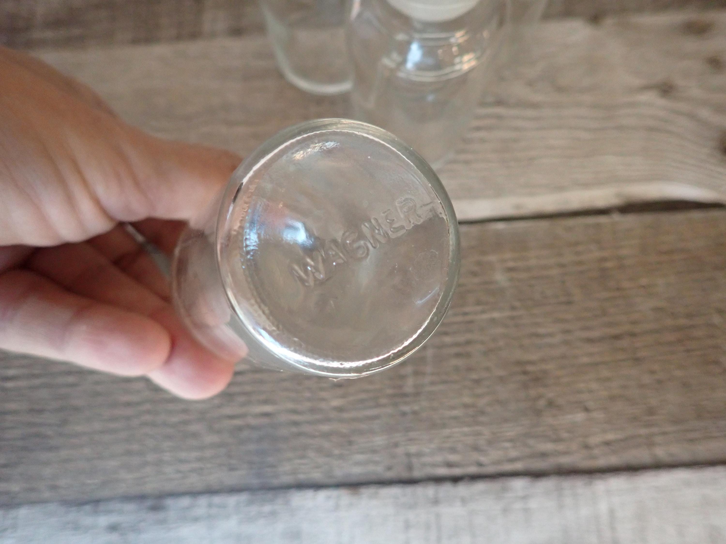 This set of small spice or apothecary bottles by Wagner includes 6 matching bottles in the same size. Each bottle measures 4" tall with the lid and 1.5" in diameter. The bottoms of all of the bottles are all marked WAGNER. The bottles each have a glass stopper with a plastic seal. All of the bottles in are in very good condition with no chips or cracks.