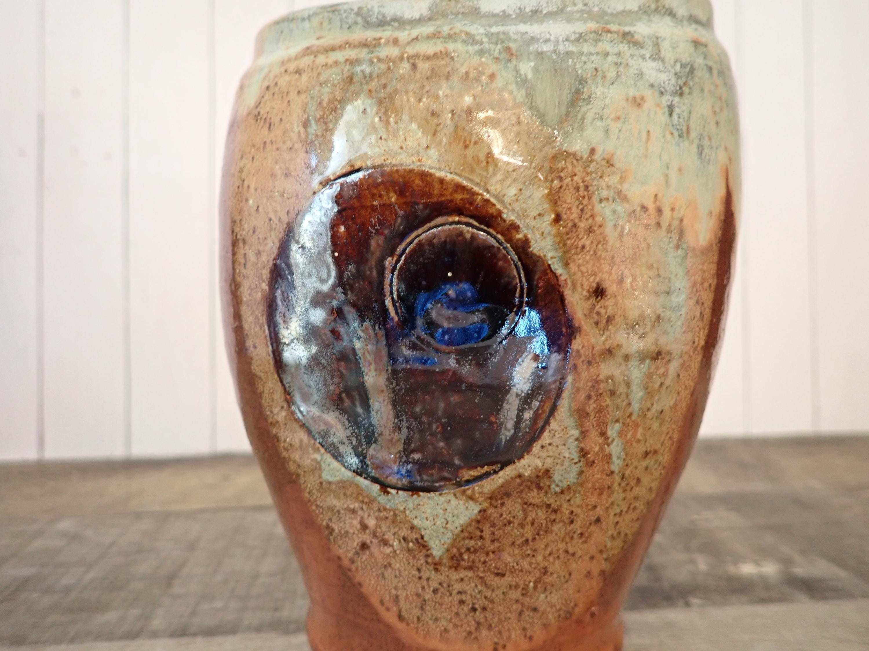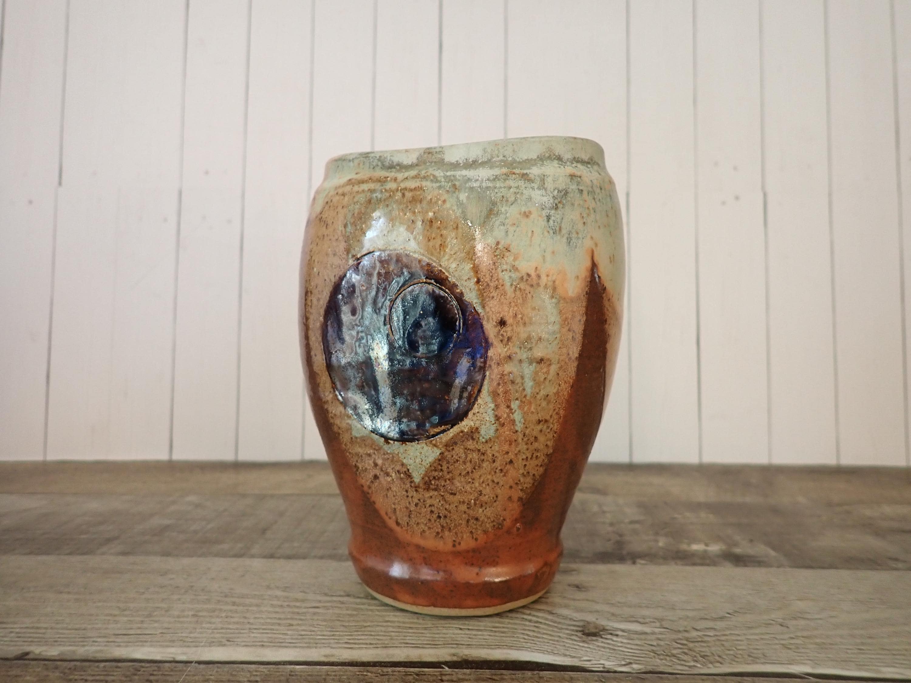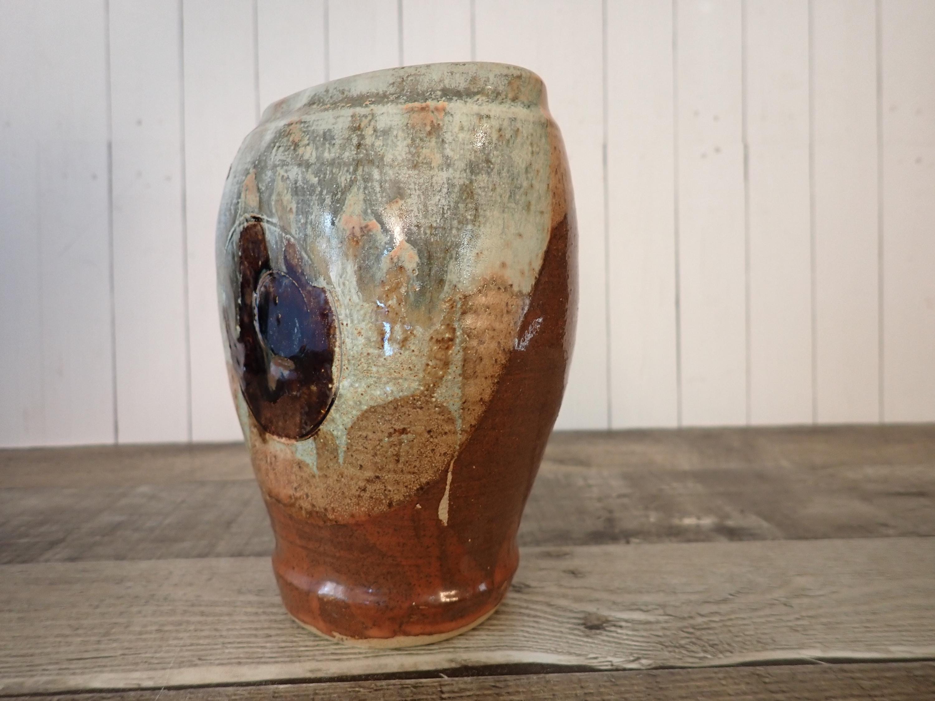 This lovely pottery vase is 6" tall and 4.5" wide. It is a tan, gray and brown pottery piece with overlapping glazes. The middle of the vase has a brown circle on both sides of the vase. The vase opening is oval shaped. The bottom is signed BINDER '61. The vase is in very good condition with no chips or cracks.