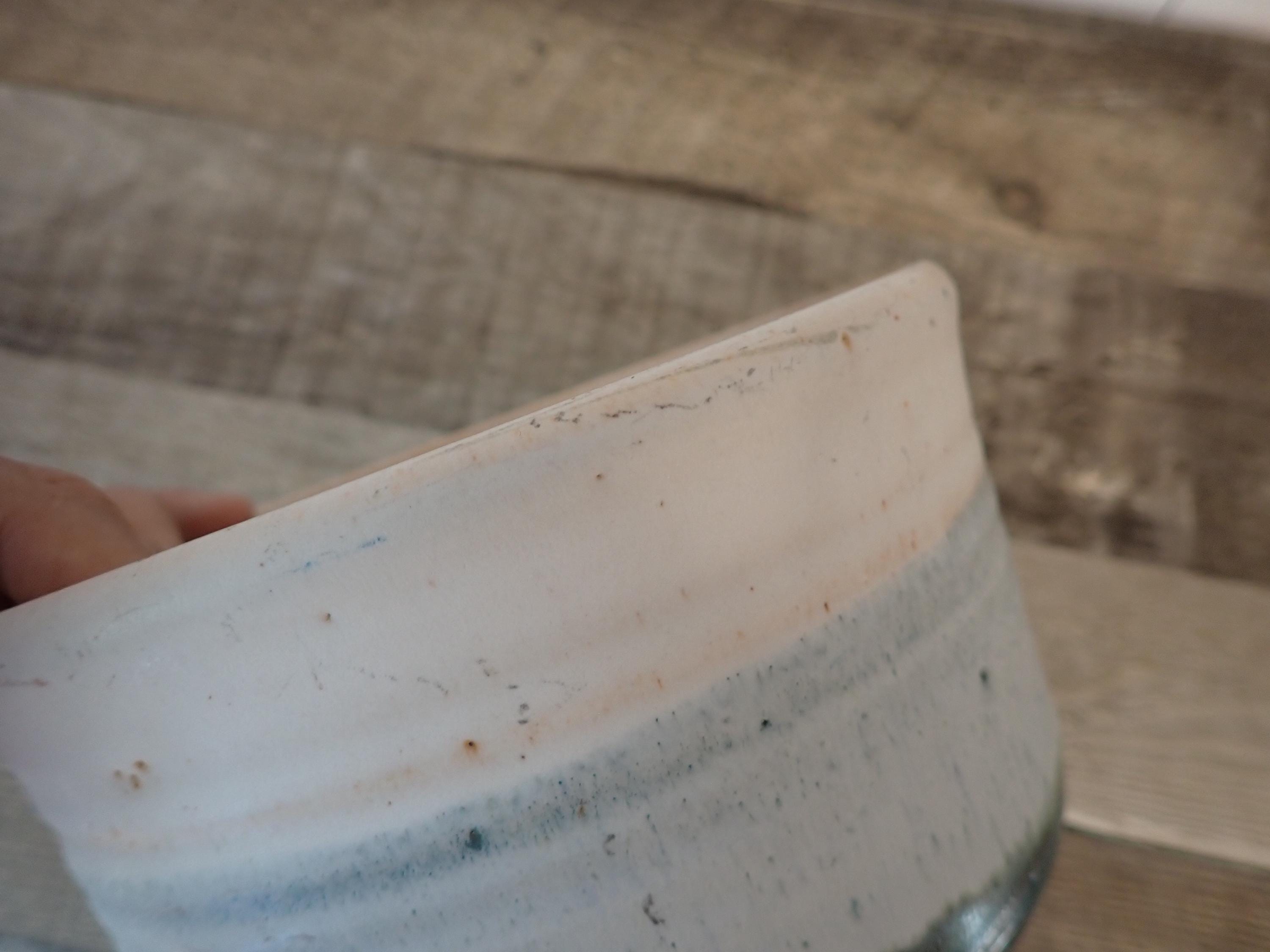 This stoneware planter is 7" in diameter and 4" tall and is a handmade pottery piece by The Dip Kids. The planter is a tan stoneware with blue, green and white glazes, and a lightly textured banded design around the piece. The bottom is marked THE DIP KIDS / 630.484.5878. The planter is in very nice condition with no chips or cracks, but there are some scuff-type marks on the outside of the piece as shown in the last 2 photos. There are no drainage holes in this planter.