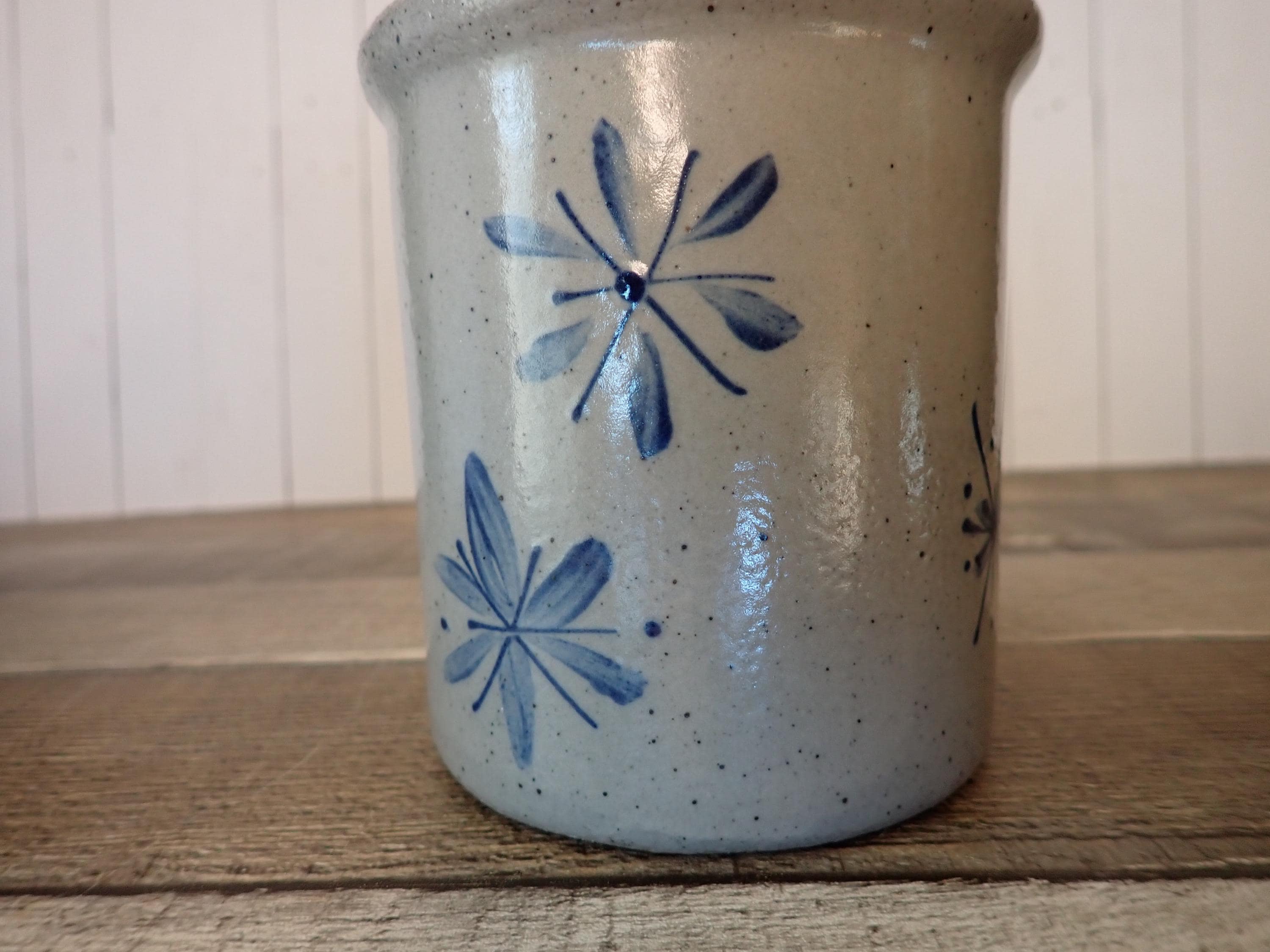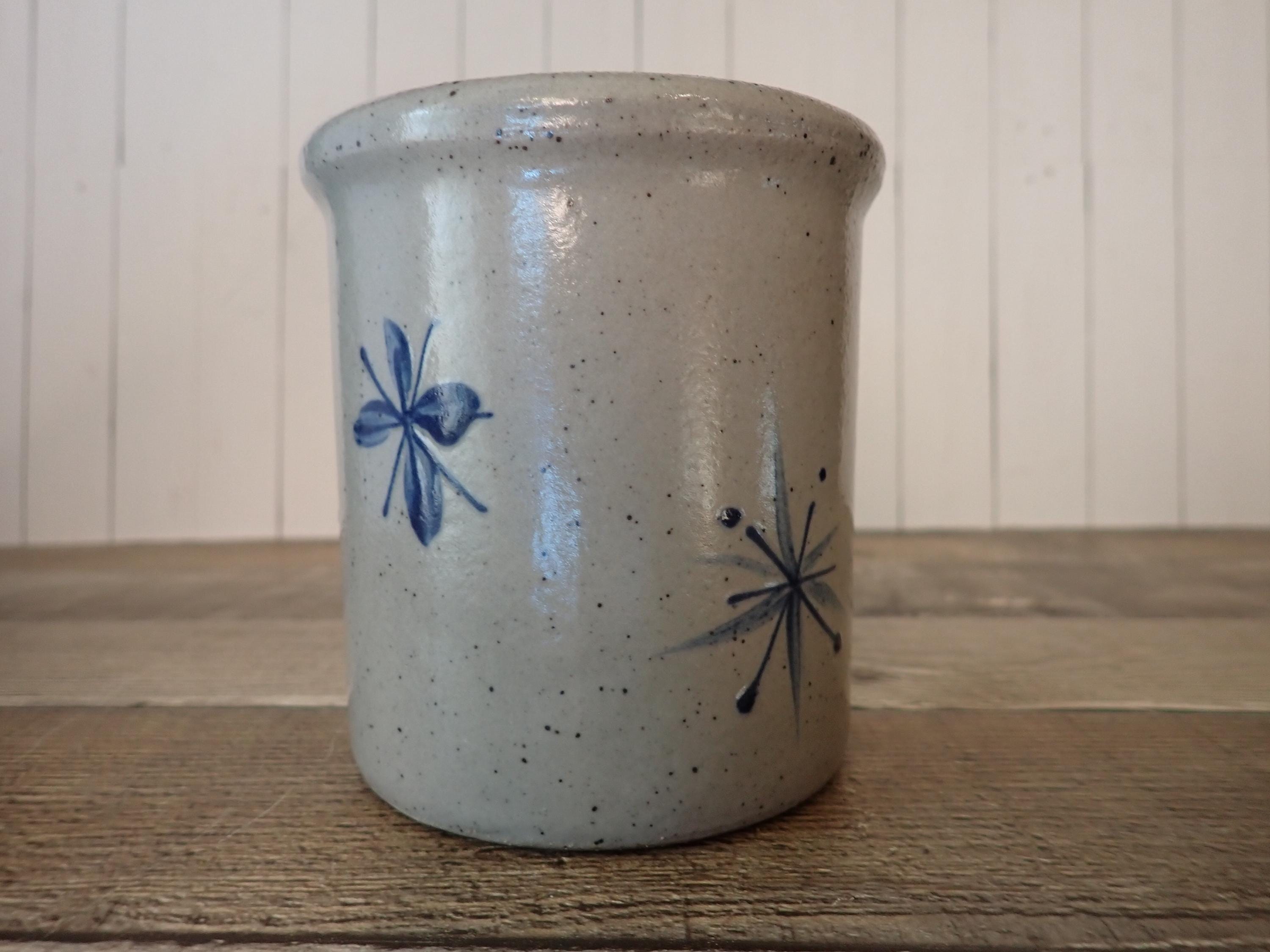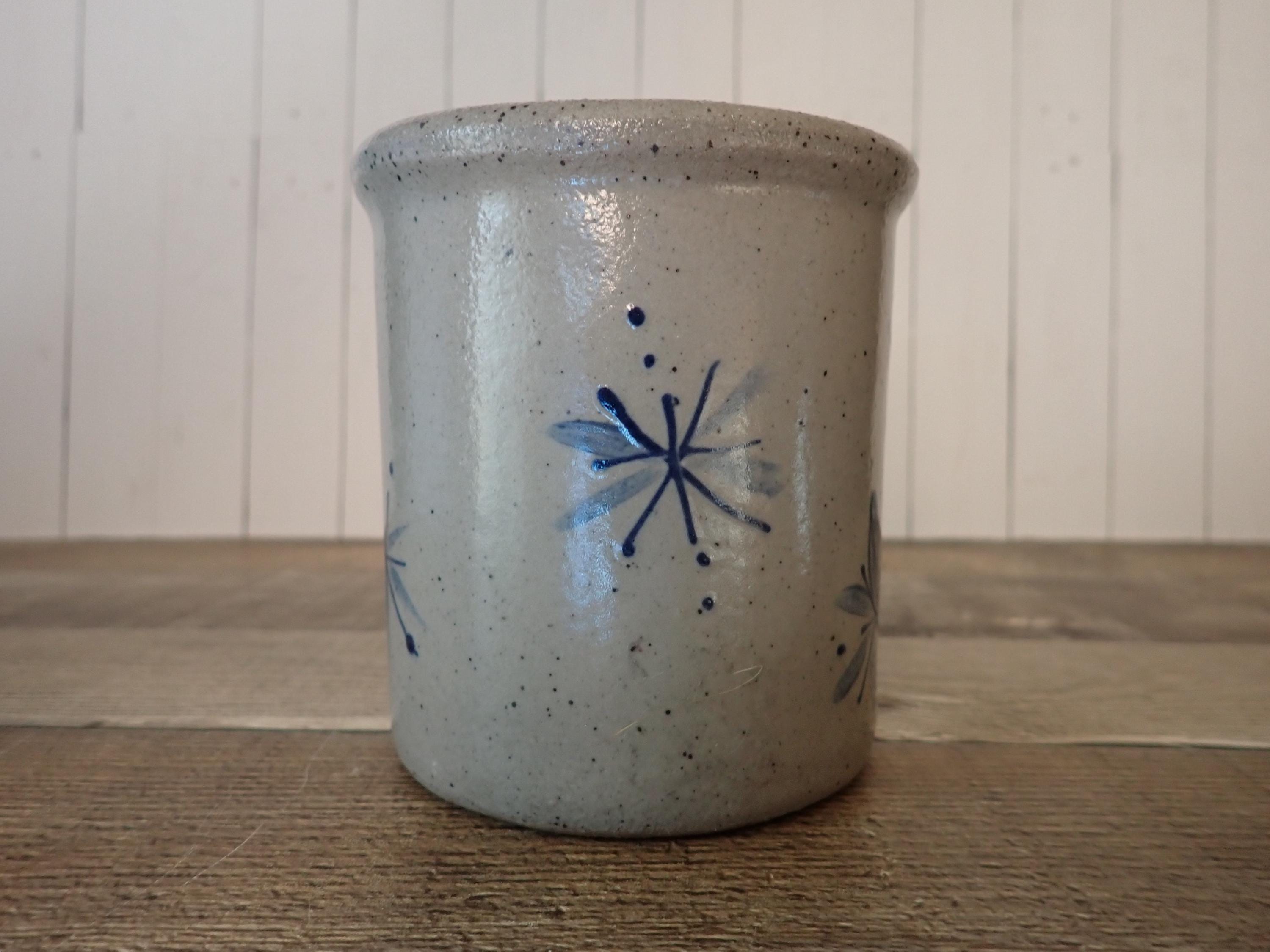 This small gray and blue Rowe Pottery Works crock is decorated with a starburst or flower design around the piece. The crock is 4.5" tall and 4" in diameter at the rim. The crock is stamped on the bottom side ROWE POTTERY. This crock is in very good condition with no chips or cracks.