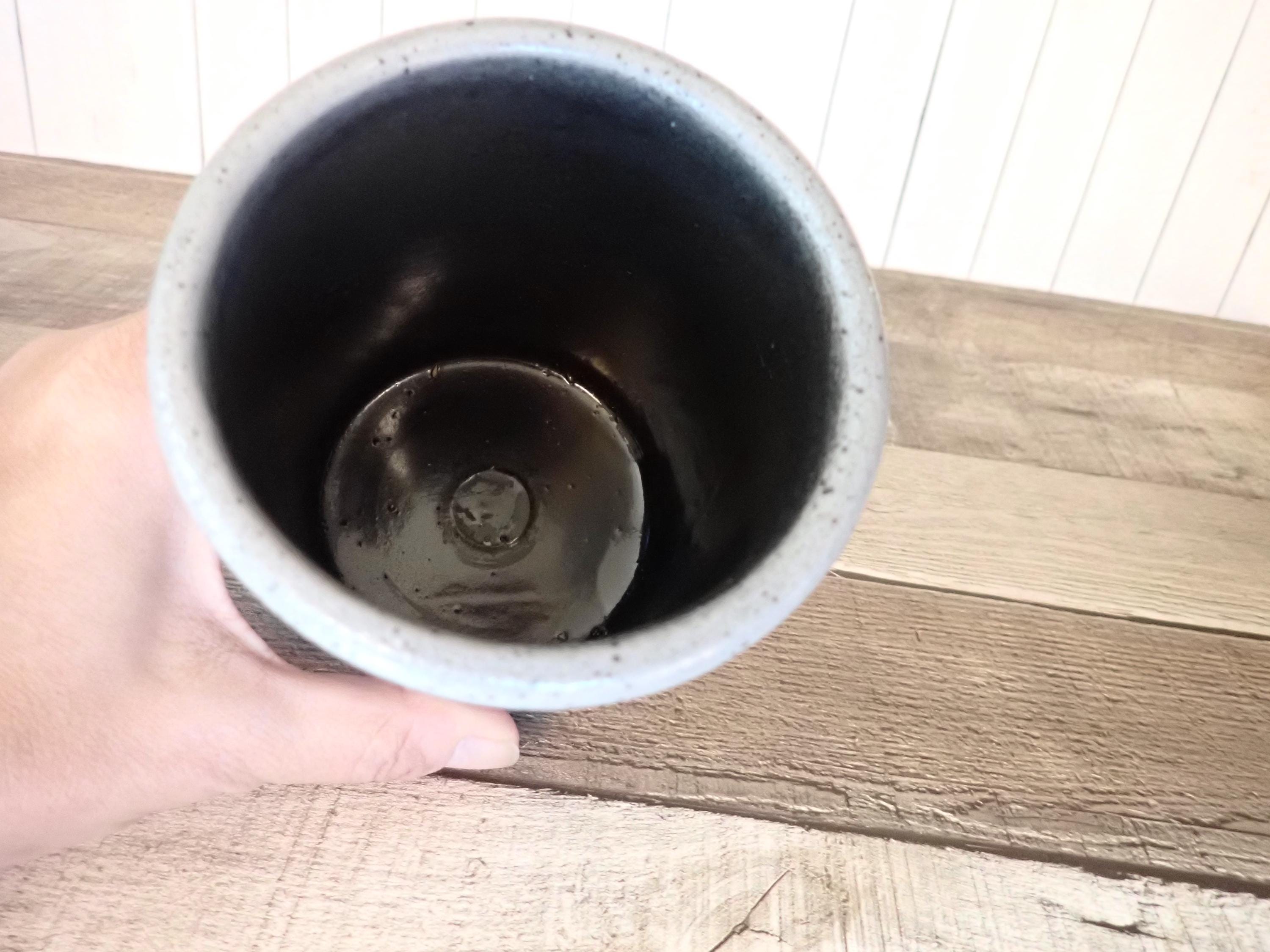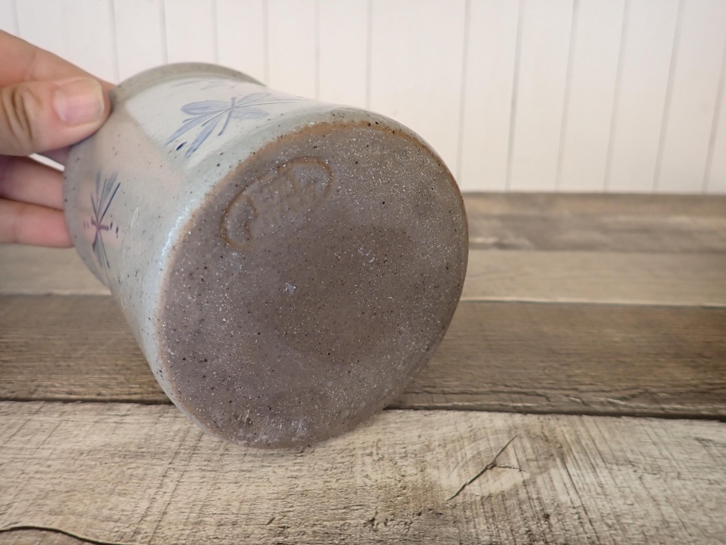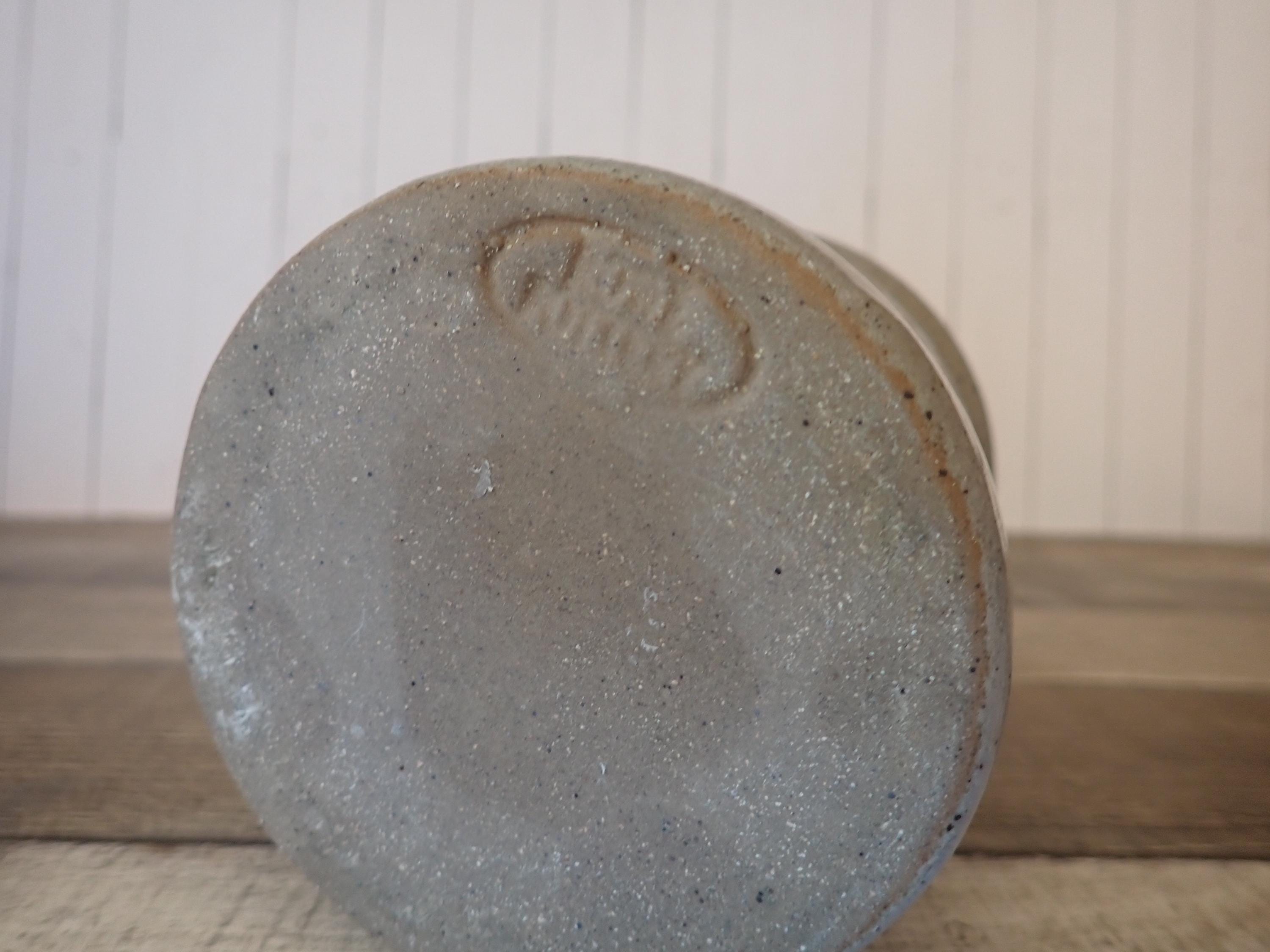 This small gray and blue Rowe Pottery Works crock is decorated with a starburst or flower design around the piece. The crock is 4.5" tall and 4" in diameter at the rim. The crock is stamped on the bottom side ROWE POTTERY. This crock is in very good condition with no chips or cracks.