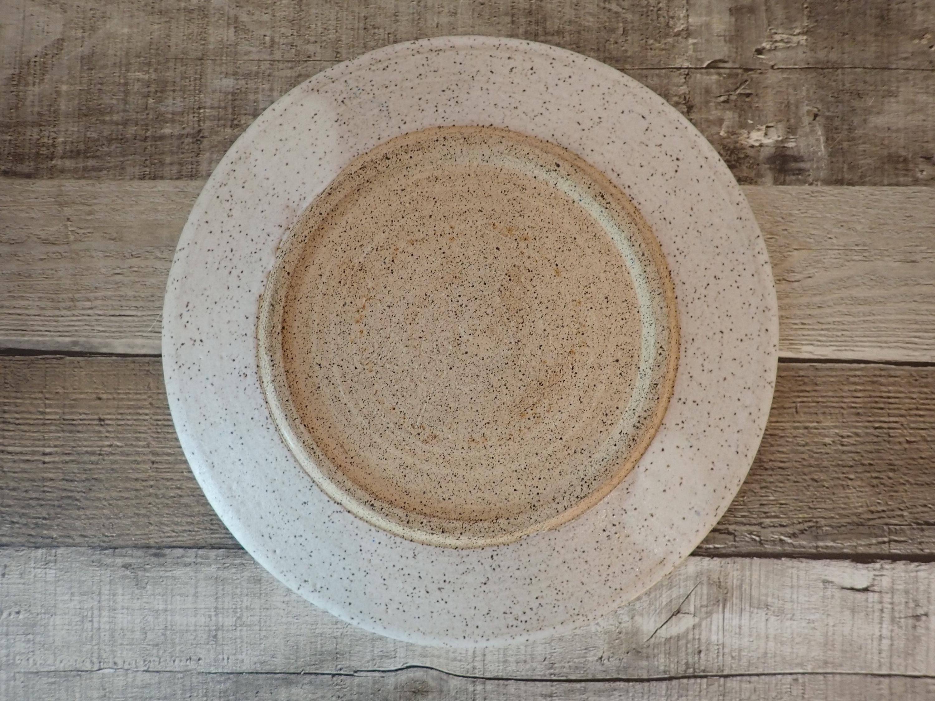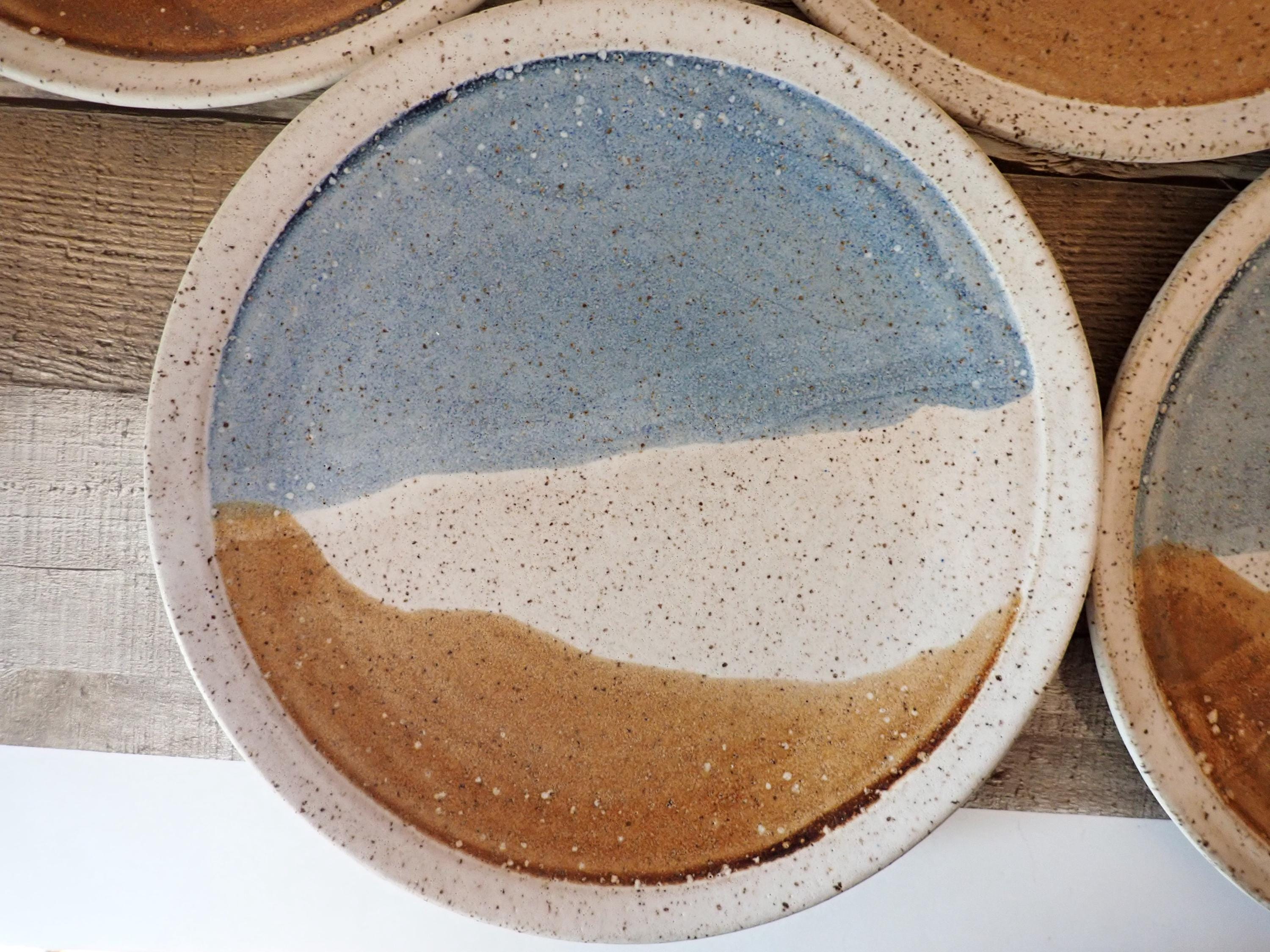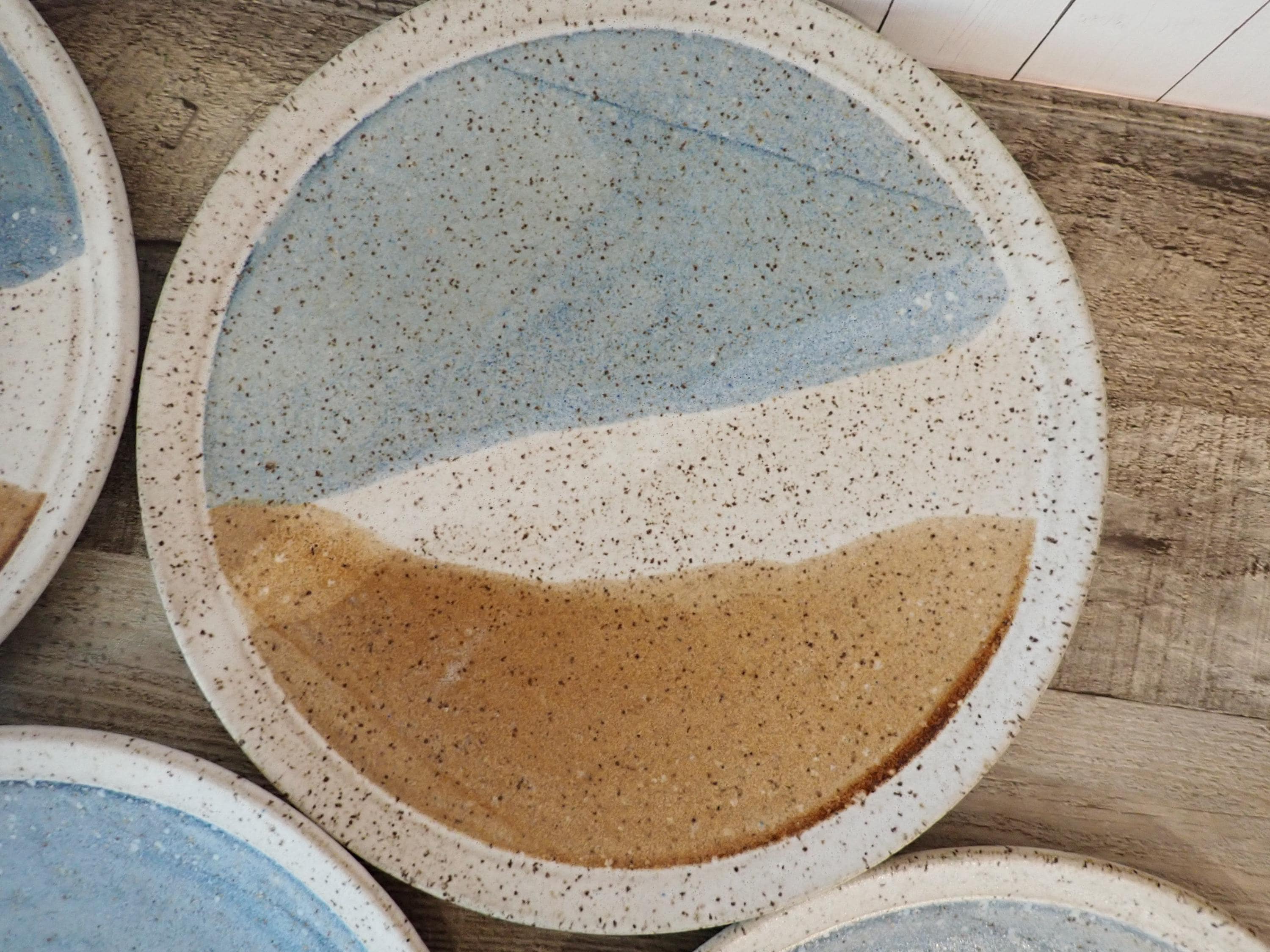 This set of 4 pottery plates are a blue, brown and white pottery with a wavy design. The plates are 10.5" in diameter and 1" high at the rim. The plates have a rustic style with a solid-colored wavy sections. The bottoms of the plates are signed by the artist - it looks like Westby or Westly. All 4 plates are in very good condition with no chips or cracks.