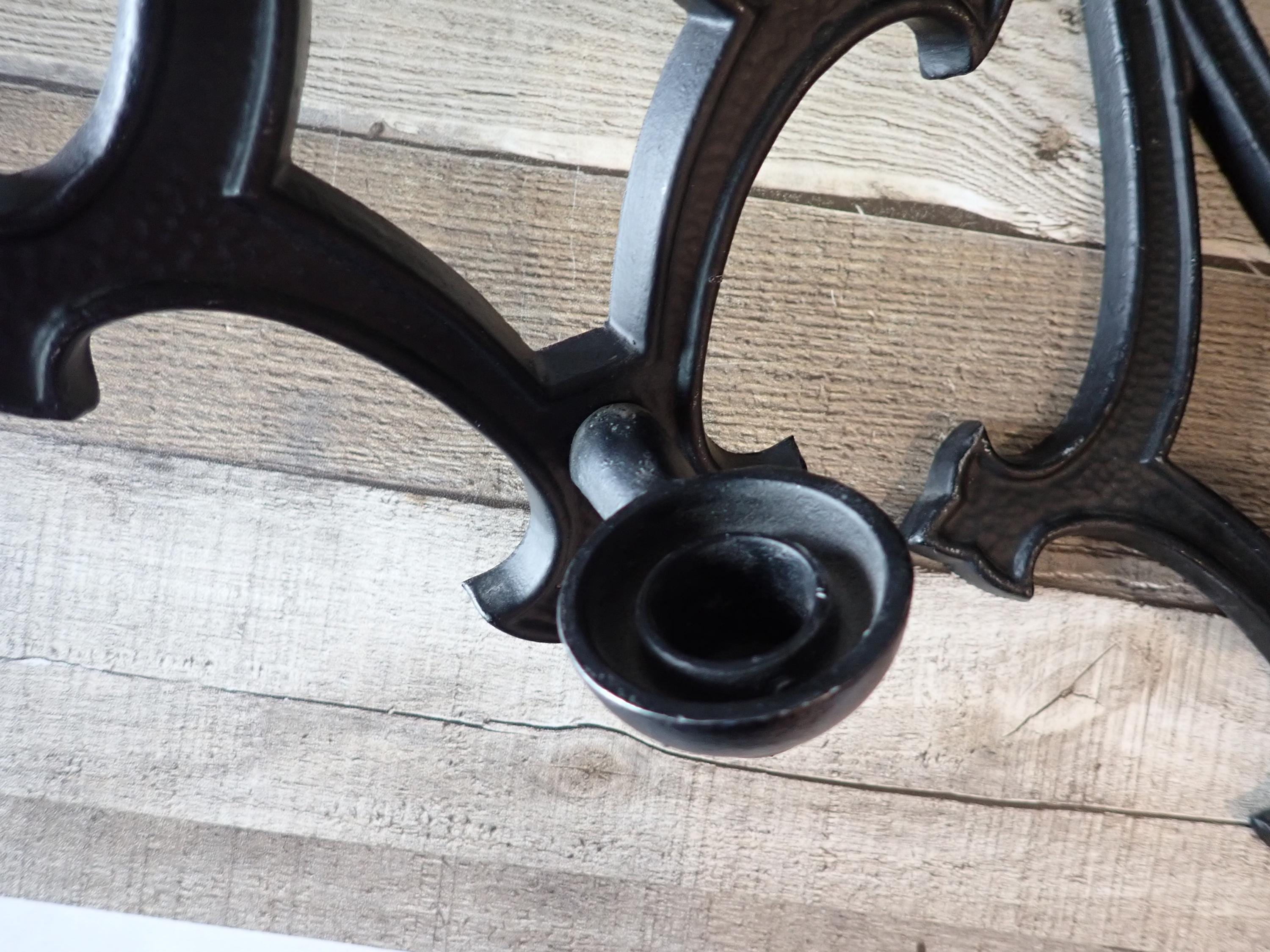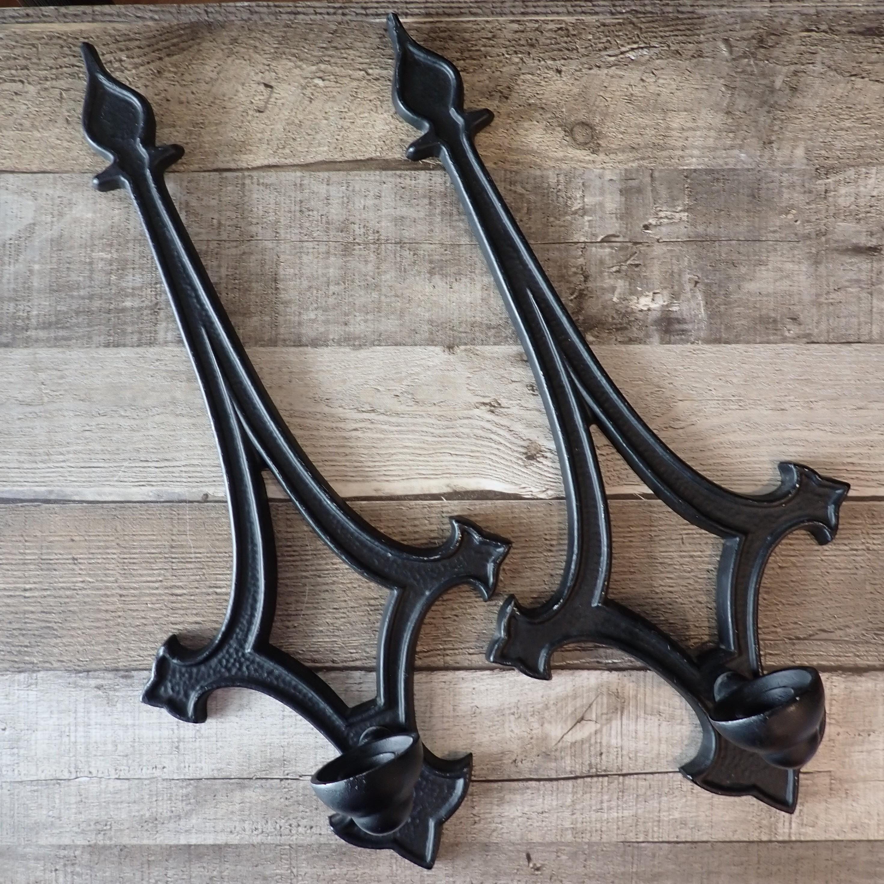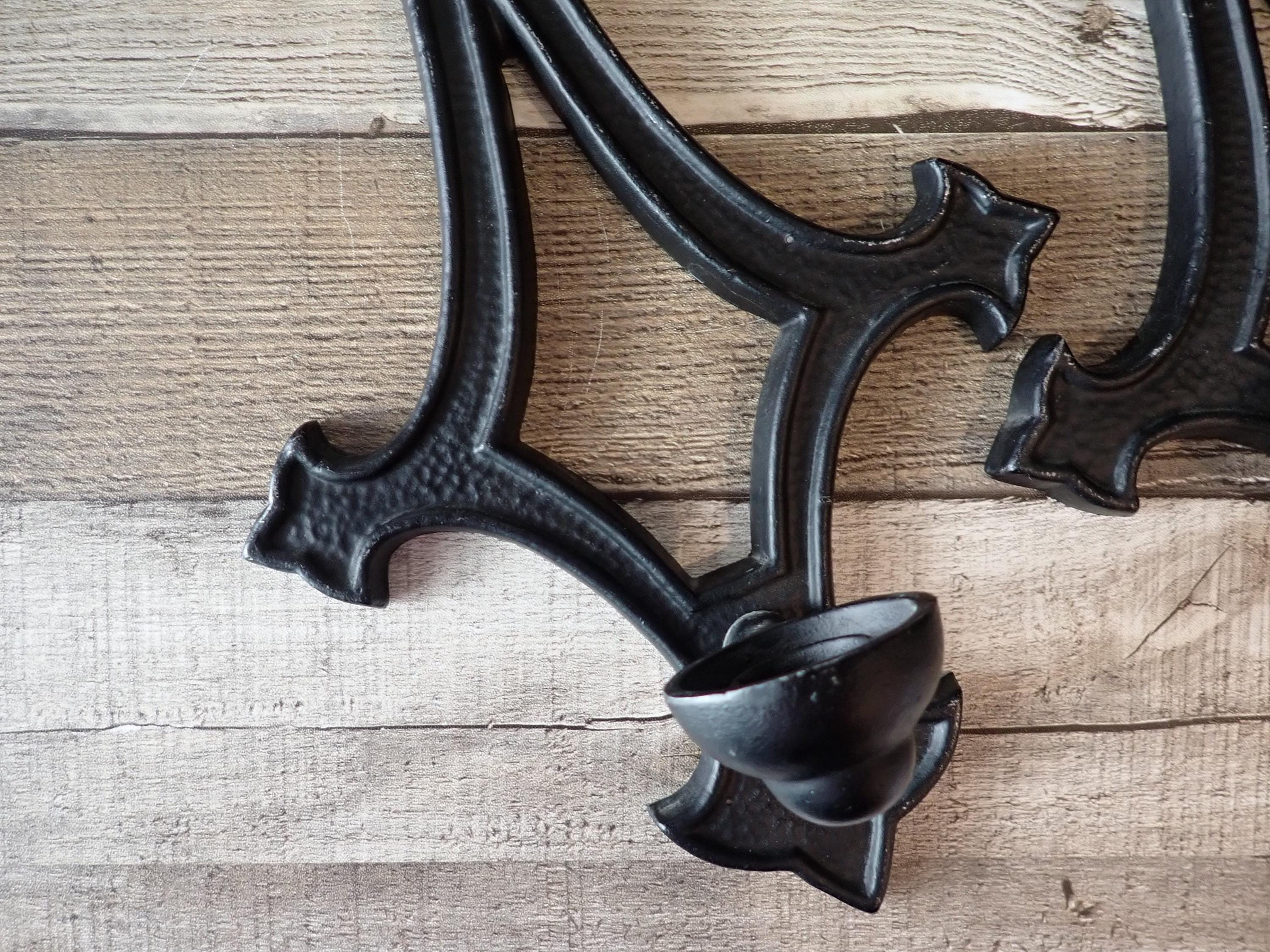 This pair of black metal candle sconces are 17.5" tall, 7.5" wide, and 3.5" deep. They are a black metal material with a matte black finish. The sconces are uniquely styled with a point at the top that widens and flares toward the bottom, then comes back to a point. There is a round metal candle holder near the bottom of the sconce. The back of each sconce has a round metal hanger to attach to a wall. Both sconces are in very good condition, however there are a few scratches in the black paint here and there. Very cool set of black metal wall sconces!