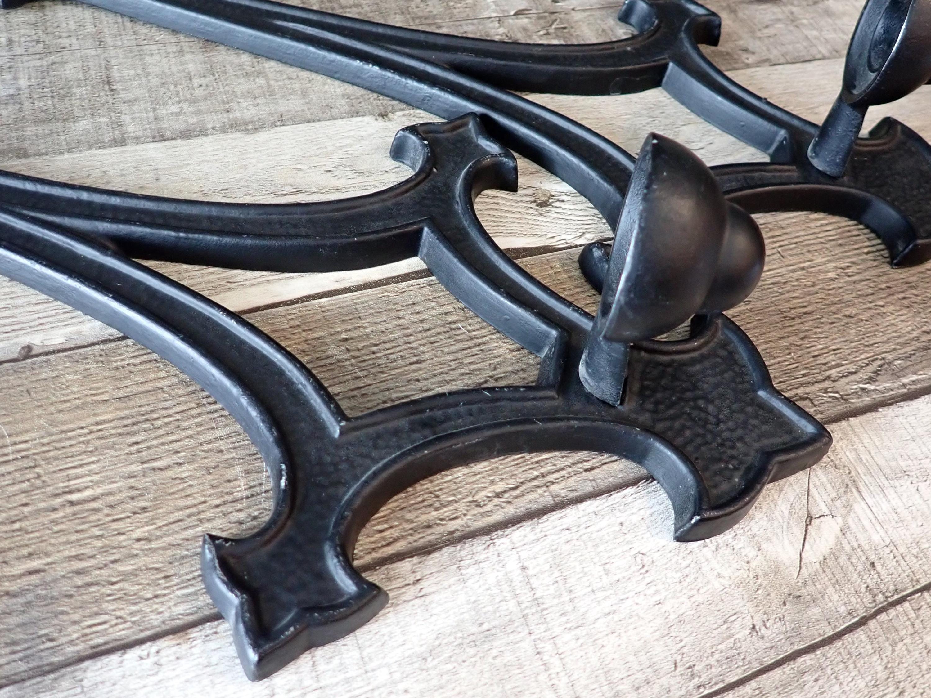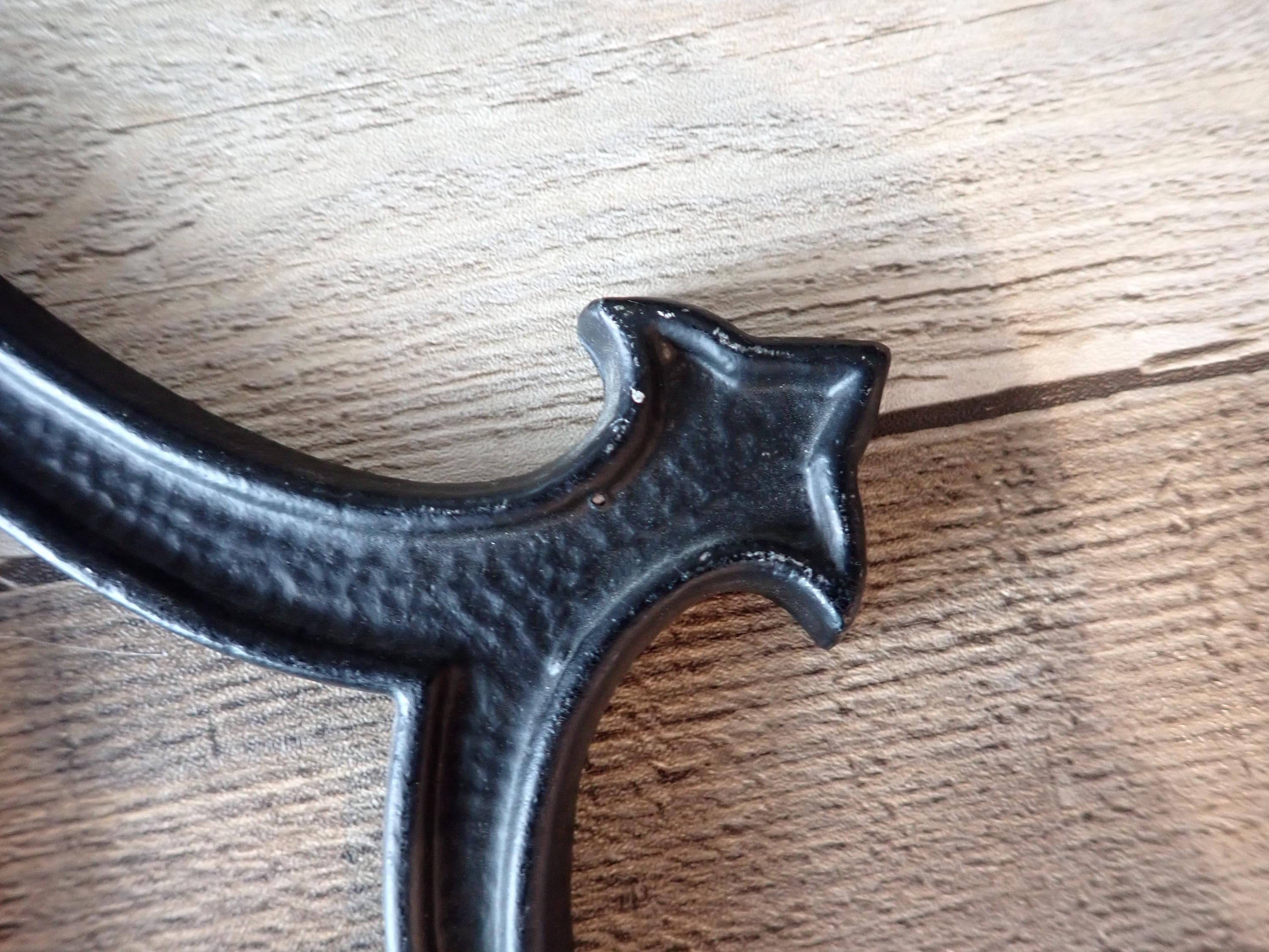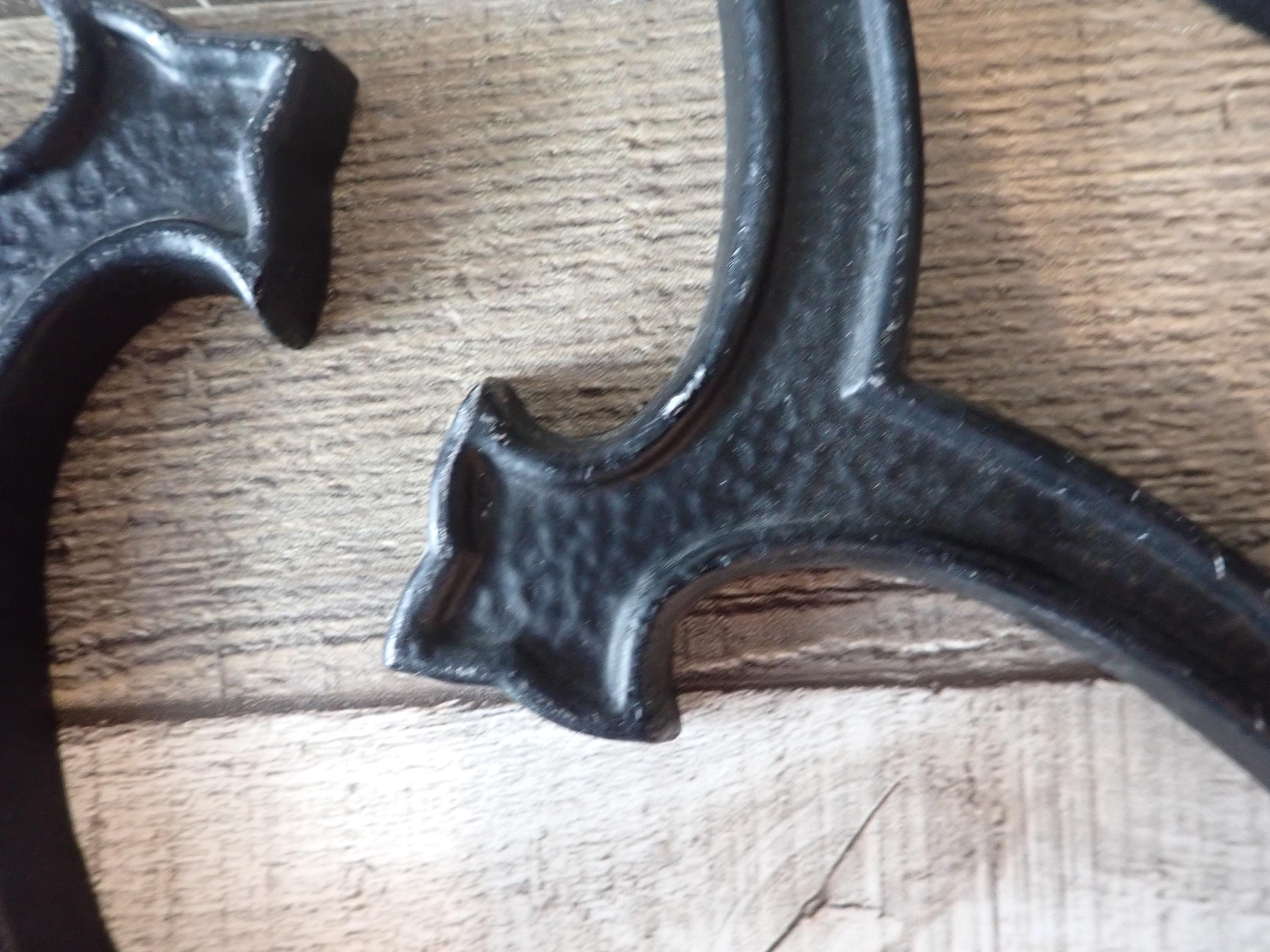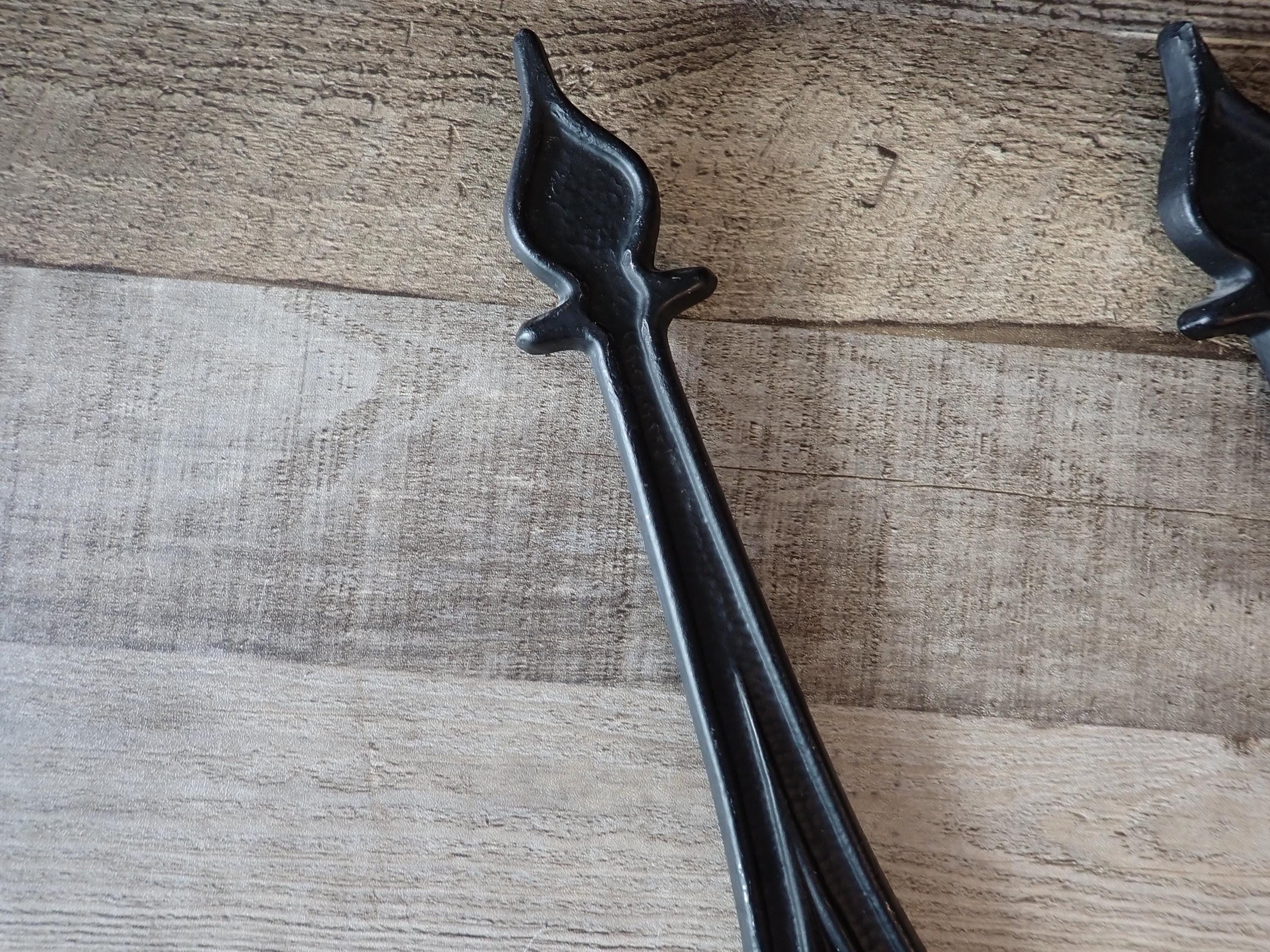 This pair of black metal candle sconces are 17.5" tall, 7.5" wide, and 3.5" deep. They are a black metal material with a matte black finish. The sconces are uniquely styled with a point at the top that widens and flares toward the bottom, then comes back to a point. There is a round metal candle holder near the bottom of the sconce. The back of each sconce has a round metal hanger to attach to a wall. Both sconces are in very good condition, however there are a few scratches in the black paint here and there. Very cool set of black metal wall sconces!