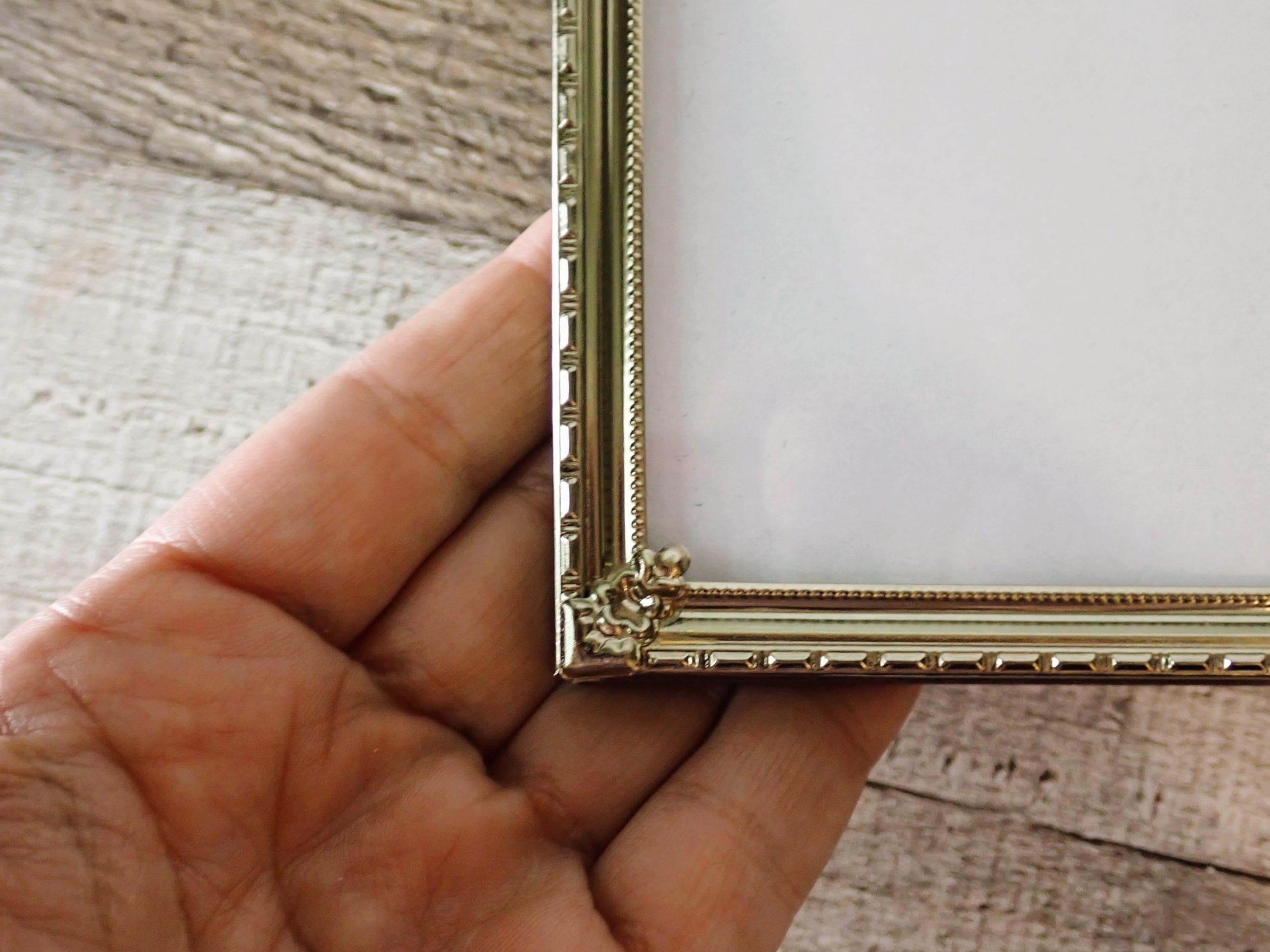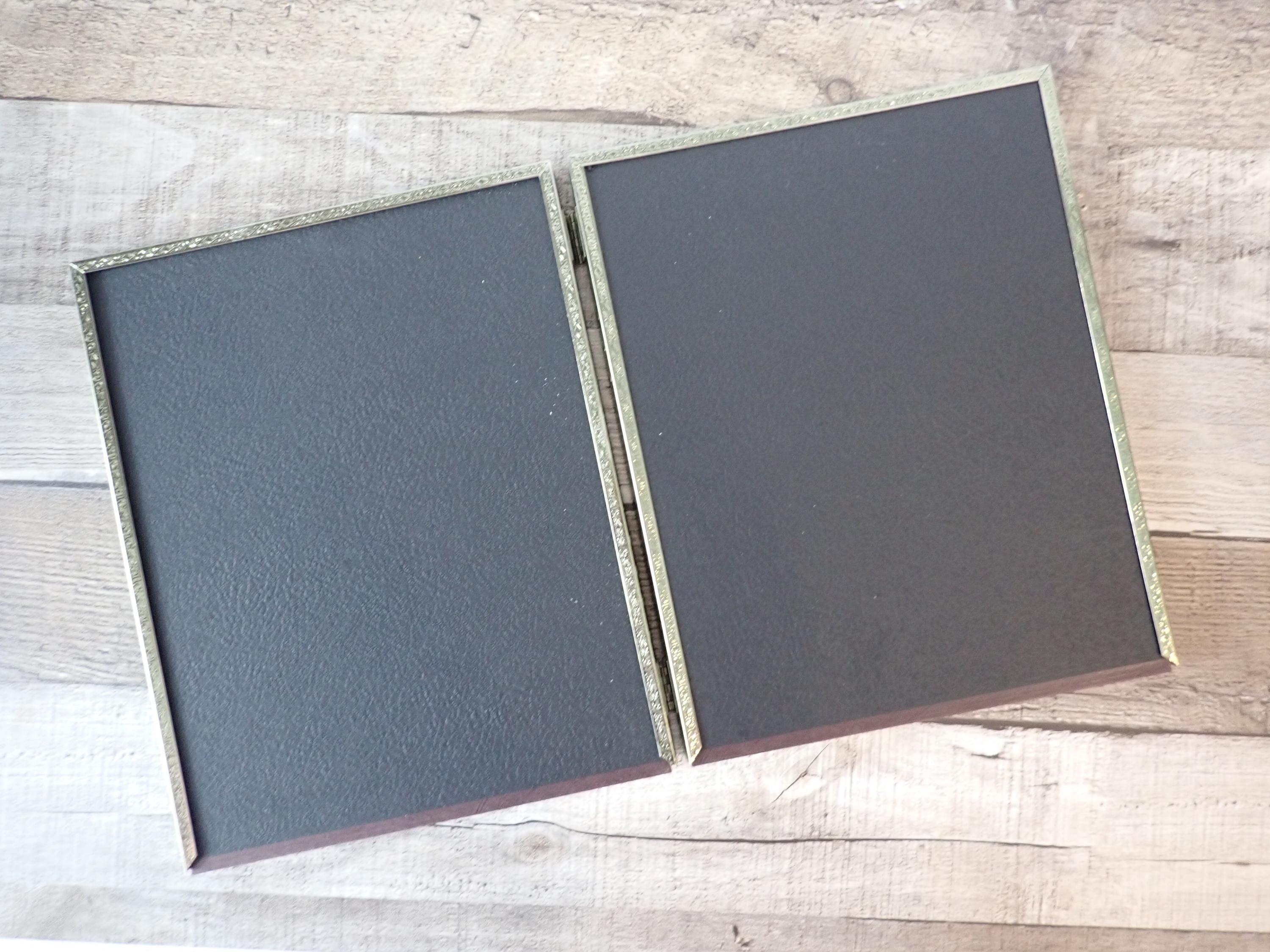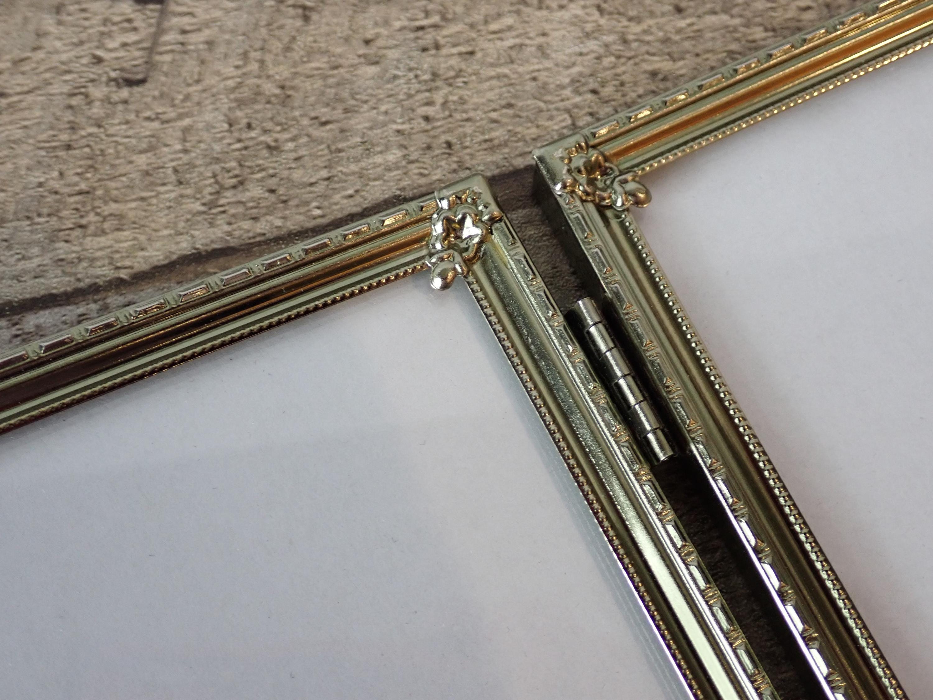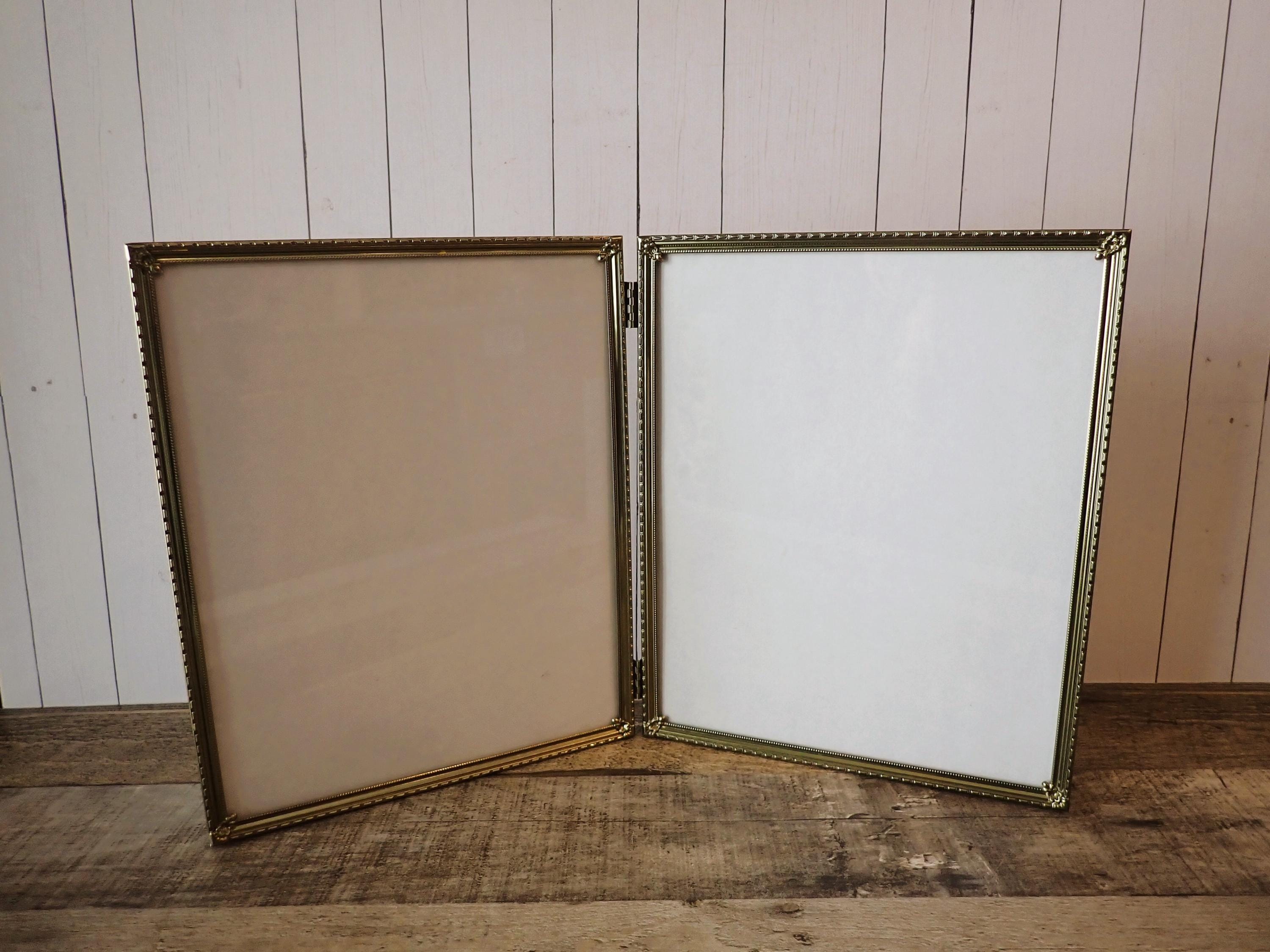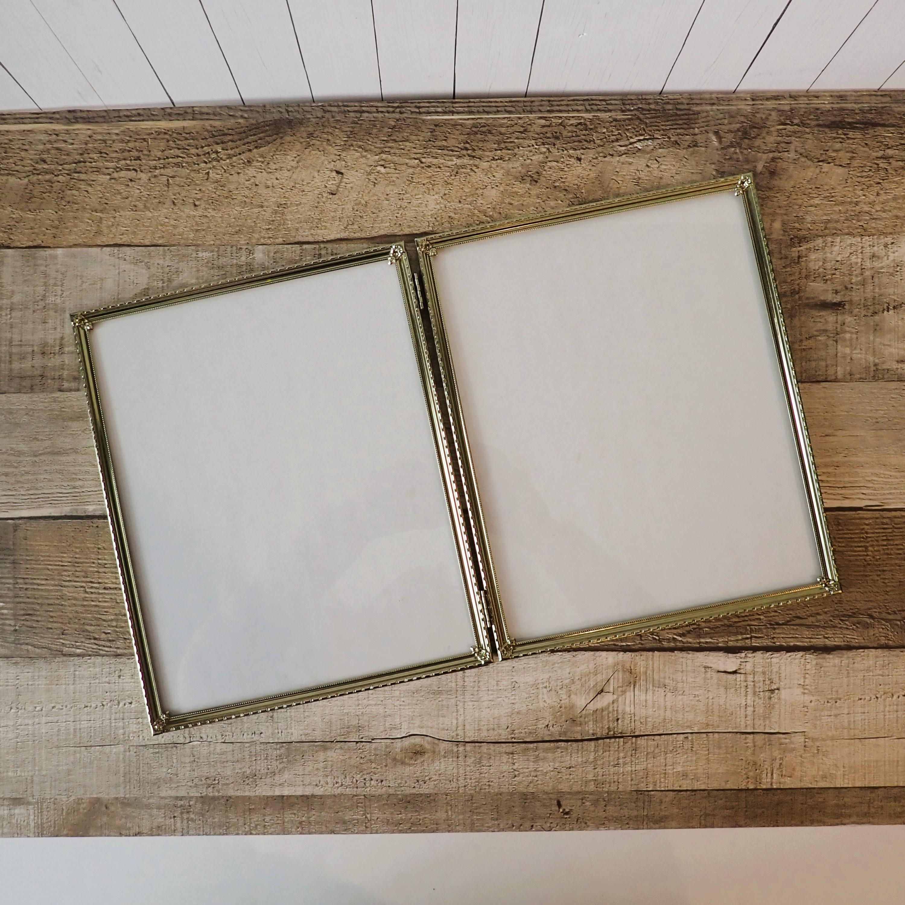 The large sized brass colored metal photo frame is a 2-part hinged frame with 2 8x10 frames. The frame is nicely detailed with a textured design along the front of the frame. The frame is in very nice condition with no damage, and has a clear glass inserts over the photo openings and cardboard backing pieces on both sections of the frame. There is some light tarnish on the frame here and there.