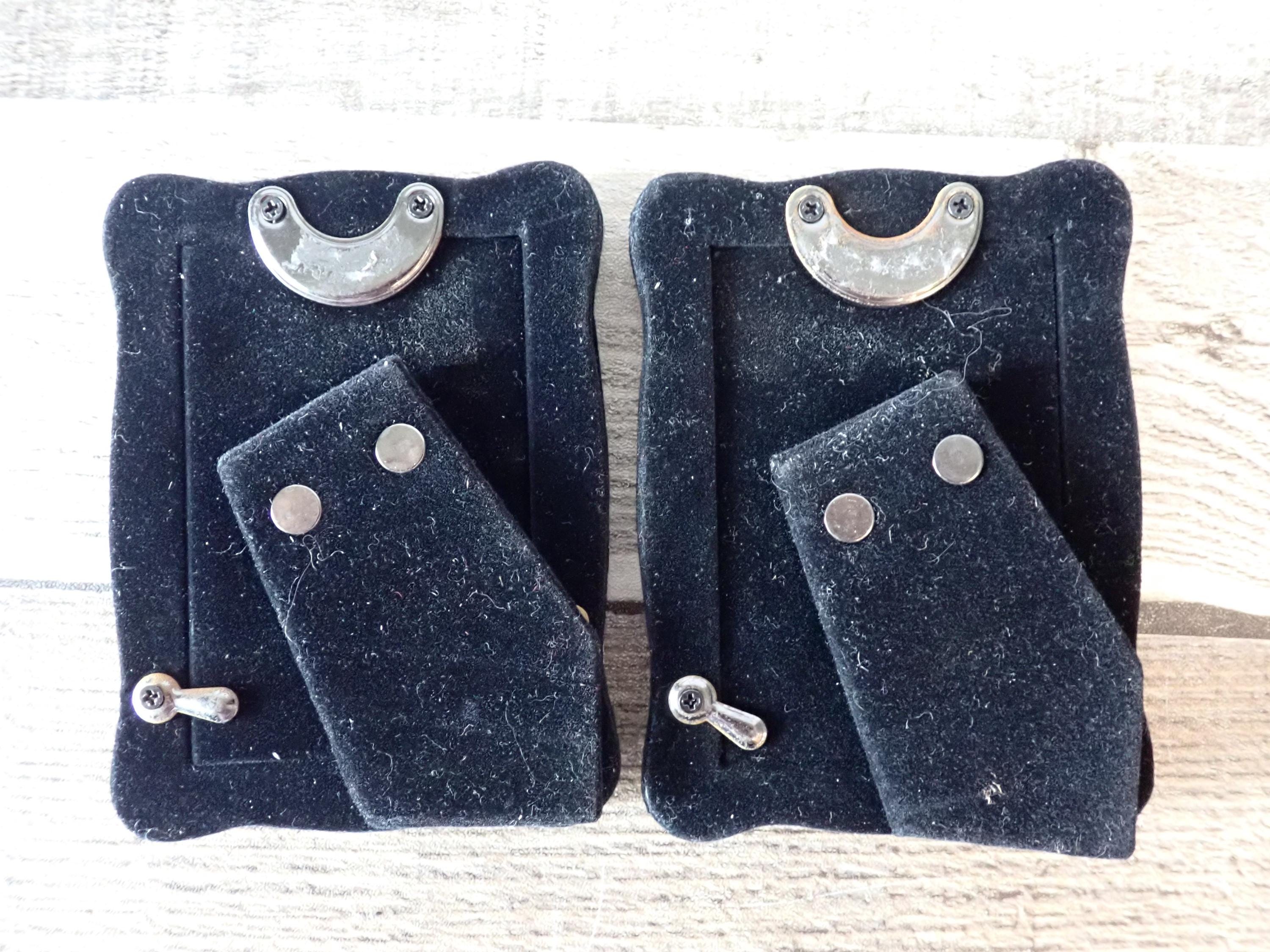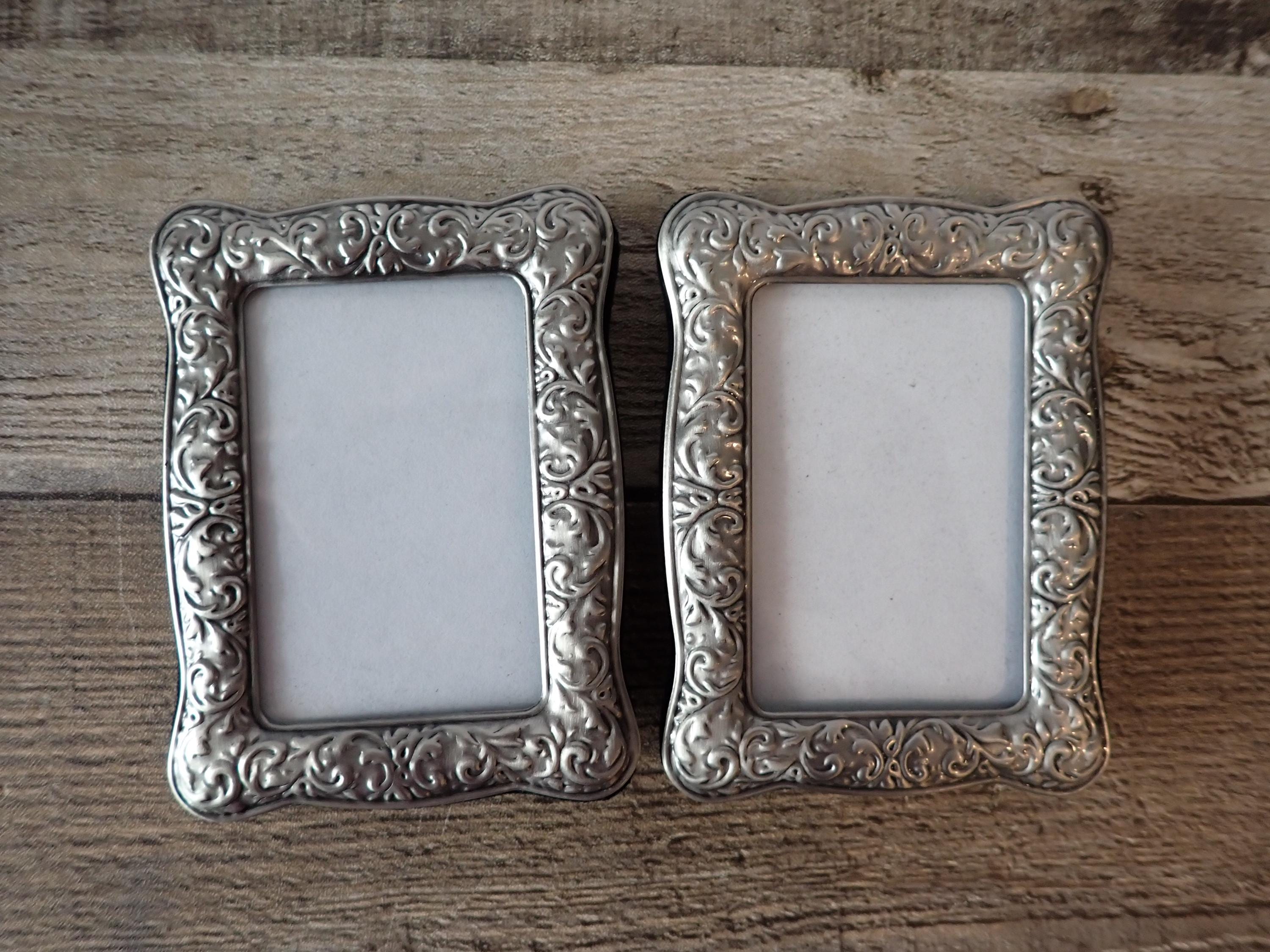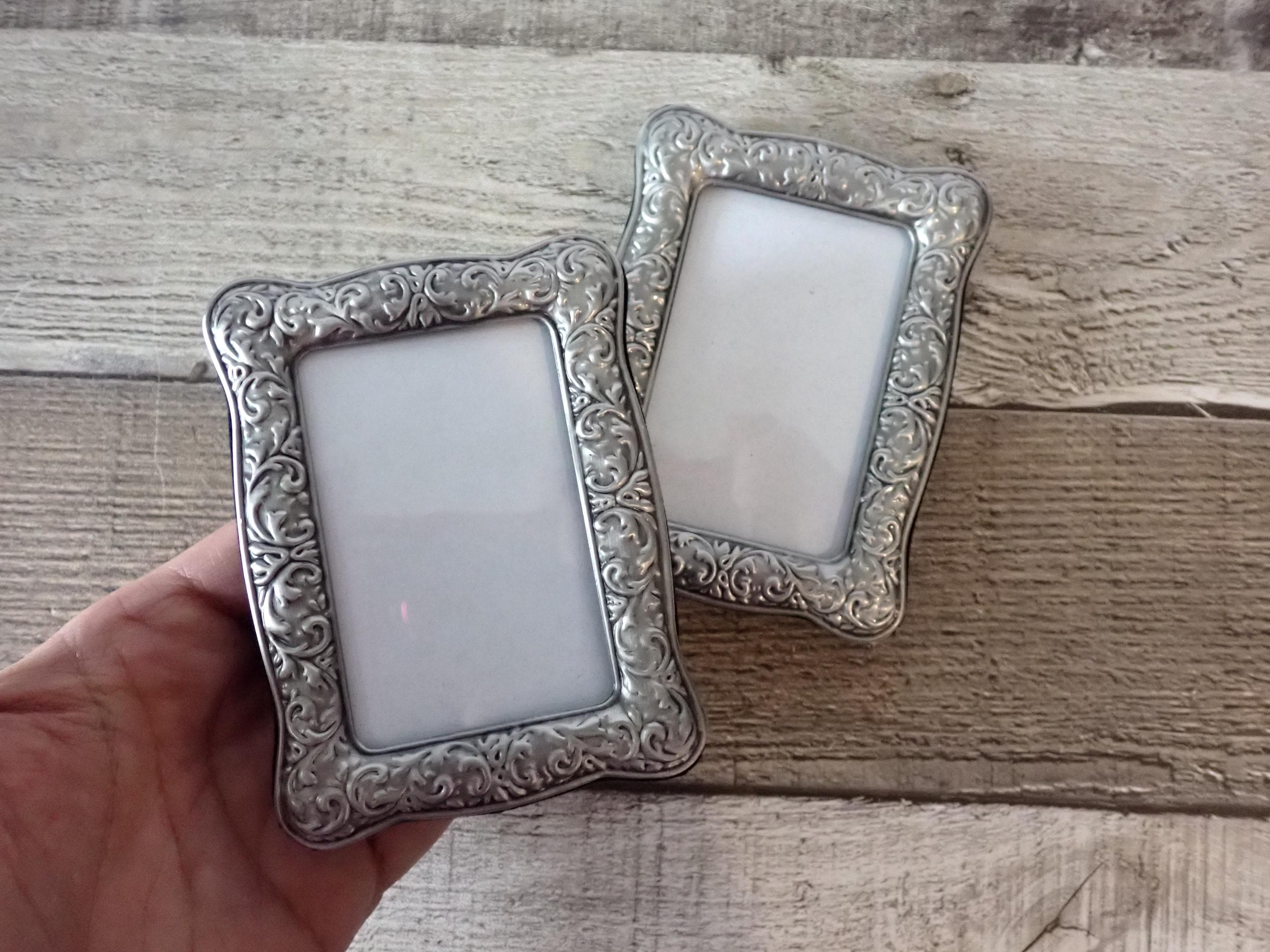 This set of frames includes 2 small matching silver metal photo frames. These silver frames have a simple and elegant scroll designs. The photo openings are 2"x3" and the overall size is 4" tall and 3" wide. They all include the glass and a cardboard backing piece with photo stand. The frames can stand either vertically or horizontally. Both frames are in very good condition.