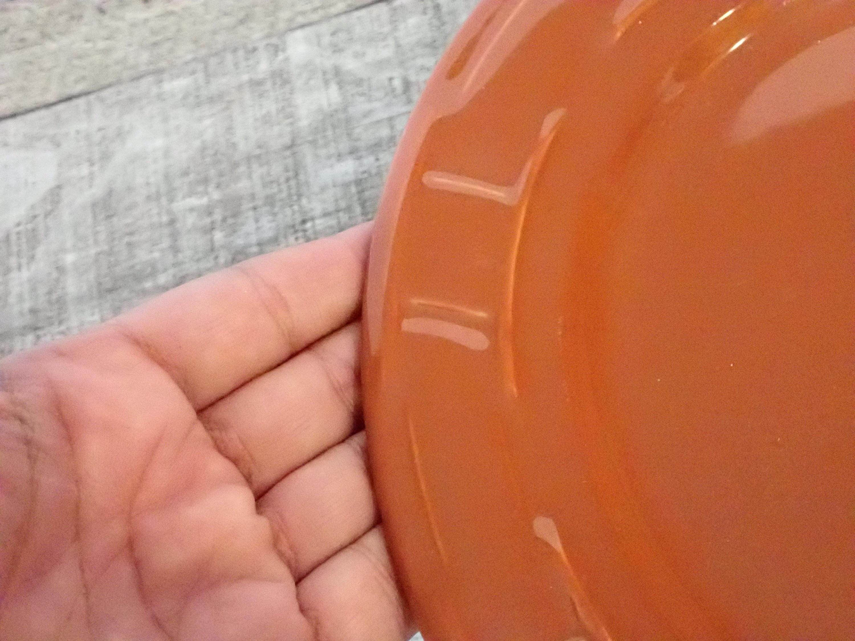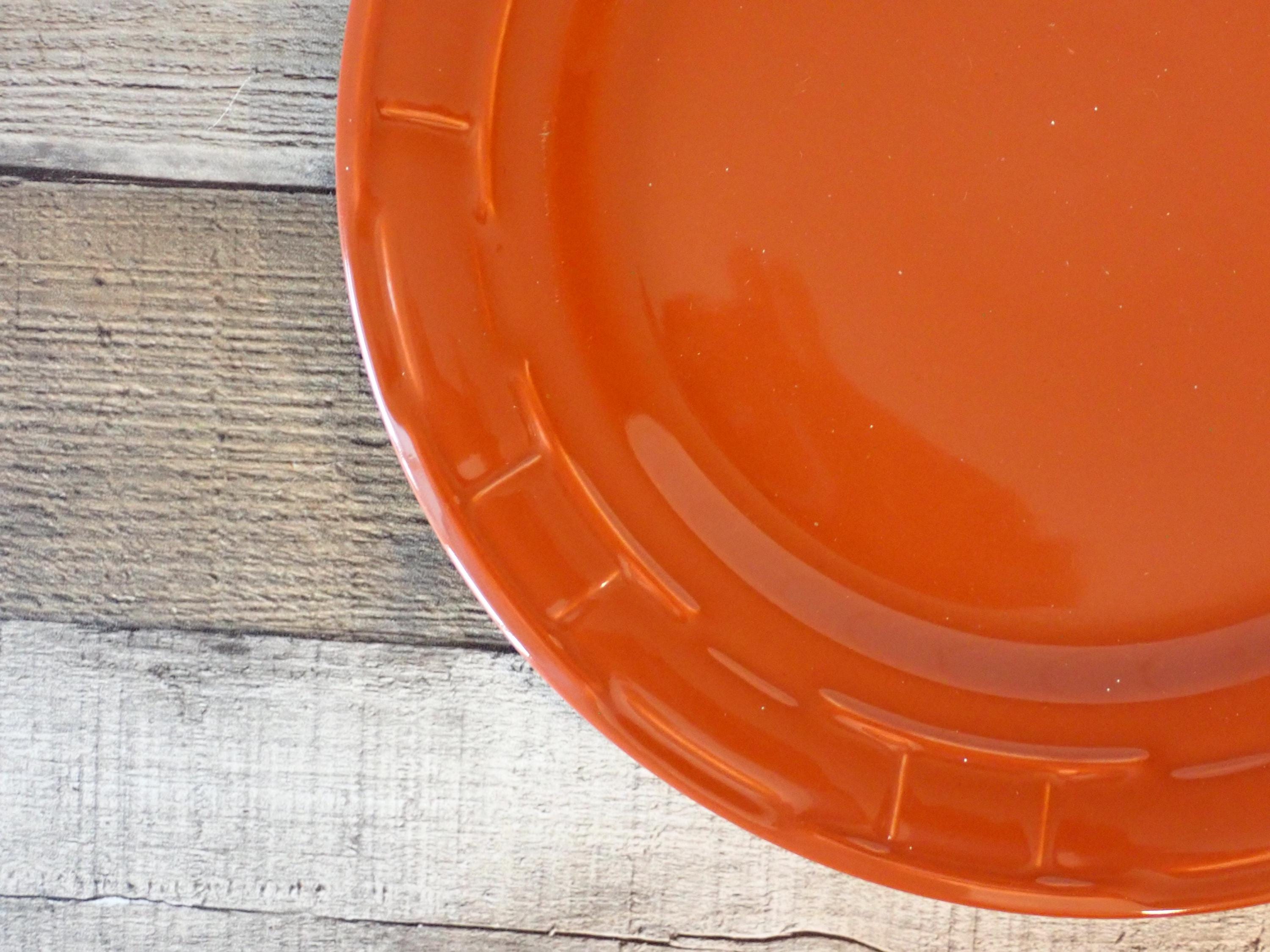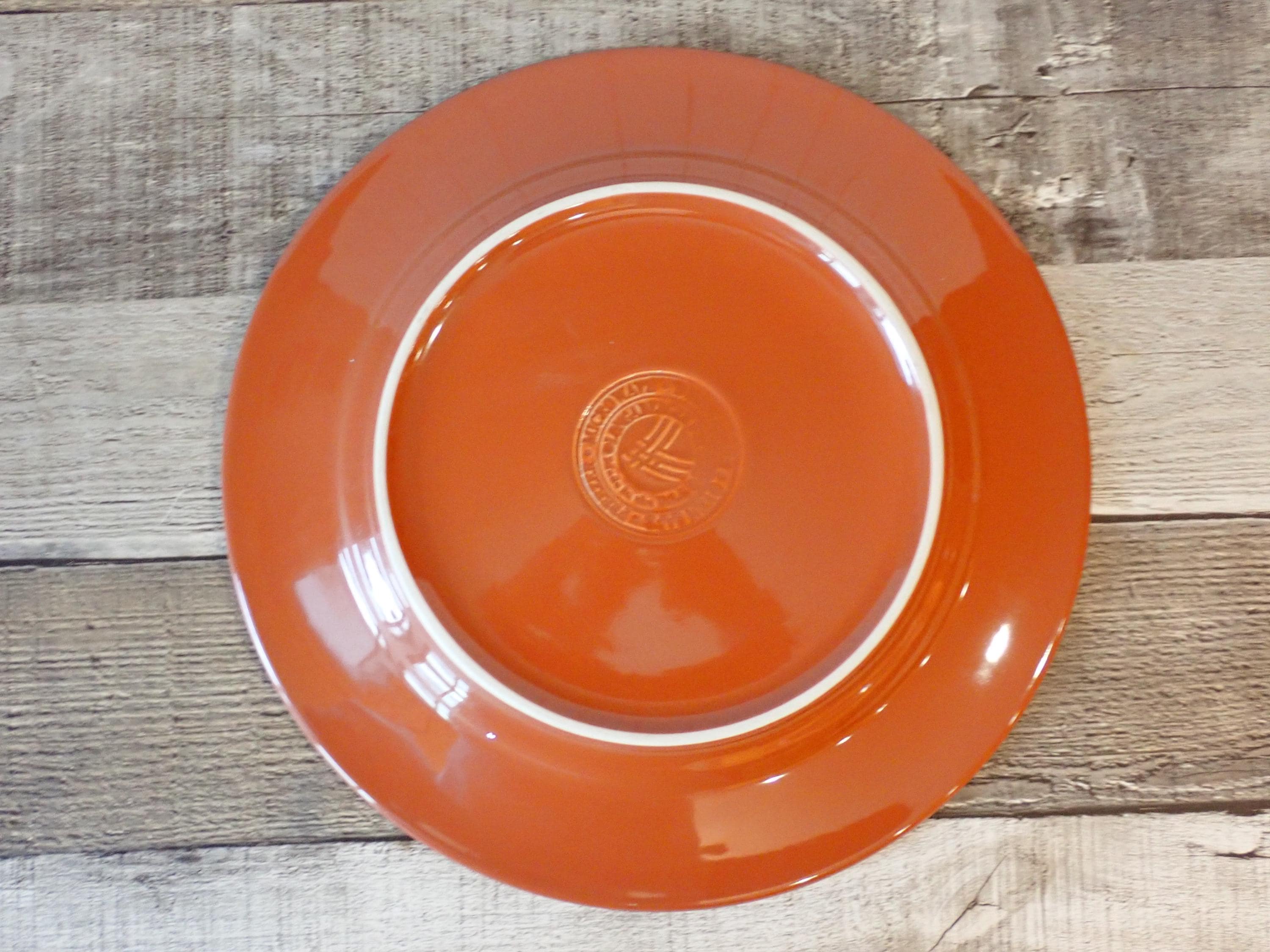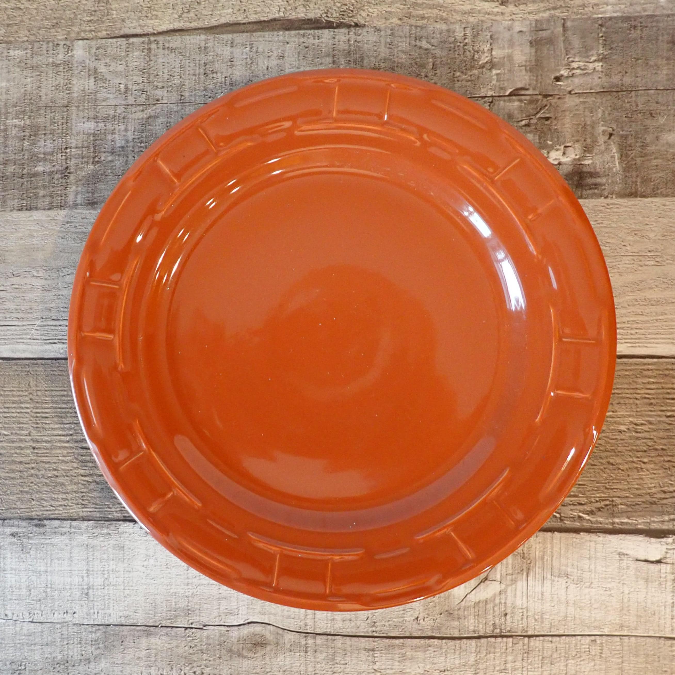This Longaberger dinner plate is in the Woven Traditions Spice pattern and is a 10" dinner plate. It is a rusty orange ceramic in the Woven Traditions and has a textured woven band around the rim of the plate. The plate is marked on the bottom: LONGABERGER POTTERY / MADE IN THE USA. The plate is in very good condition with no chips or cracks, and few scratches.