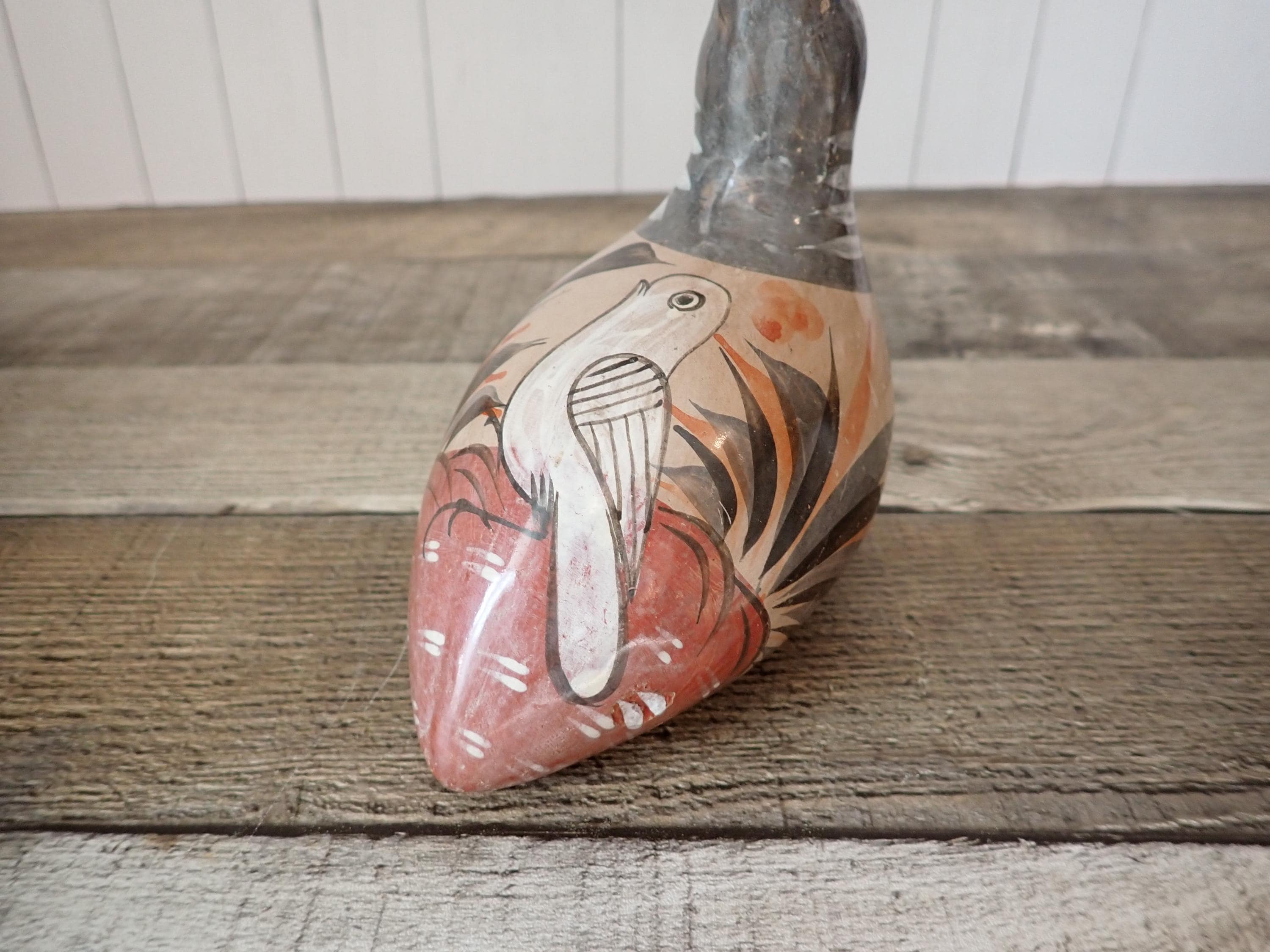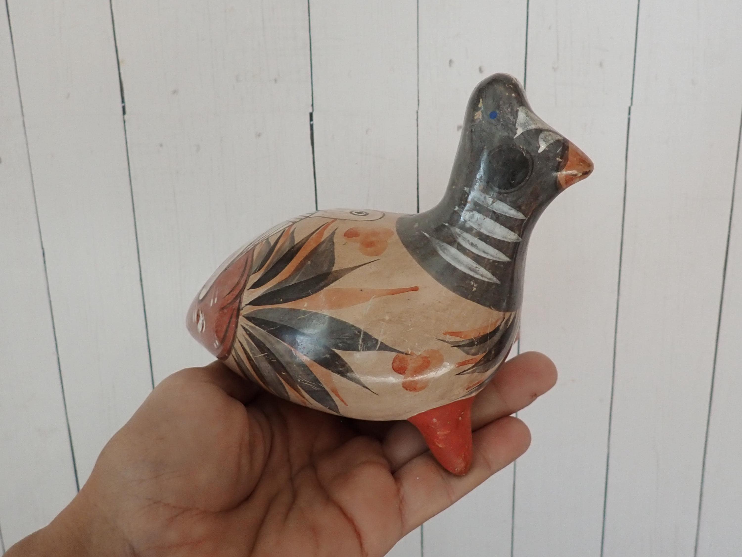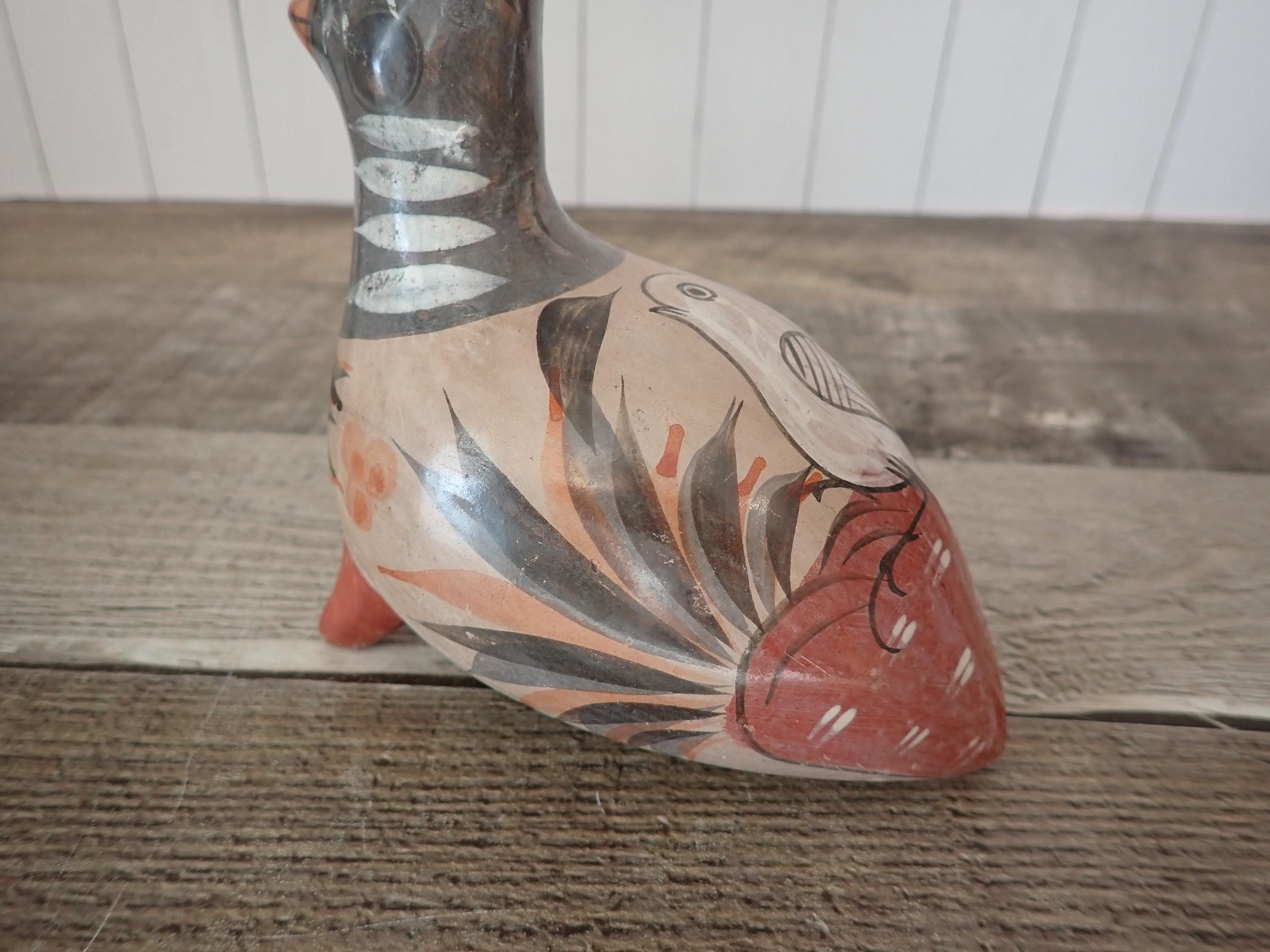 This Tonala bird figurine is 4.75" long, 3.25" wide, and 5" tall. It is a tan piece with hand painted designs in gray, red, white, and black. The bird is decorated with leaves and flowers, as well as feather details on the neck and head. The figurine is in very good condition with no chips or cracks, but there is some light wear to the paint here and there.