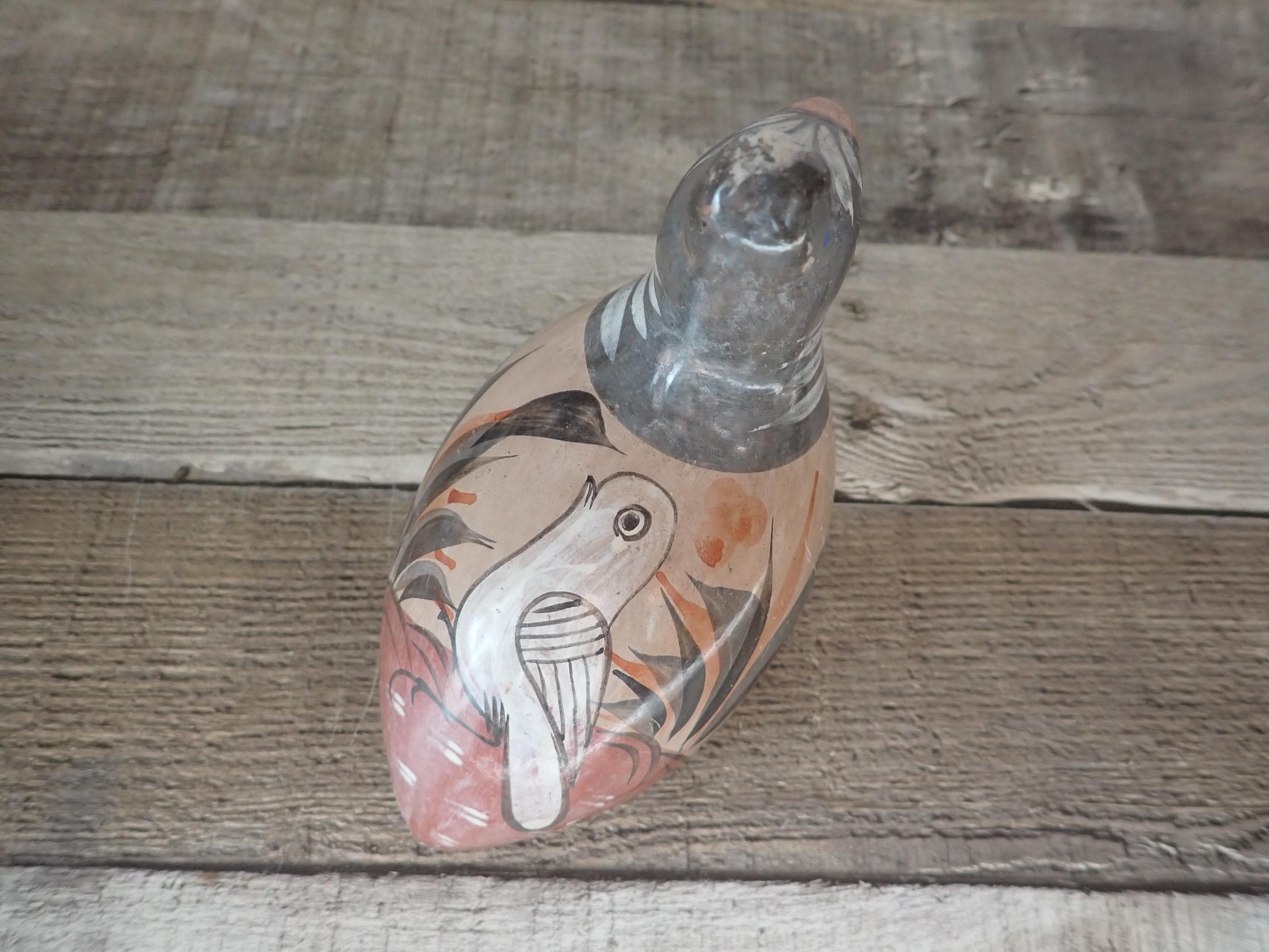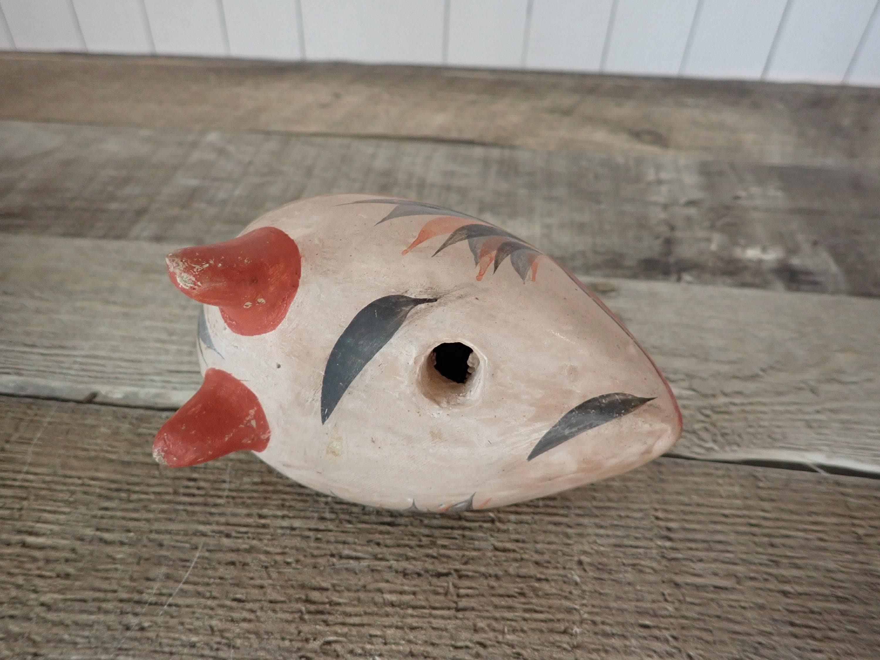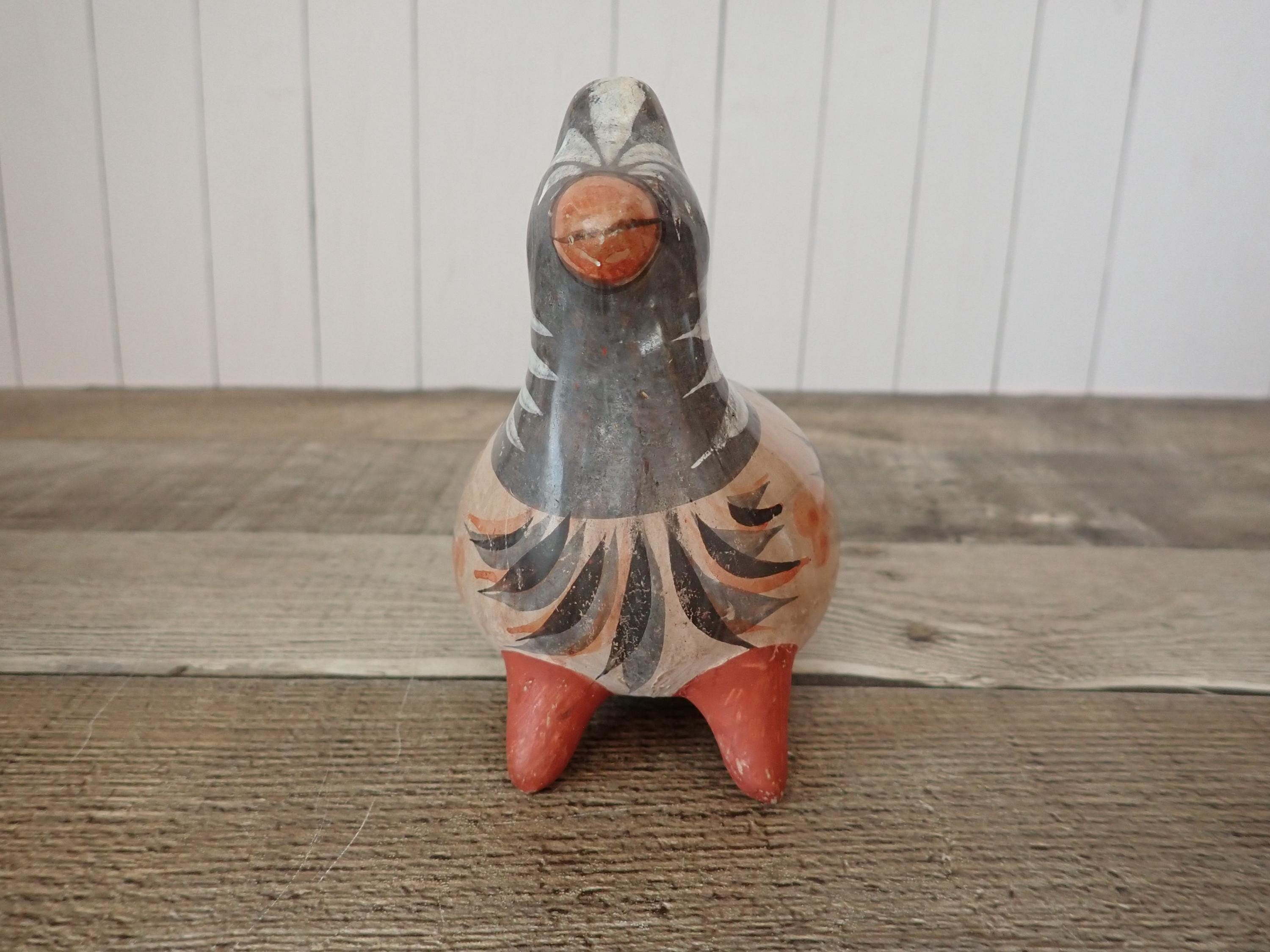 This Tonala bird figurine is 4.75" long, 3.25" wide, and 5" tall. It is a tan piece with hand painted designs in gray, red, white, and black. The bird is decorated with leaves and flowers, as well as feather details on the neck and head. The figurine is in very good condition with no chips or cracks, but there is some light wear to the paint here and there.
