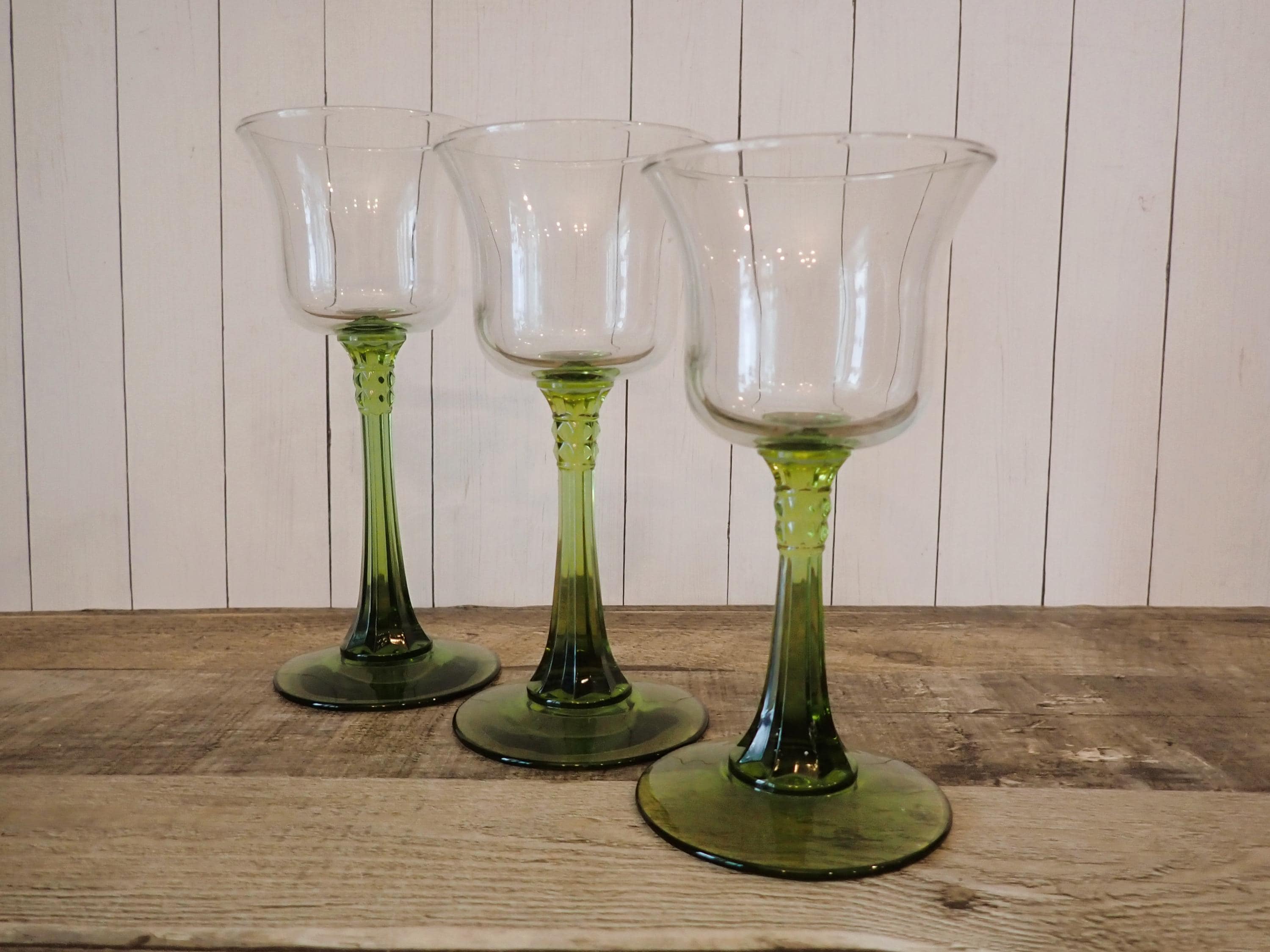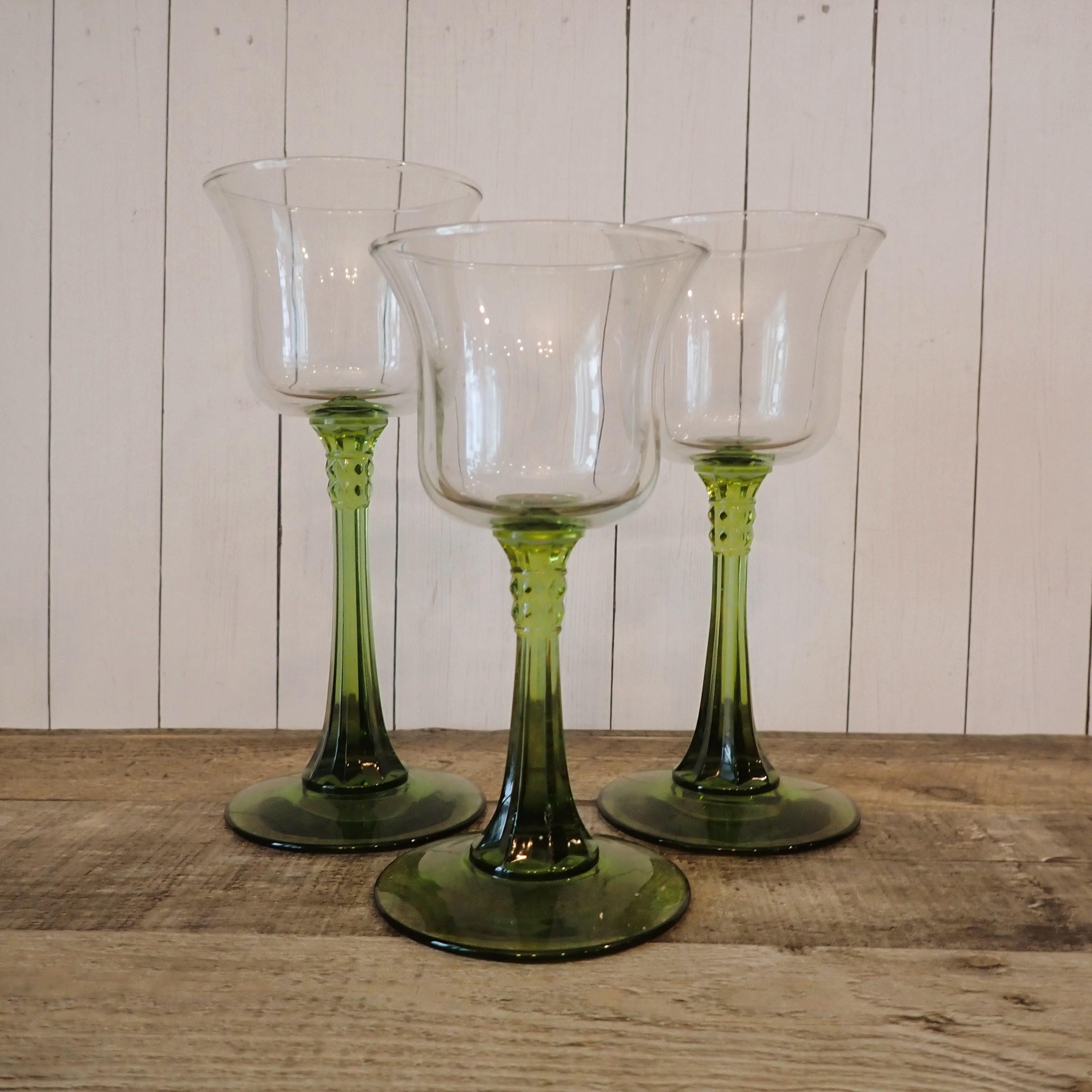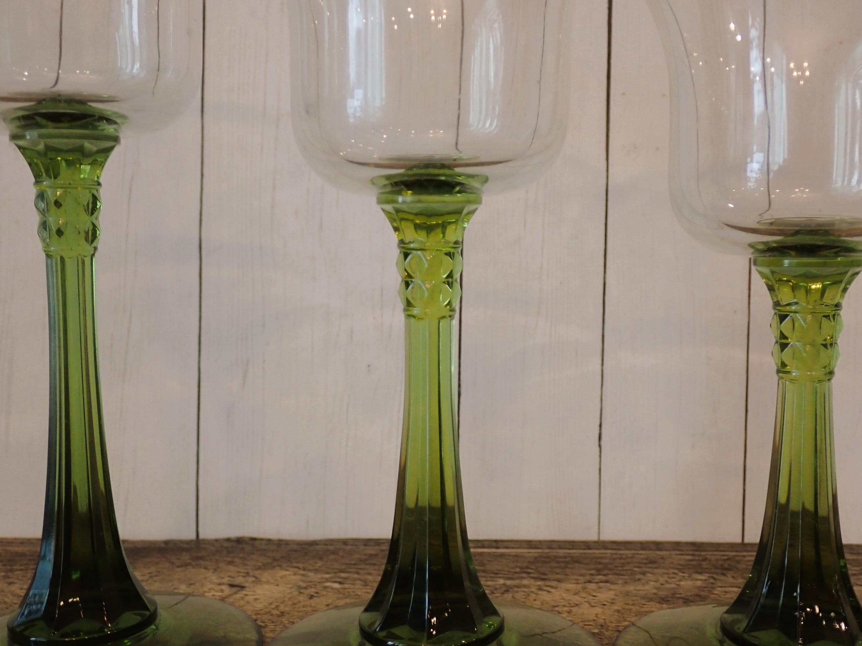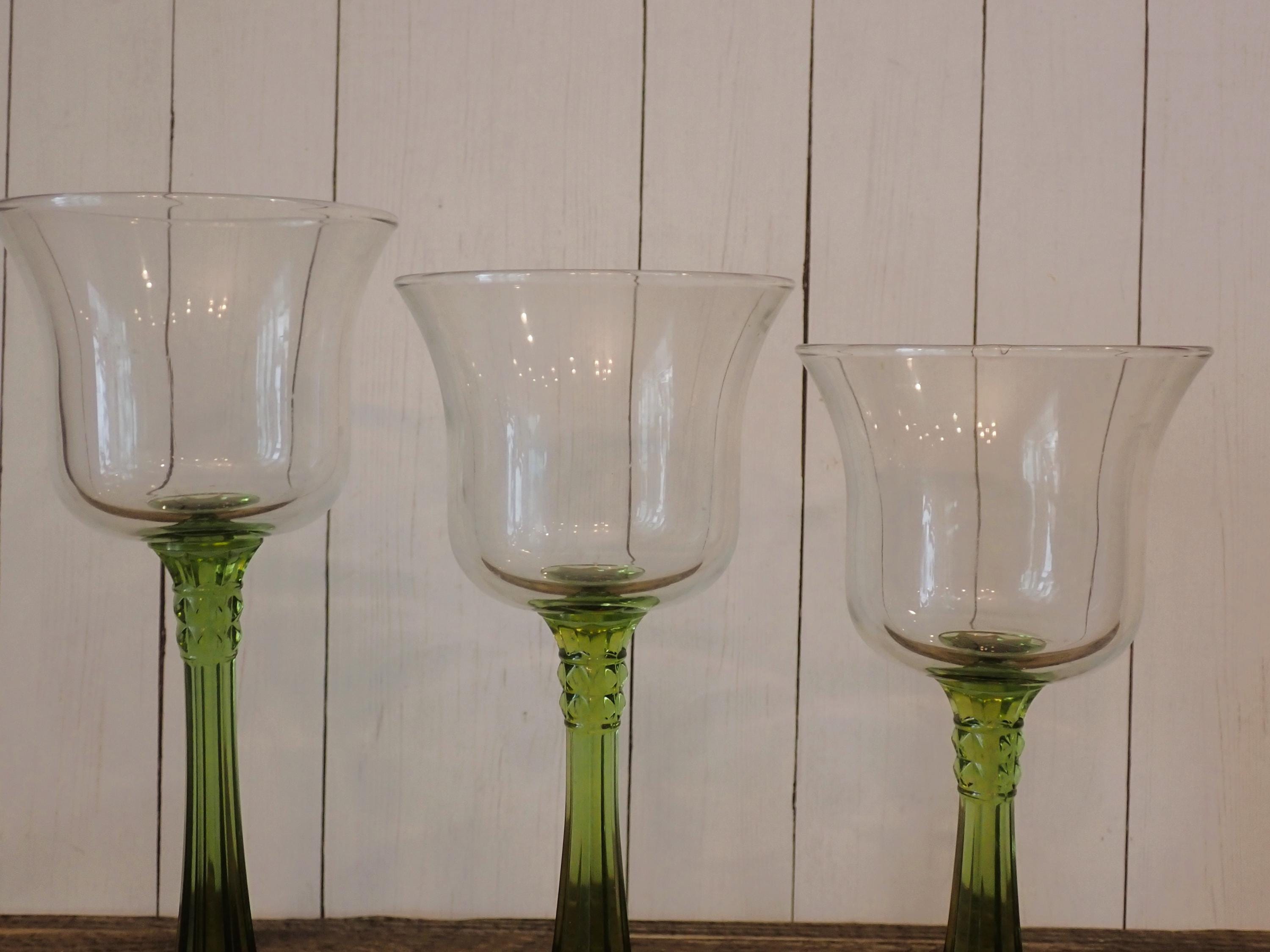 This set of Partylite candle holders includes 3 matching clear and green glass candle holders in graduated sizes. They are 6", 6.5" and 7" tall and 3" in diameter. They have a clear glass bowl and a green stem and base. The opening is 2.75" in diameter to hold a tealight candle or a votive candle. The candle holders are in very nice condition with no chips or cracks.