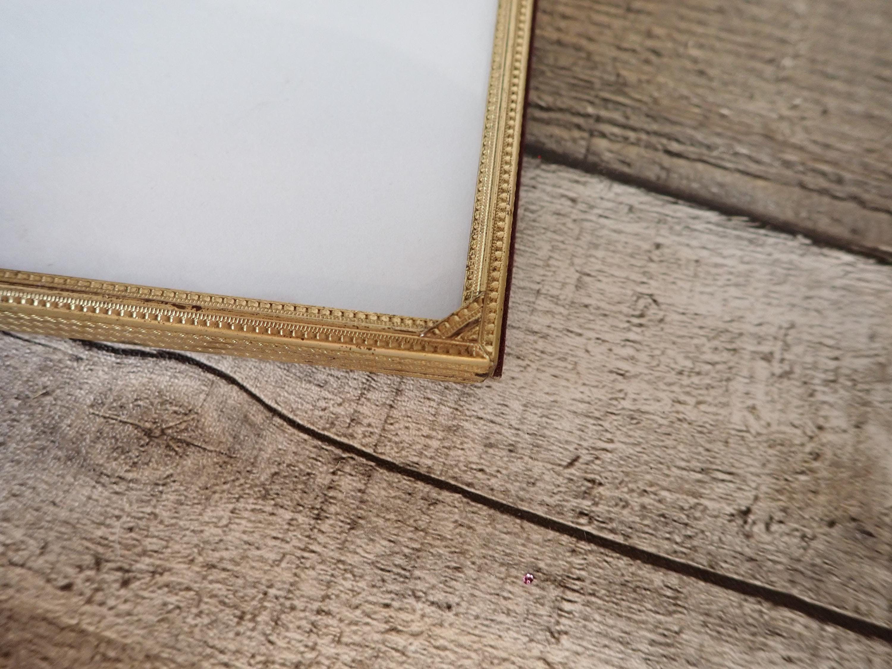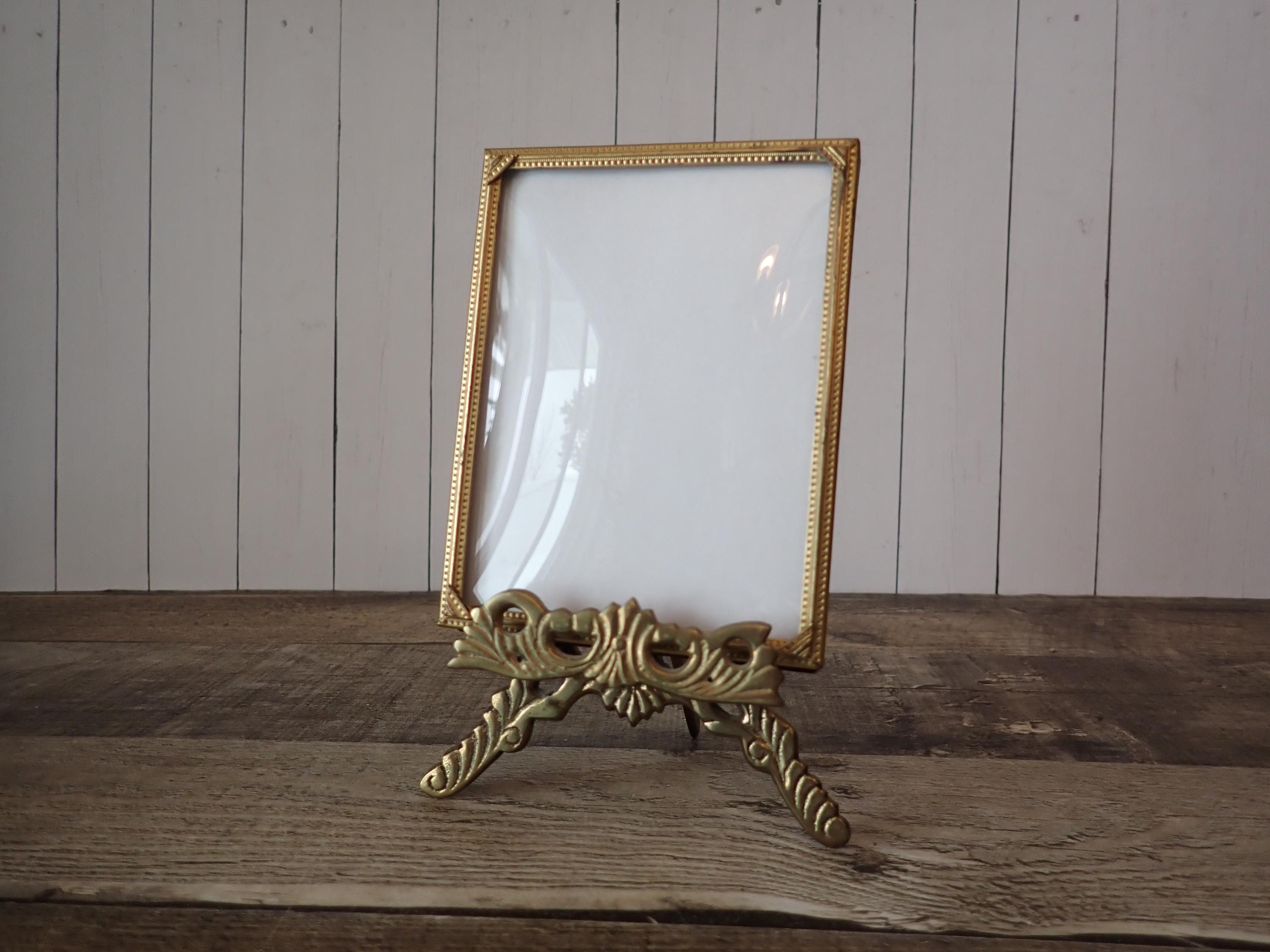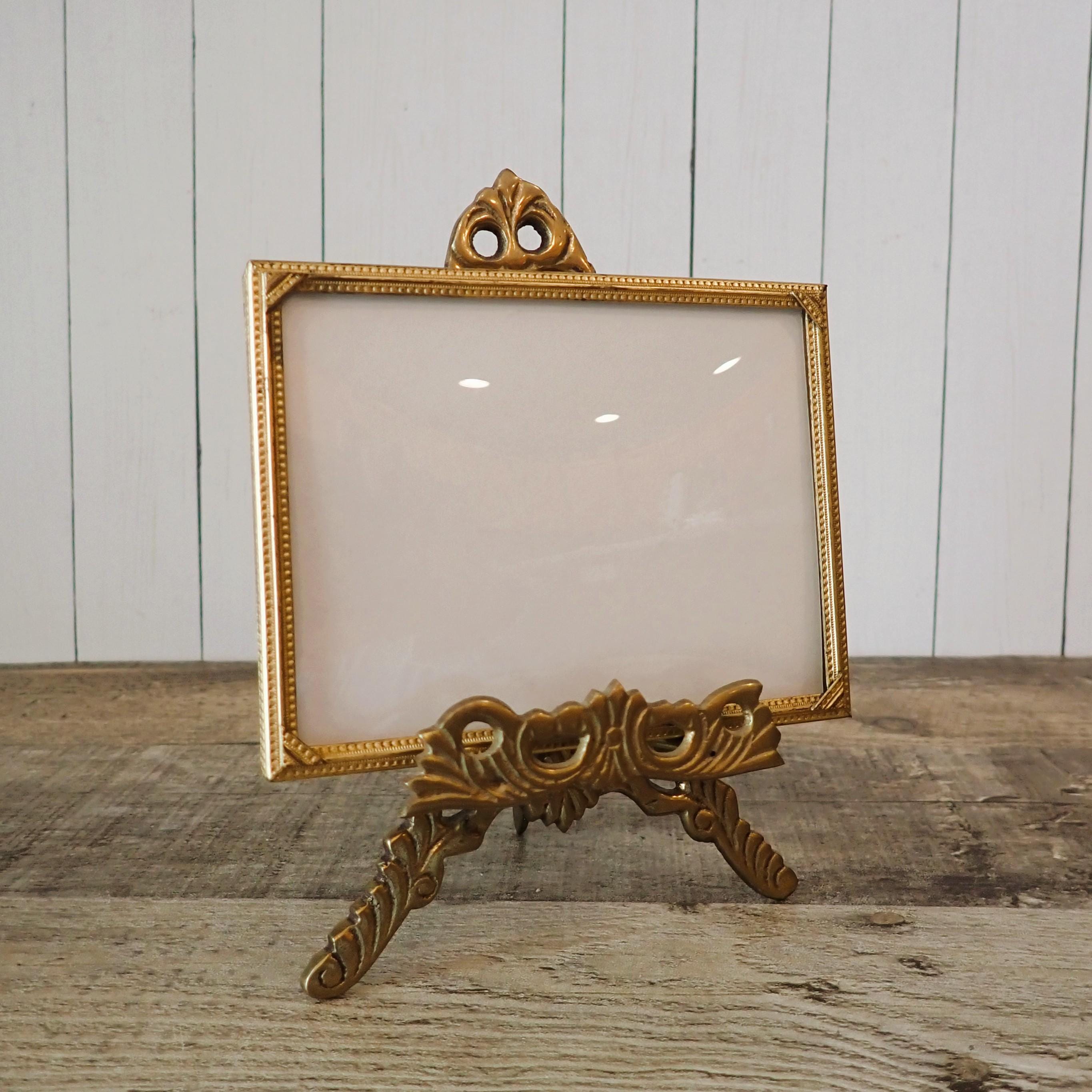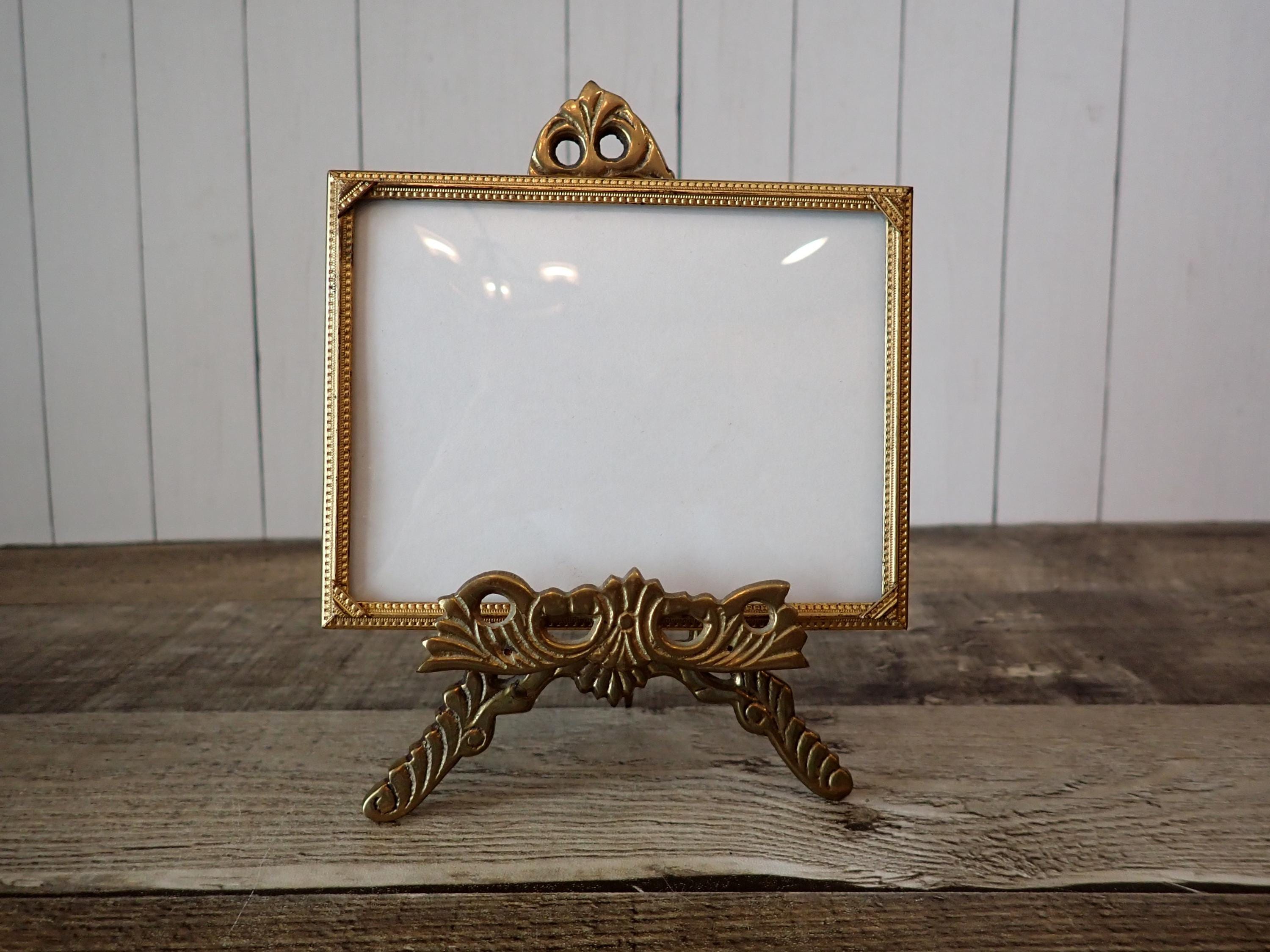 This brass photo frame is a 3x4 frame and sits on a brass/gold colored metal frame stand. The stand is 5.75" tall by 4" wide and can hold one photo frame. Included is one 3x4 photo frame that can rest on the stand wither vertically or horizontally. The frame has a clear glass insert over the photo opening, and a backing piece with a photo stand. The frame and stand are in very nice condition but there is some tarnish on the frame here and there. The frame does sit on a slight angle on the stand as shown in the last photo.
