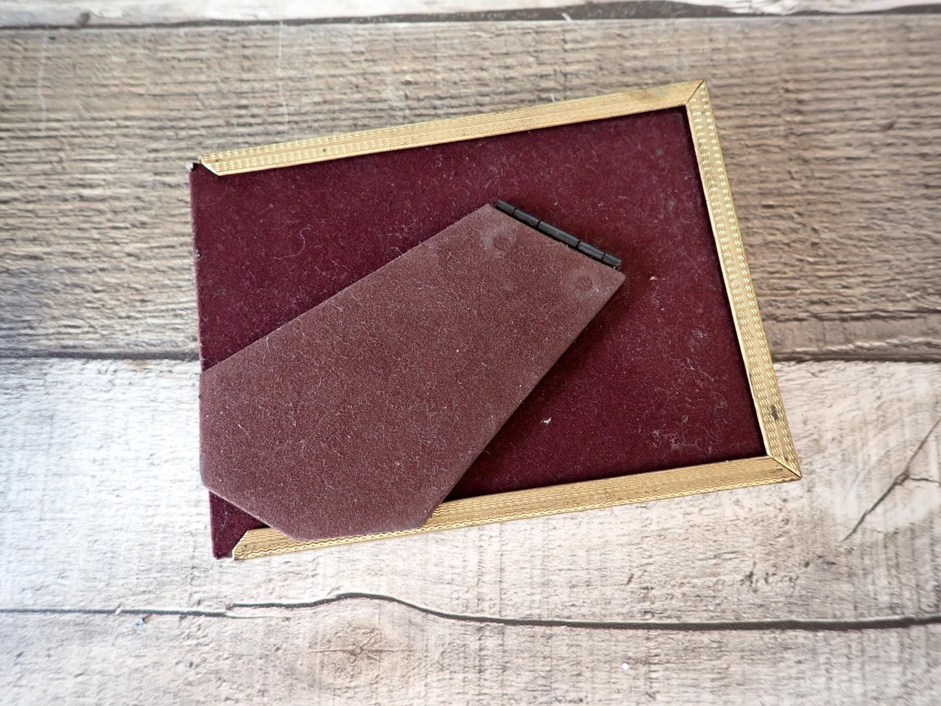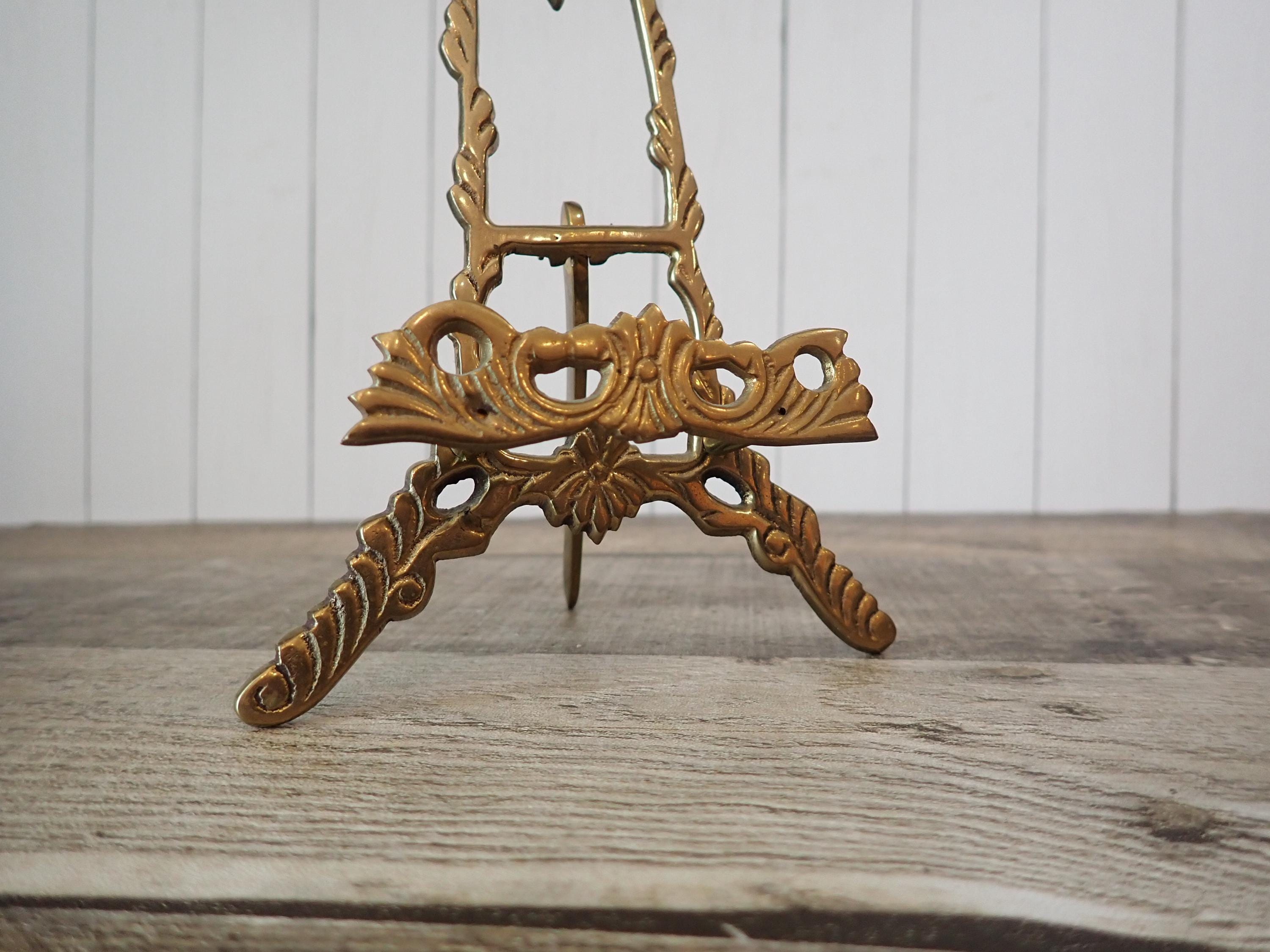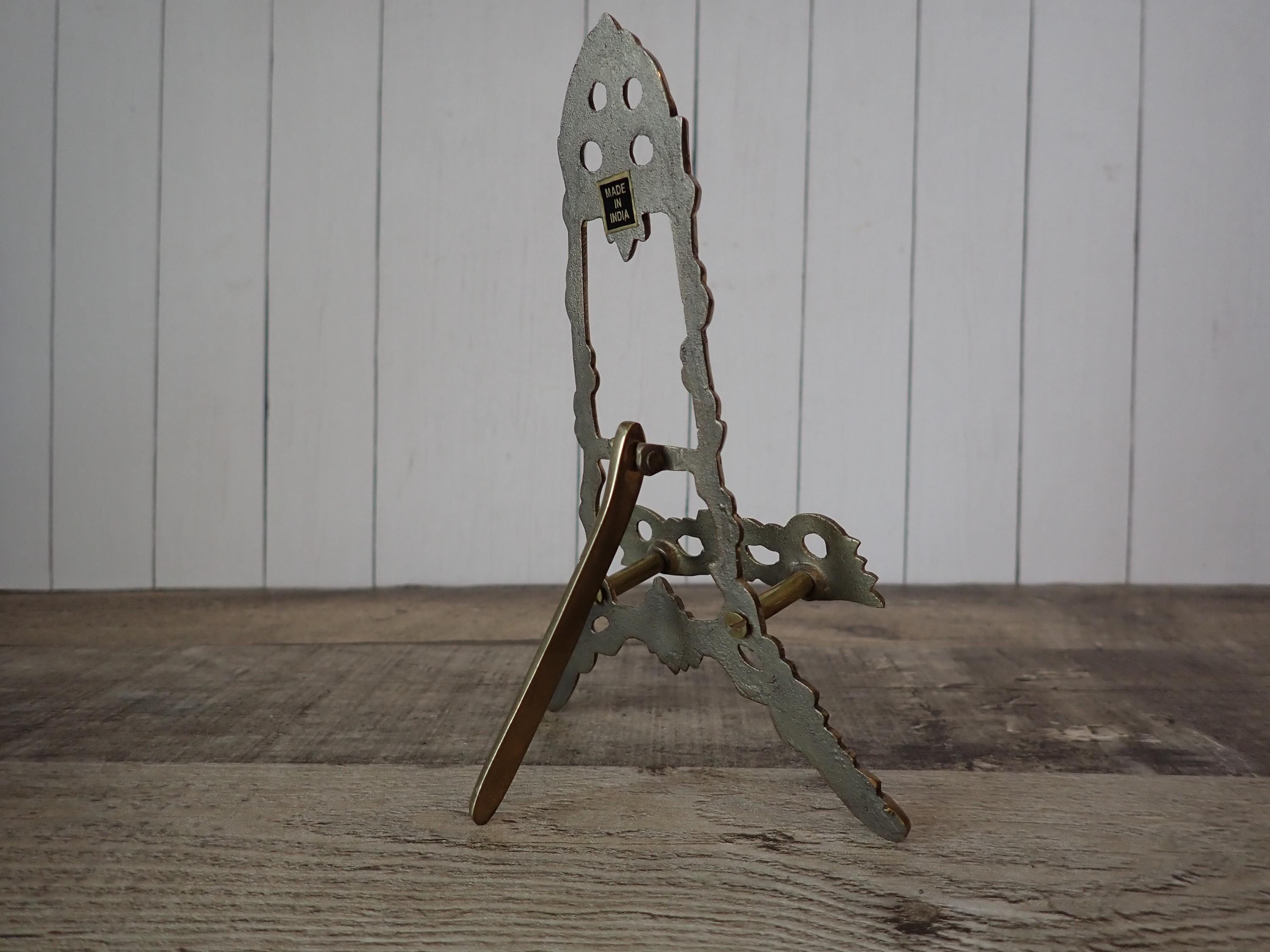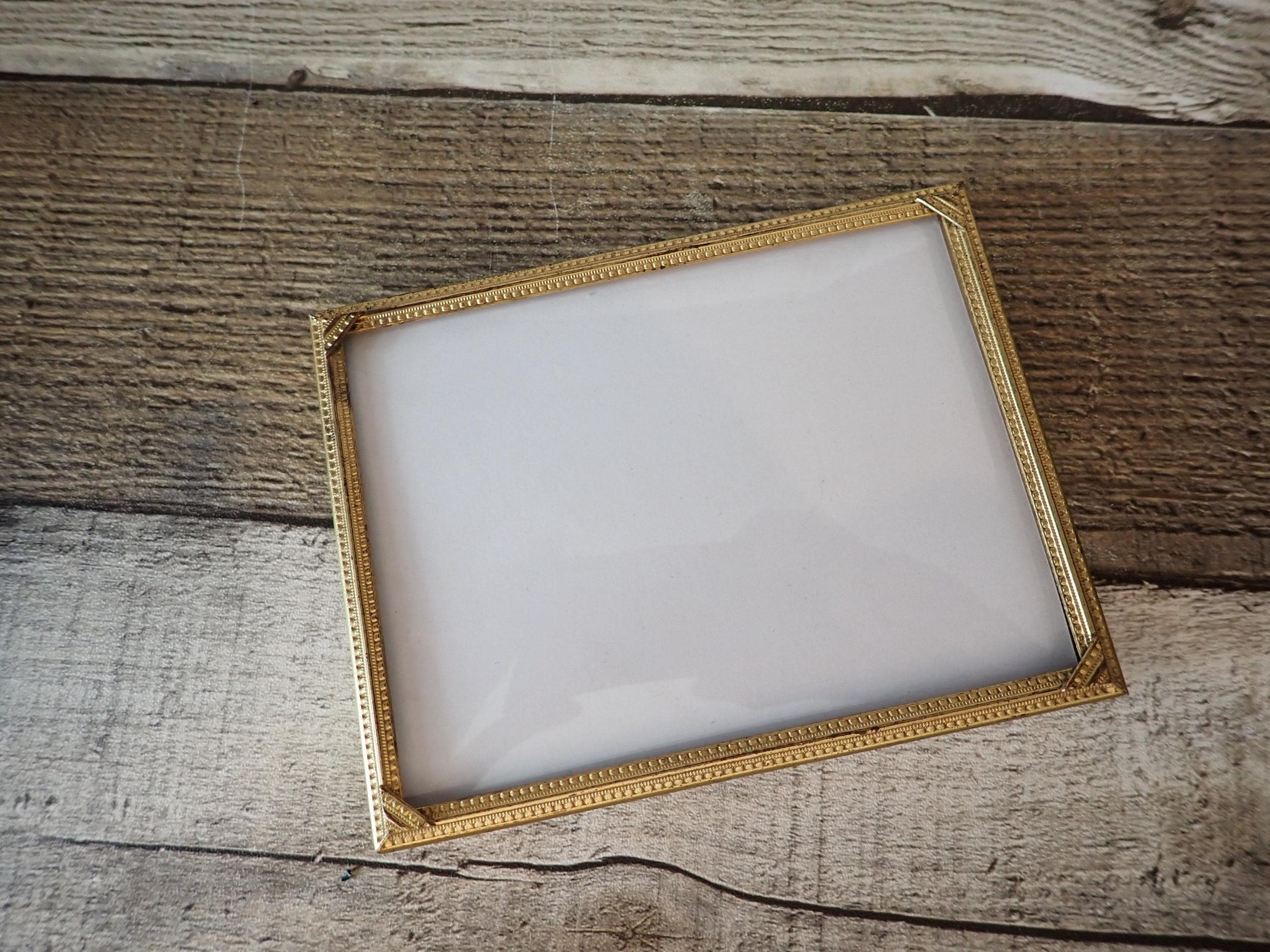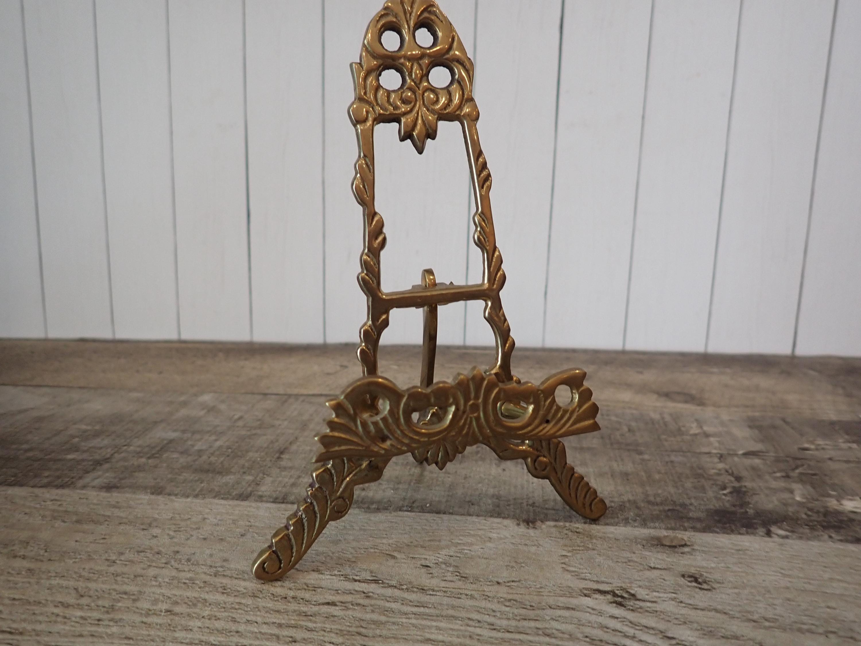 This brass photo frame is a 3x4 frame and sits on a brass/gold colored metal frame stand. The stand is 5.75" tall by 4" wide and can hold one photo frame. Included is one 3x4 photo frame that can rest on the stand wither vertically or horizontally. The frame has a clear glass insert over the photo opening, and a backing piece with a photo stand. The frame and stand are in very nice condition but there is some tarnish on the frame here and there. The frame does sit on a slight angle on the stand as shown in the last photo.