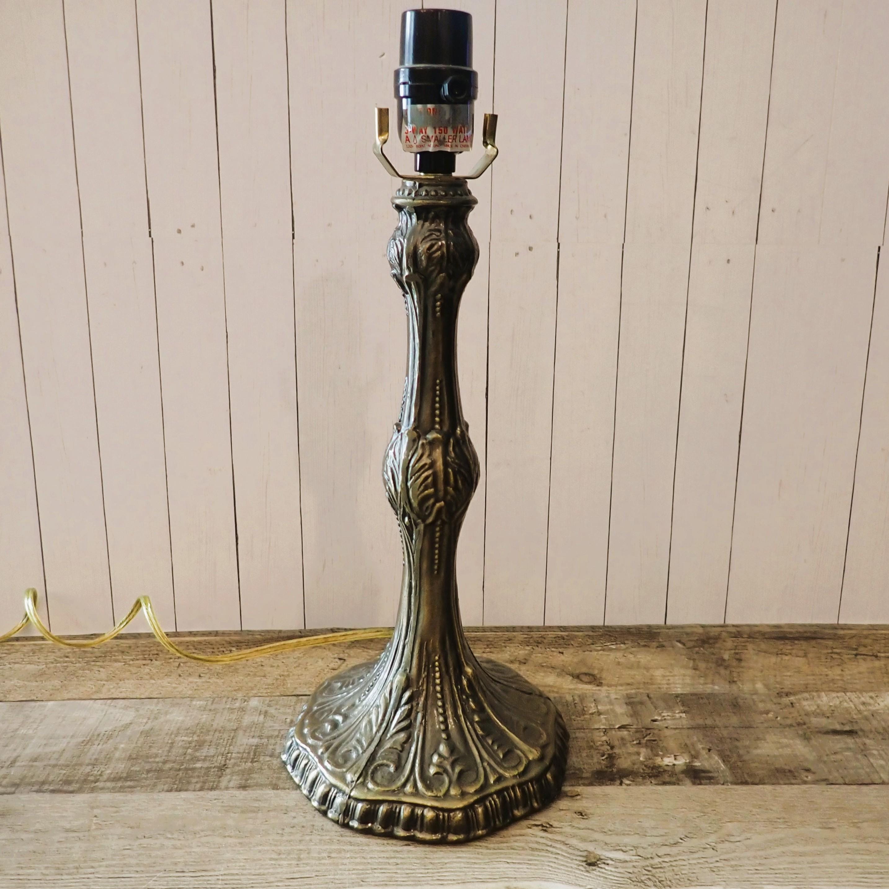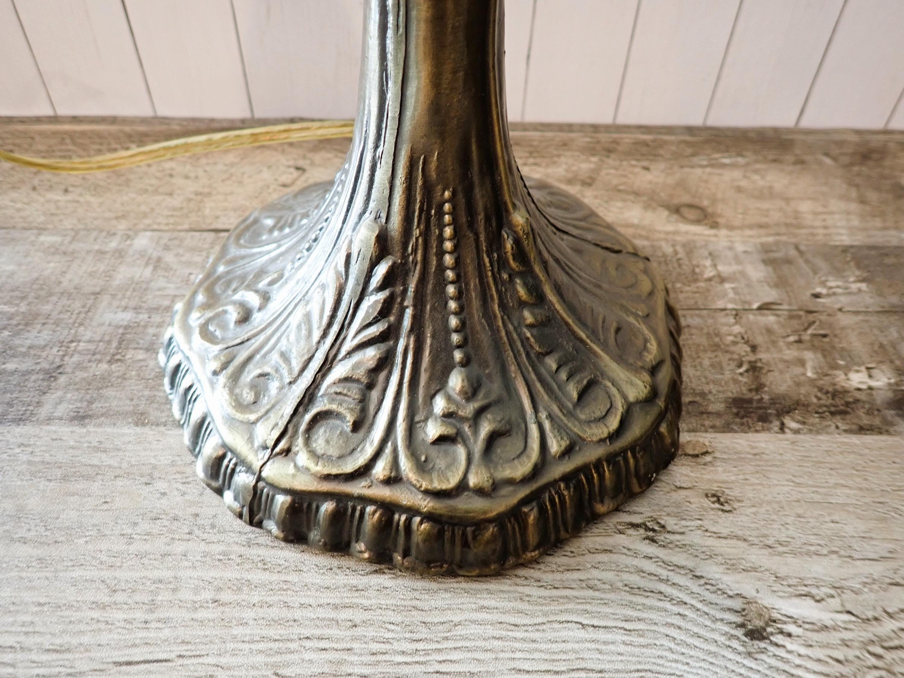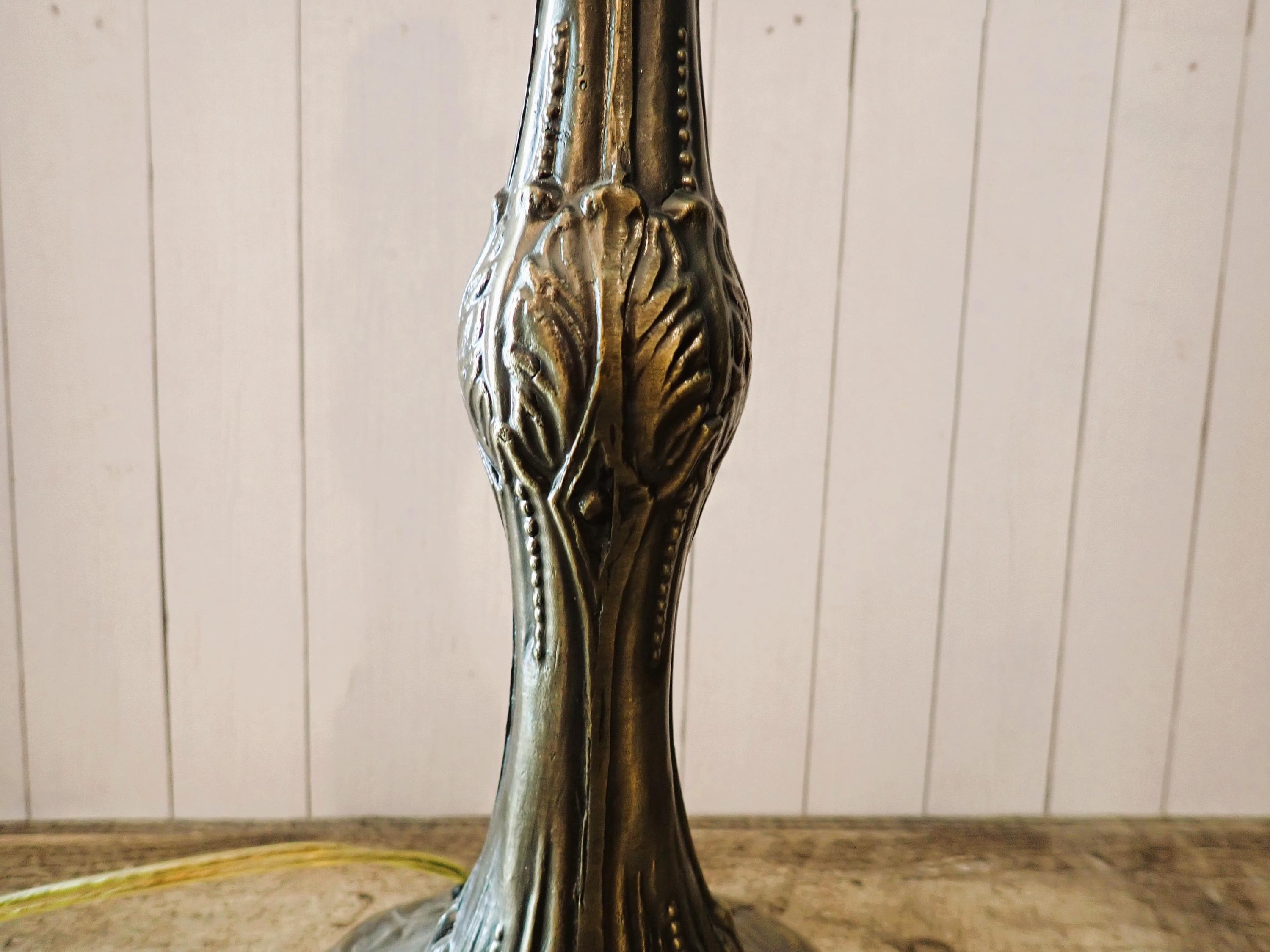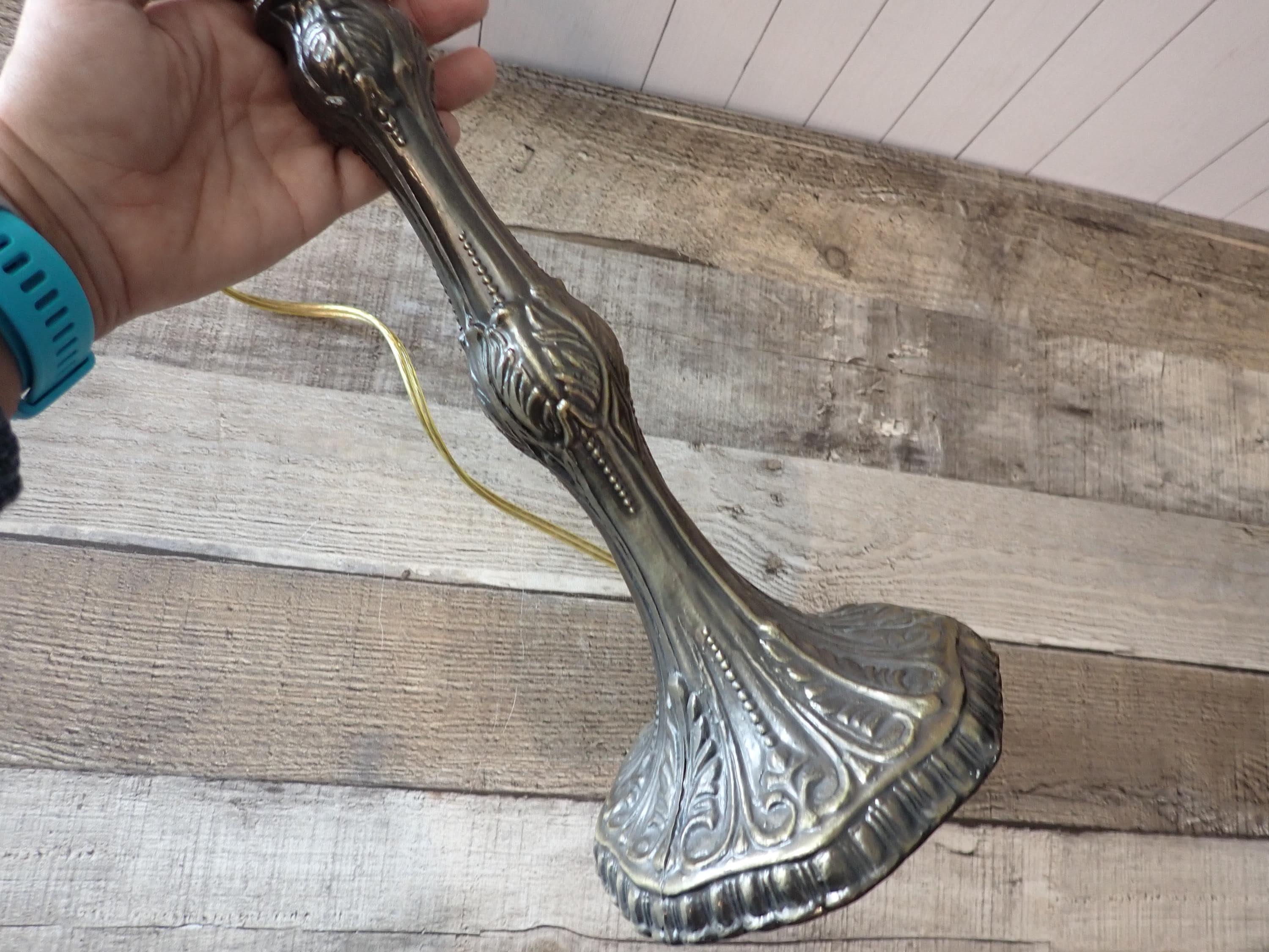 This aged bronze colored metal lamp base is a Tiffany style lamp with Art Nouveau botanical leaf designs. The base is 6.5" in diameter and is 15" tall to the top of the lamp itself (the light bulb holder.) The lamp includes a gold clamp-on shade holder but there is no finial. The height of the lamp from base to the top of the shade holder is 21" tall. The lamp is an aged bronze color and has an ornate leaf design on the base and body of the lamp. The lamp has a yellow/gold electrical cord and a round click switch. The lamp is in very nice condition and in working order. There is NO shade with this lamp.